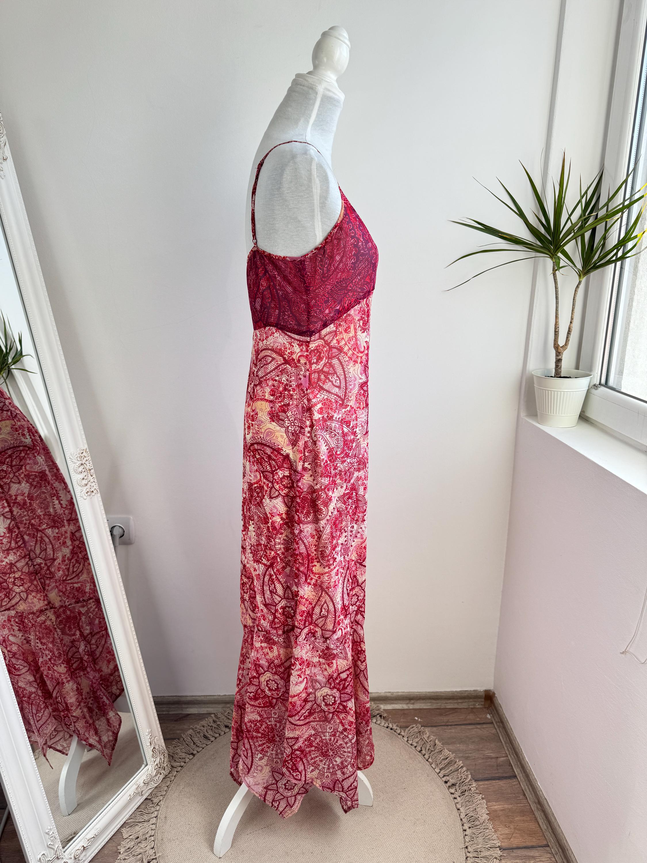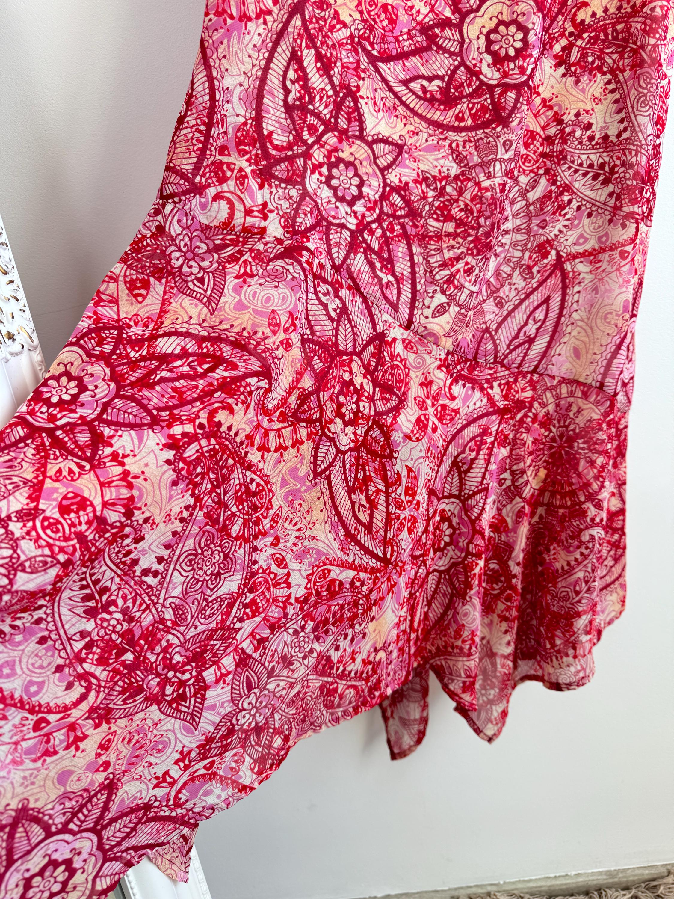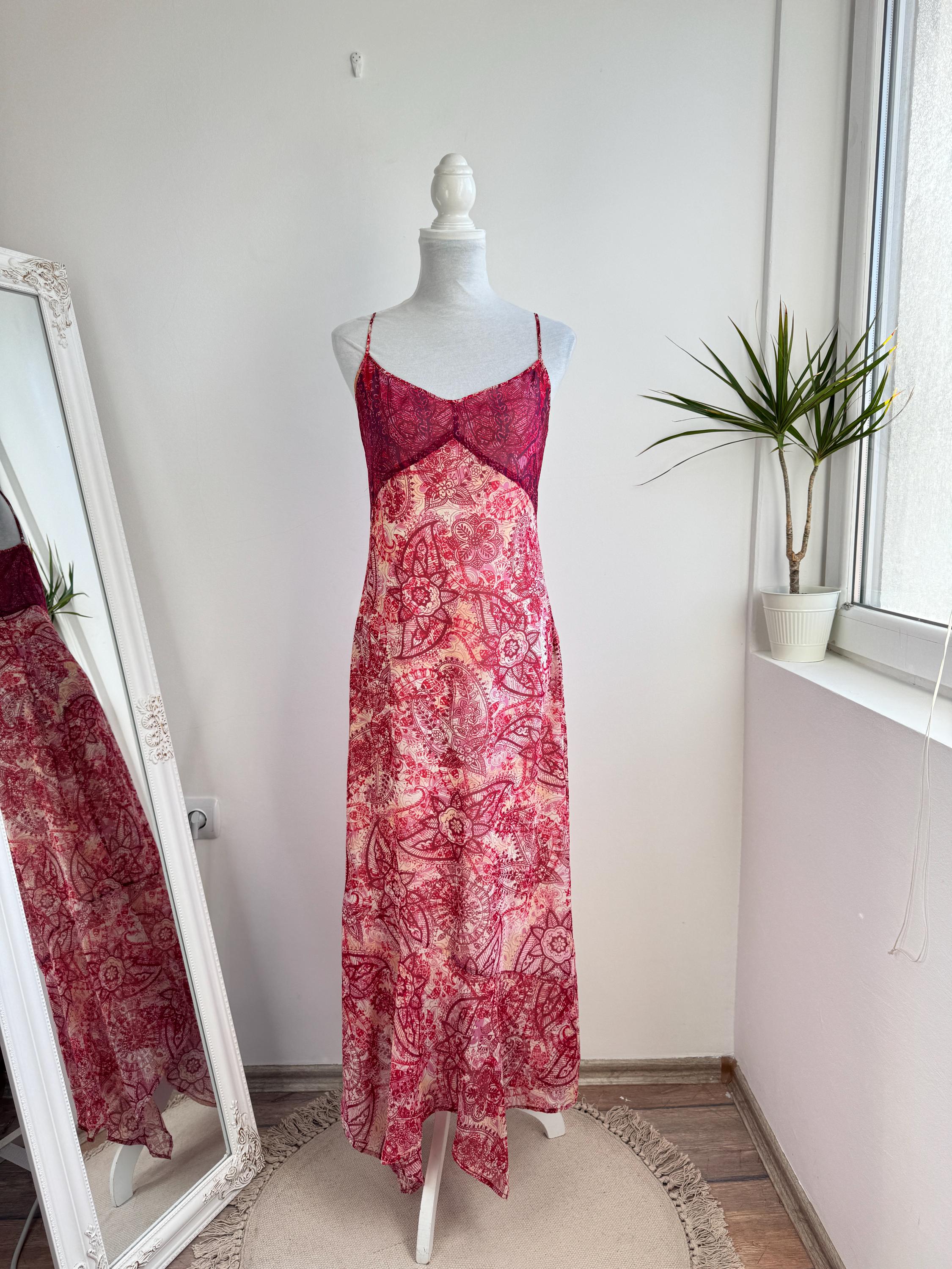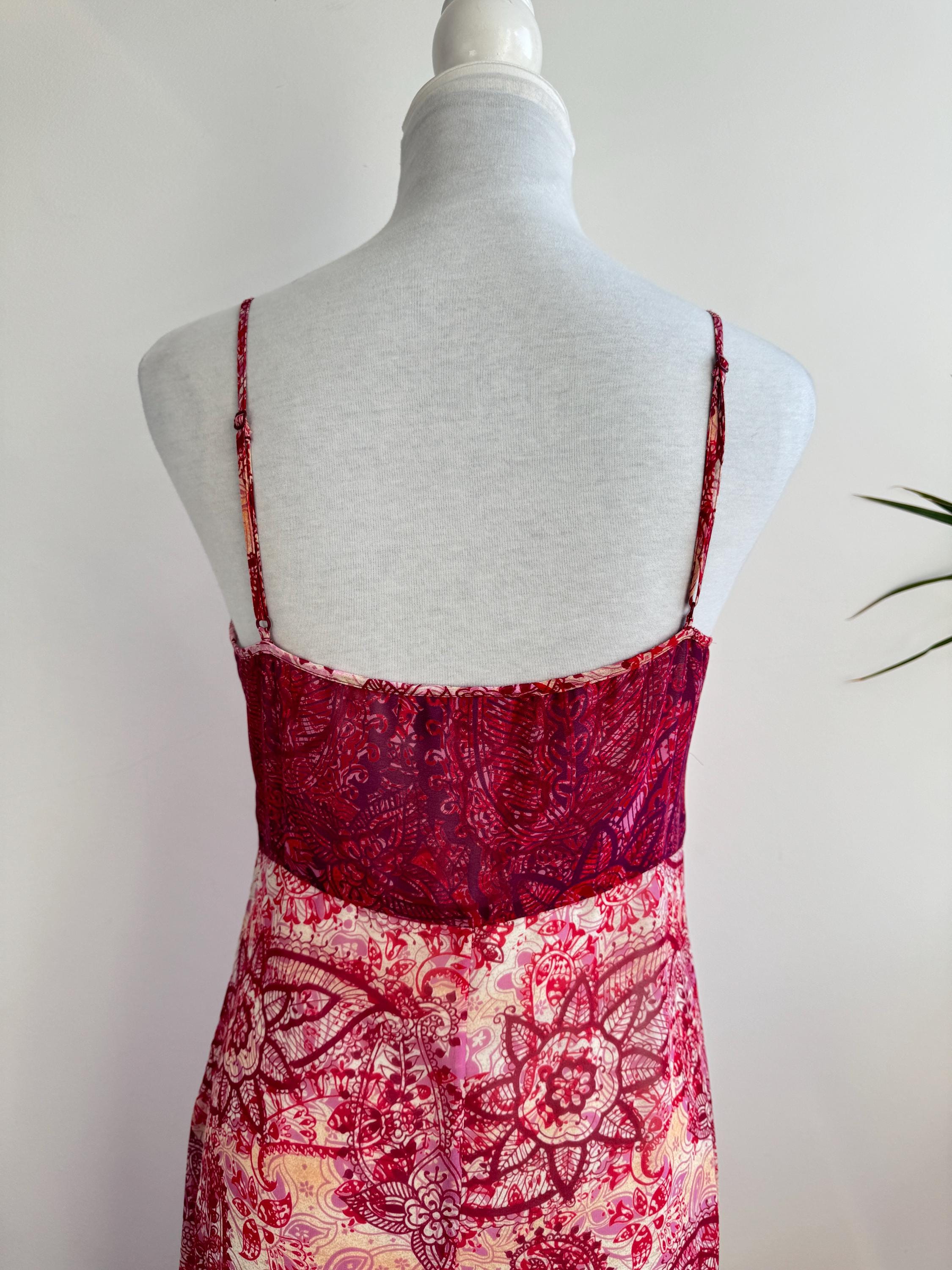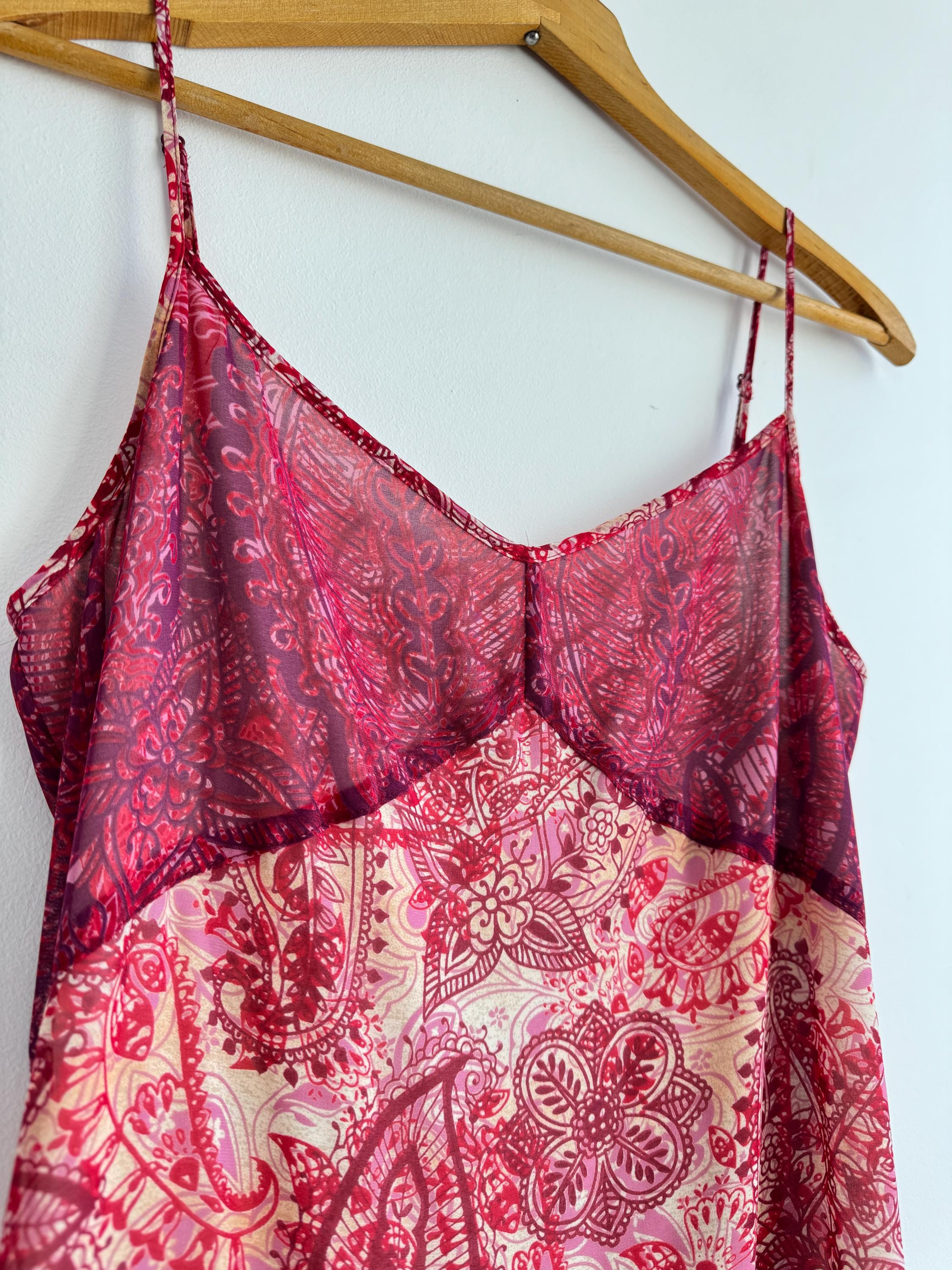 This is a stunning vintage Y2K Mexx maxi dress in size EUR 38 M. This sheer asymmetrical dress features a captivating red and pink paisley mandala print with a delicate mesh overlay that creates a beautiful depth. The slip-style silhouette of this maxo slip dress is elevated by a flattering V-neckline, adjustable spaghetti straps, and a whimsical asymmetrical hemline that moves gracefully as you walk. A hidden side zip closure allows a perfect fit.