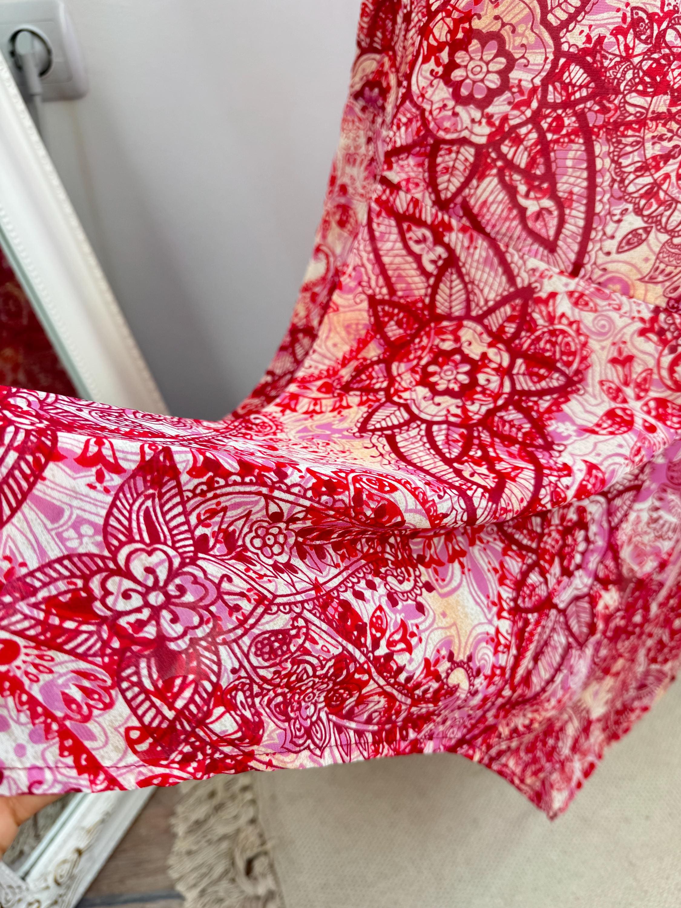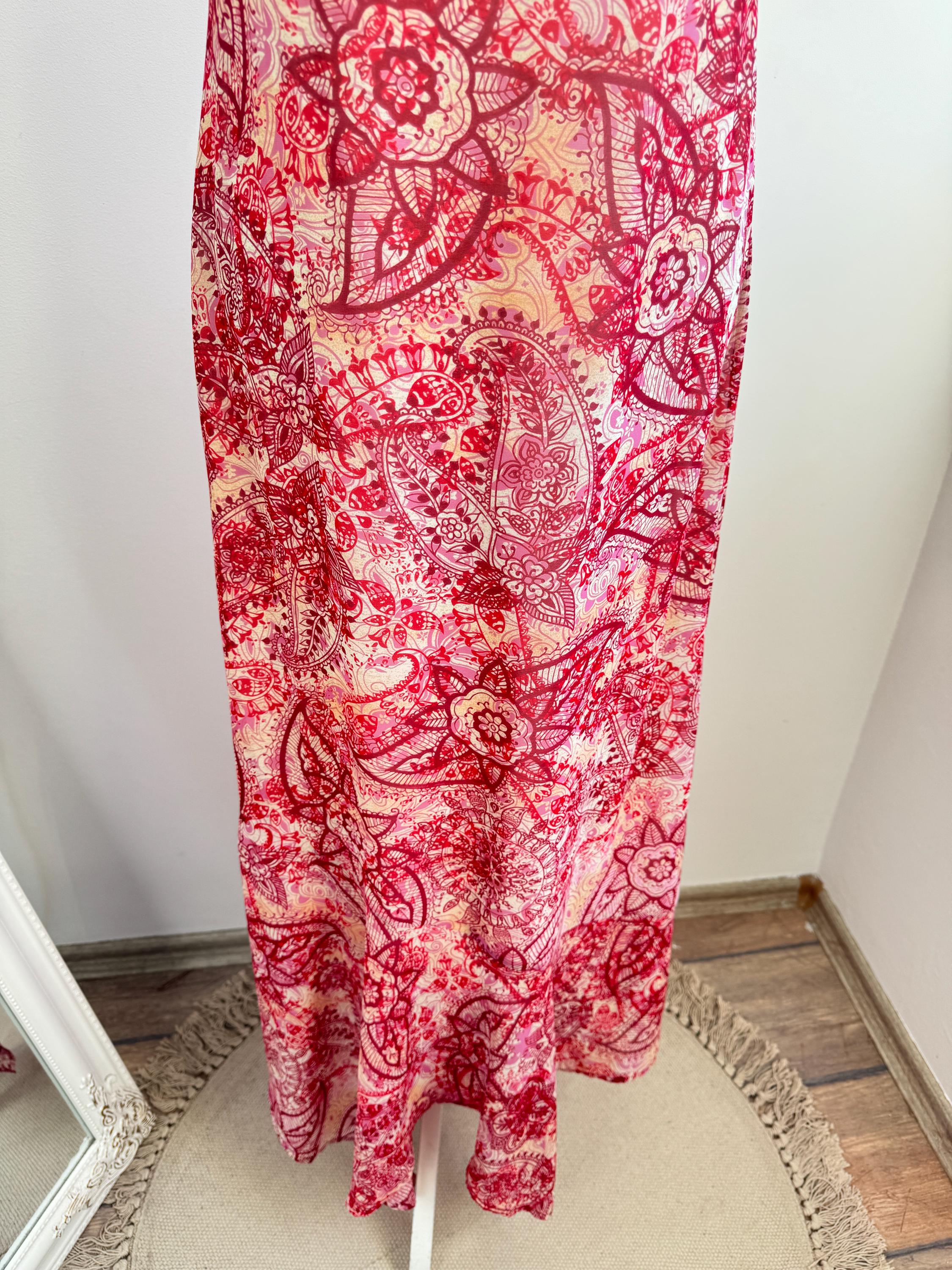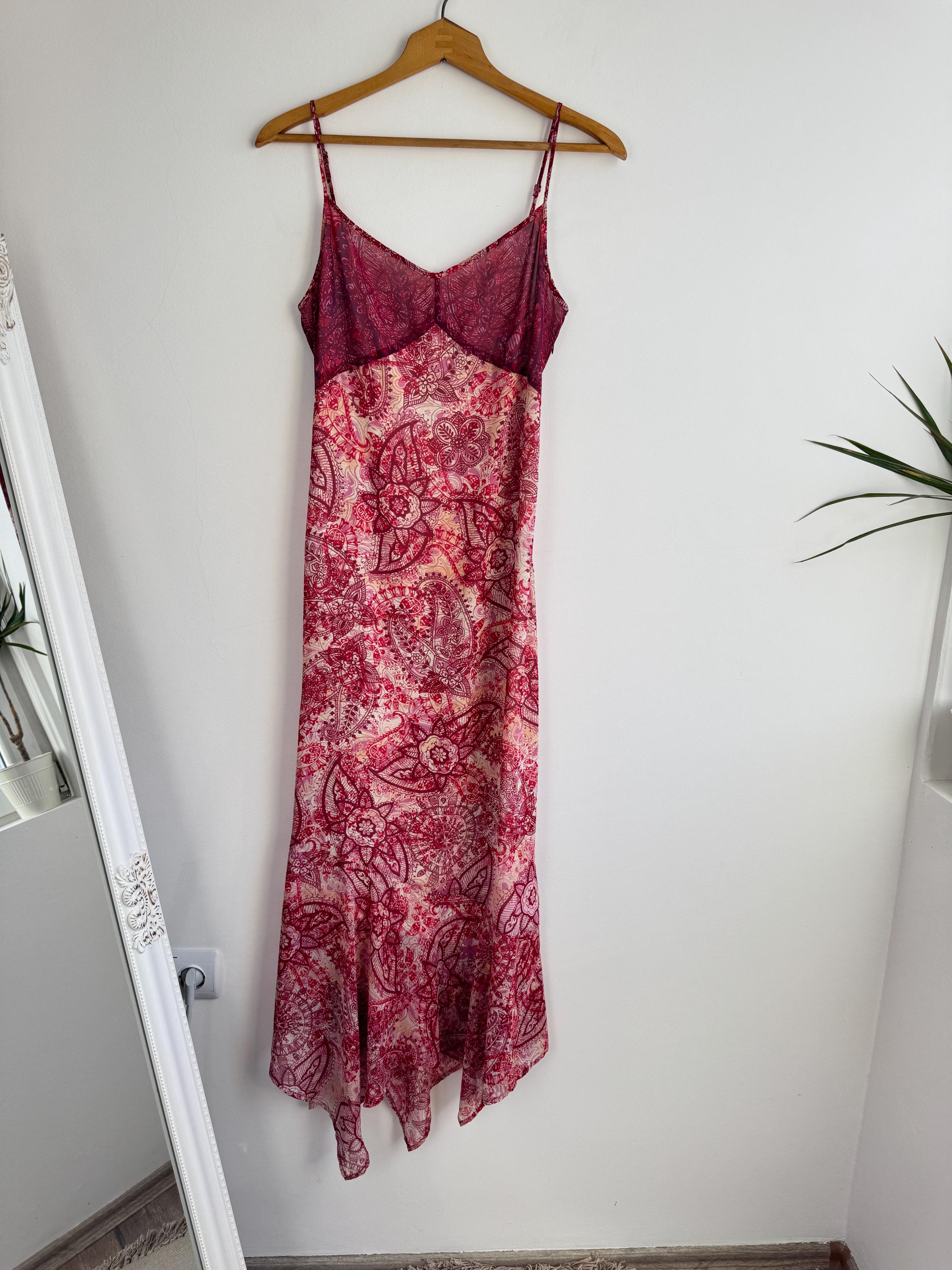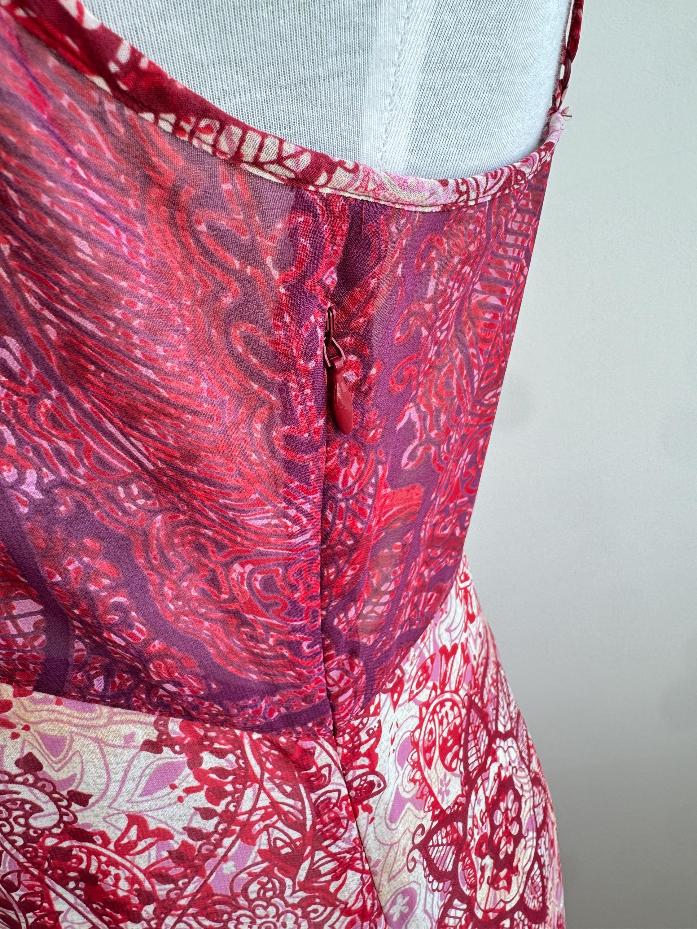 This is a stunning vintage Y2K Mexx maxi dress in size EUR 38 M. This sheer asymmetrical dress features a captivating red and pink paisley mandala print with a delicate mesh overlay that creates a beautiful depth. The slip-style silhouette of this maxo slip dress is elevated by a flattering V-neckline, adjustable spaghetti straps, and a whimsical asymmetrical hemline that moves gracefully as you walk. A hidden side zip closure allows a perfect fit.