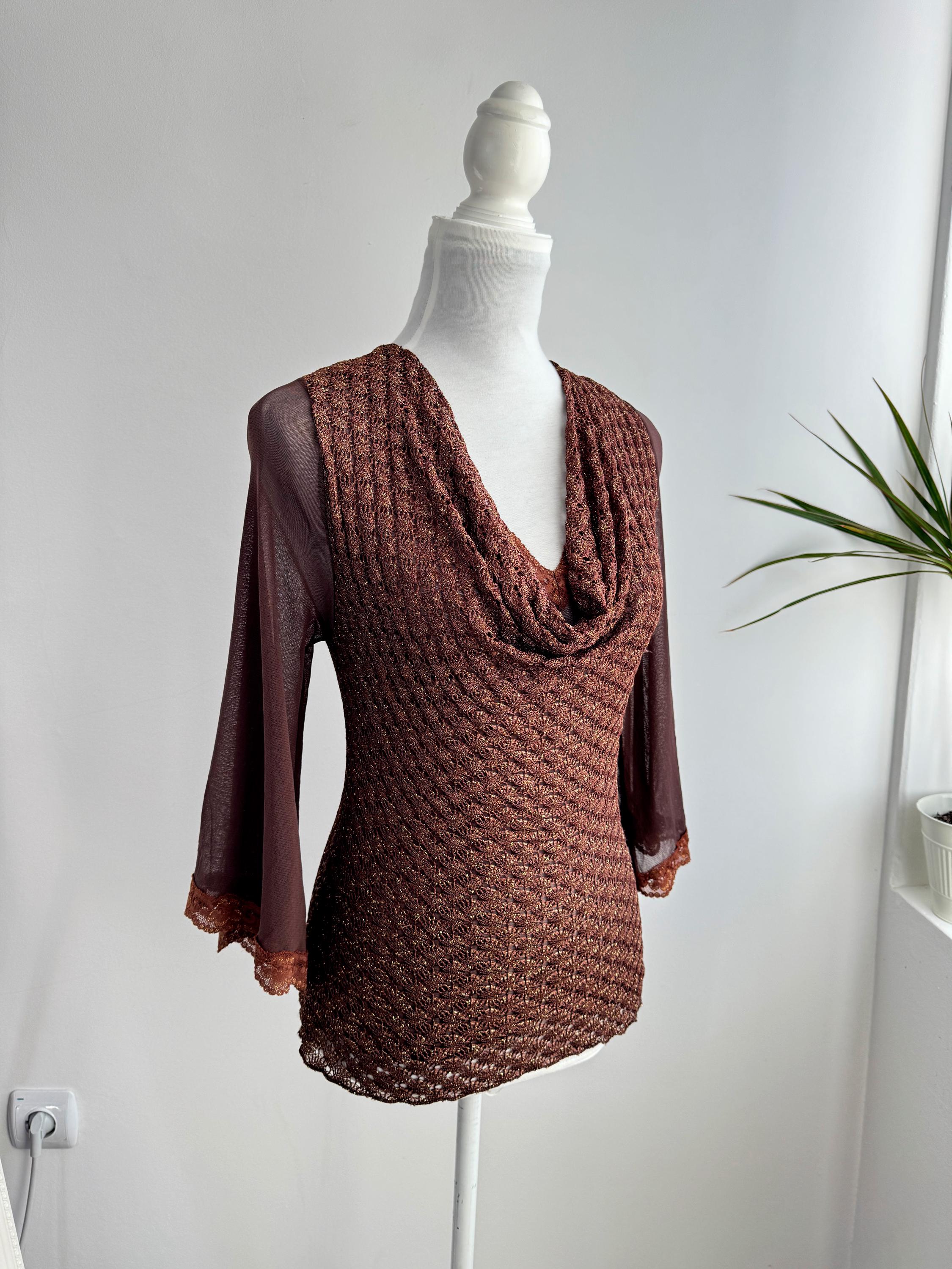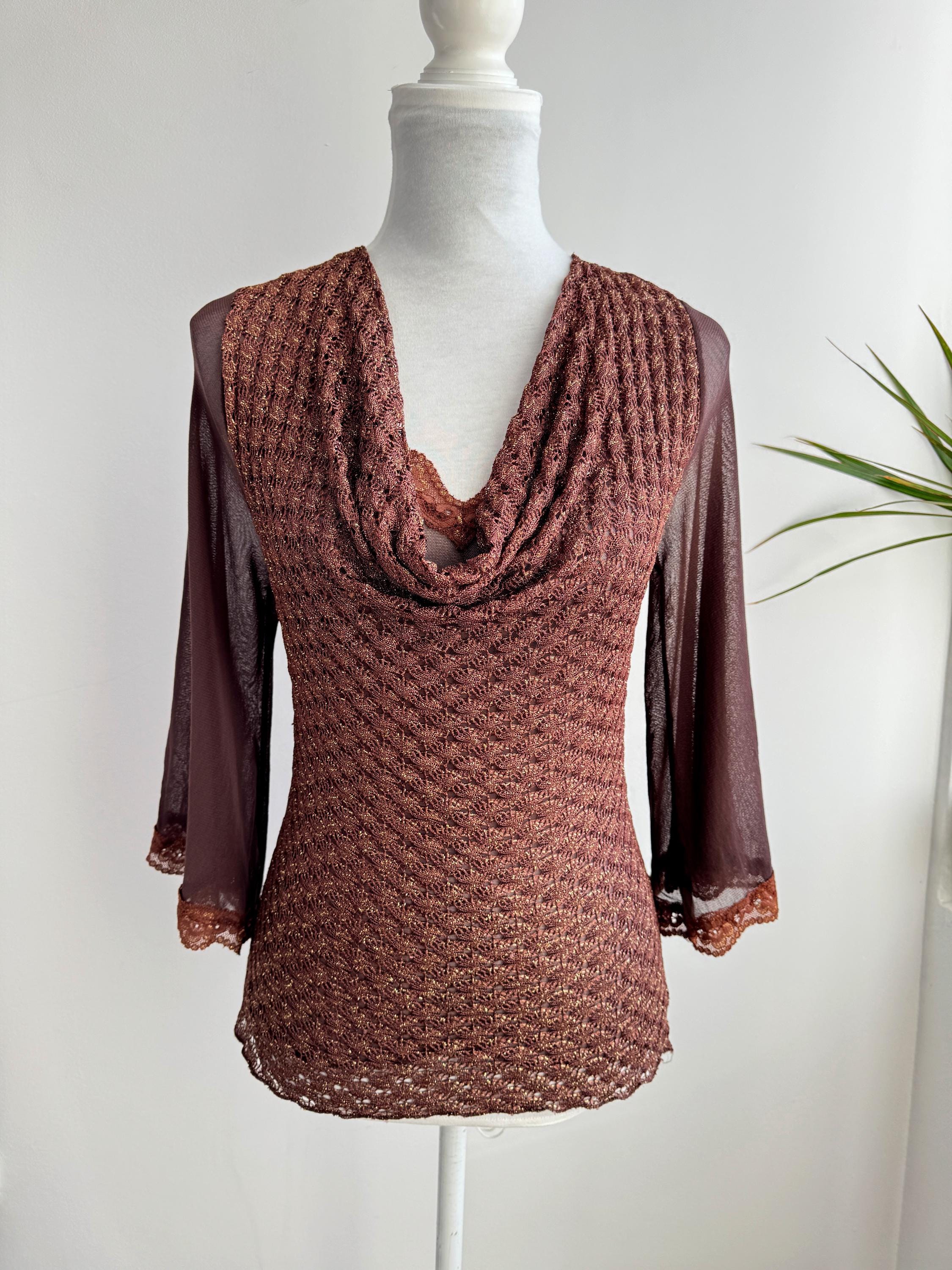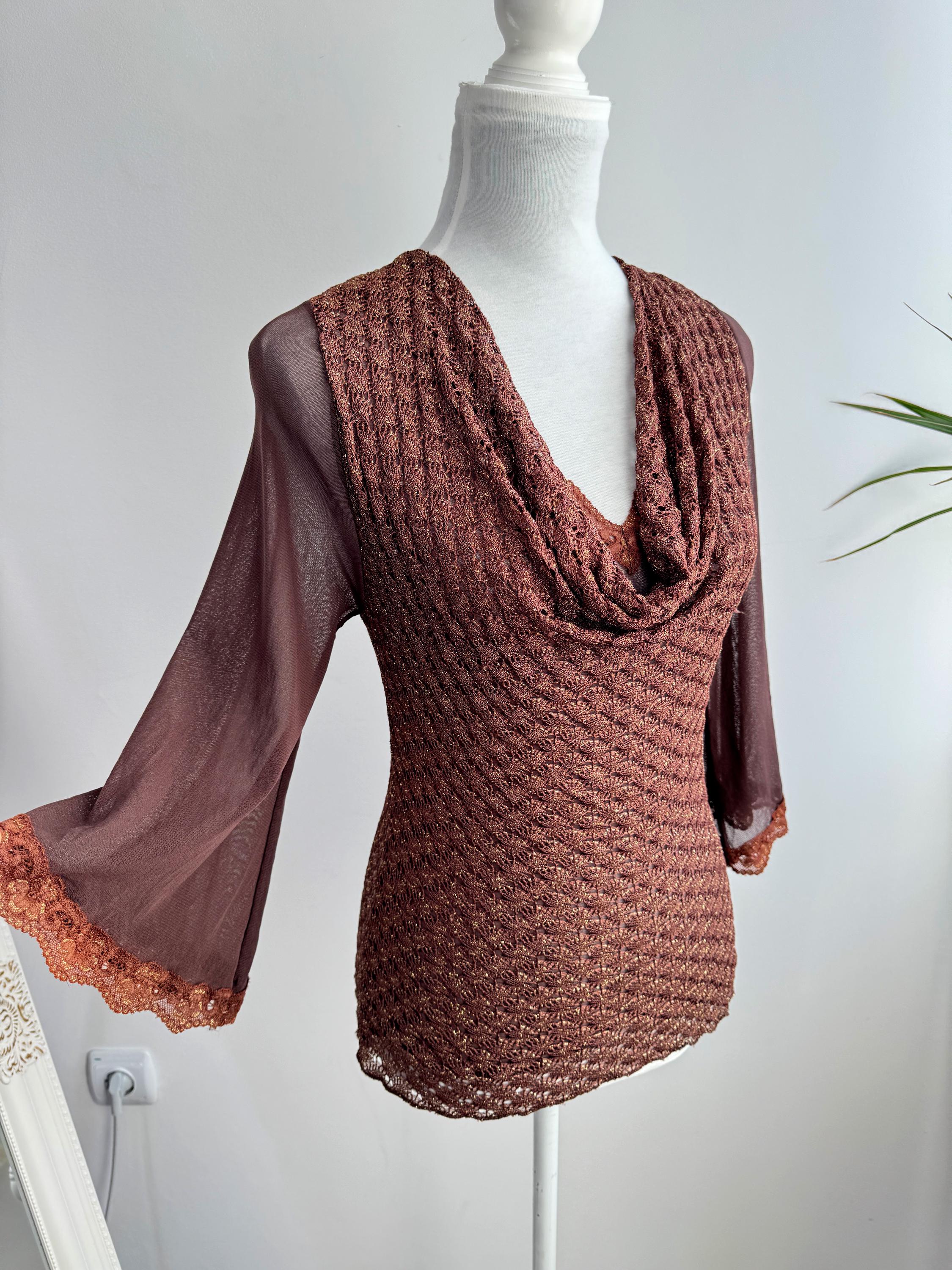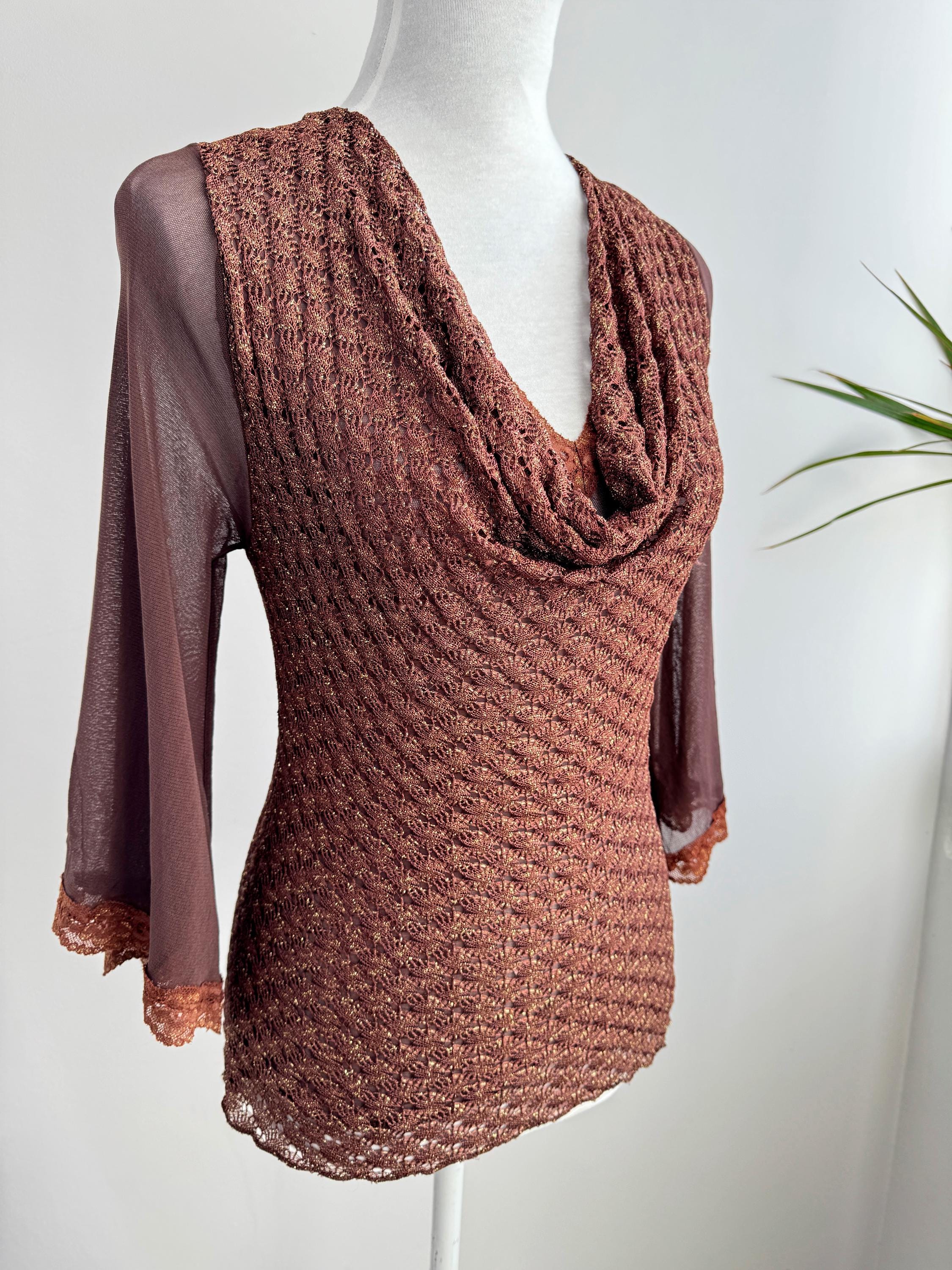 This is a vintage Y2K brown metallic lace knit top from Amanda Paris in size S/M. This vintage sheer mesh flare sleeve top perfectly captures the effortless glamour of the late 90s and early 2000s. Featuring a rich copper-brown knit with an intricate metallic gold shimmer, this bell sleeve mesh top is designed to catch the light beautifully. The draped cowl neckline creates a sophisticated silhouette, while the sheer, flared mesh bell sleeves add a touch of romantic, bohemian flair. Made in France, this brown lace top combines high-quality craftsmanship with a versatile aesthetic that works just as well for a night out as it does for a refined dinner look. The stretchy polyamide fabric ensures a body-hugging fit that remains comfortable throughout the day.