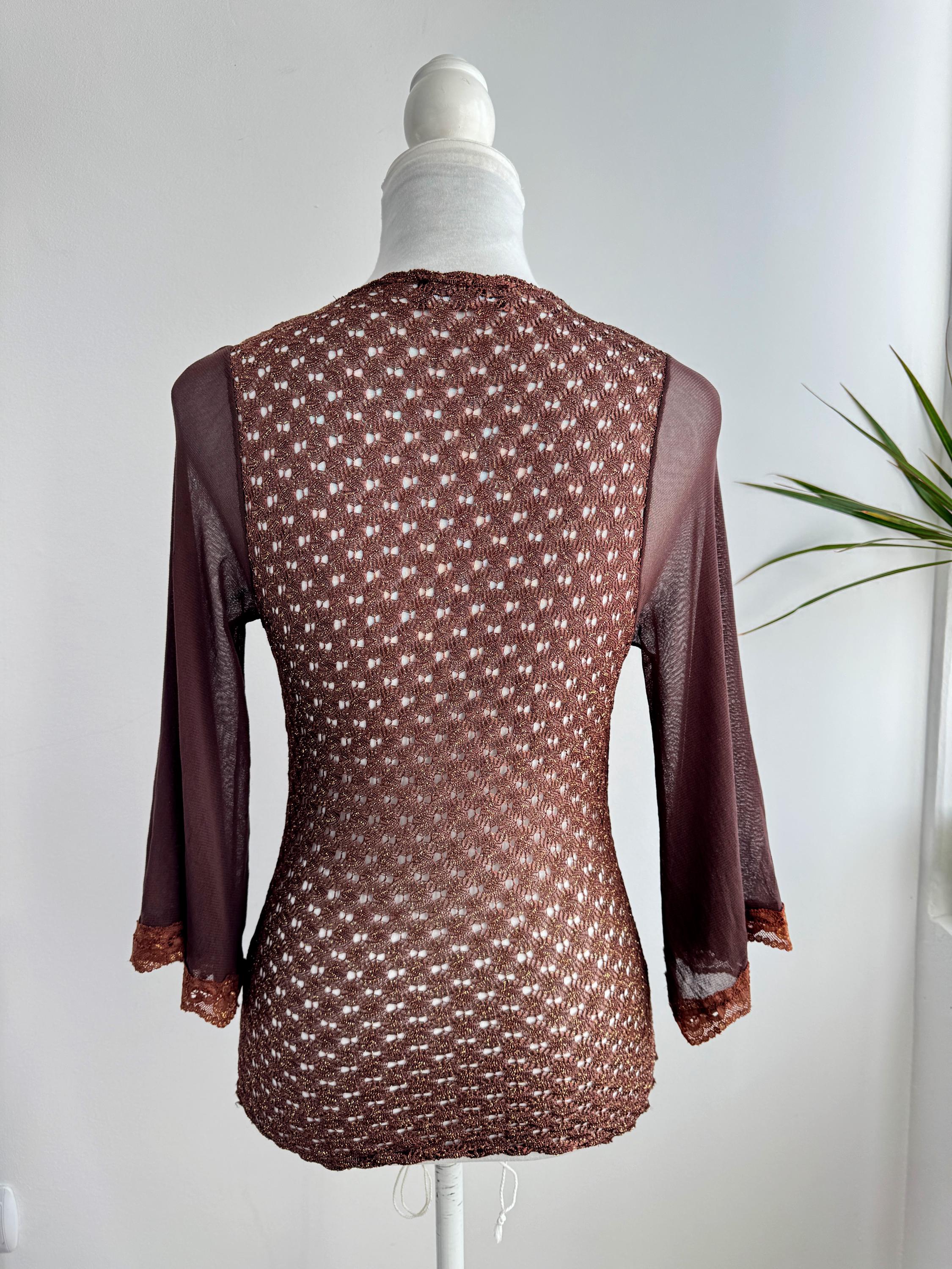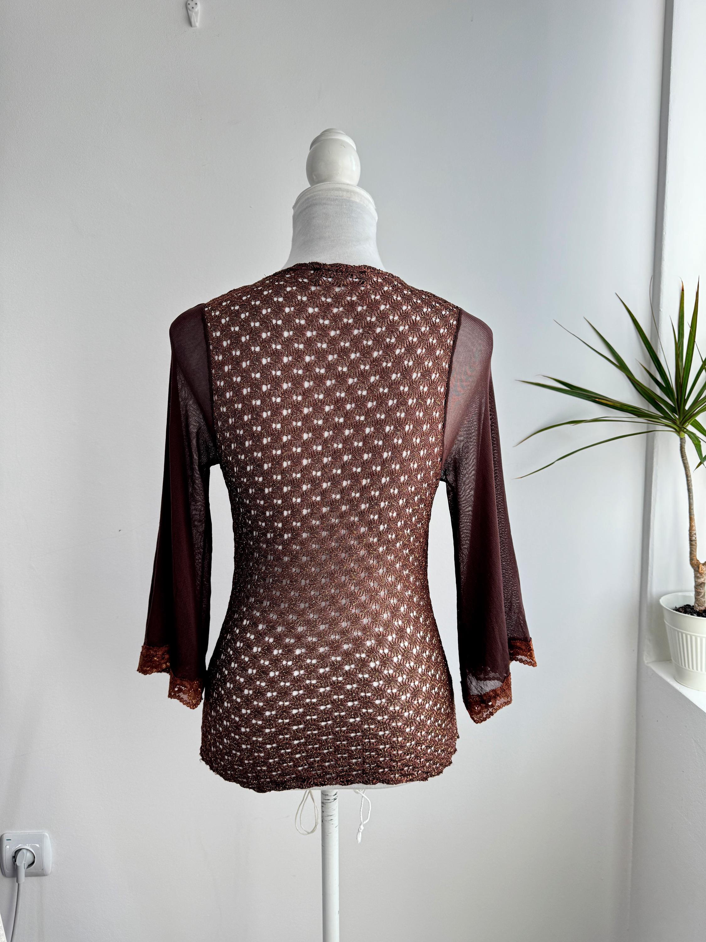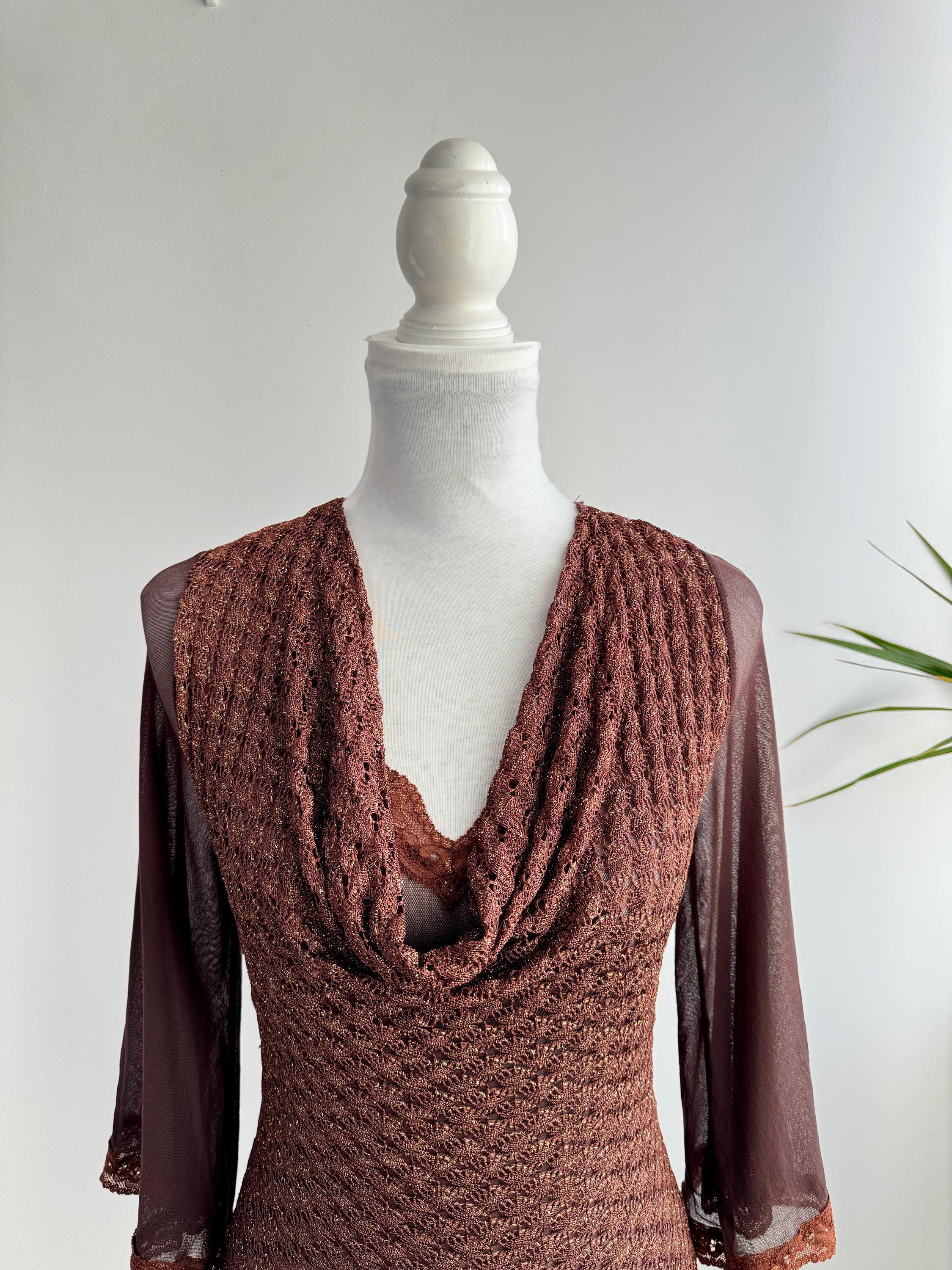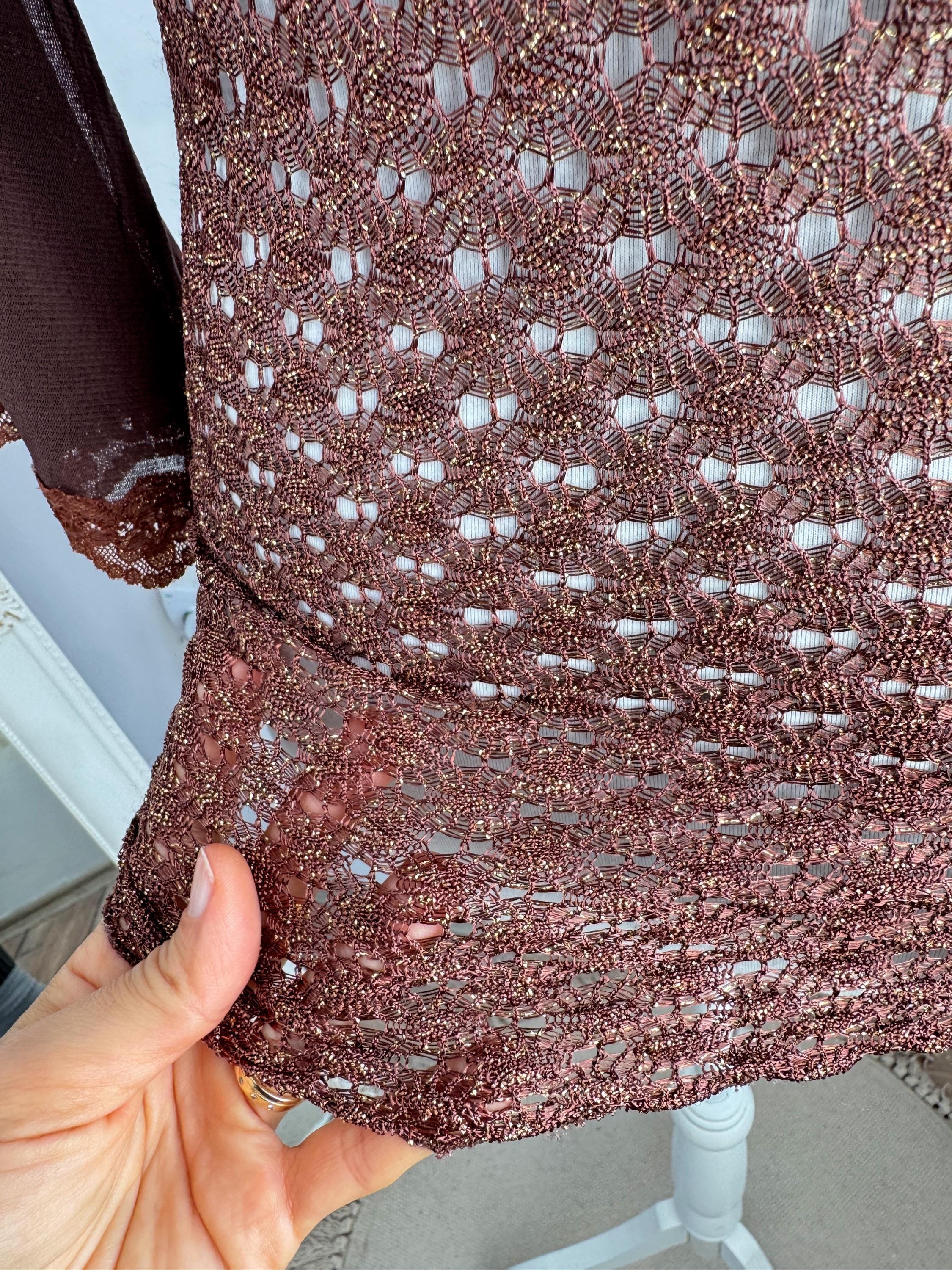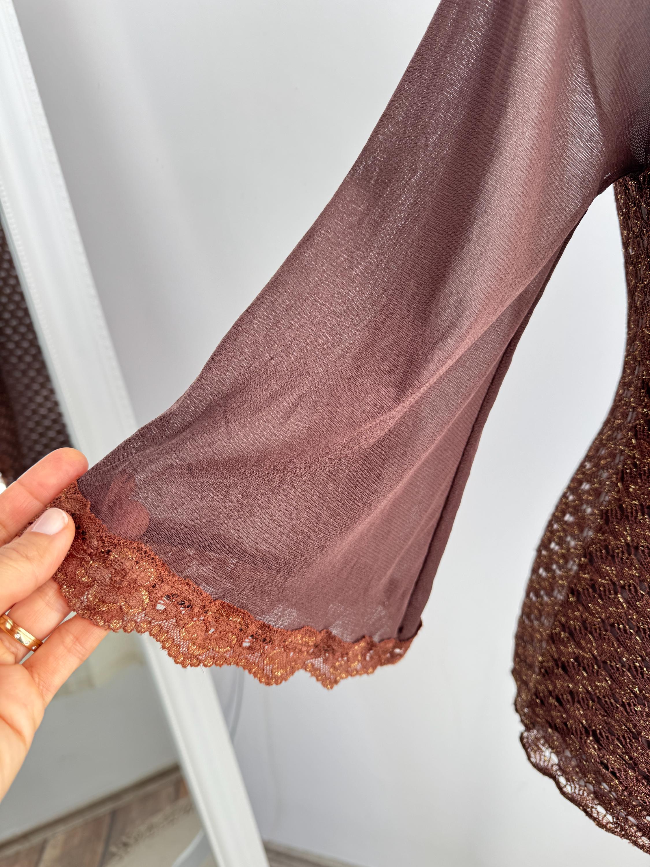 This is a vintage Y2K brown metallic lace knit top from Amanda Paris in size S/M. This vintage sheer mesh flare sleeve top perfectly captures the effortless glamour of the late 90s and early 2000s. Featuring a rich copper-brown knit with an intricate metallic gold shimmer, this bell sleeve mesh top is designed to catch the light beautifully. The draped cowl neckline creates a sophisticated silhouette, while the sheer, flared mesh bell sleeves add a touch of romantic, bohemian flair. Made in France, this brown lace top combines high-quality craftsmanship with a versatile aesthetic that works just as well for a night out as it does for a refined dinner look. The stretchy polyamide fabric ensures a body-hugging fit that remains comfortable throughout the day.