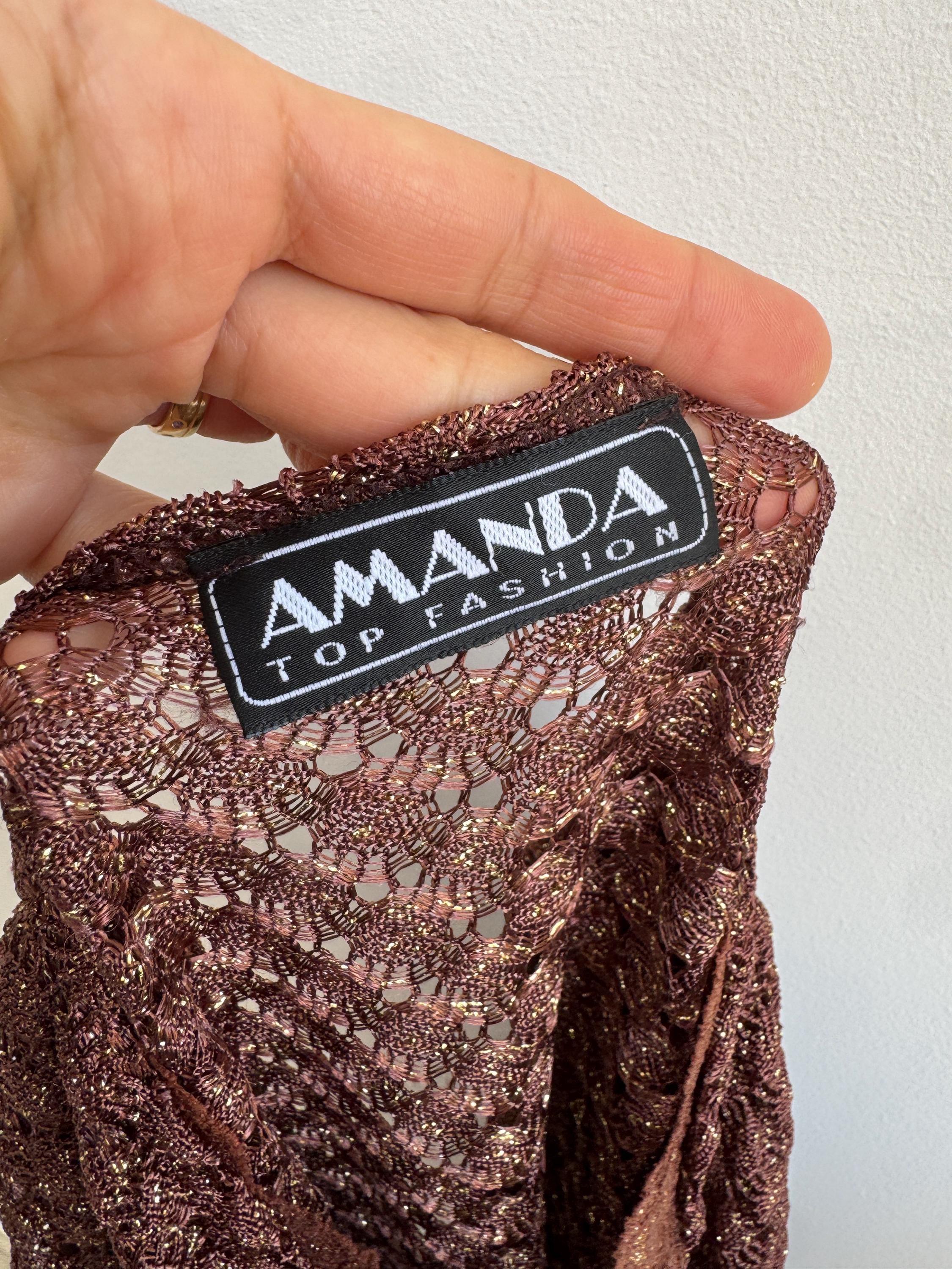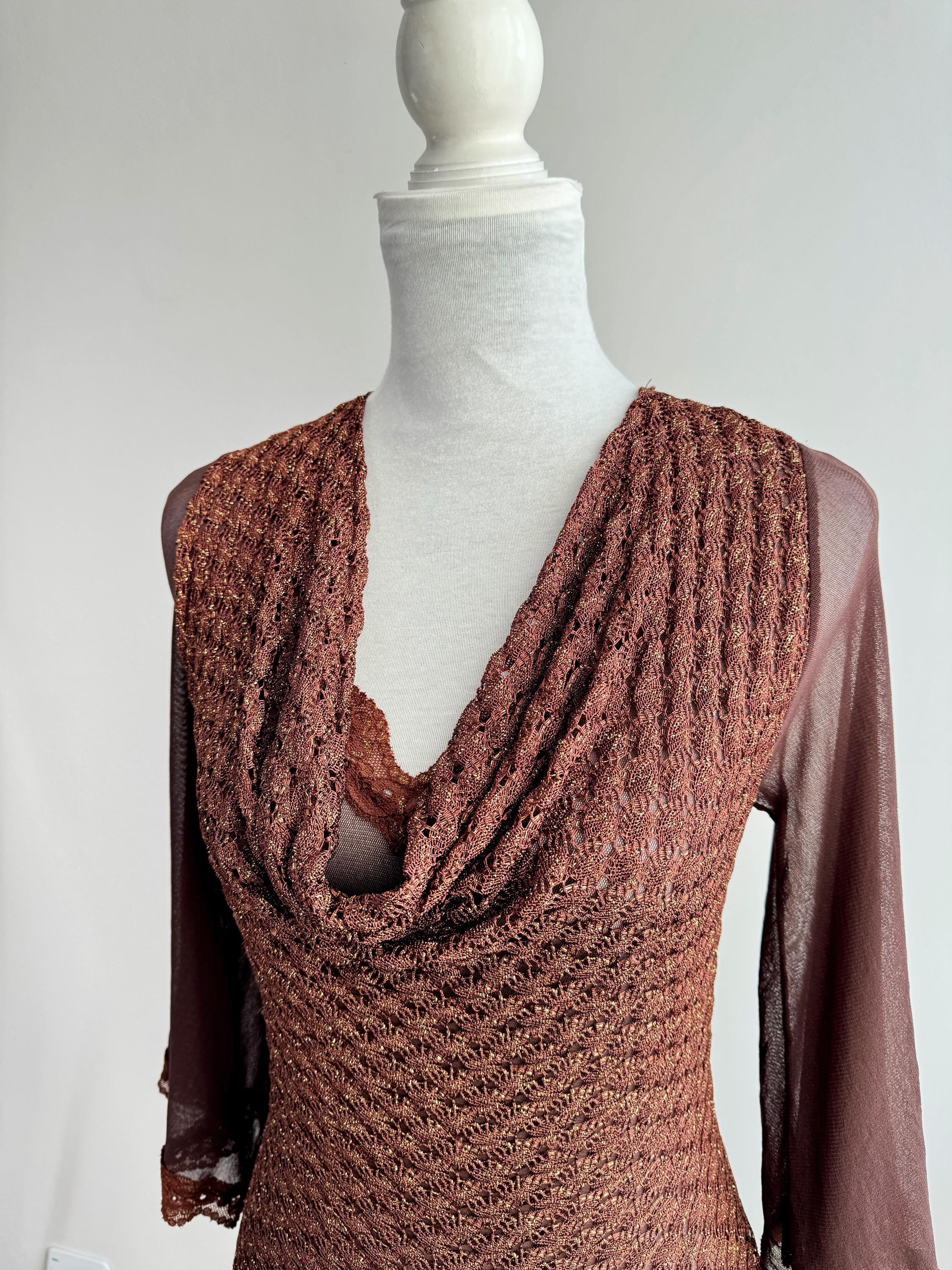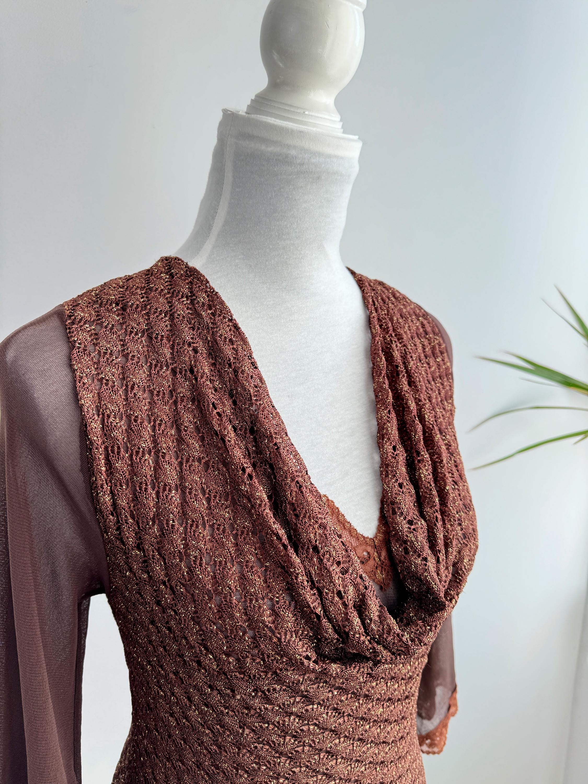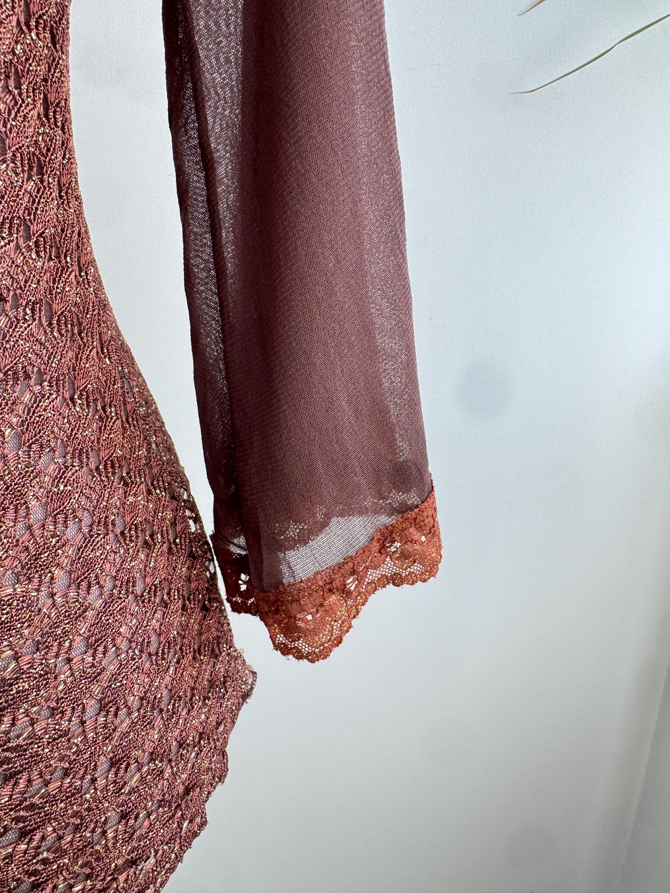 This is a vintage Y2K brown metallic lace knit top from Amanda Paris in size S/M. This vintage sheer mesh flare sleeve top perfectly captures the effortless glamour of the late 90s and early 2000s. Featuring a rich copper-brown knit with an intricate metallic gold shimmer, this bell sleeve mesh top is designed to catch the light beautifully. The draped cowl neckline creates a sophisticated silhouette, while the sheer, flared mesh bell sleeves add a touch of romantic, bohemian flair. Made in France, this brown lace top combines high-quality craftsmanship with a versatile aesthetic that works just as well for a night out as it does for a refined dinner look. The stretchy polyamide fabric ensures a body-hugging fit that remains comfortable throughout the day.