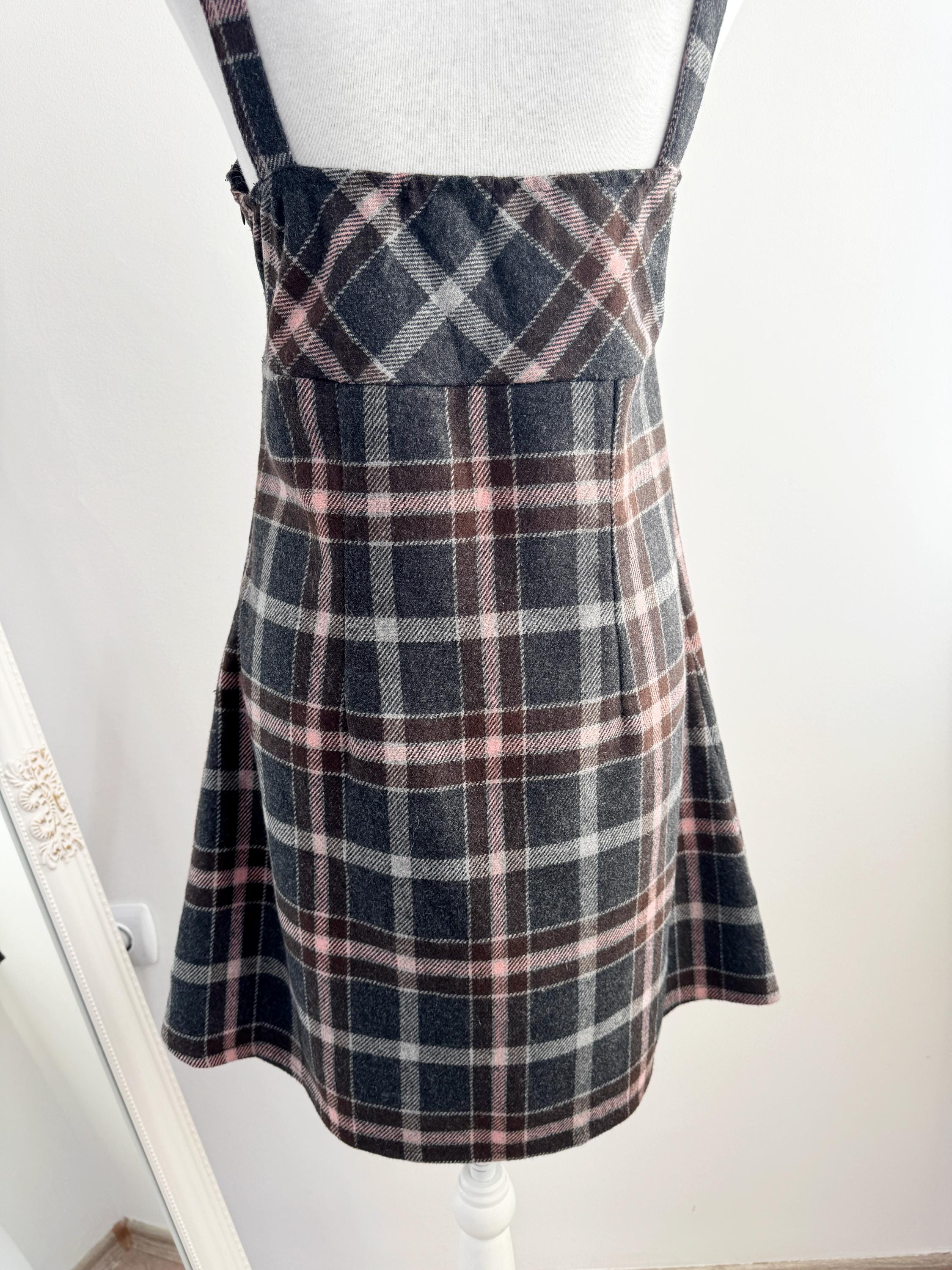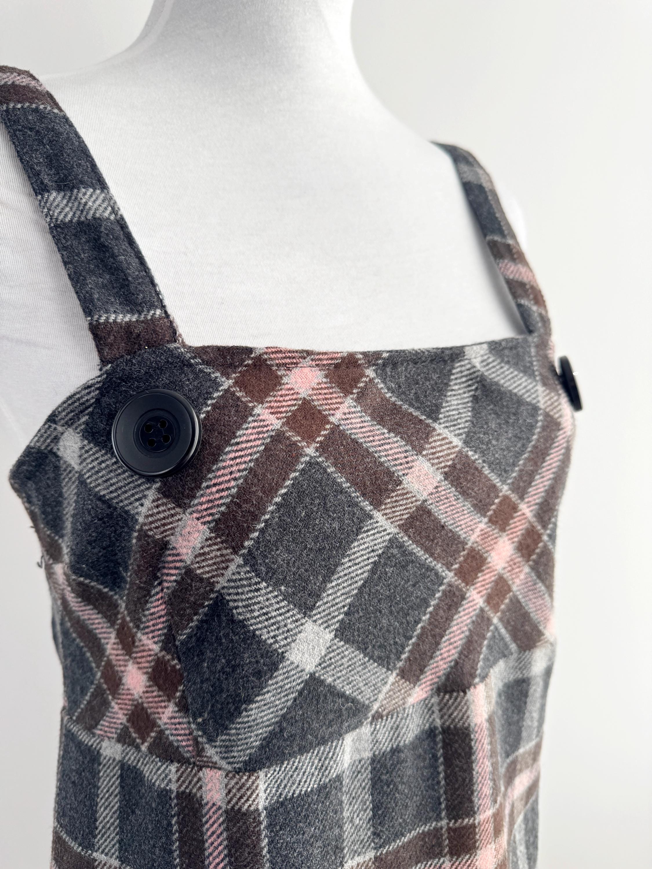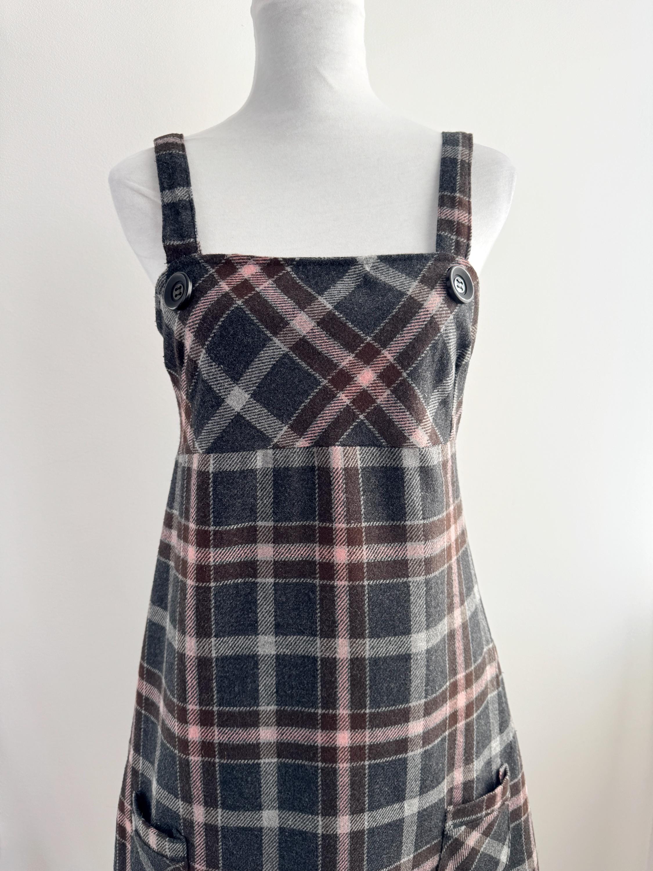 This is a stunning vintage 90s plaid pinafore dress for women in size M/L. Expertly crafted in Italy by Floyd by Smith, this piece perfectly captures the Dark Academia and 90s vibe. This check mini dress features a sophisticated tartan check pattern in shades of charcoal grey, deep chocolate brown, and soft pale pink, making it a versatile addition to your autumn and winter wardrobe.