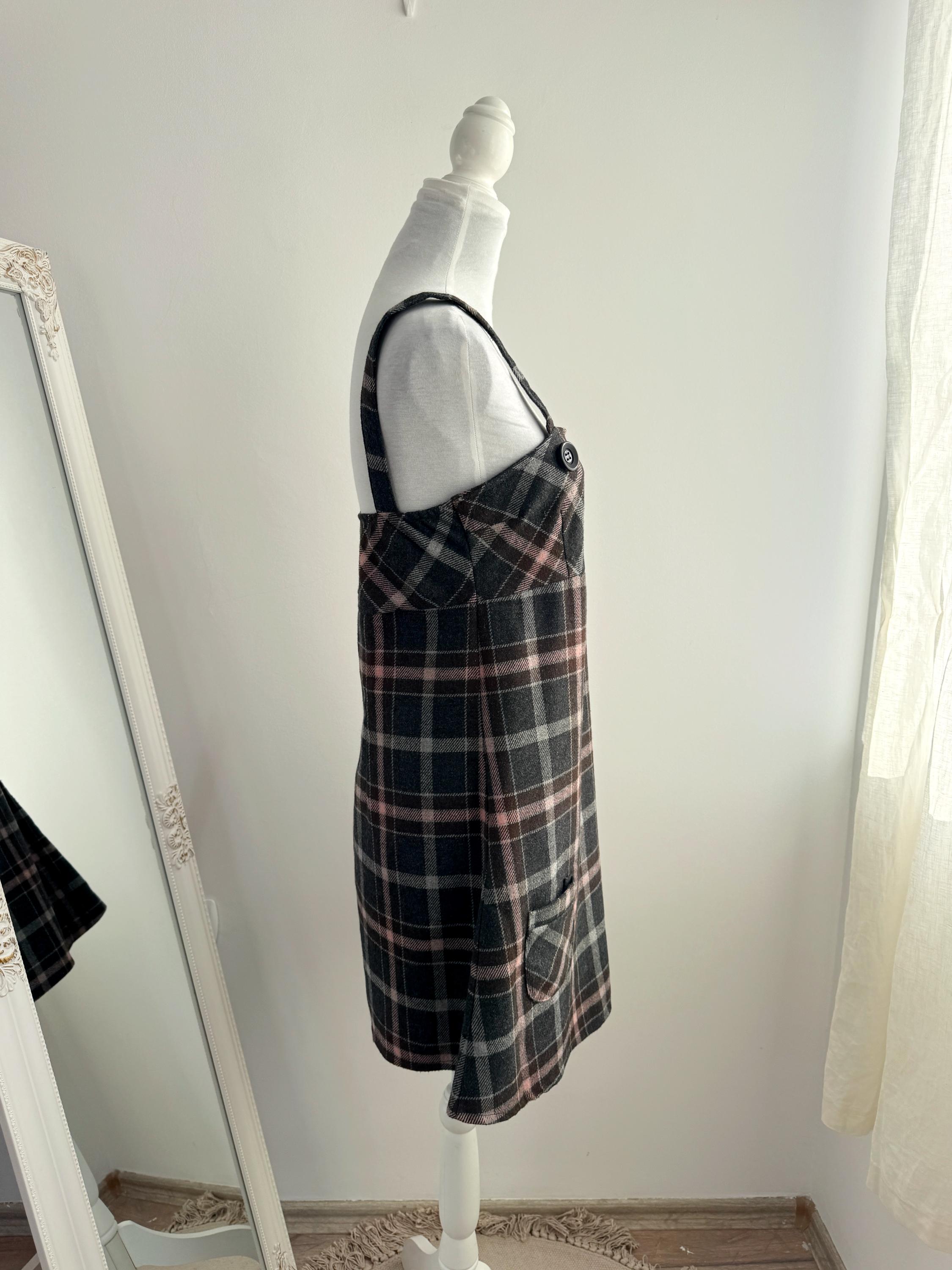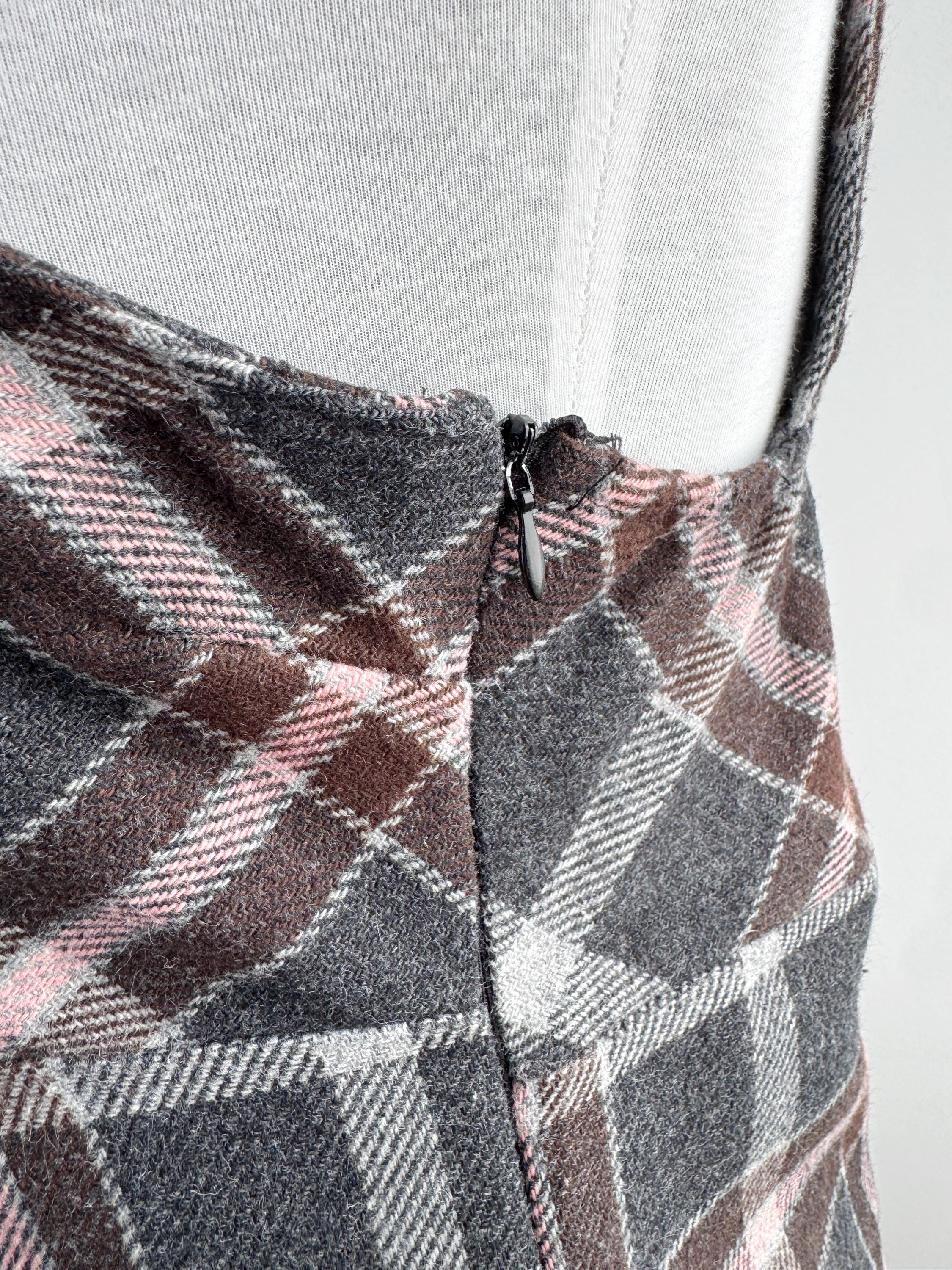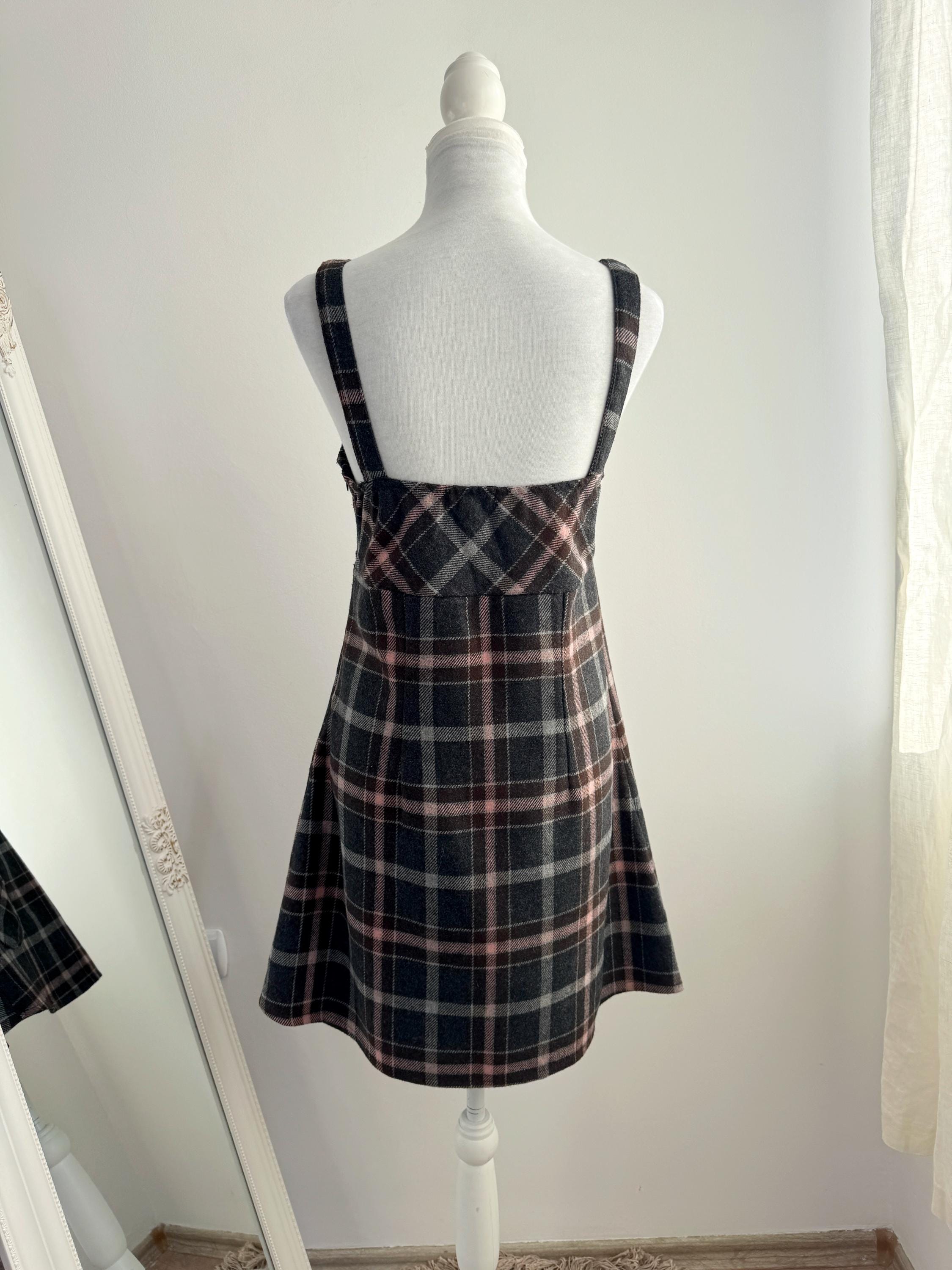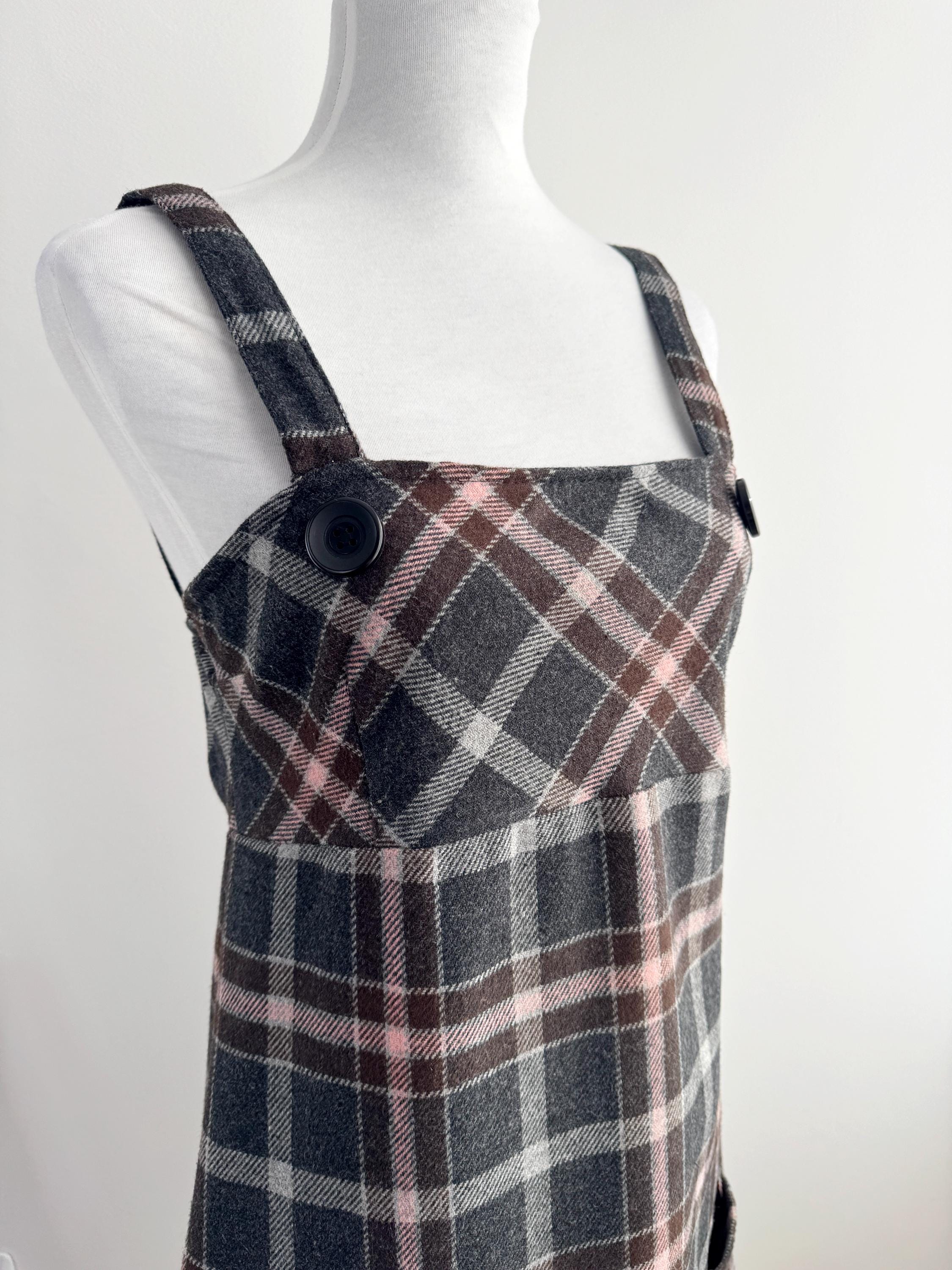 This is a stunning vintage 90s plaid pinafore dress for women in size M/L. Expertly crafted in Italy by Floyd by Smith, this piece perfectly captures the Dark Academia and 90s vibe. This check mini dress features a sophisticated tartan check pattern in shades of charcoal grey, deep chocolate brown, and soft pale pink, making it a versatile addition to your autumn and winter wardrobe.
