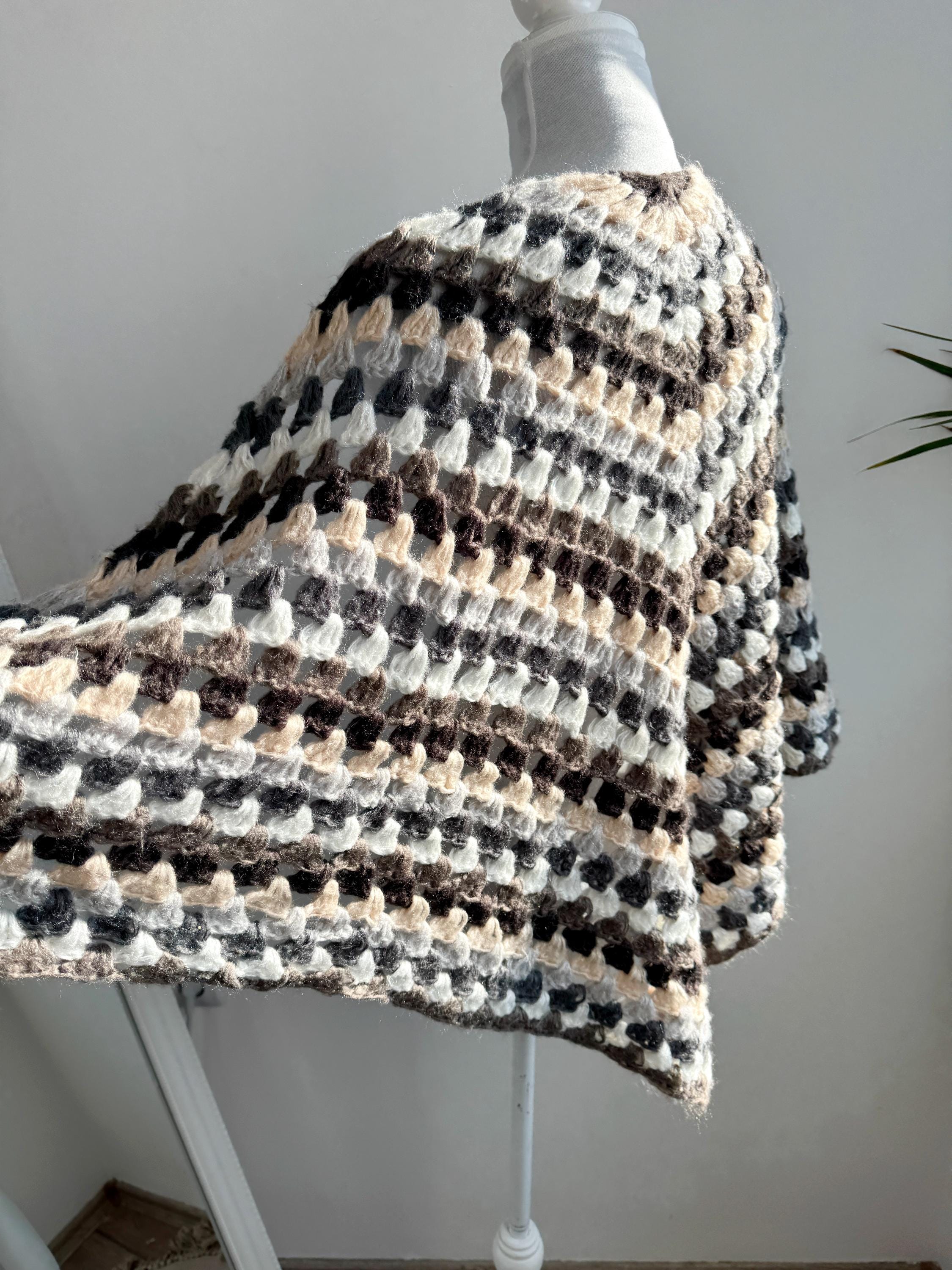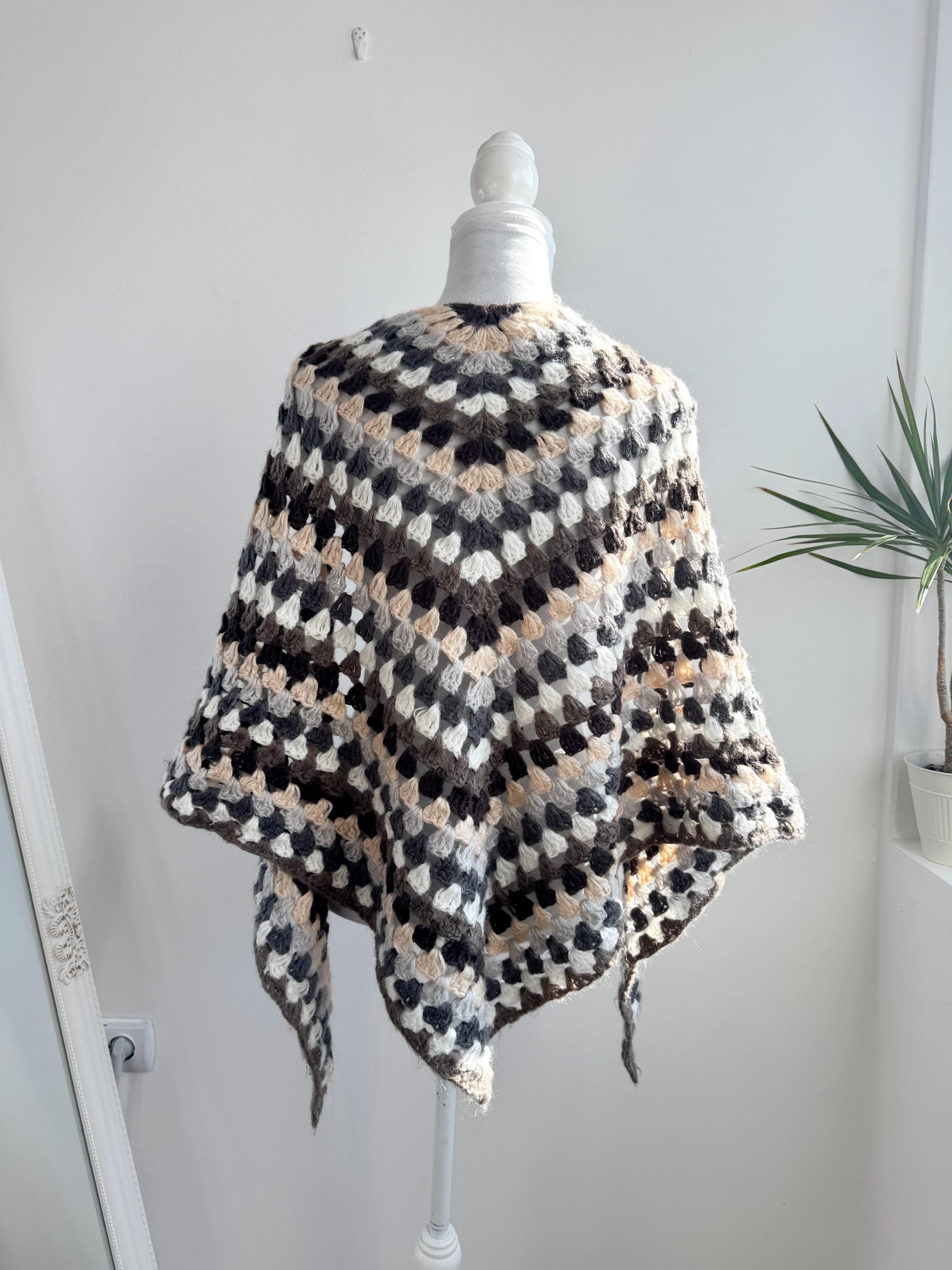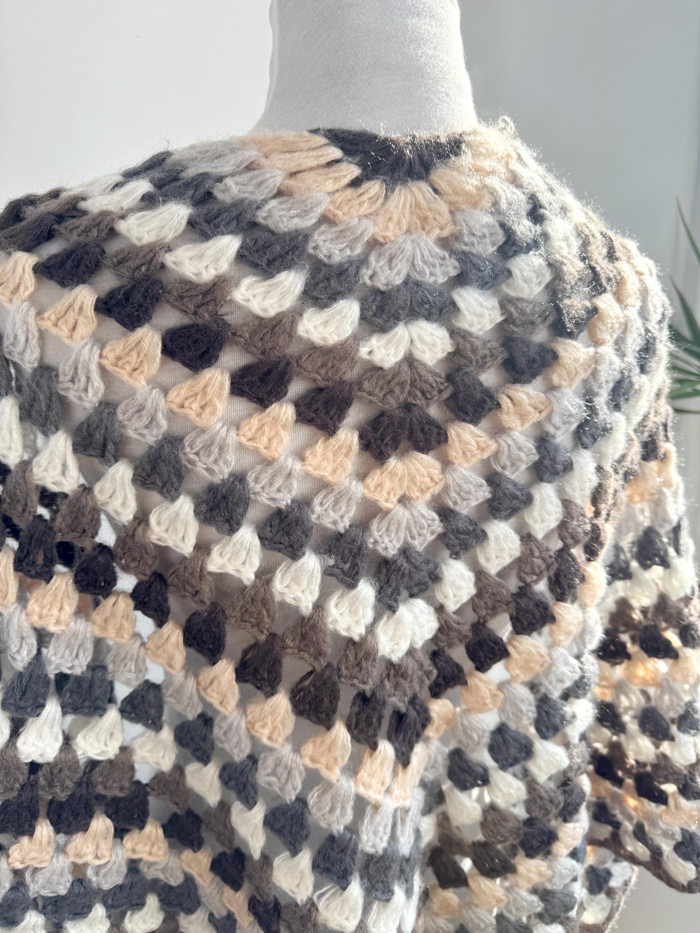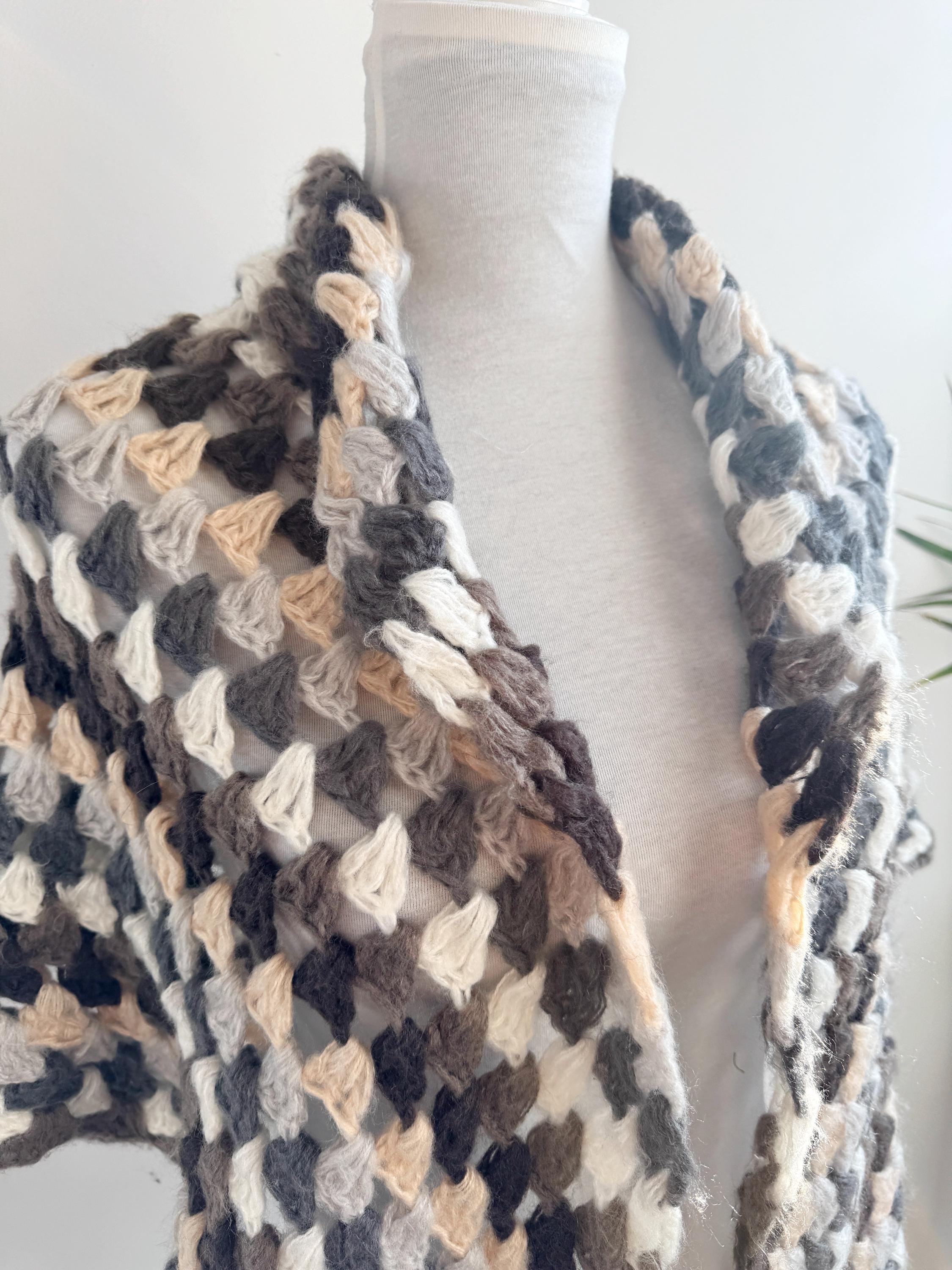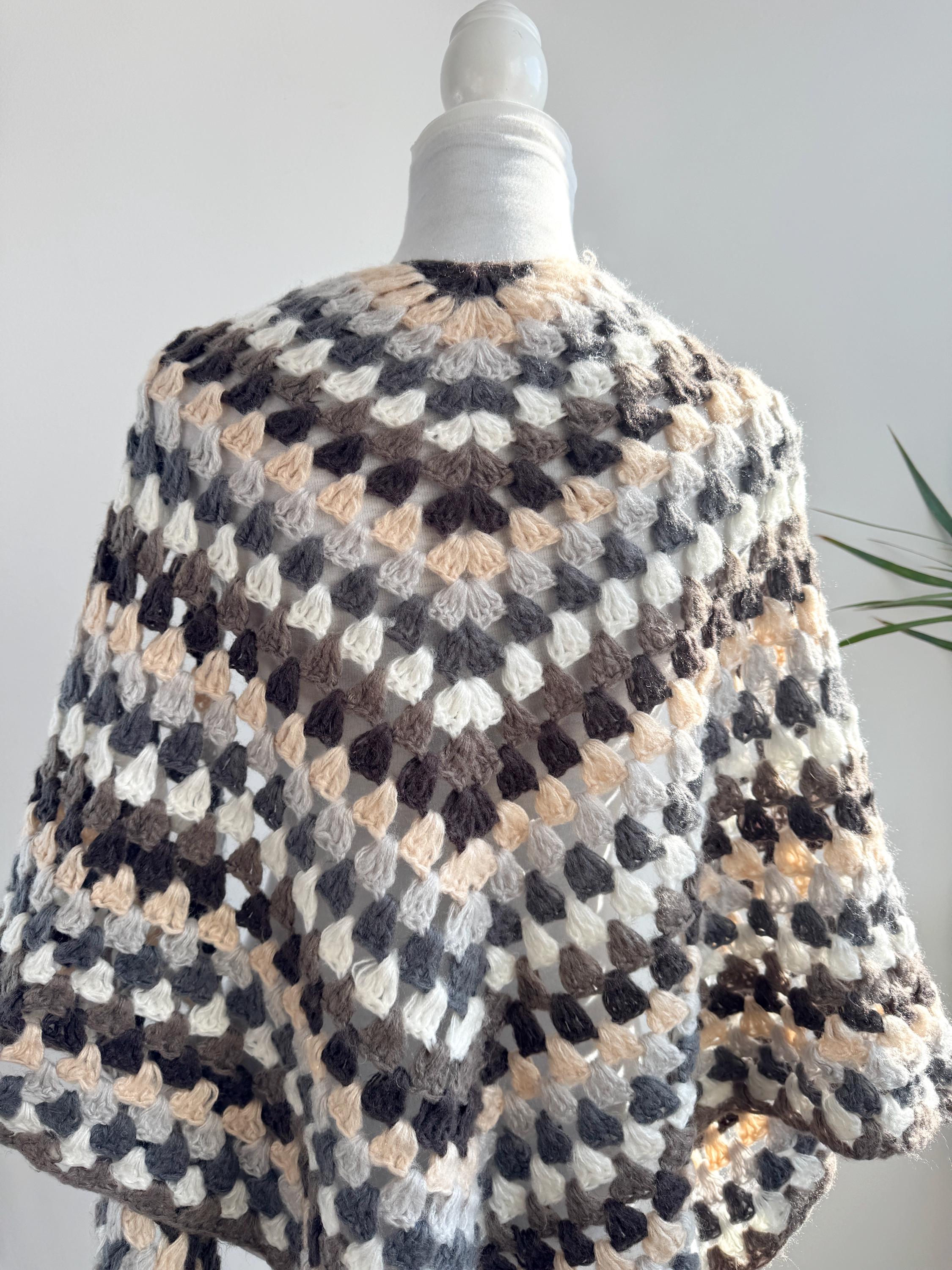This is a vintage hand-crocheted shawl in eathy nude tones - soft grey, dark and camel brown, beige and cream. Featuring a classic granny-cluster stitch, this soft fluffy acrylic wrap shawl blends rustic charm with a modern, earthy color palette. This boho grannycore shawl incredibly versatile; drape it over your shoulders as a cozy cape for chilly evenings, or wrap it thick around your neck as a chunky statement scarf.