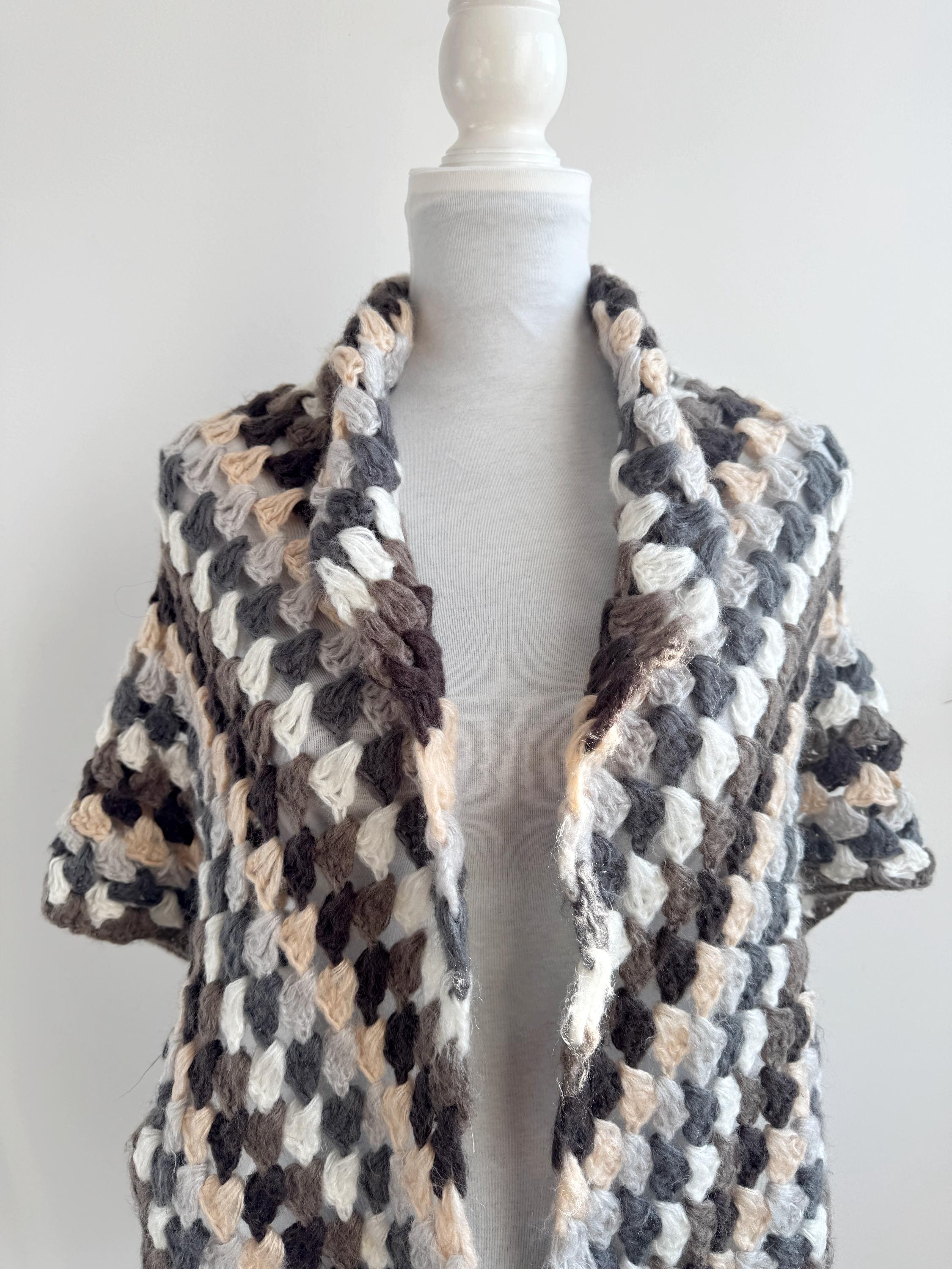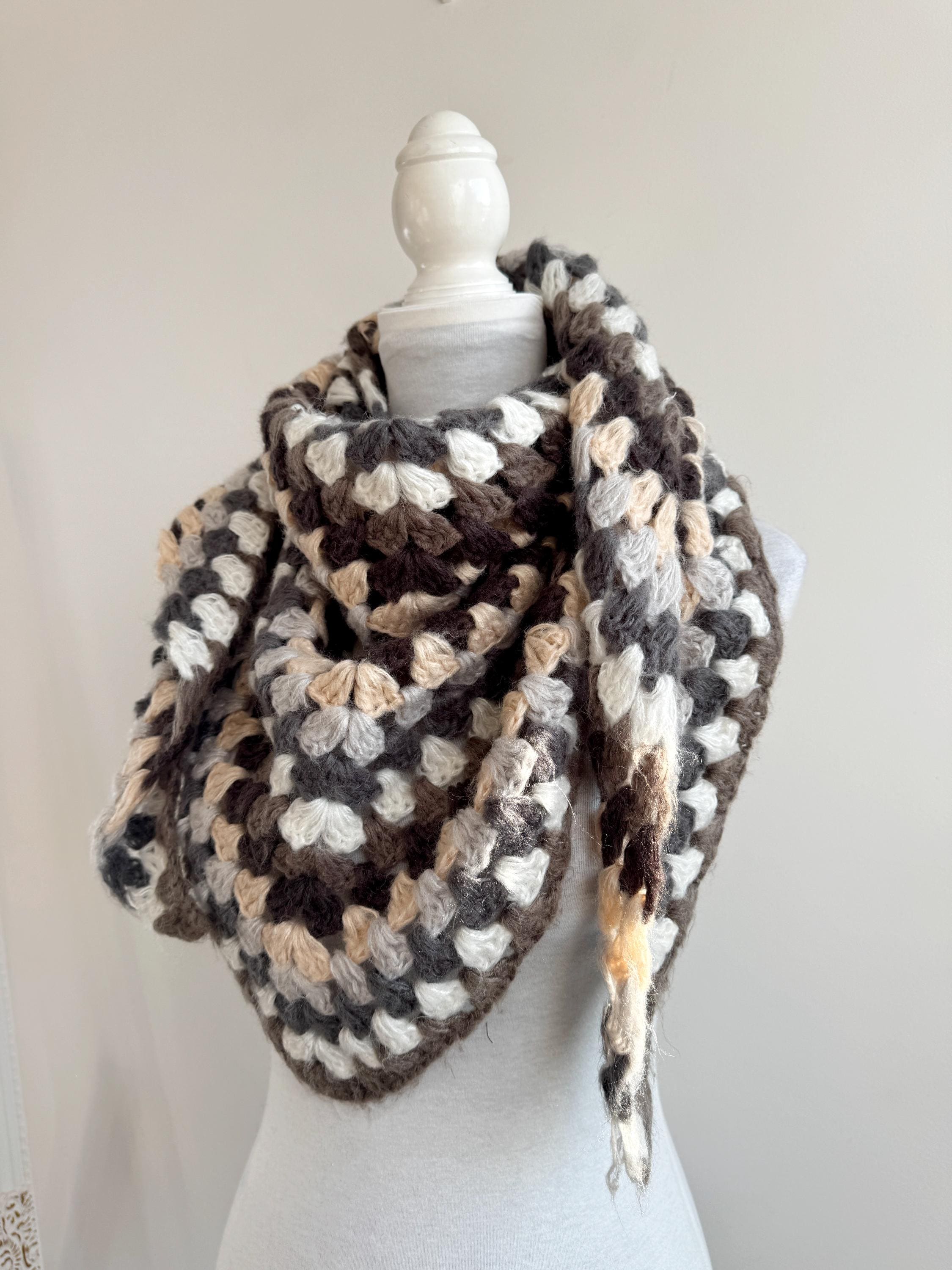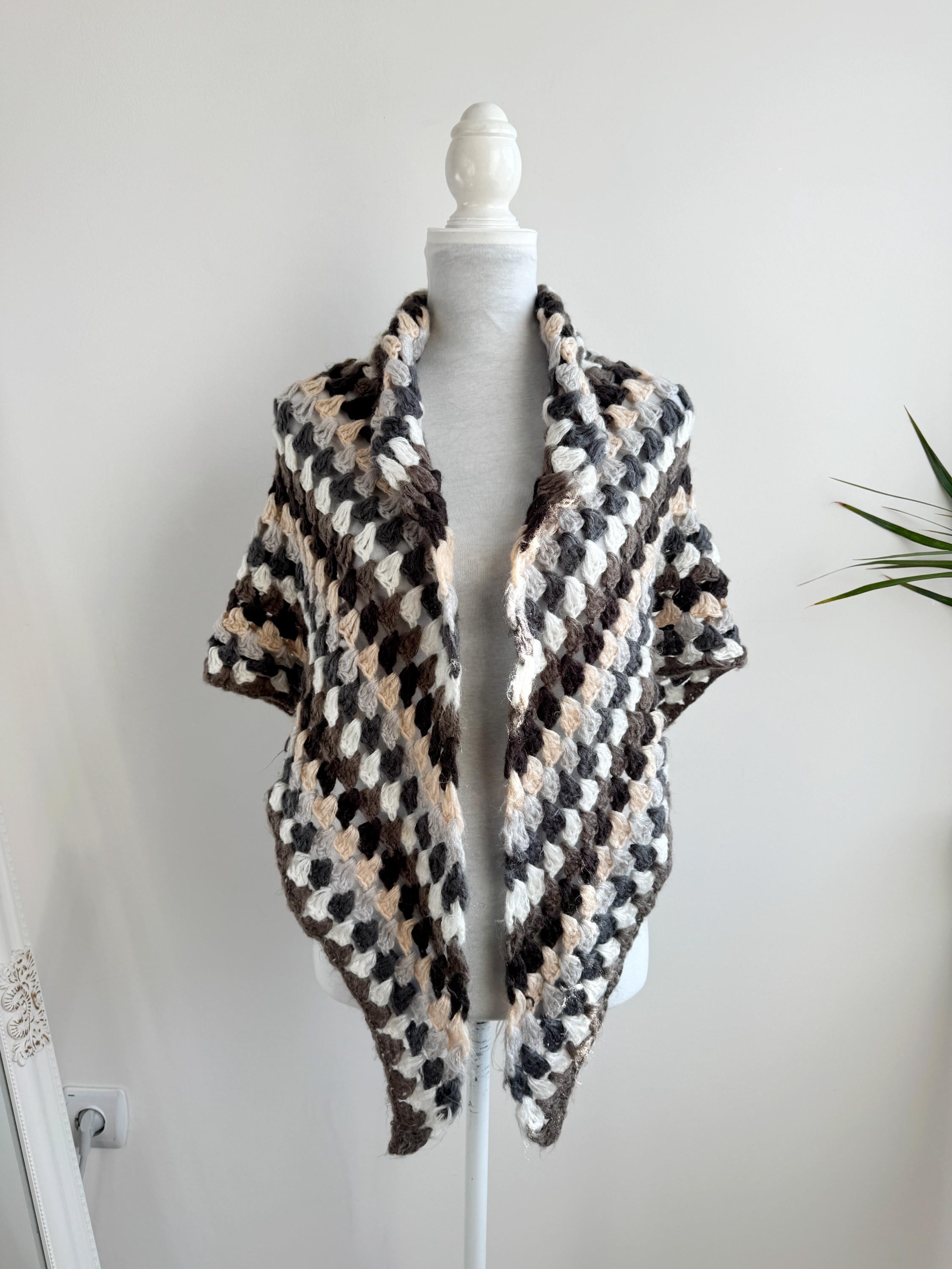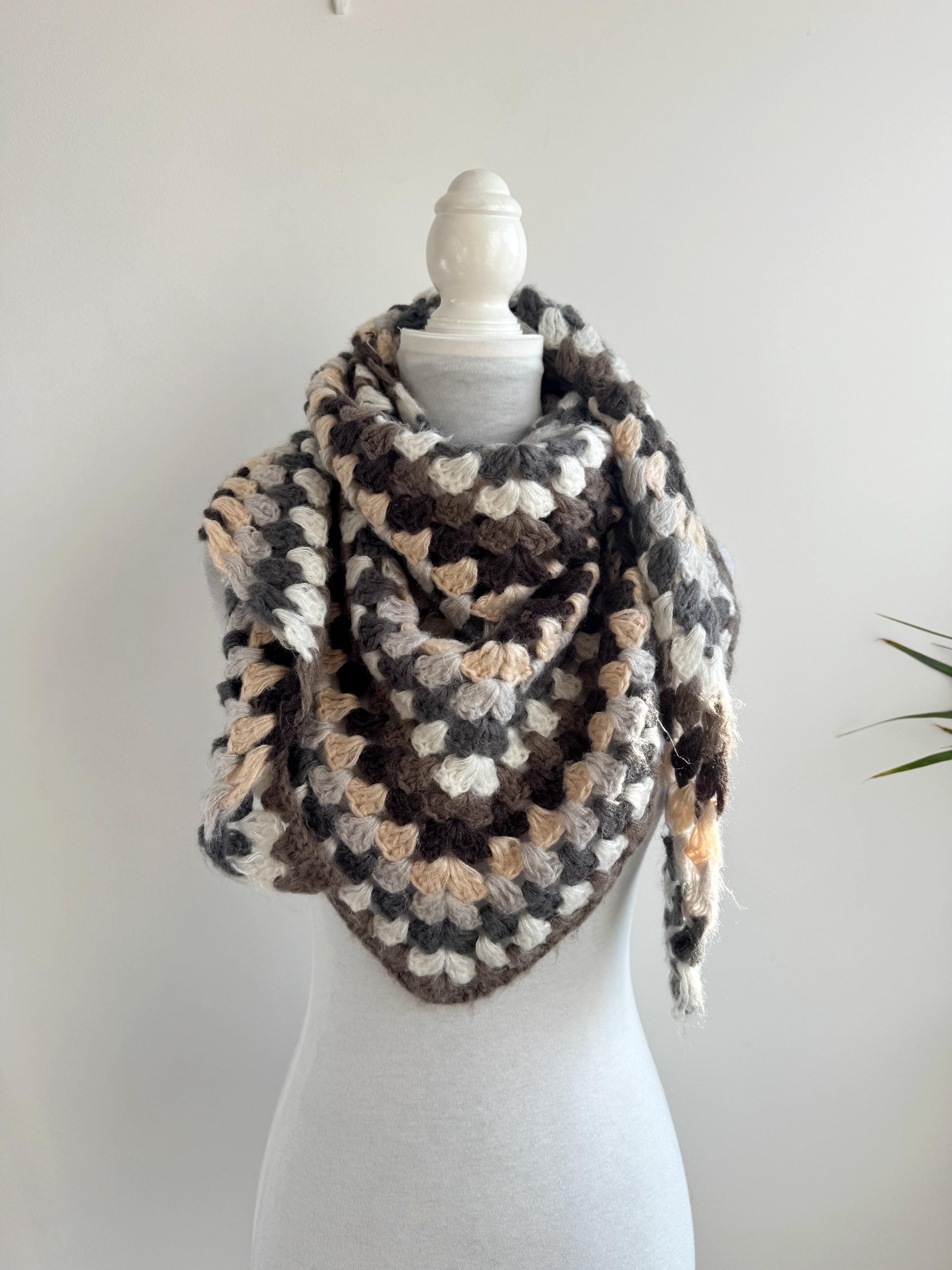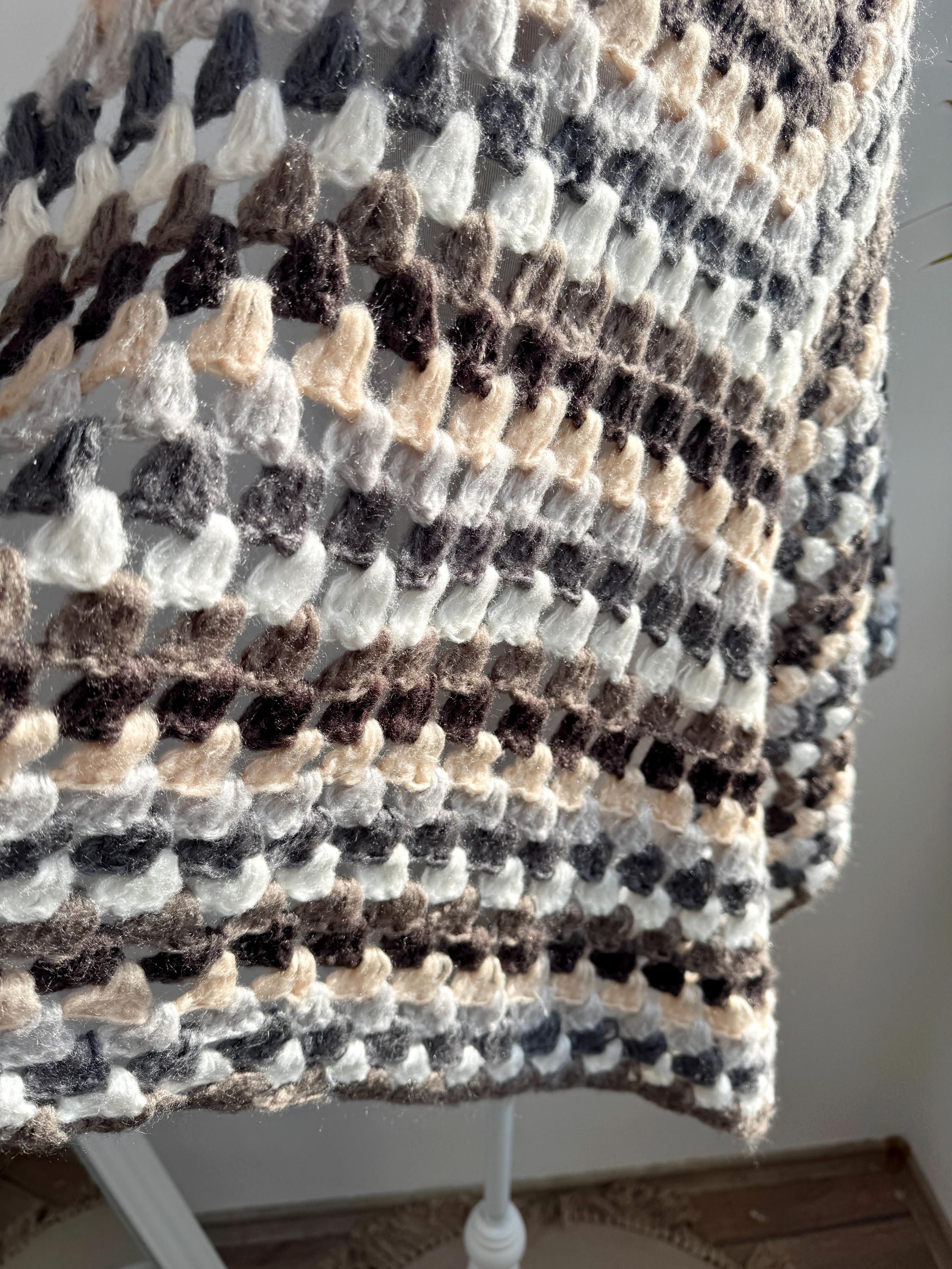 This is a vintage hand-crocheted shawl in eathy nude tones - soft grey, dark and camel brown, beige and cream. Featuring a classic granny-cluster stitch, this soft fluffy acrylic wrap shawl blends rustic charm with a modern, earthy color palette. This boho grannycore shawl incredibly versatile; drape it over your shoulders as a cozy cape for chilly evenings, or wrap it thick around your neck as a chunky statement scarf.
