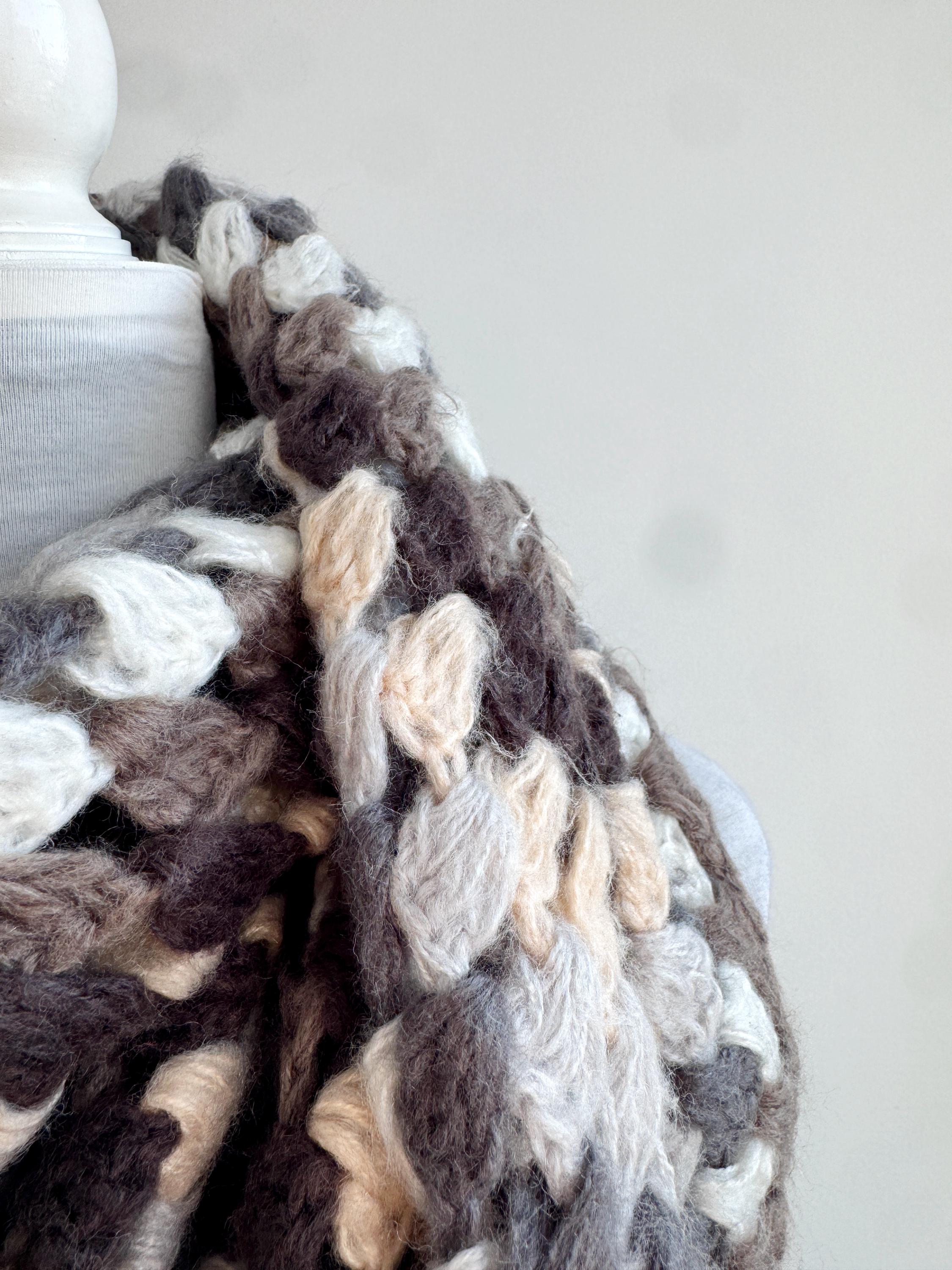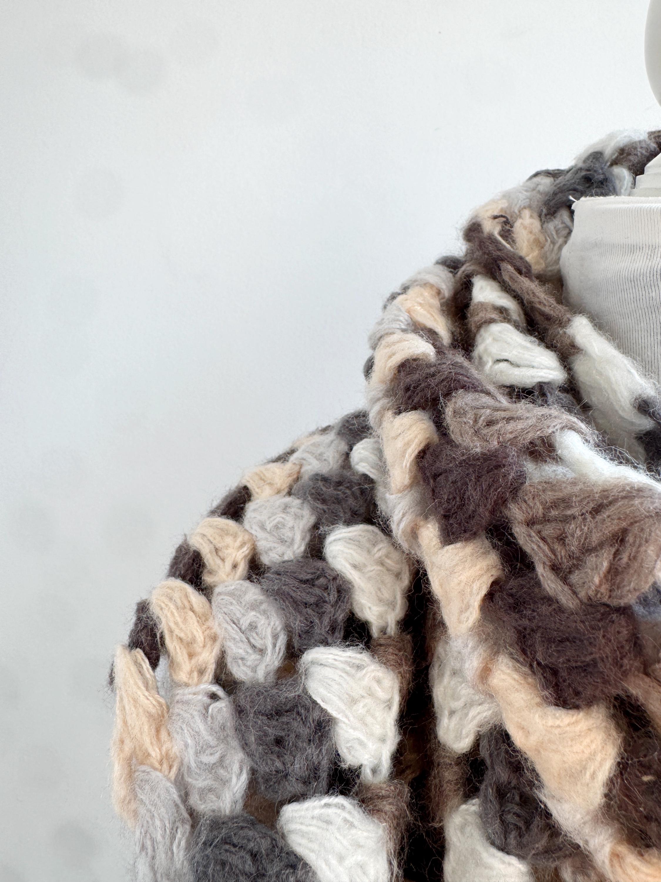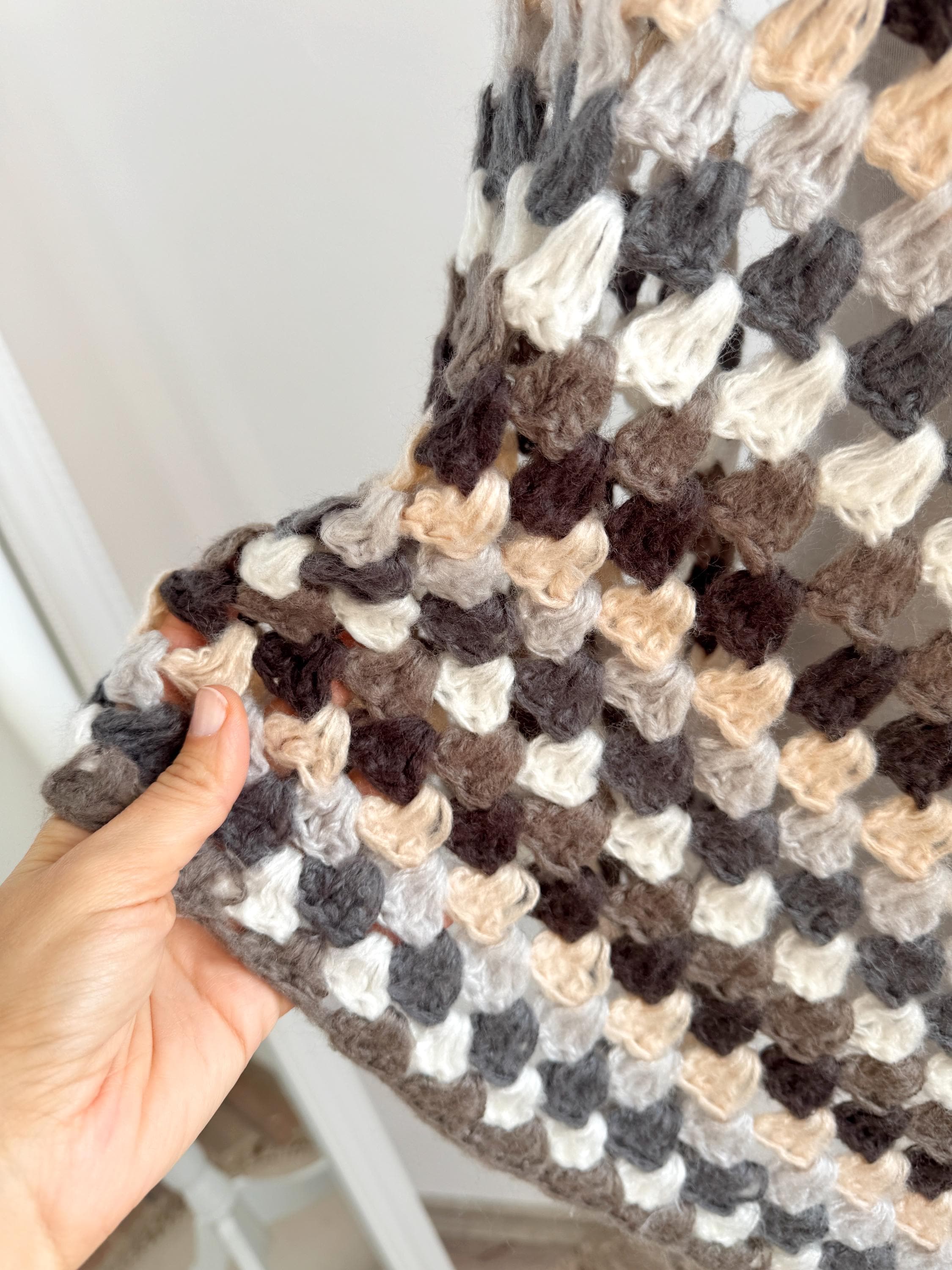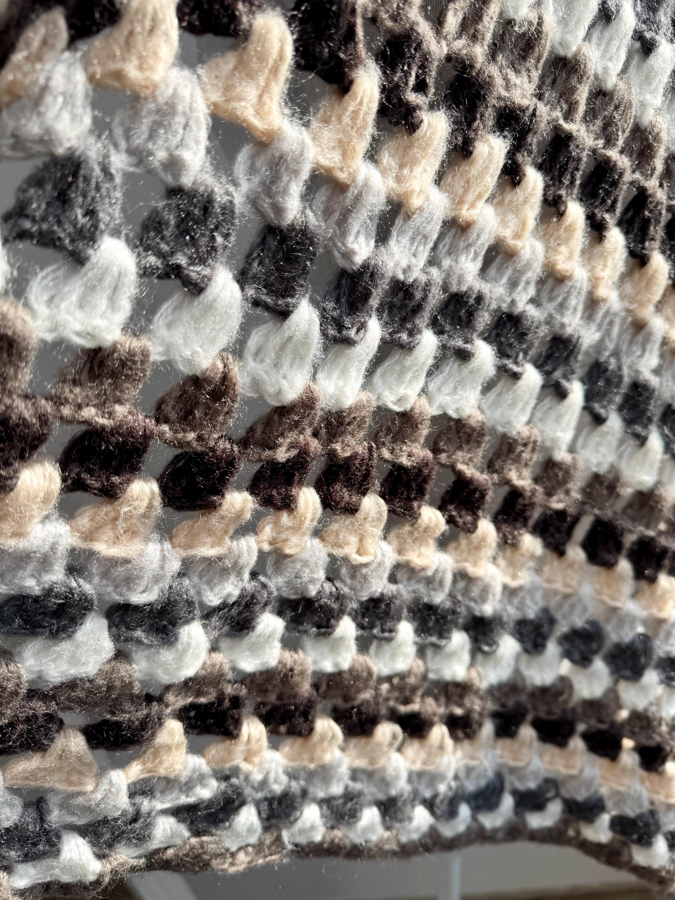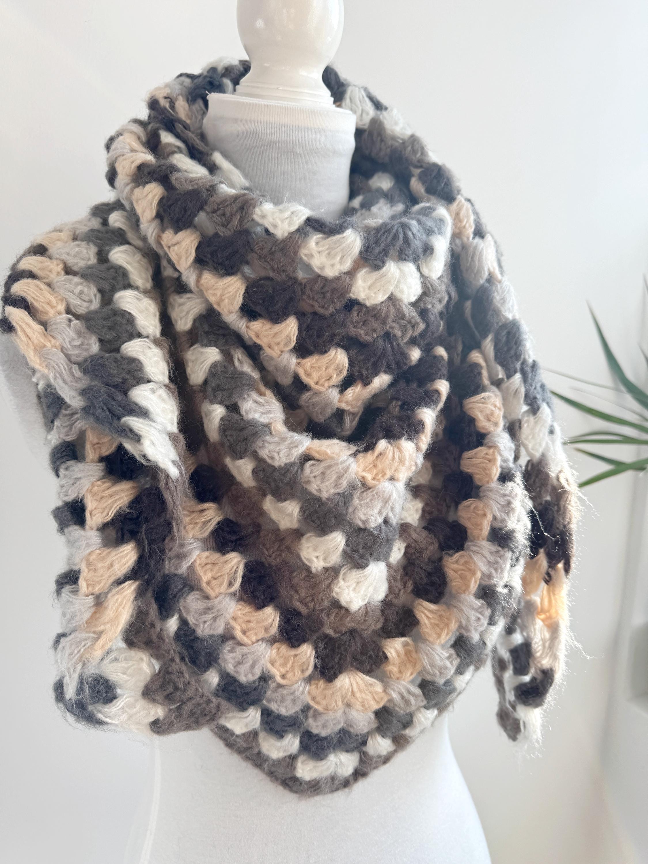 This is a vintage hand-crocheted shawl in eathy nude tones - soft grey, dark and camel brown, beige and cream. Featuring a classic granny-cluster stitch, this soft fluffy acrylic wrap shawl blends rustic charm with a modern, earthy color palette. This boho grannycore shawl incredibly versatile; drape it over your shoulders as a cozy cape for chilly evenings, or wrap it thick around your neck as a chunky statement scarf.