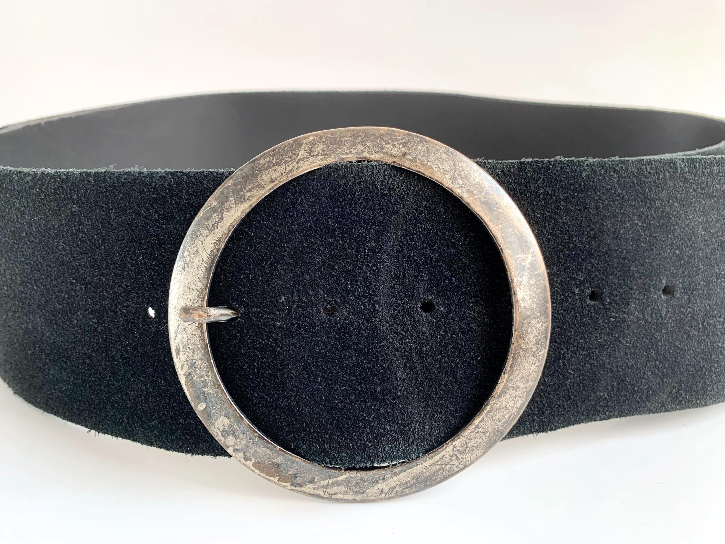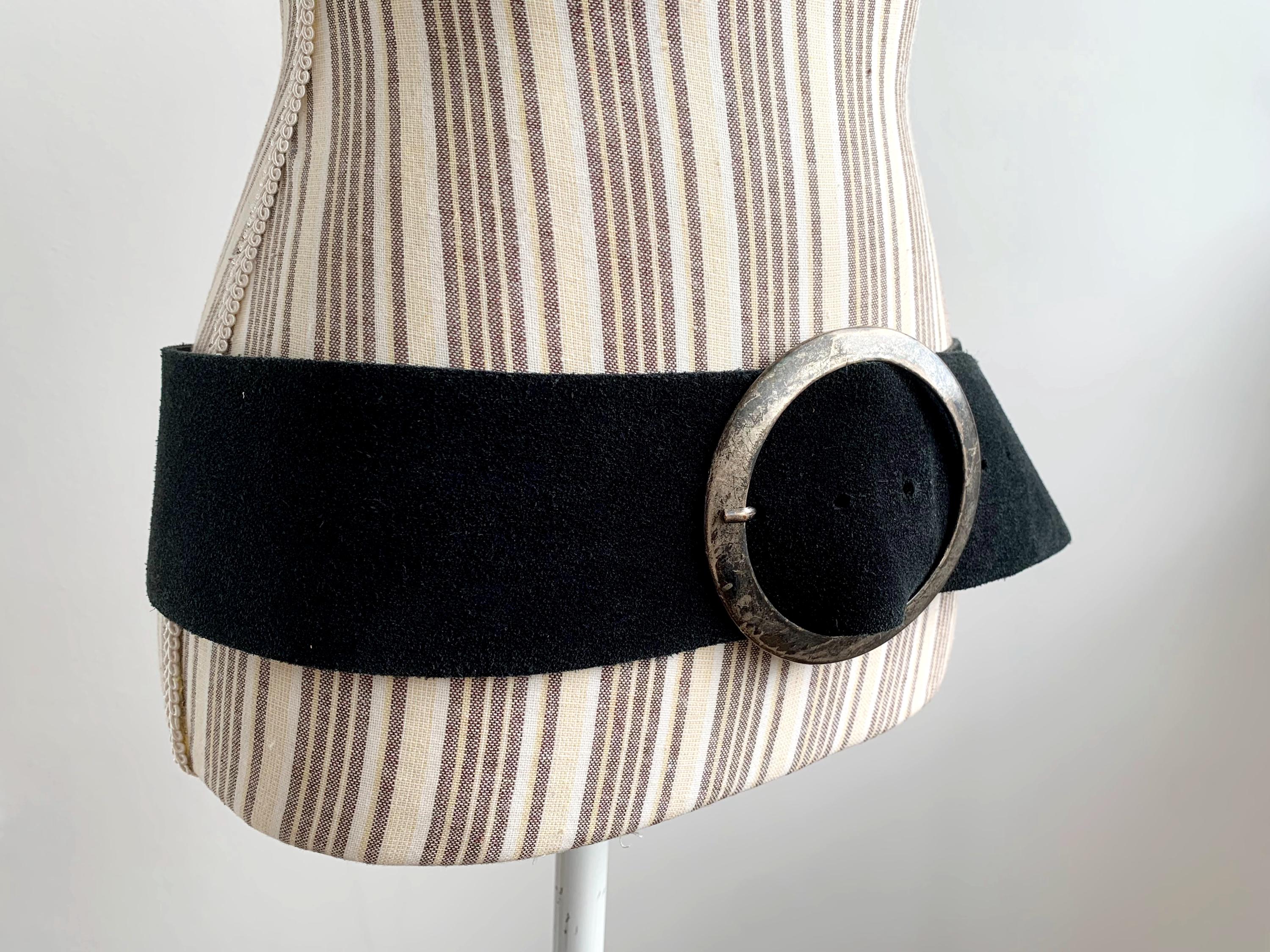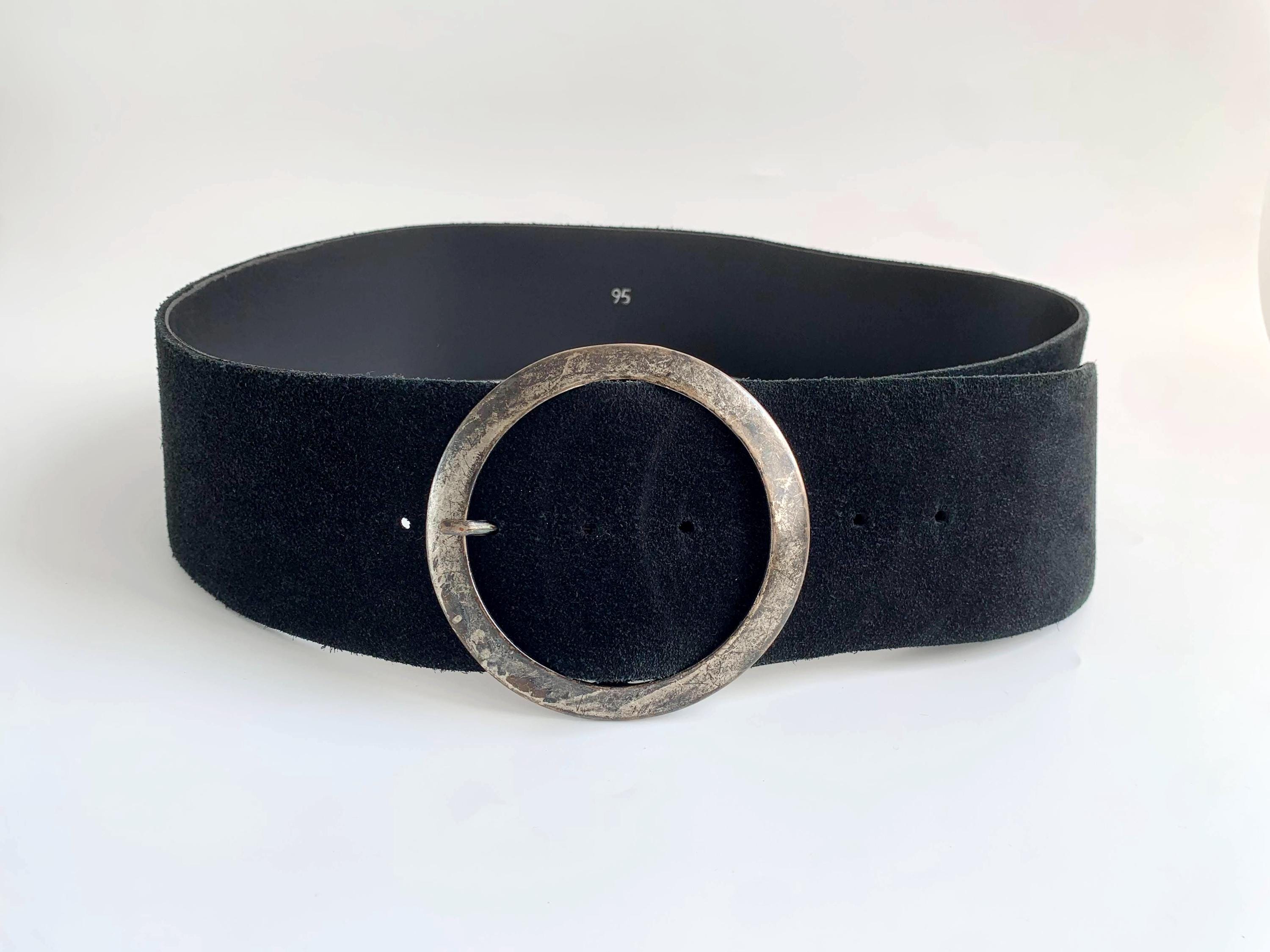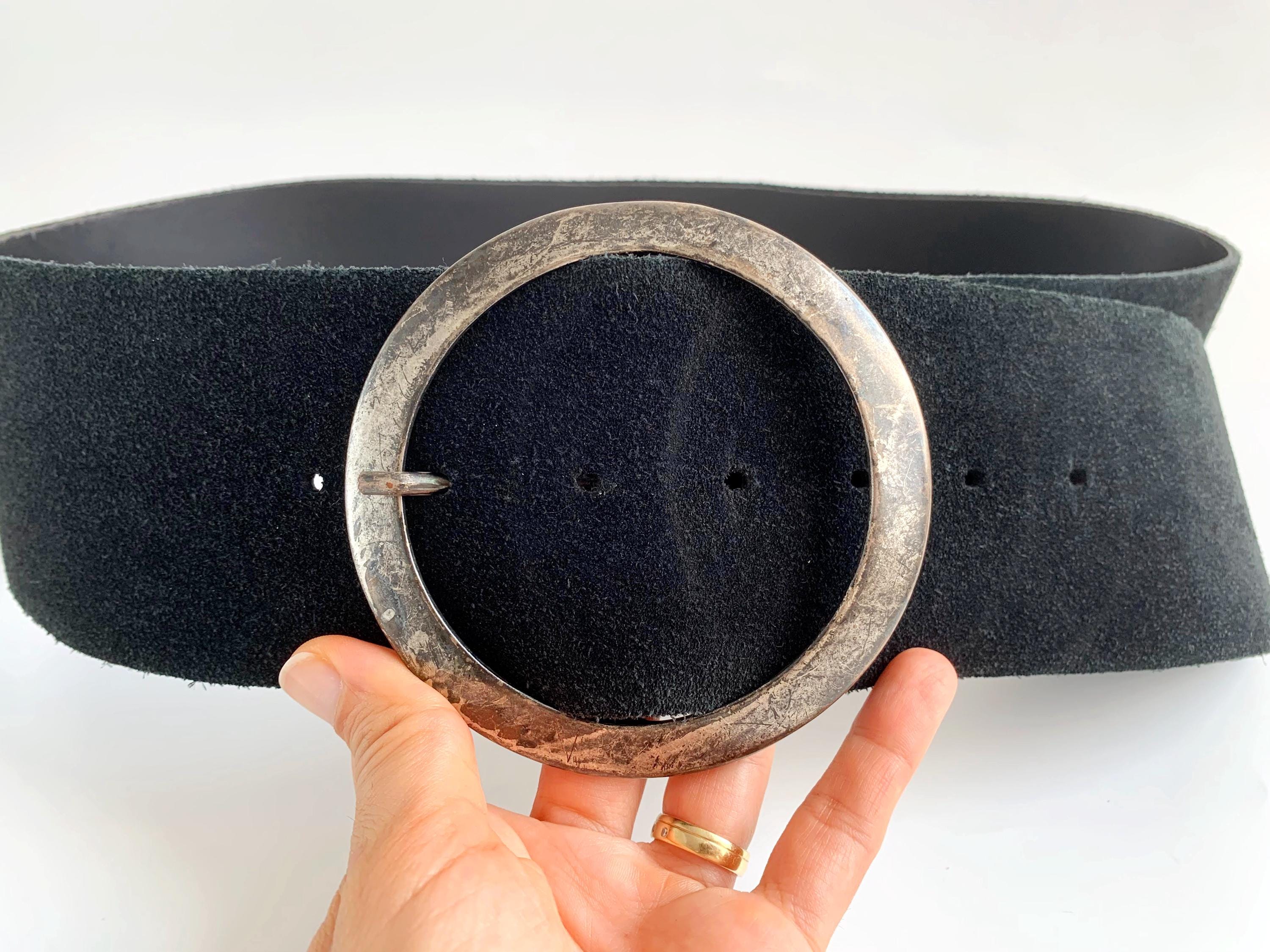 Vintage black suede wide waist belt for women size 95 cm / 37.4". This suede obi belt is a true statement piece from the 1980s/90s era. Crafted from genuine, high-quality suede, this wide waist belt features an oversized circular buckle with a beautiful aged patina that adds a touch of industrial chic to any outfit.