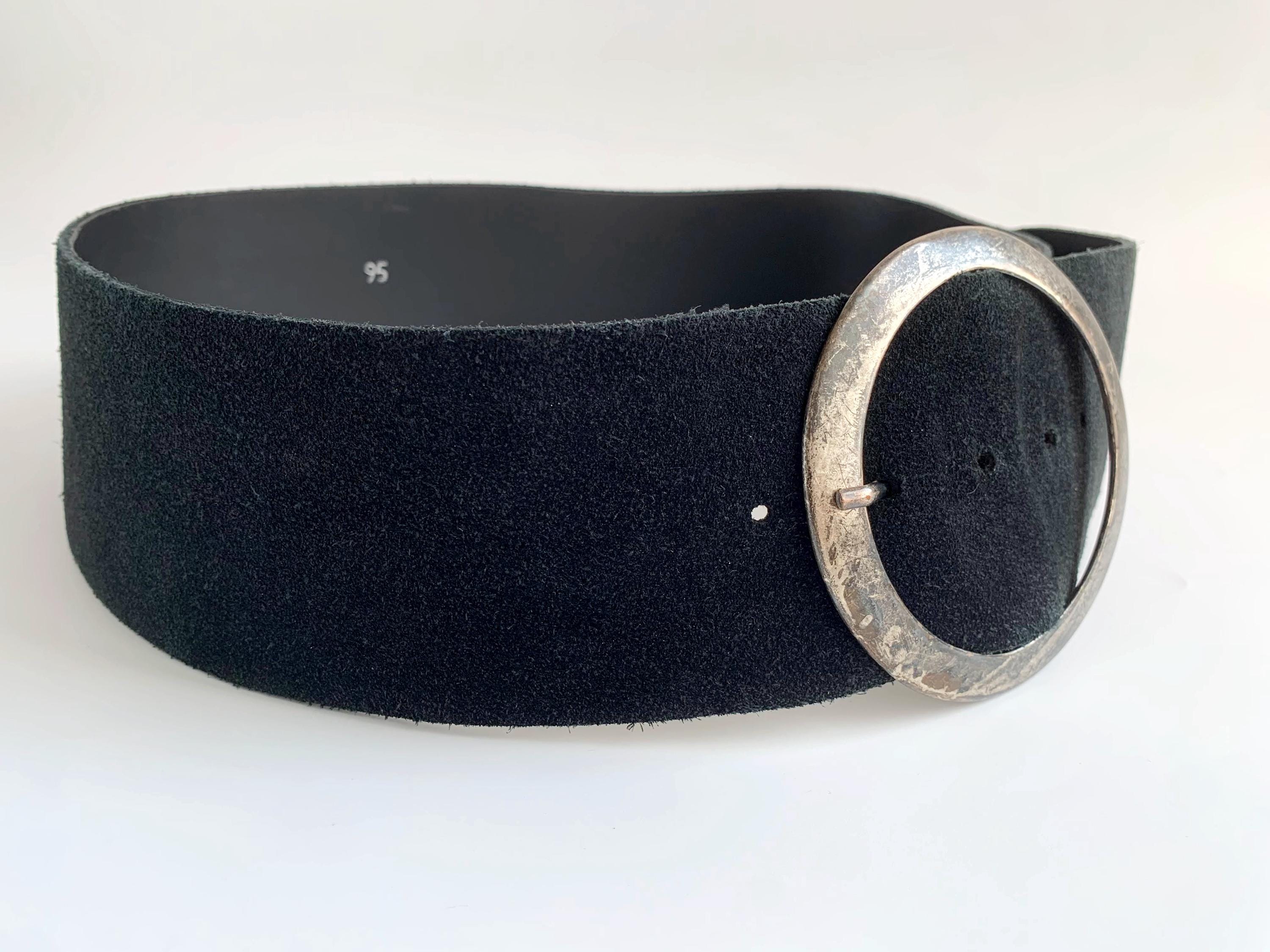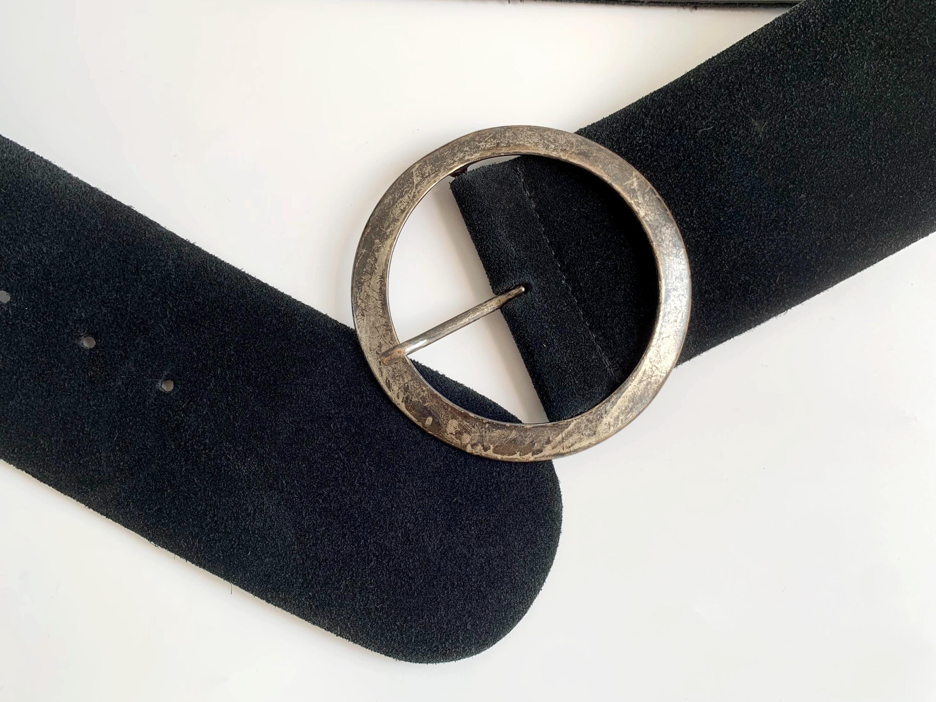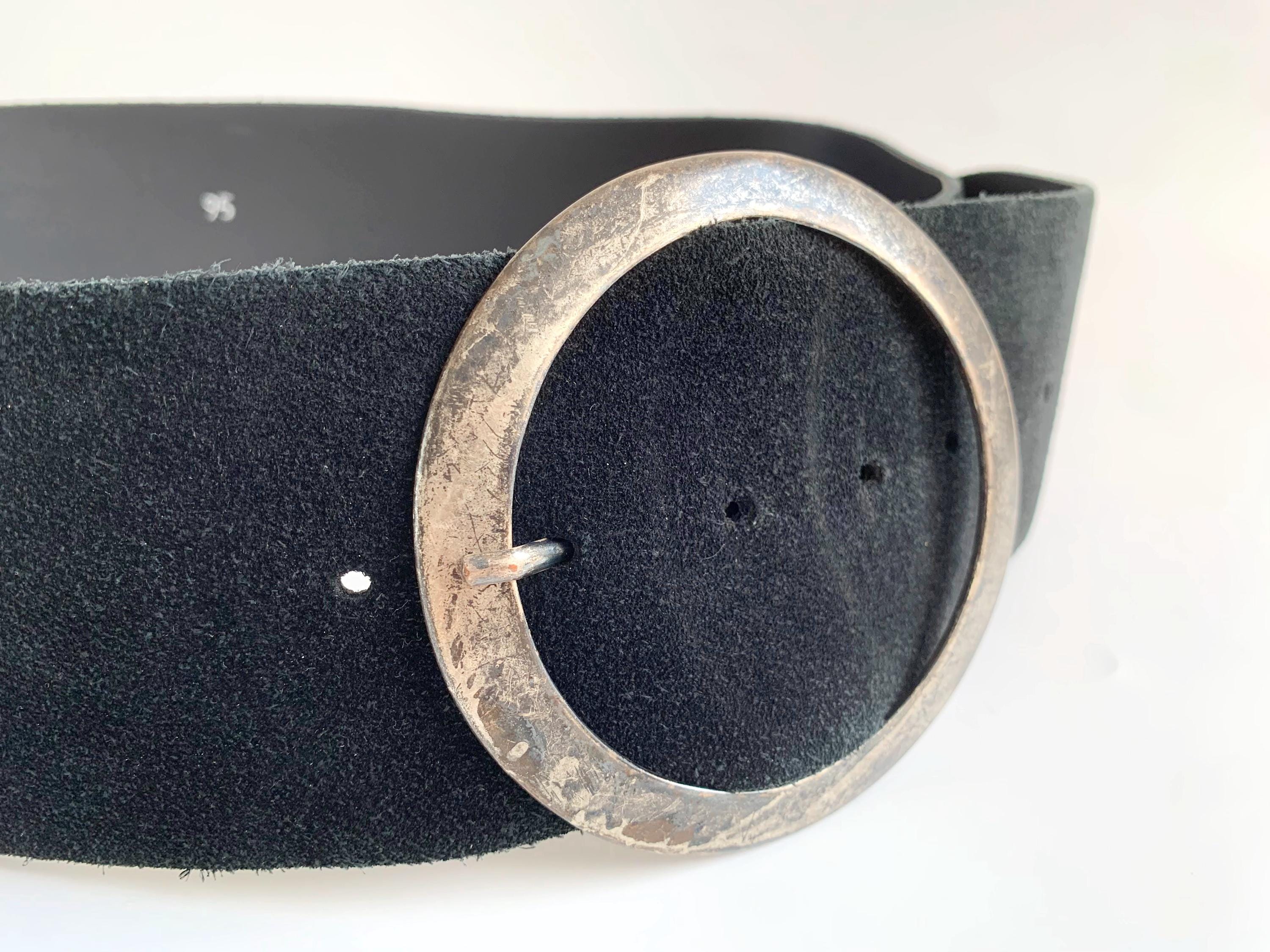 Vintage black suede wide waist belt for women size 95 cm / 37.4". This suede obi belt is a true statement piece from the 1980s/90s era. Crafted from genuine, high-quality suede, this wide waist belt features an oversized circular buckle with a beautiful aged patina that adds a touch of industrial chic to any outfit.