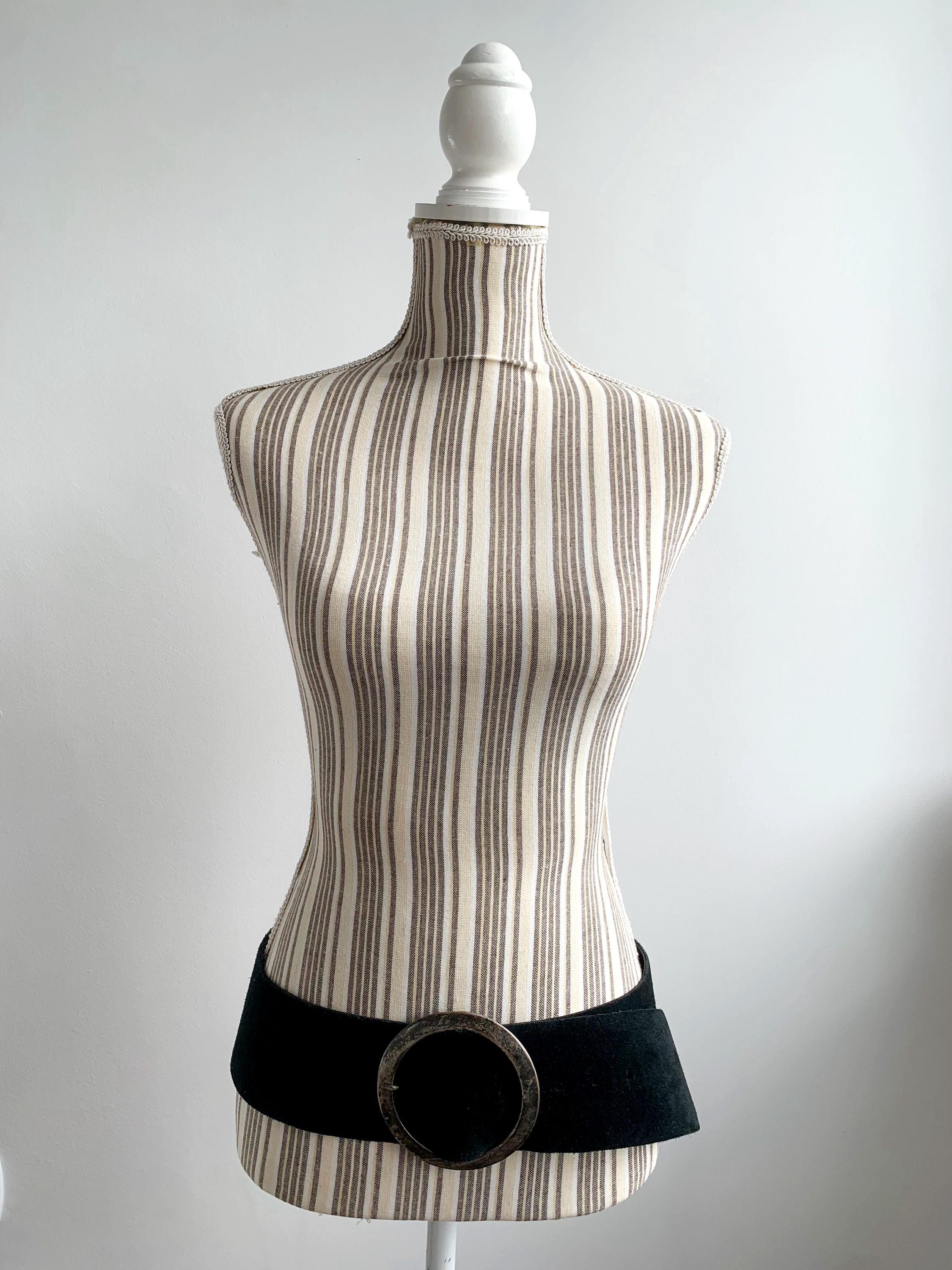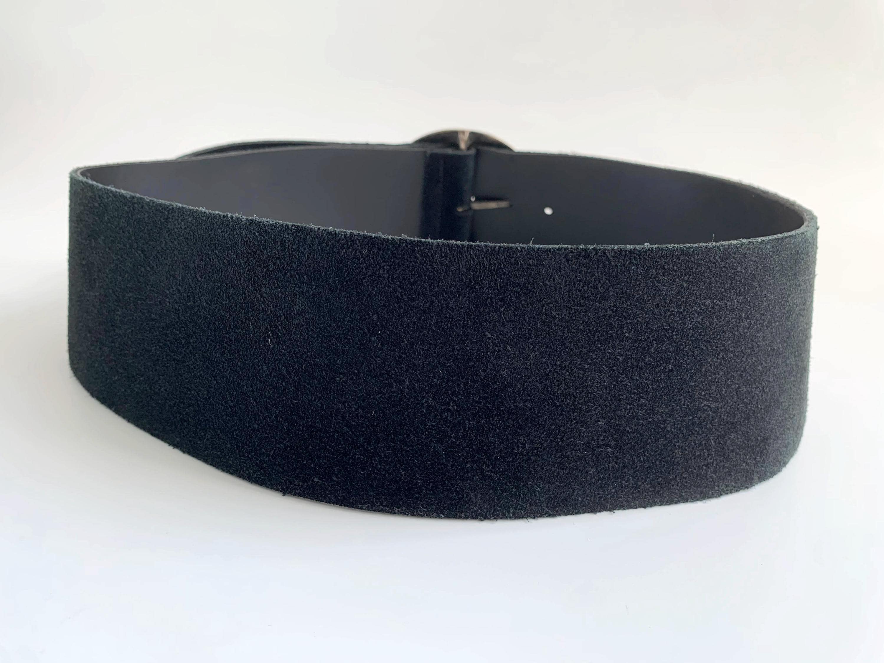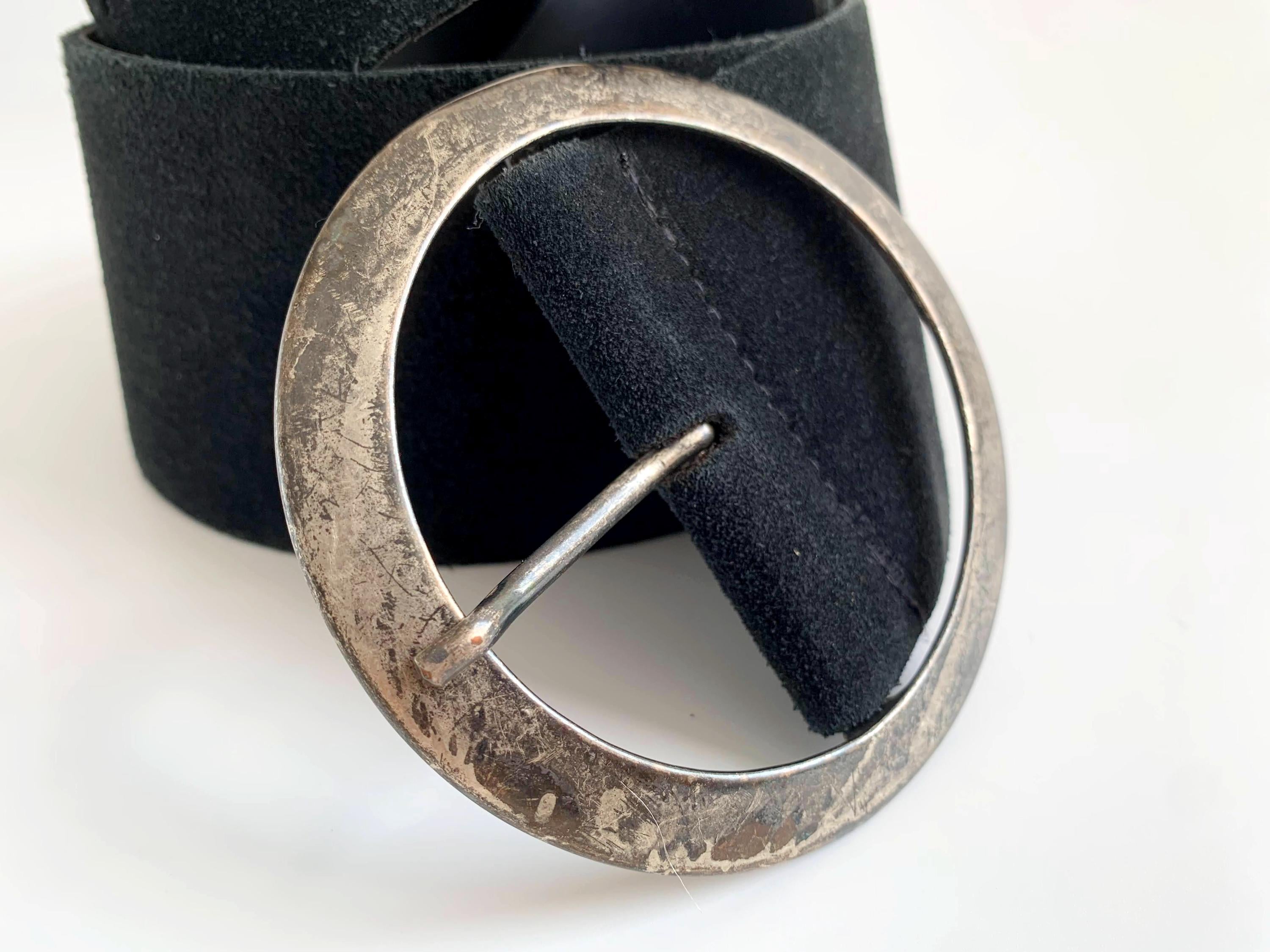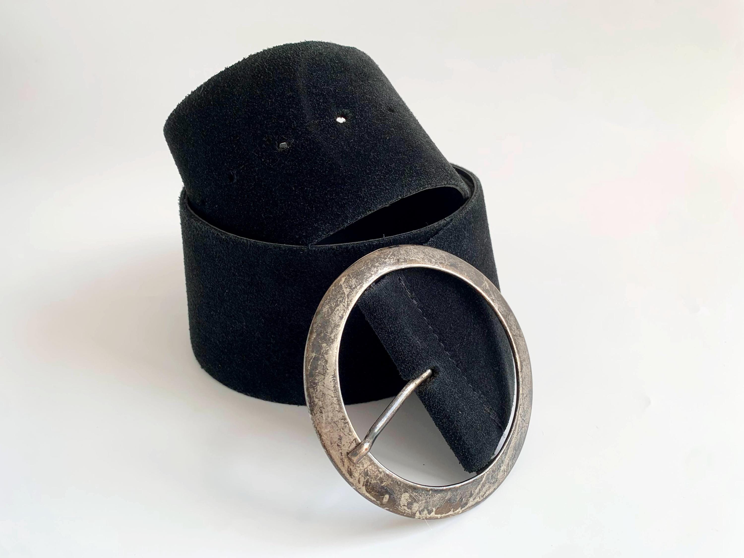 Vintage black suede wide waist belt for women size 95 cm / 37.4". This suede obi belt is a true statement piece from the 1980s/90s era. Crafted from genuine, high-quality suede, this wide waist belt features an oversized circular buckle with a beautiful aged patina that adds a touch of industrial chic to any outfit.