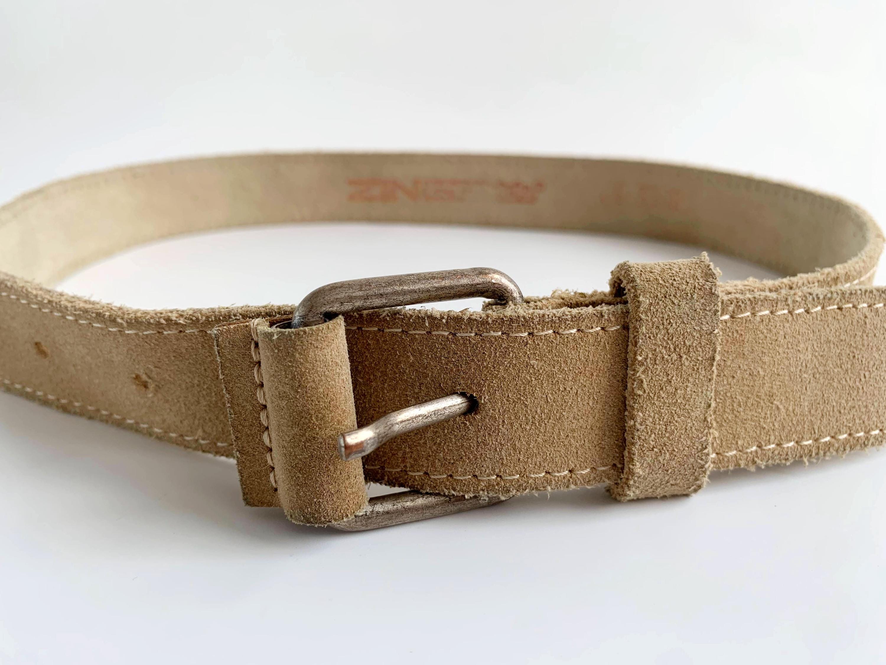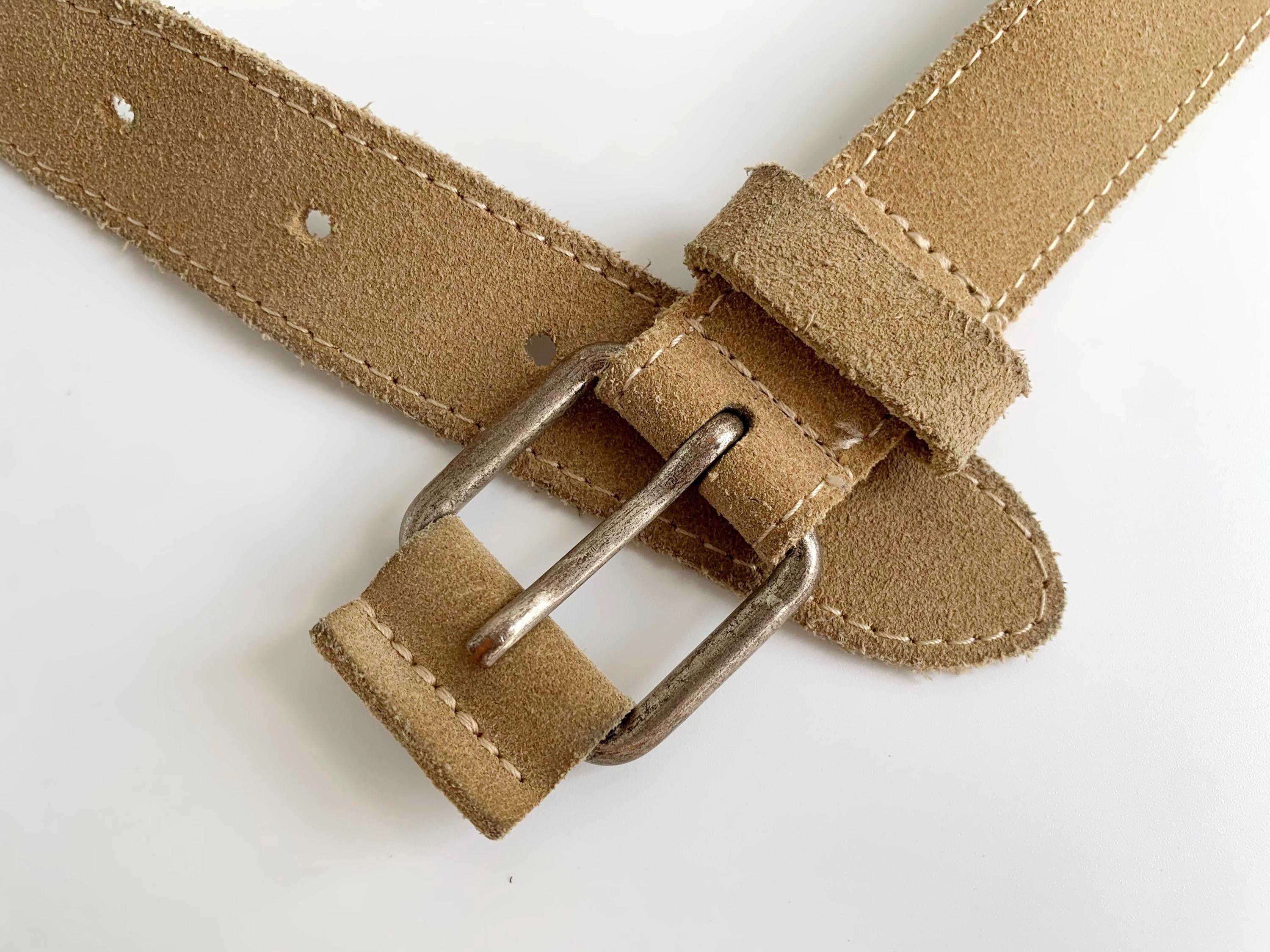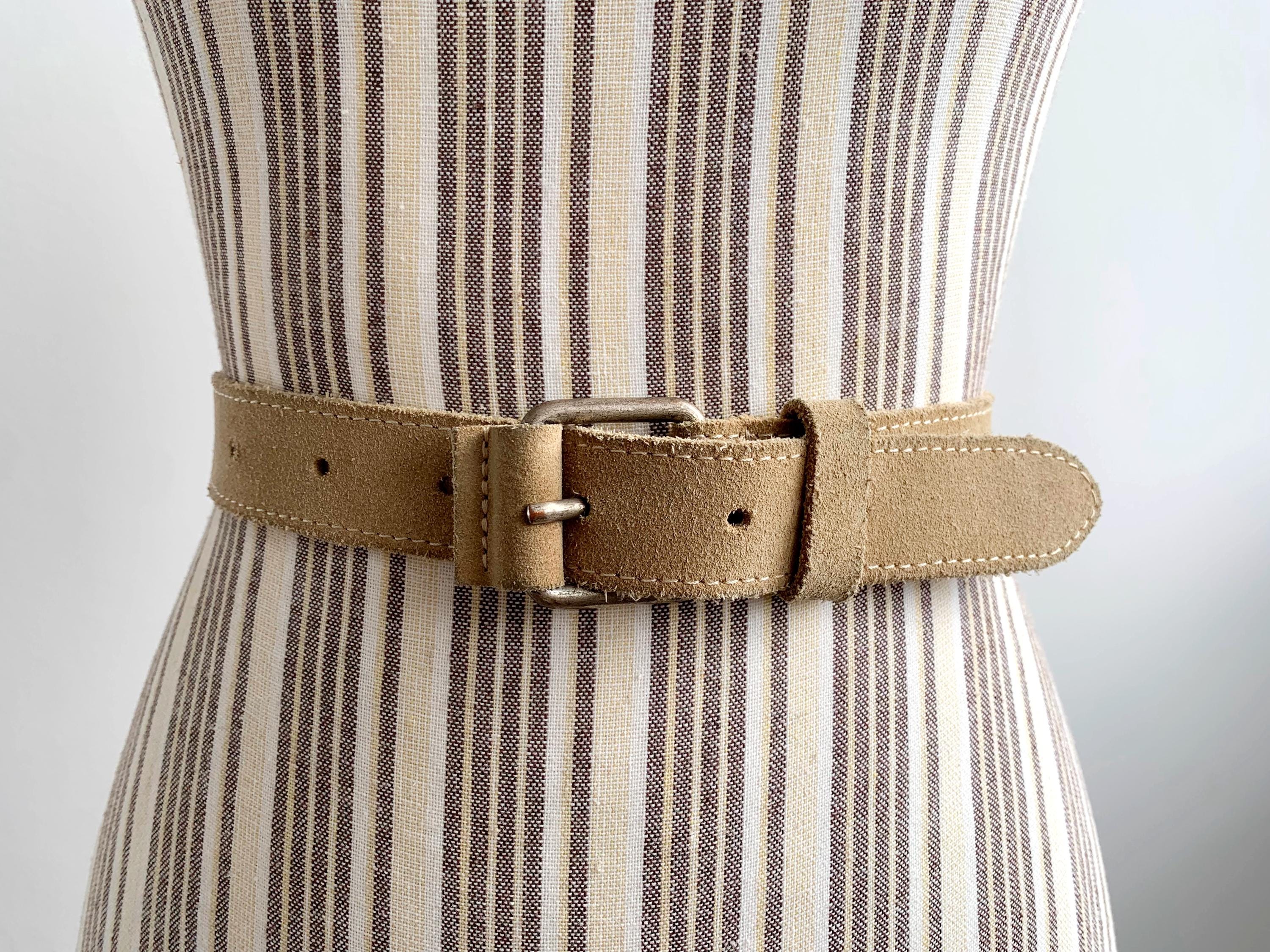 This is a simple beige suede leather belt for women in size 65 cm / 25.5" which fits like size XXS/ XS. This vintage beige suede leather belt has minimalist deisgn with simple silver tone buckle. This essential boho grunge belt features a soft, textured tan suede finish, perfectly capturing the minimalist aesthetic of the 1990s. The antiqued silver-tone buckle adds a touch of rustic charm, making it a versatile piece for cinching oversized blazers, high-waisted denim, or flowy bohemian dresses.