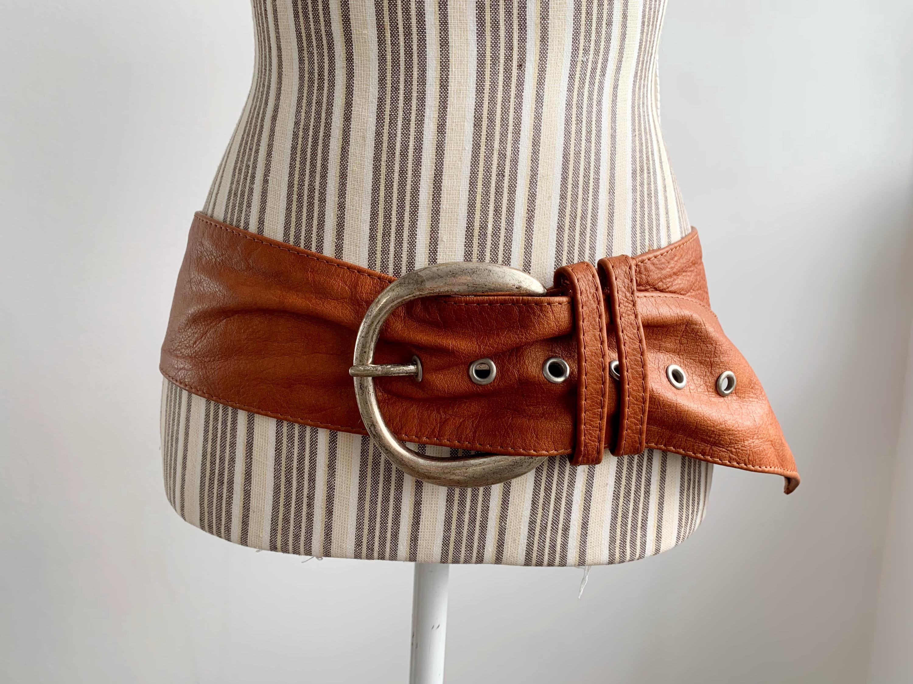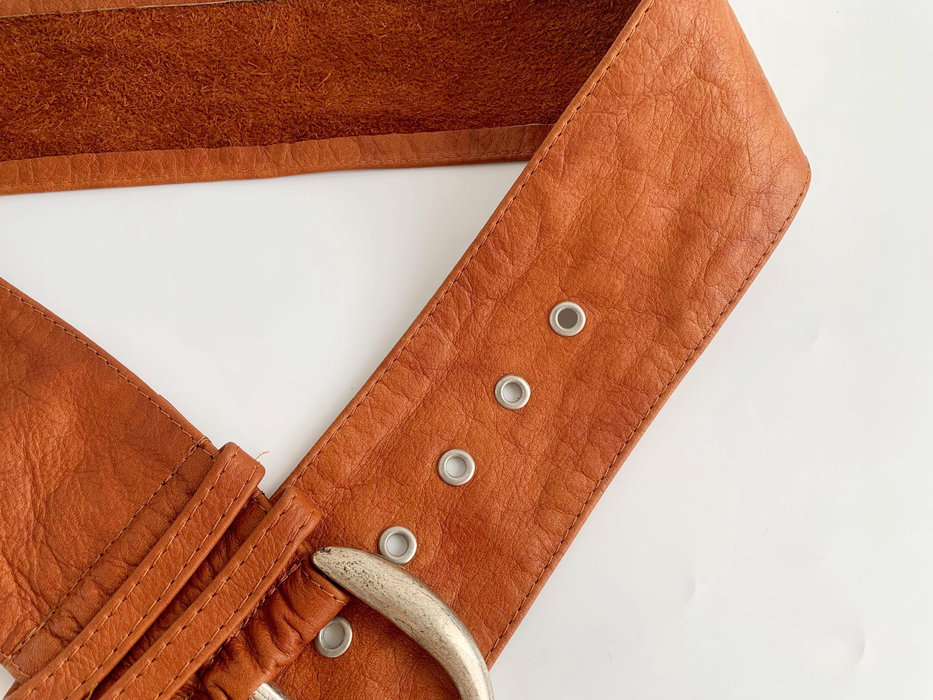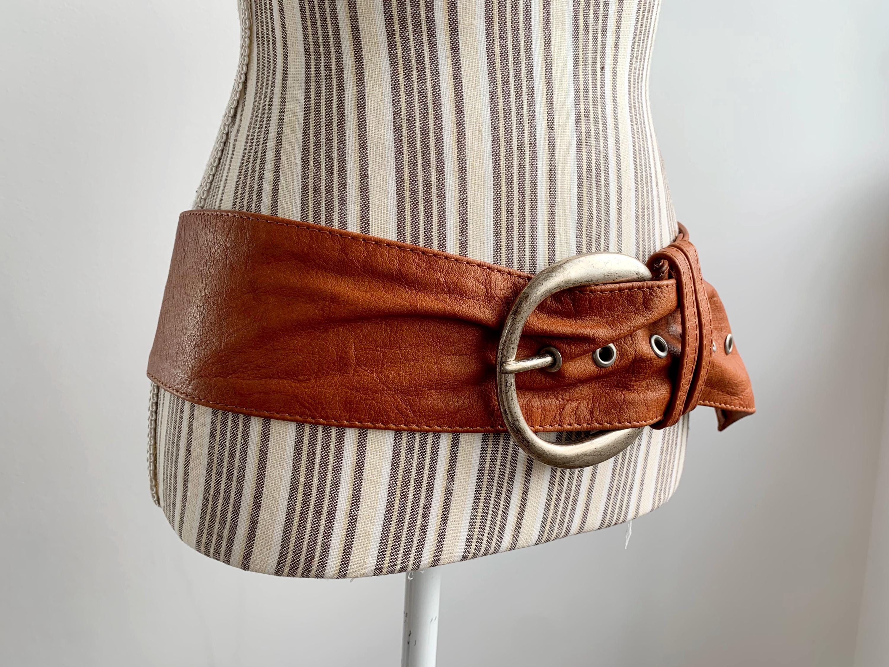 This is a super soft extra wide d ring buckle obi belt for women in size 95 cm / 37". This cognac brown leather belt was made in Italy from high-quality genuine leather and silver tone D ring buckle. Whether you're layering it over a flowy maxi dress, a chunky knit sweater, or a classic trench coat, this belt provides timeless style. The wide profile and adjustable fit make it as comfortable as it is stylish, perfect for those who appreciate high-quality vintage accessories that stand out.