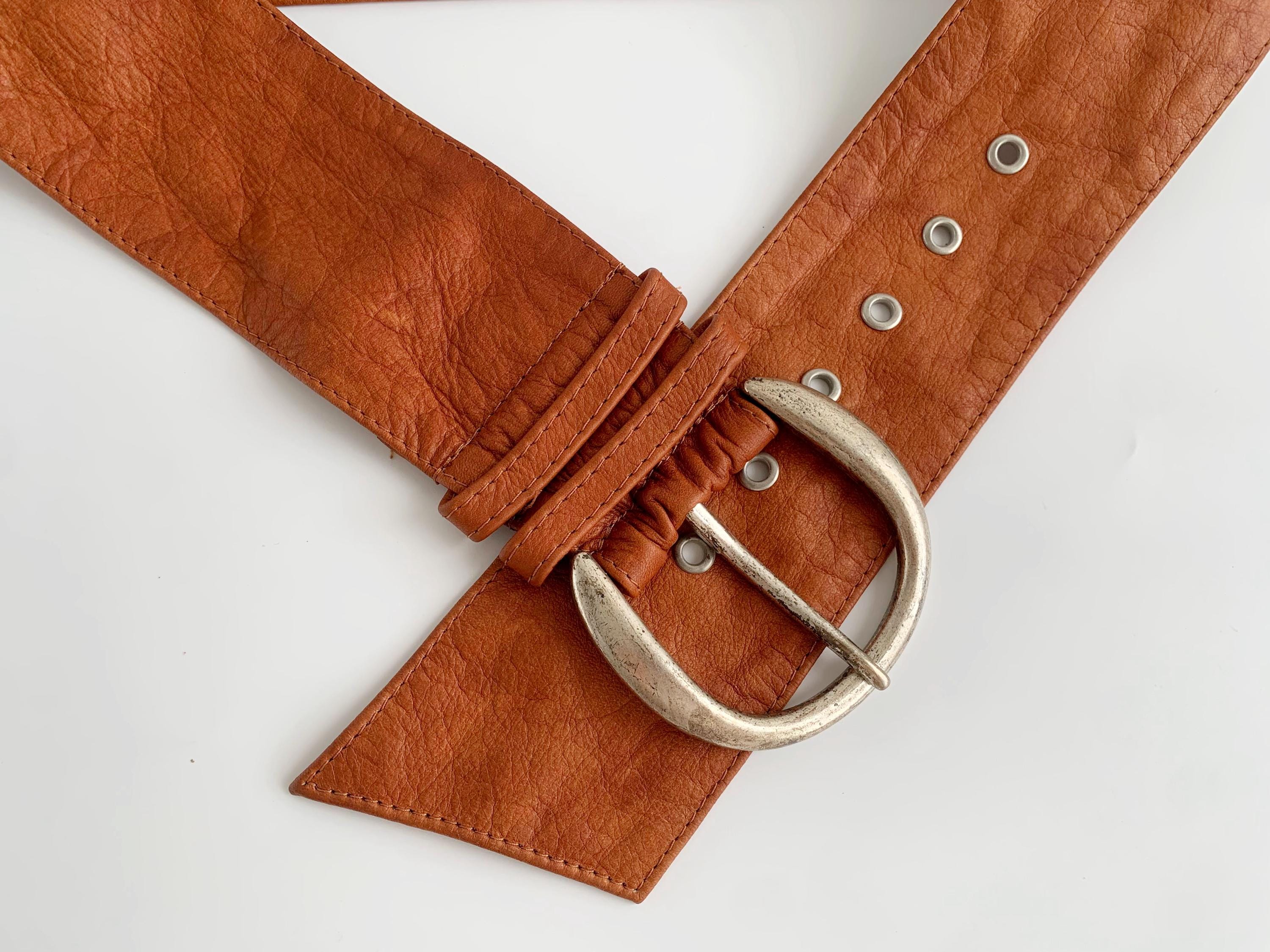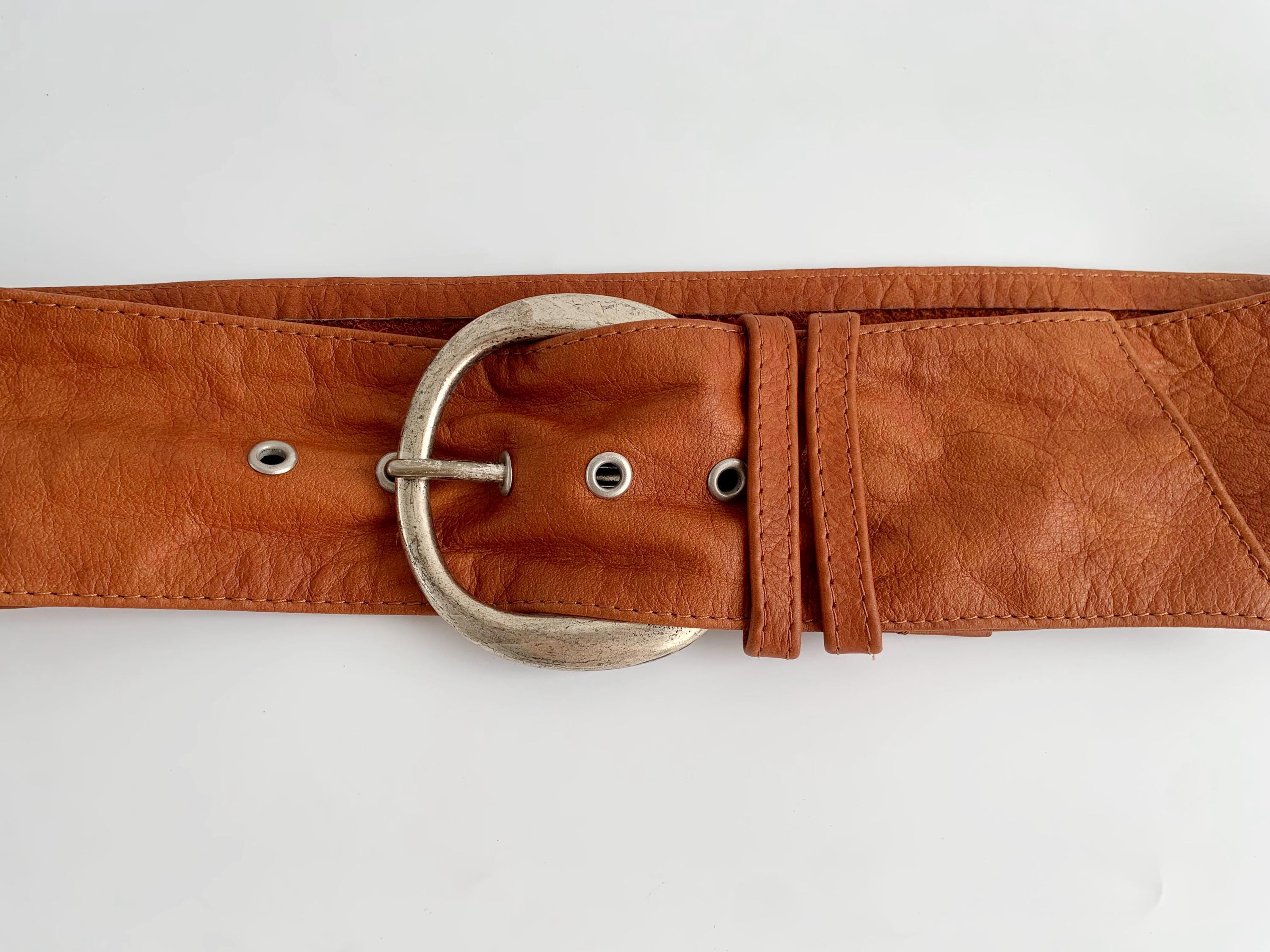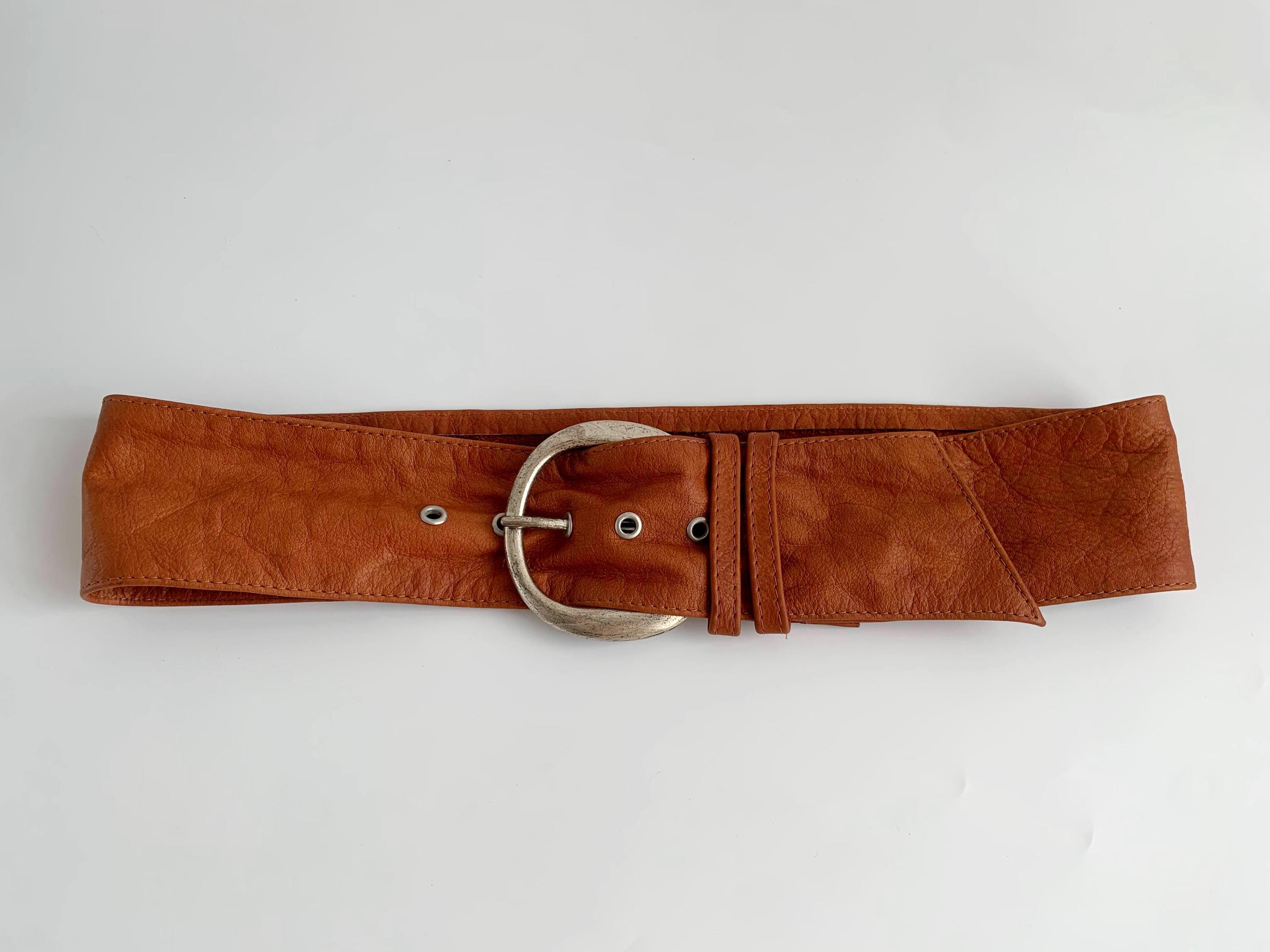 This is a super soft extra wide d ring buckle obi belt for women in size 95 cm / 37". This cognac brown leather belt was made in Italy from high-quality genuine leather and silver tone D ring buckle. Whether you're layering it over a flowy maxi dress, a chunky knit sweater, or a classic trench coat, this belt provides timeless style. The wide profile and adjustable fit make it as comfortable as it is stylish, perfect for those who appreciate high-quality vintage accessories that stand out.