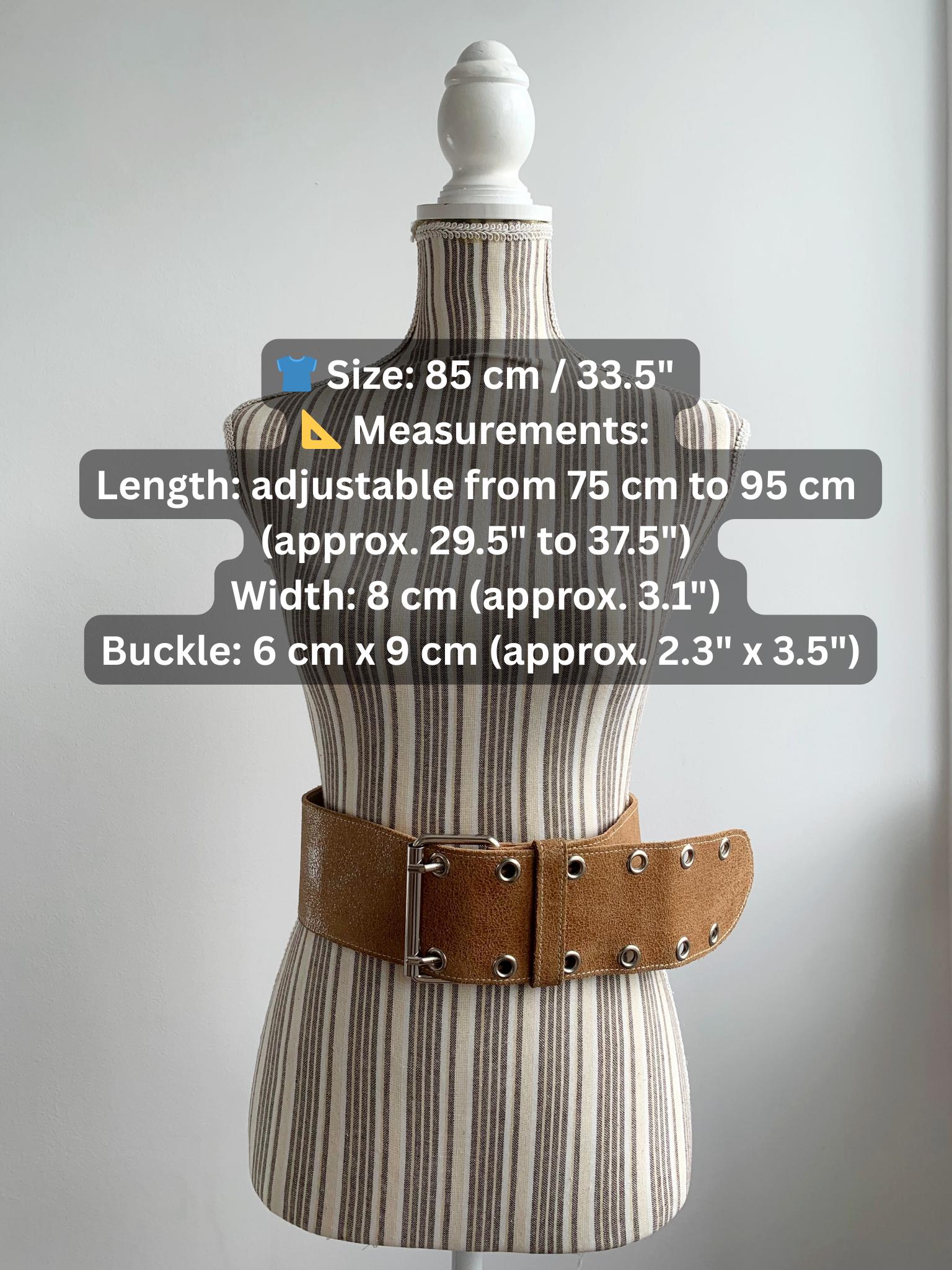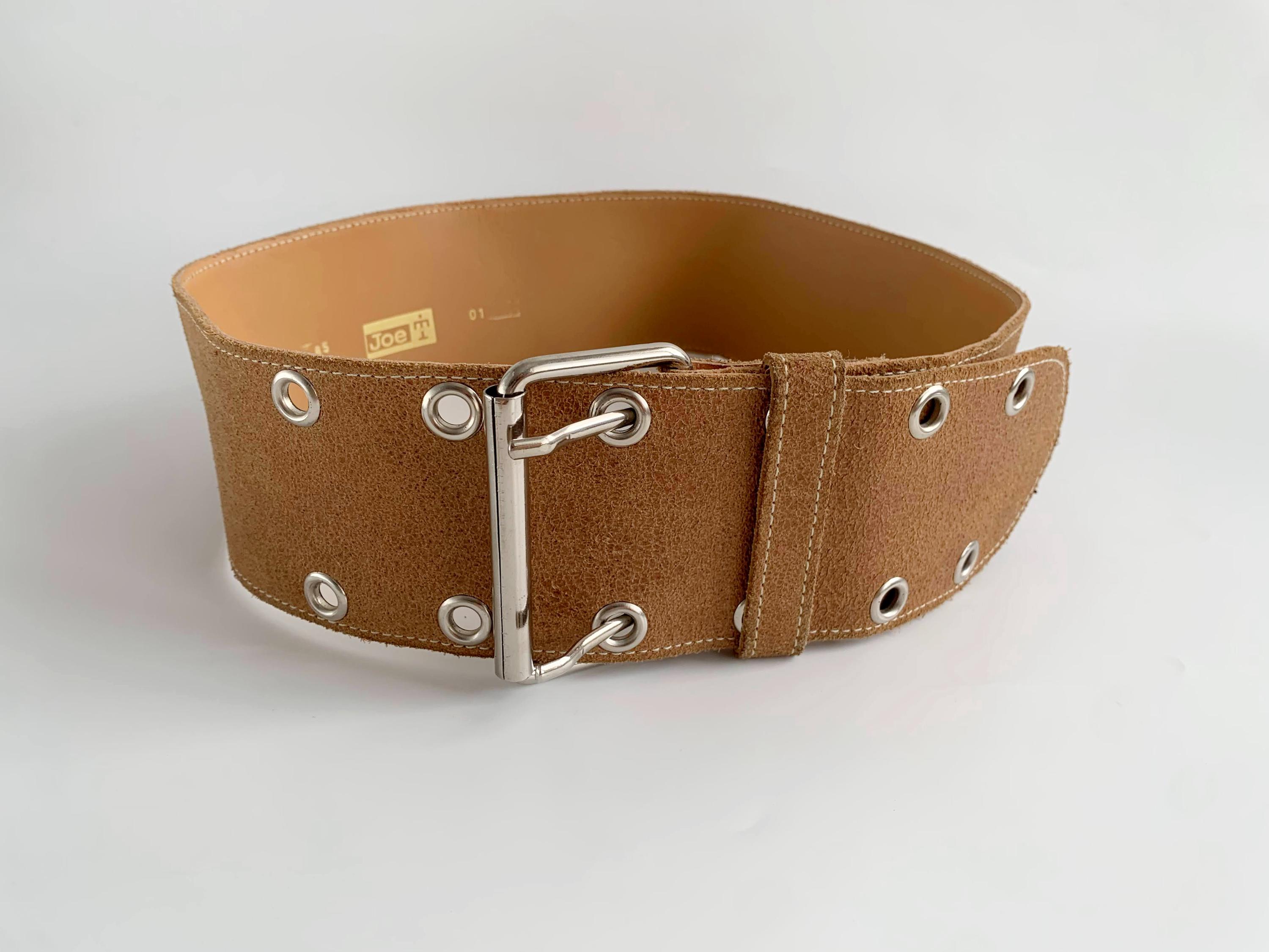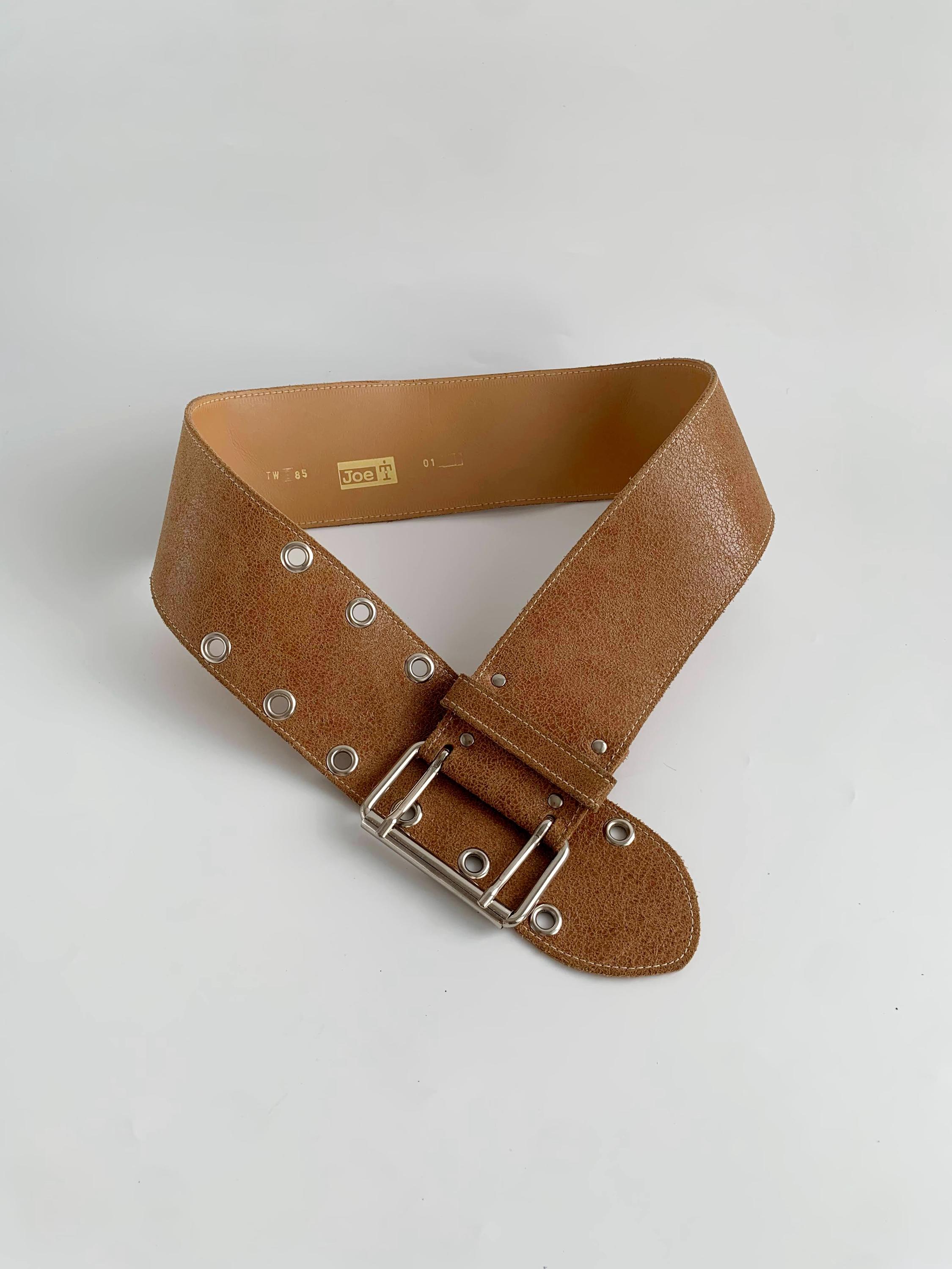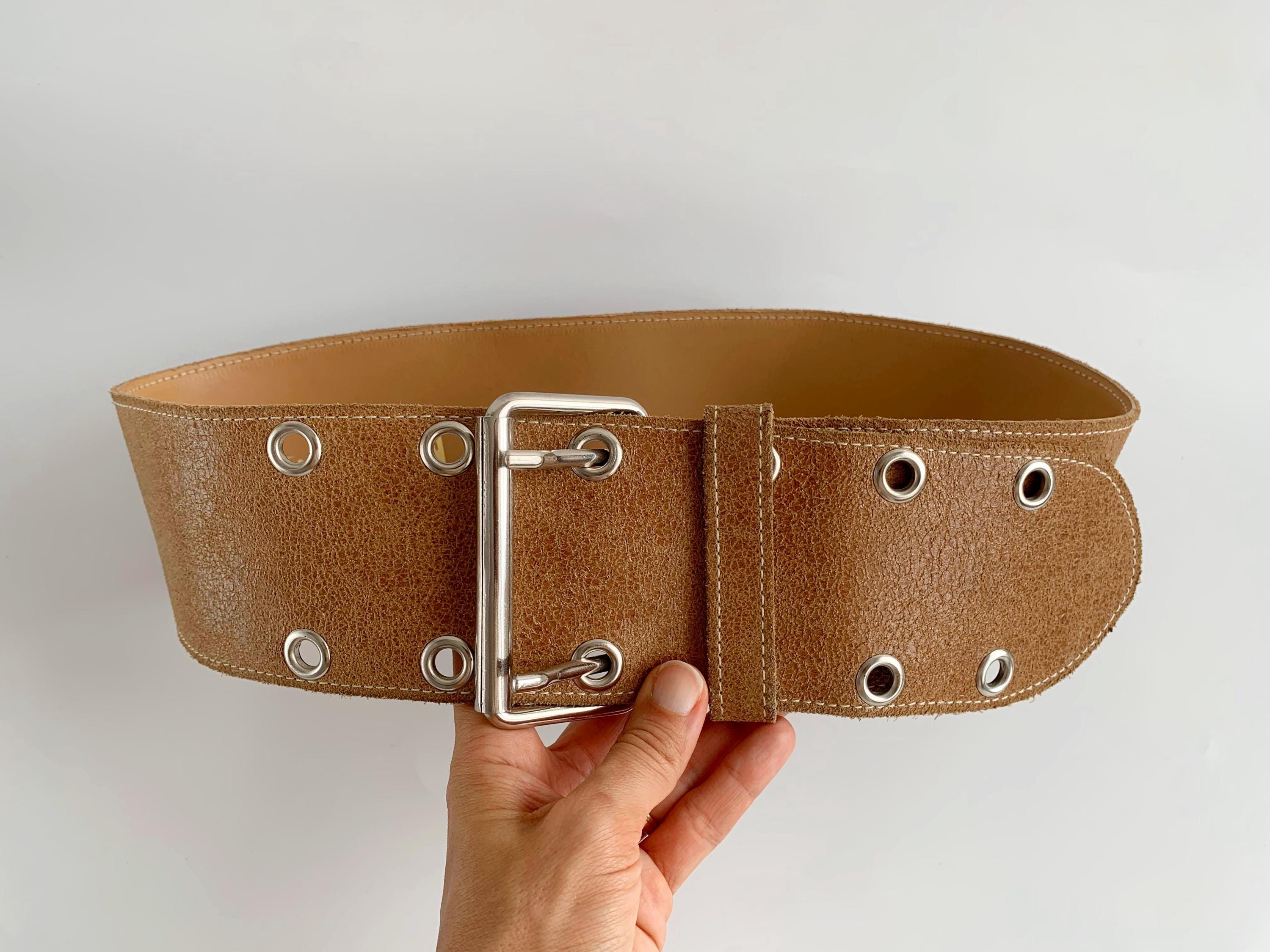 This is a vintage 90s wide waist belt made of genuine leather with cracked effect with suede leather feel in size 85 cm / 33.5" . This camel brown leather belt is crafted from high-quality textured tan suede feel leather and features a bold double-prong silver-tone buckle and industrial-style grommet detailing. The extra-wide silhouette is designed to cinch the waist, making it an ideal accessory for overcoats, flowy bohemian dresses, or oversized knits. Whether you are aiming for a 90s minimalist look or a rugged western-boho vibe, this durable "Joe T" branded wide leather waist belt offers both timeless style and exceptional craftsmanship.