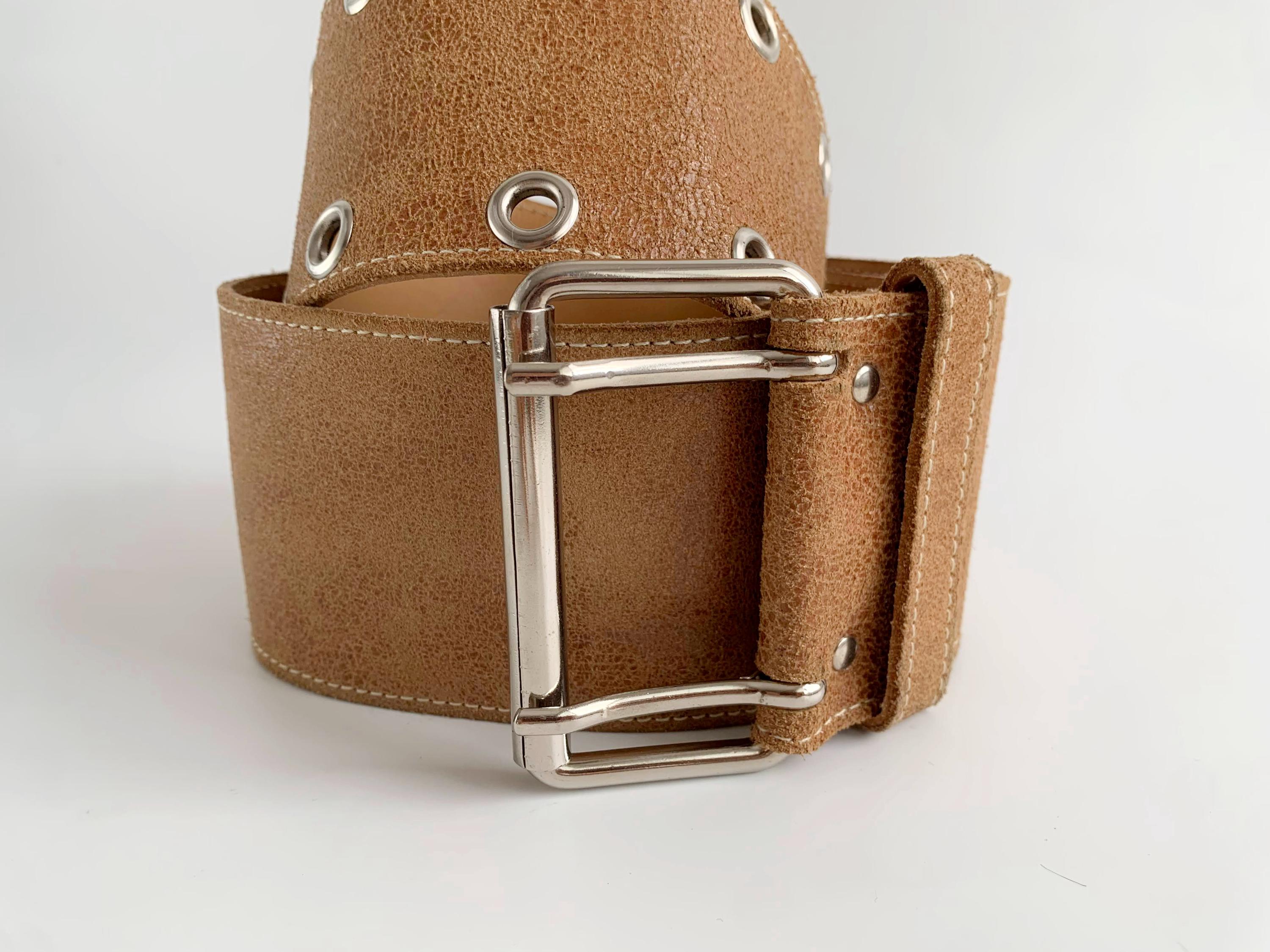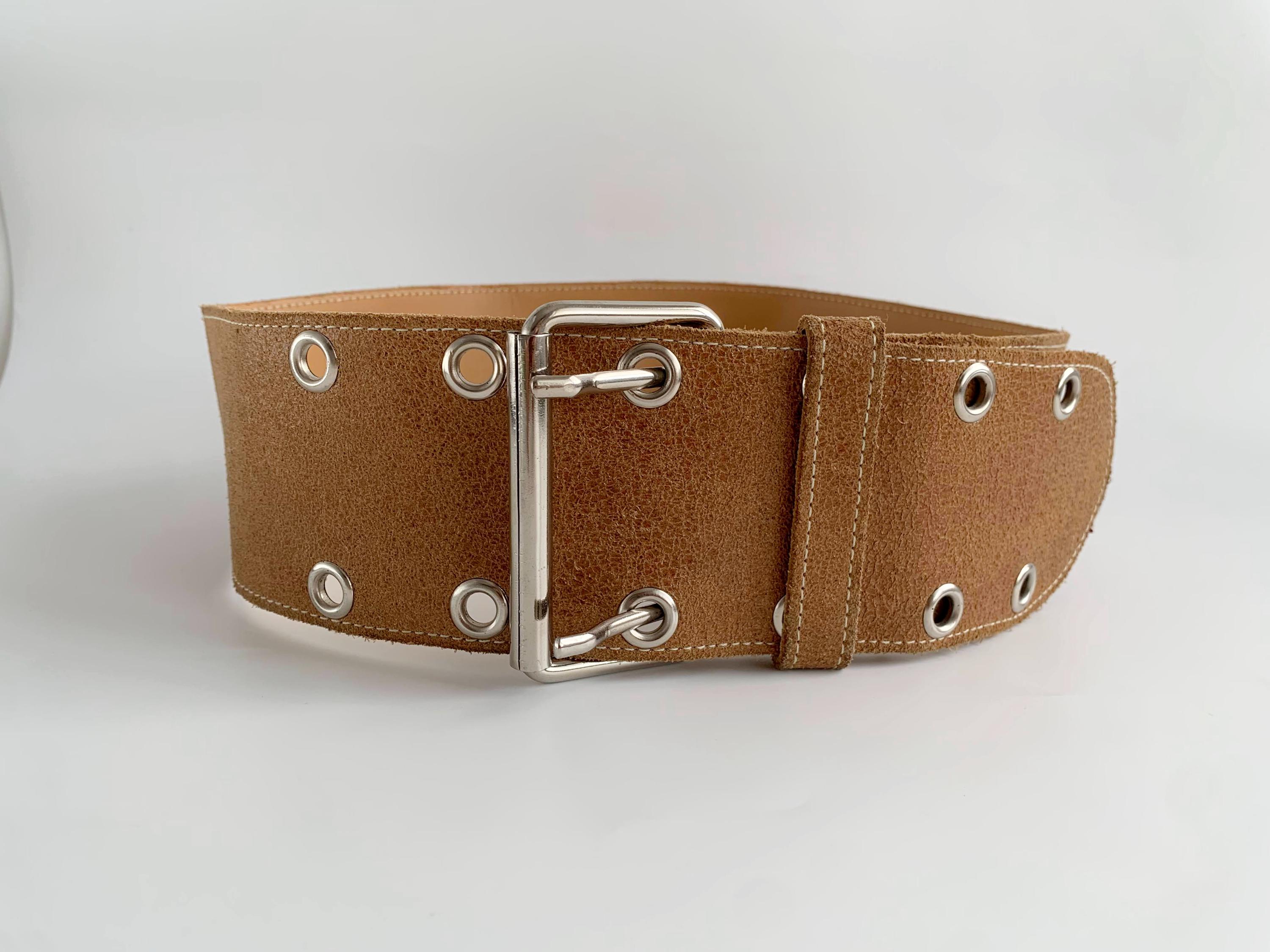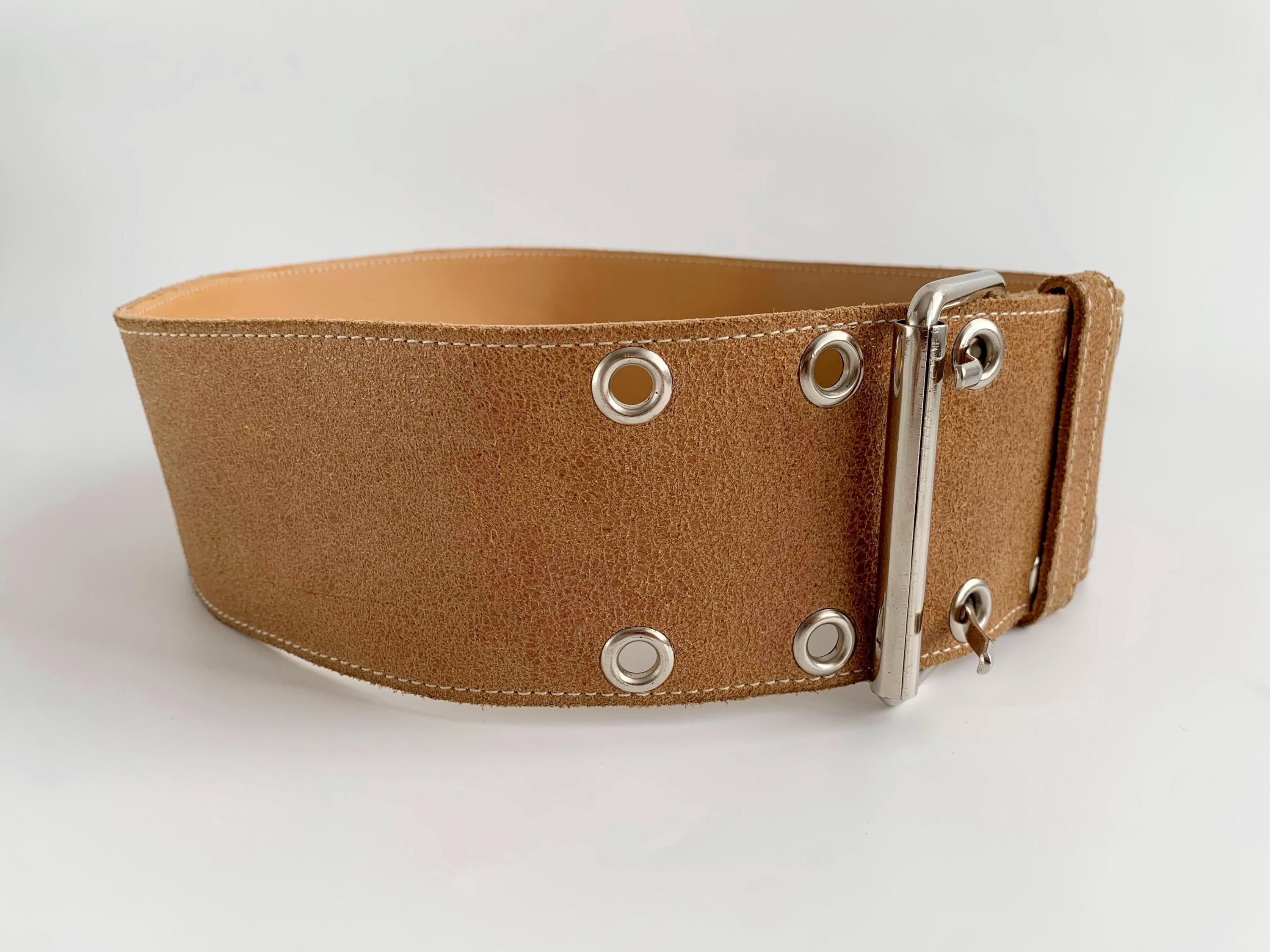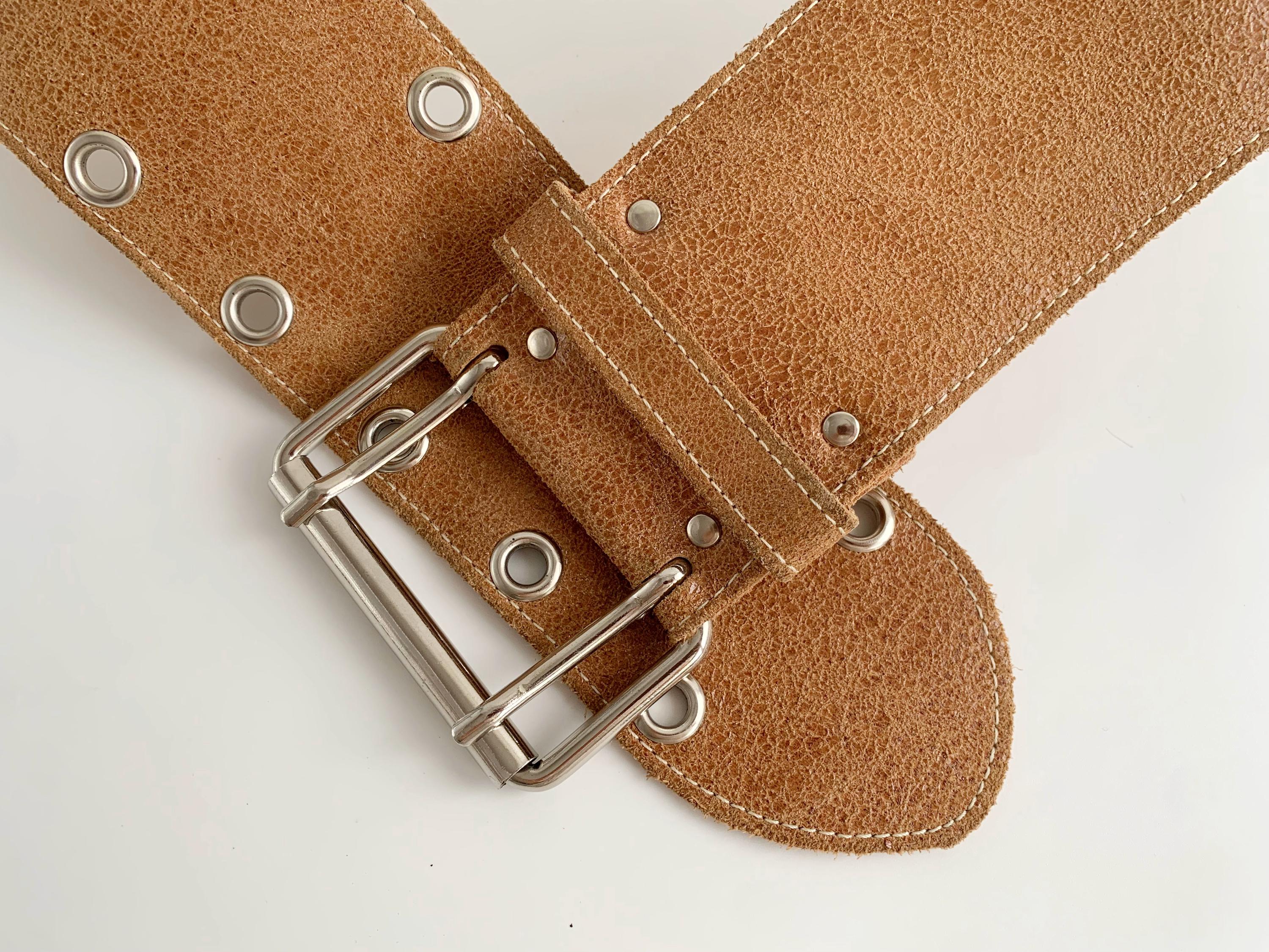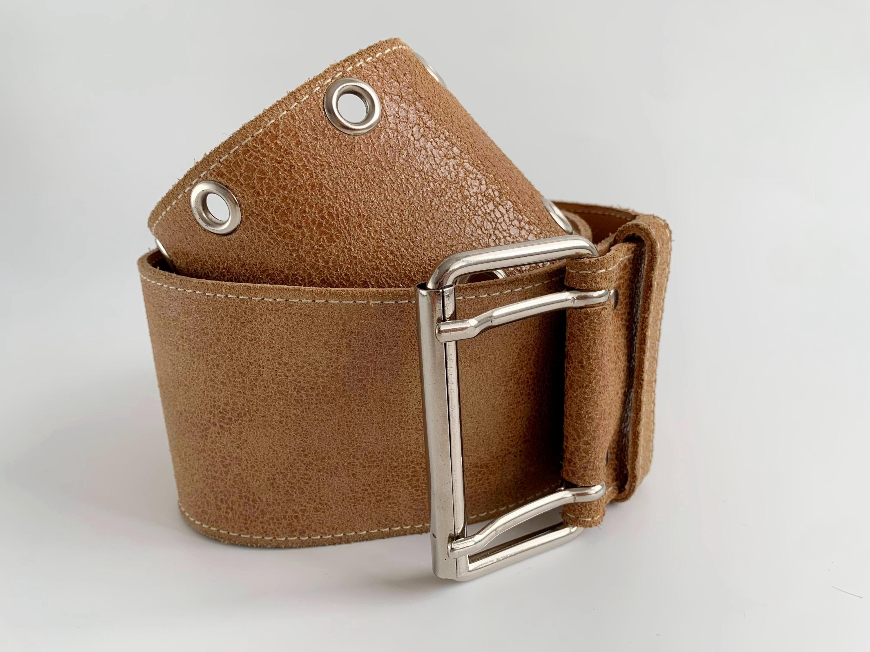 This is a vintage 90s wide waist belt made of genuine leather with cracked effect with suede leather feel in size 85 cm / 33.5" . This camel brown leather belt is crafted from high-quality textured tan suede feel leather and features a bold double-prong silver-tone buckle and industrial-style grommet detailing. The extra-wide silhouette is designed to cinch the waist, making it an ideal accessory for overcoats, flowy bohemian dresses, or oversized knits. Whether you are aiming for a 90s minimalist look or a rugged western-boho vibe, this durable "Joe T" branded wide leather waist belt offers both timeless style and exceptional craftsmanship.