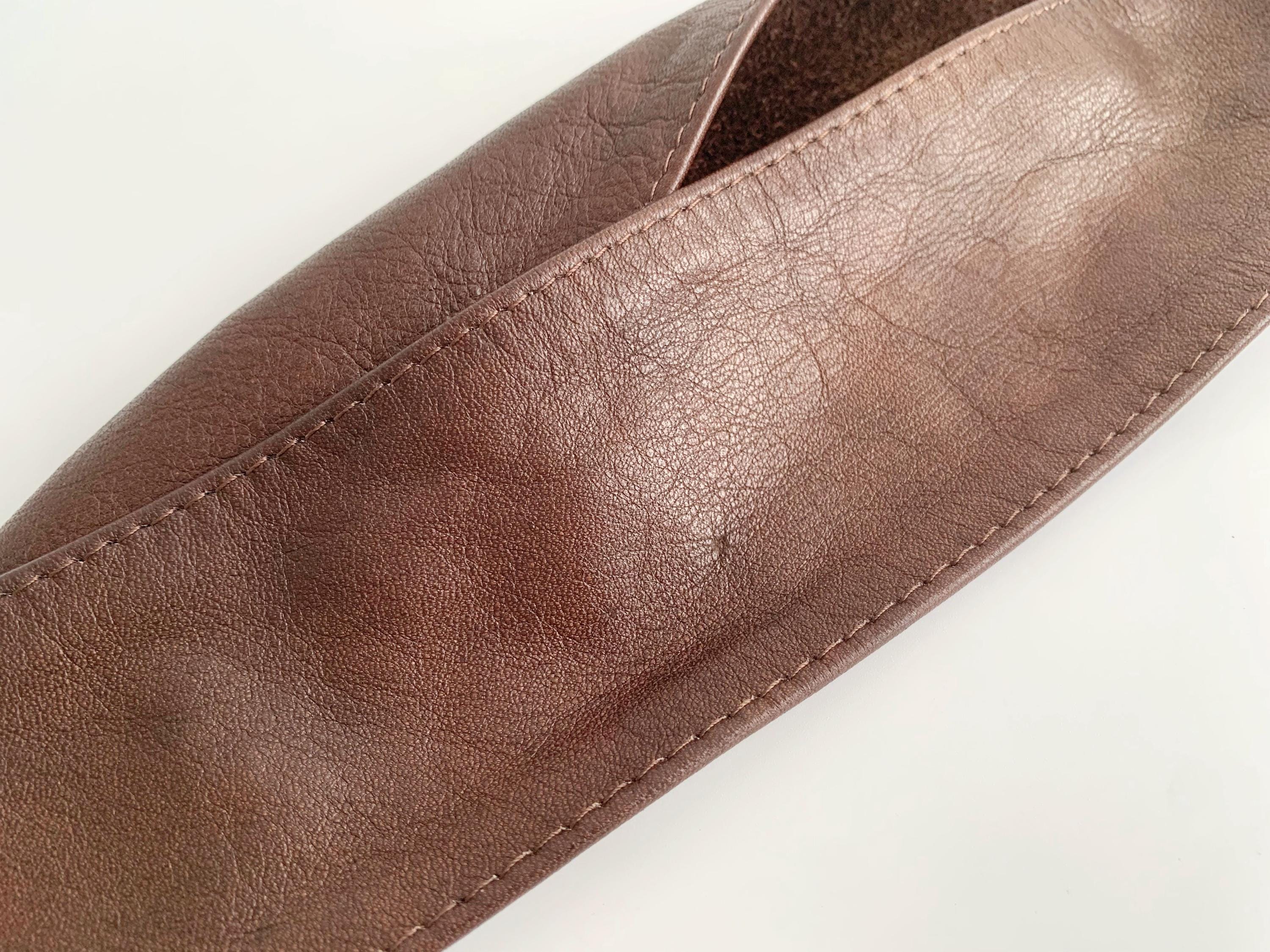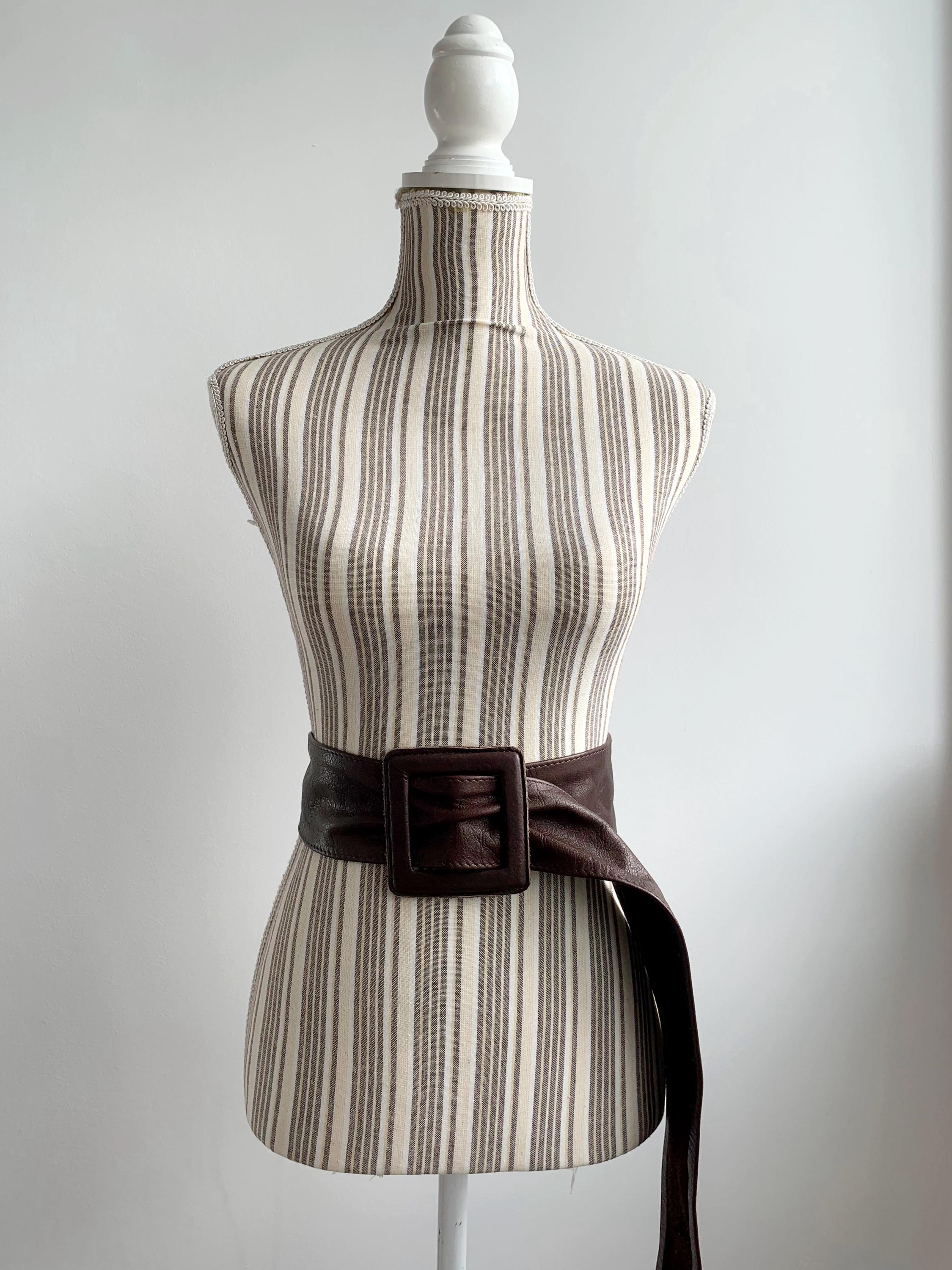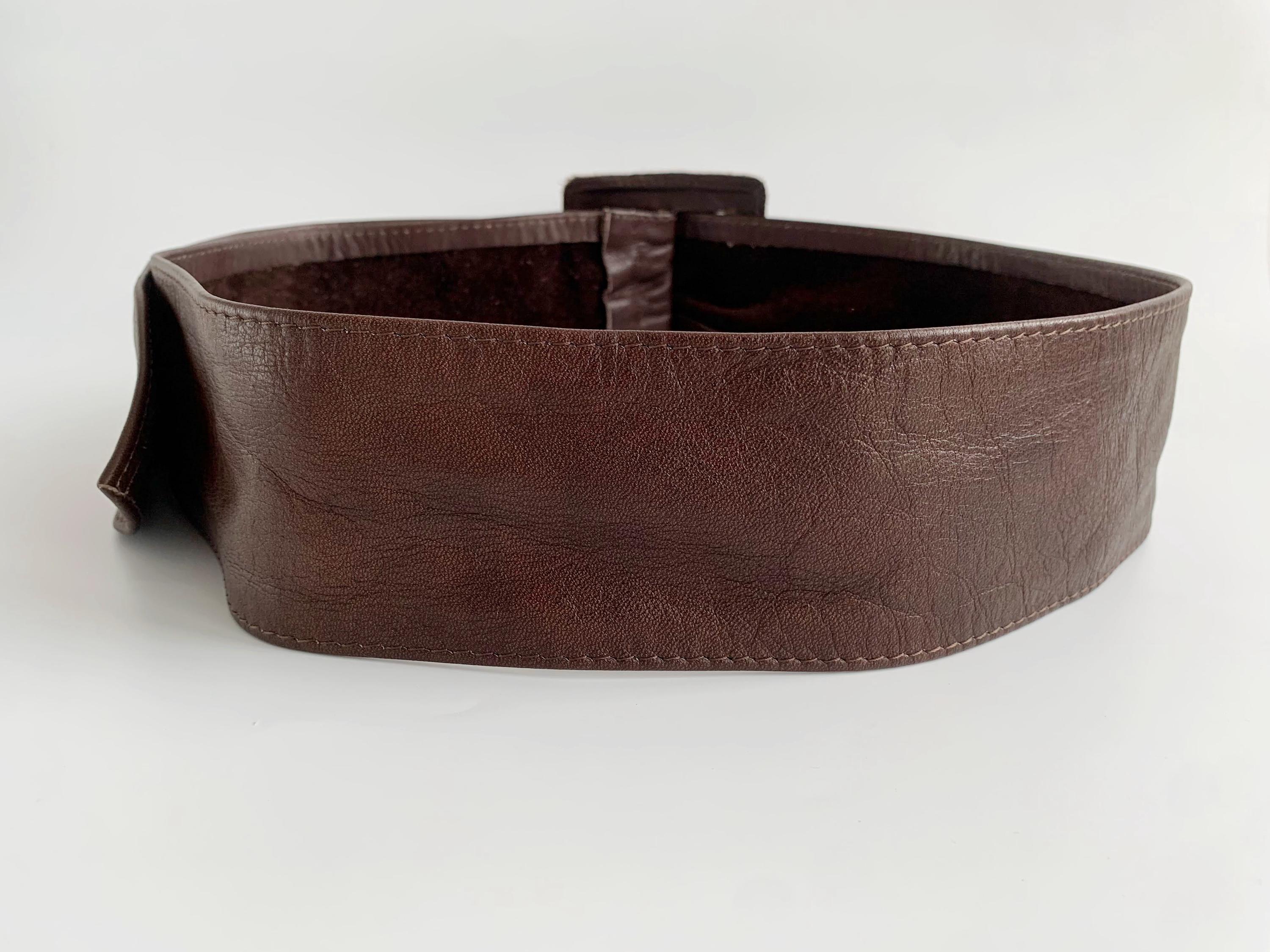 This statement leather obi belt is designed to be worn at the waist, making it an ideal choice for cinching vintage dresses, long tunics, or chunky knitwear. The soft leather construction ensures it sits comfortably against the body, while the dramatic width creates a flattering hourglass shape. Whether you are aiming for a bohemian aesthetic or a sharp retro-office vibe, this brown leather belt adds instant character and vintage charm to any outfit.