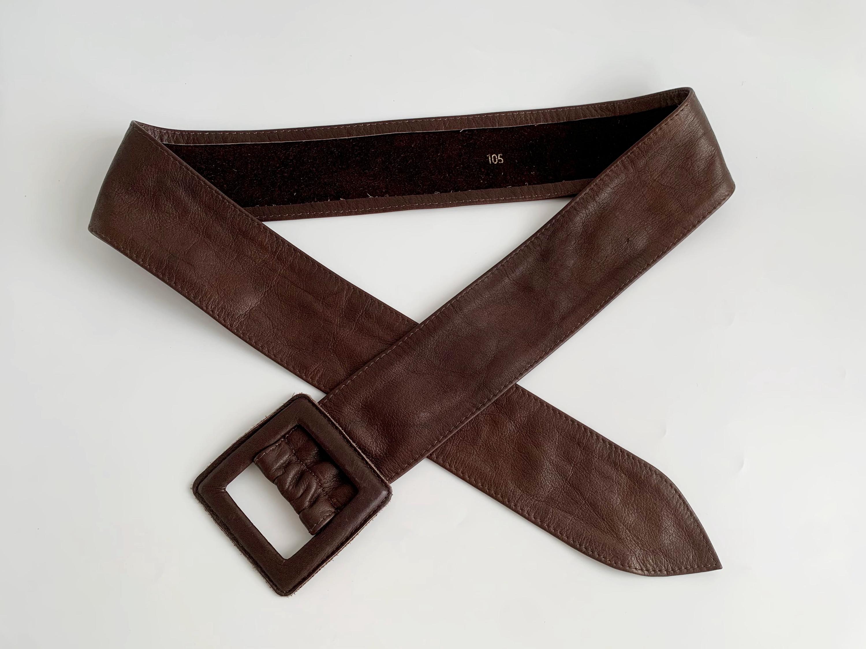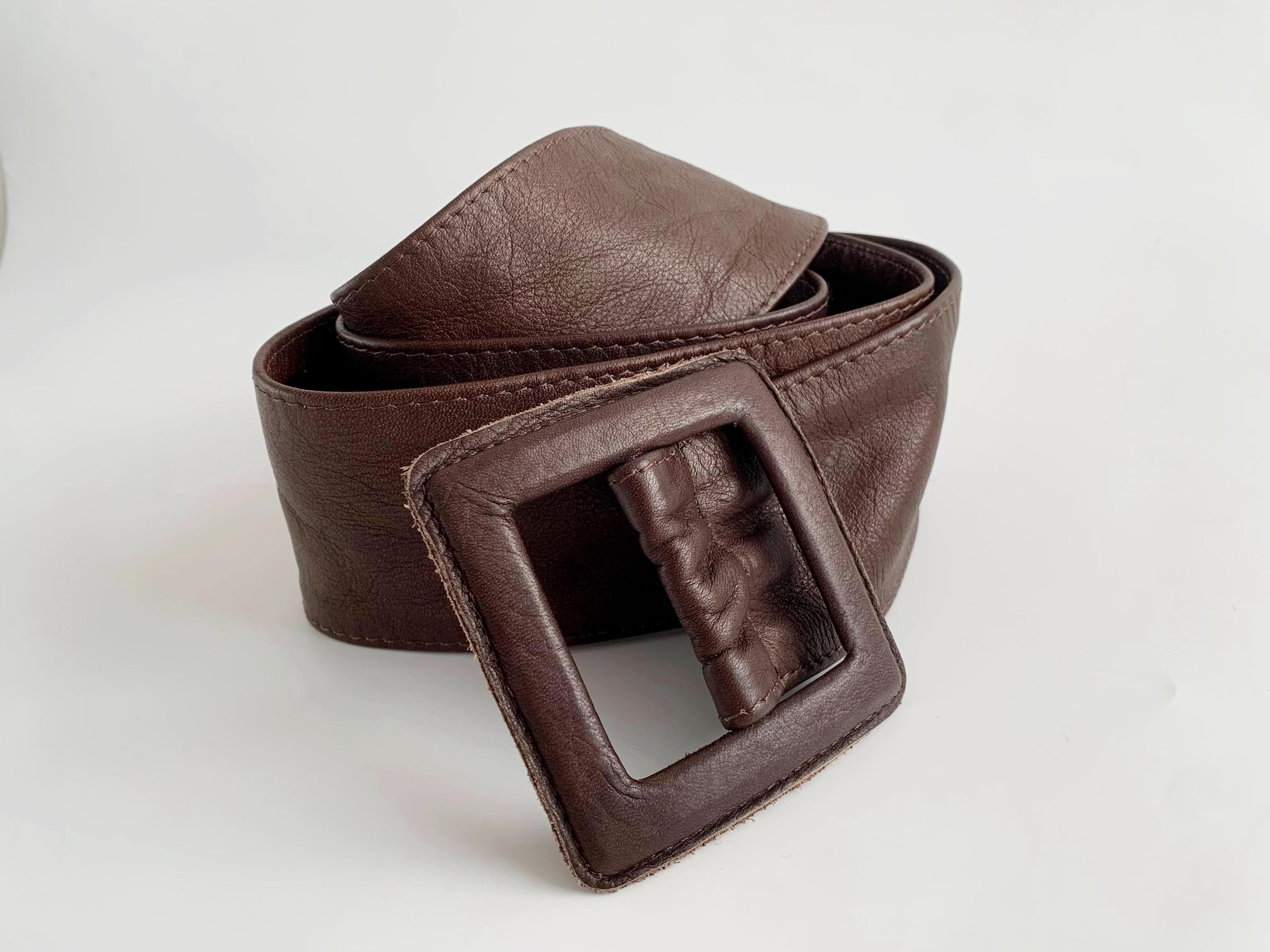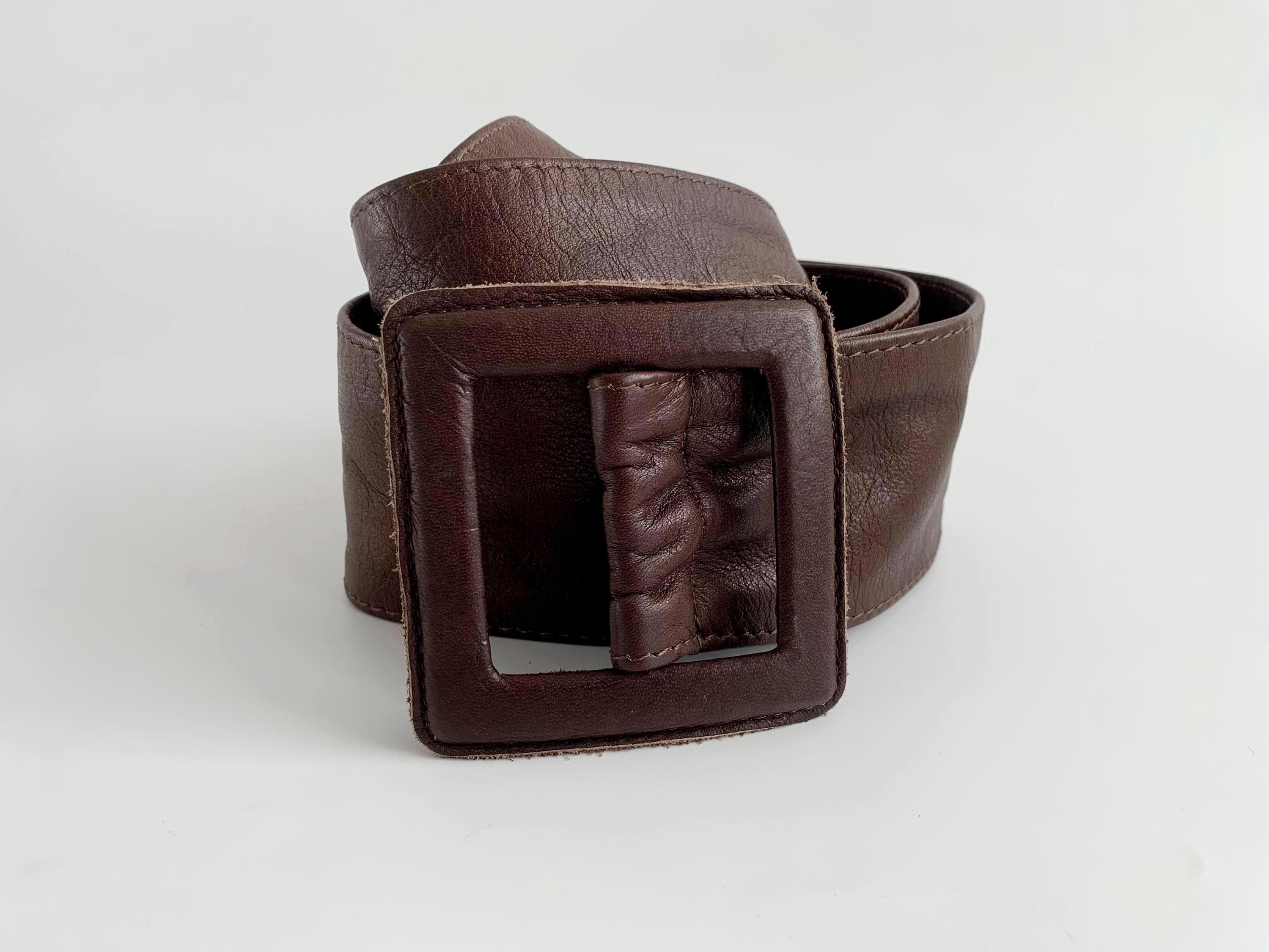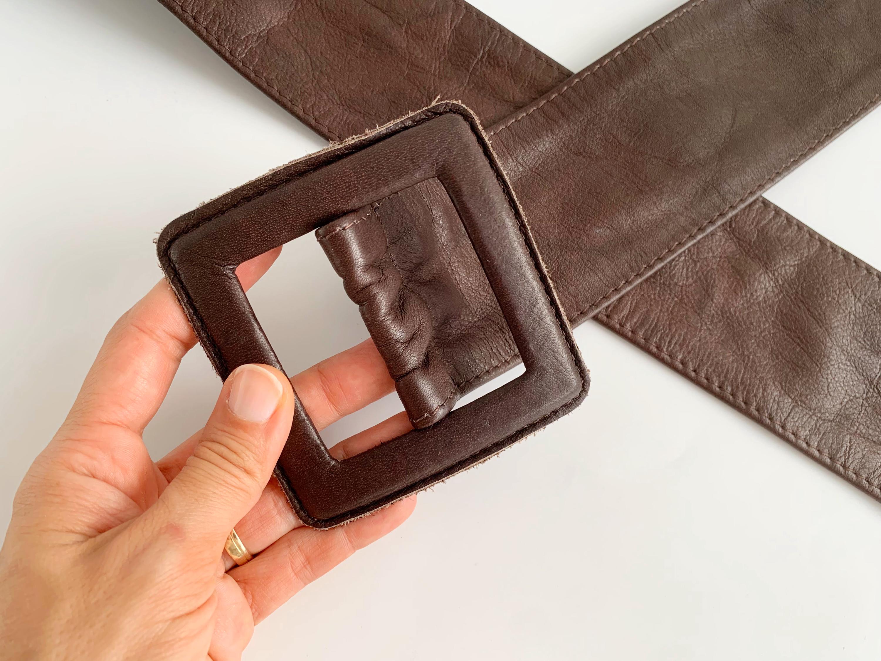 This is a vintage 1980s wide brown leather belt for women size 105 cm / 41.3". Crafted from high-quality, supple genuine leather in a rich dark chocolate brown, this vintage leather accessory features a bold, oversized square buckle that is fully wrapped in matching leather for a seamless, high-end look.
