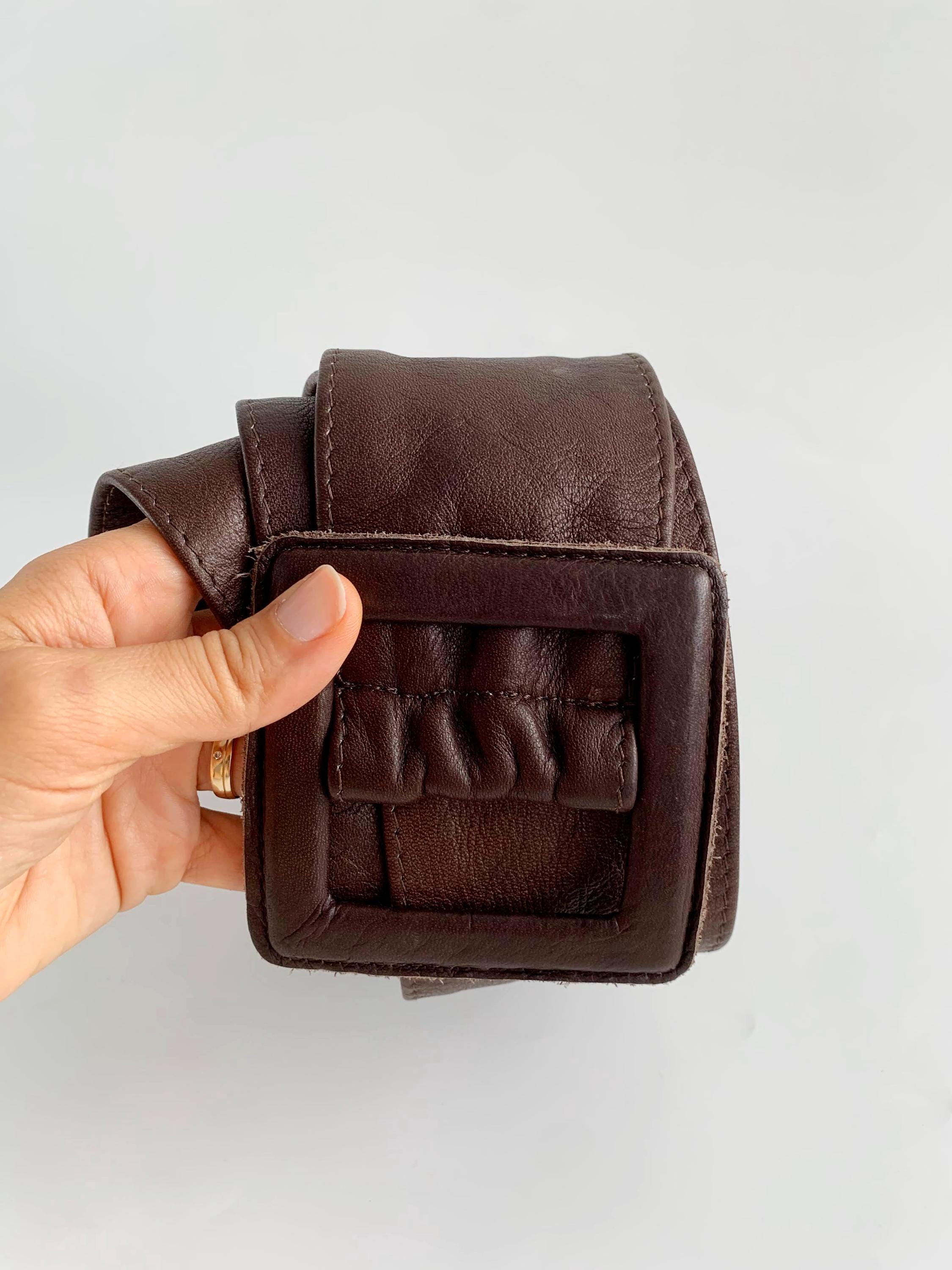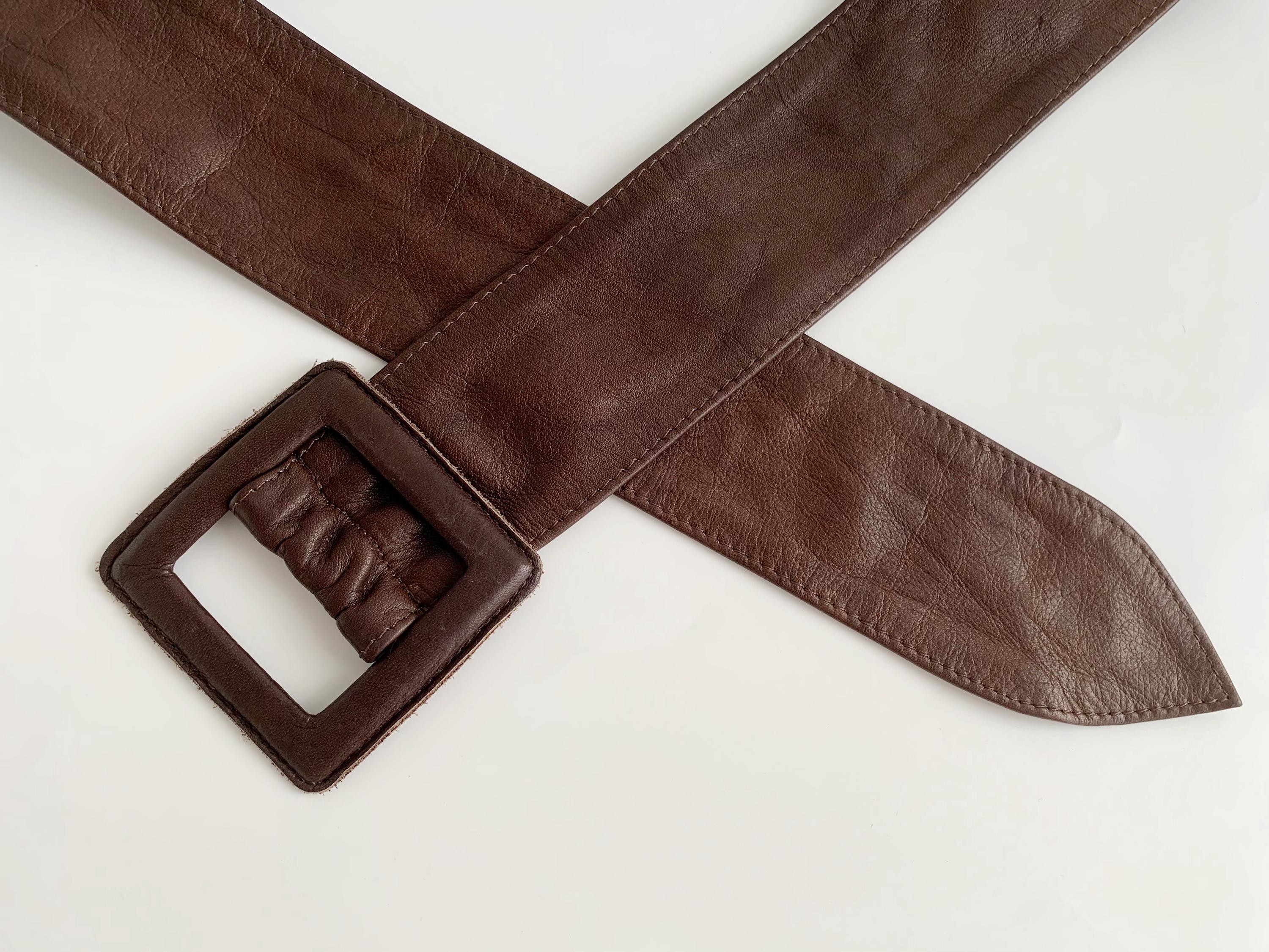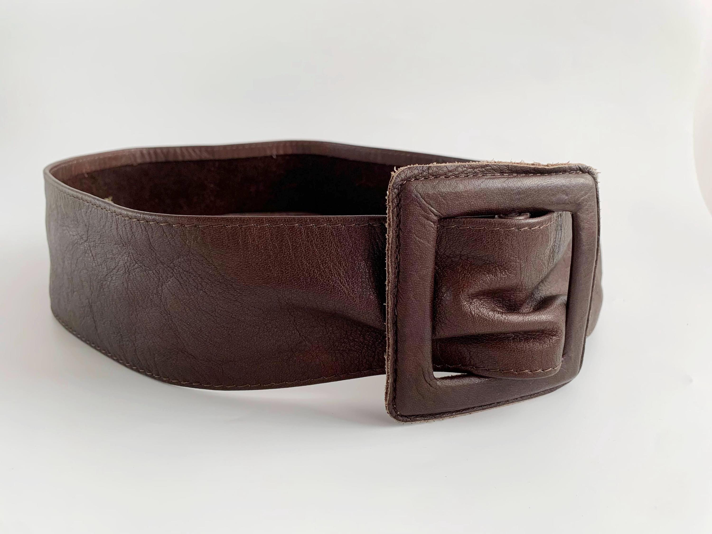 This is a vintage 1980s wide brown leather belt for women size 105 cm / 41.3". Crafted from high-quality, supple genuine leather in a rich dark chocolate brown, this vintage leather accessory features a bold, oversized square buckle that is fully wrapped in matching leather for a seamless, high-end look.