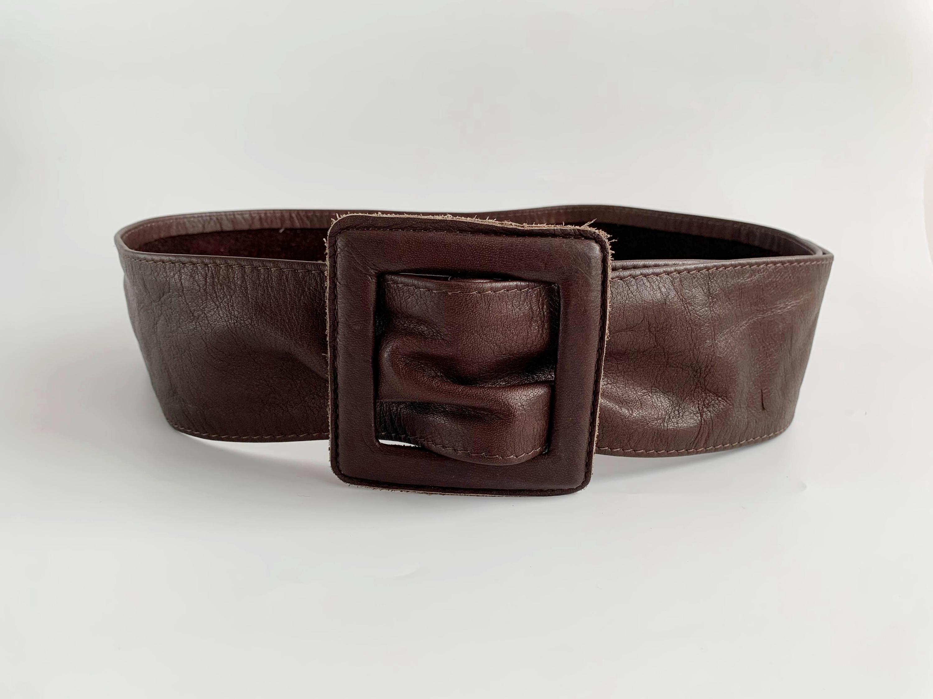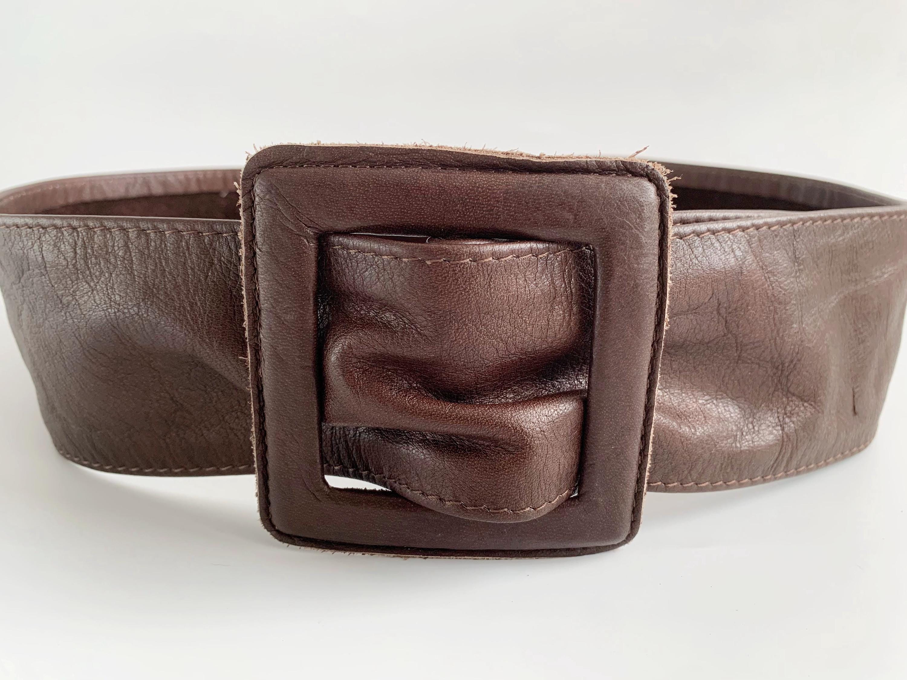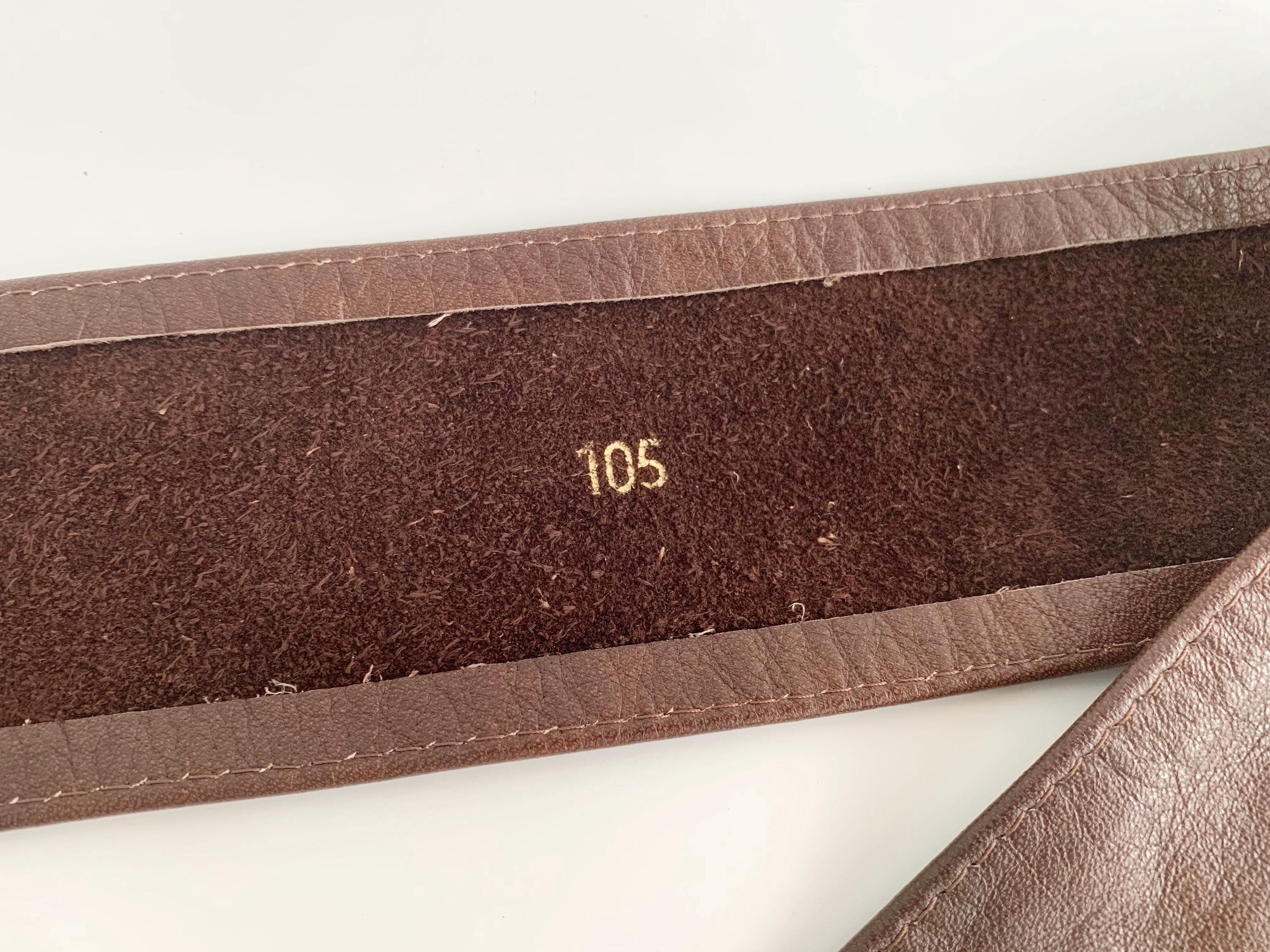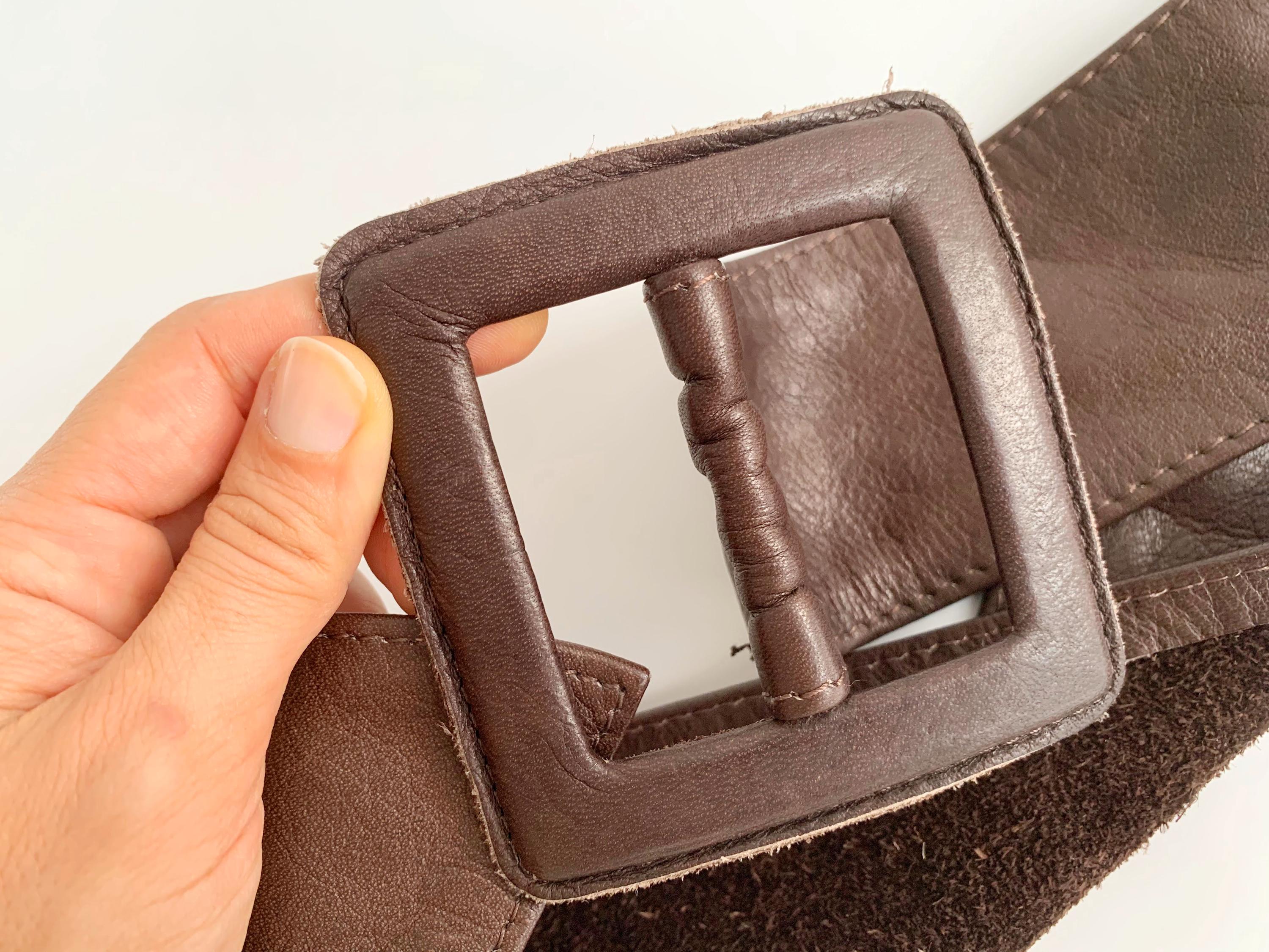 This is a vintage 1980s wide brown leather belt for women size 105 cm / 41.3". Crafted from high-quality, supple genuine leather in a rich dark chocolate brown, this vintage leather accessory features a bold, oversized square buckle that is fully wrapped in matching leather for a seamless, high-end look.