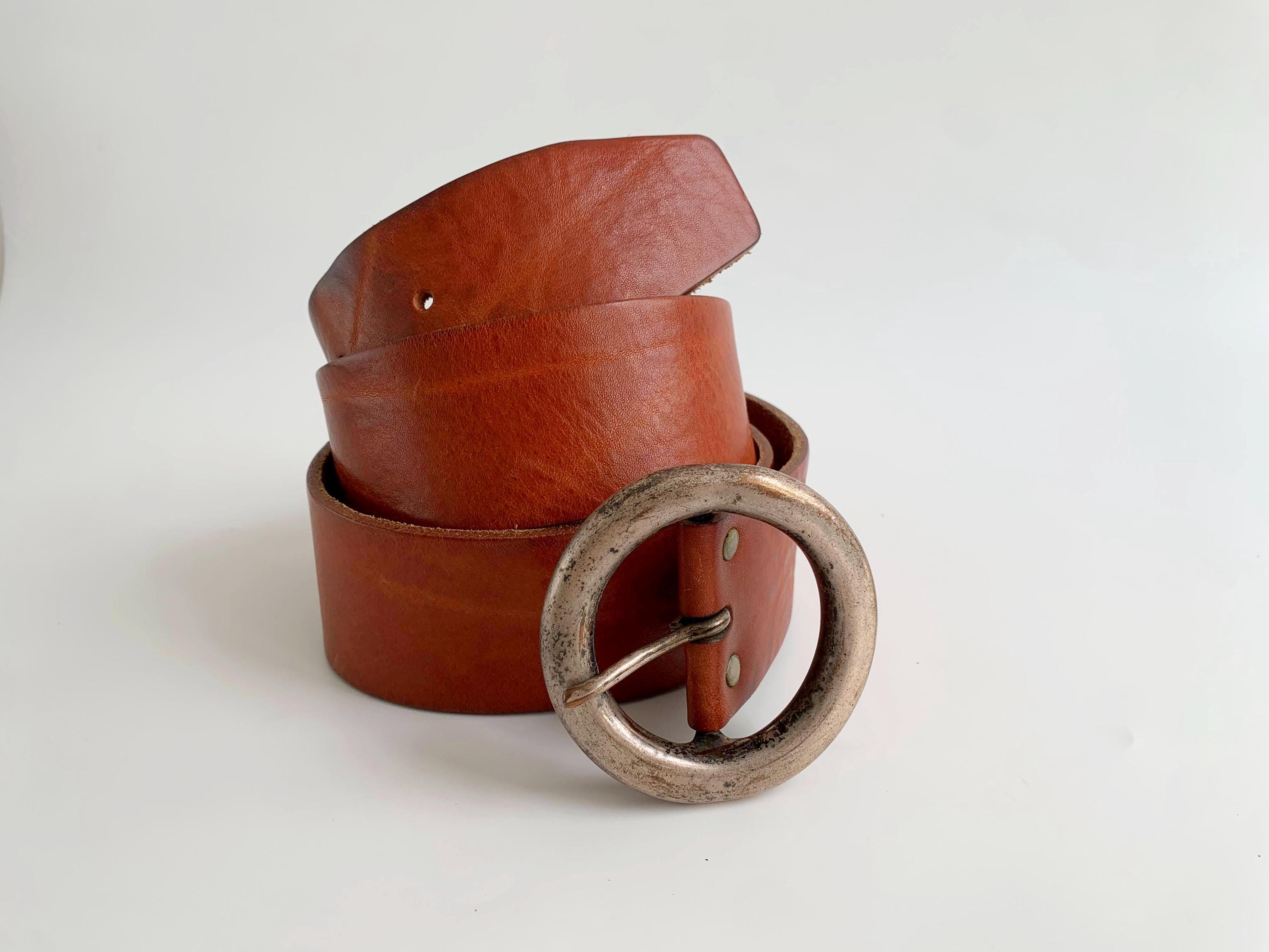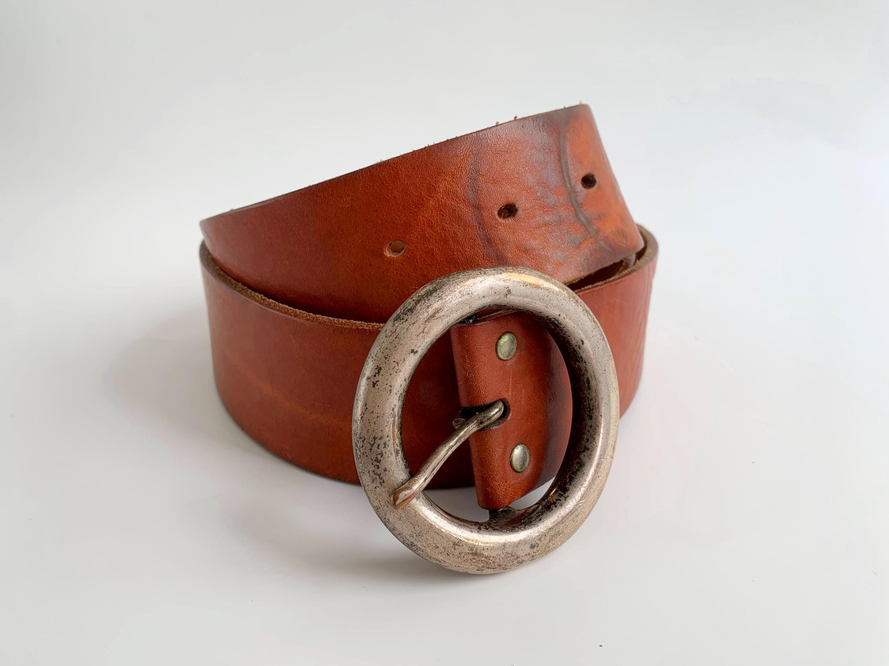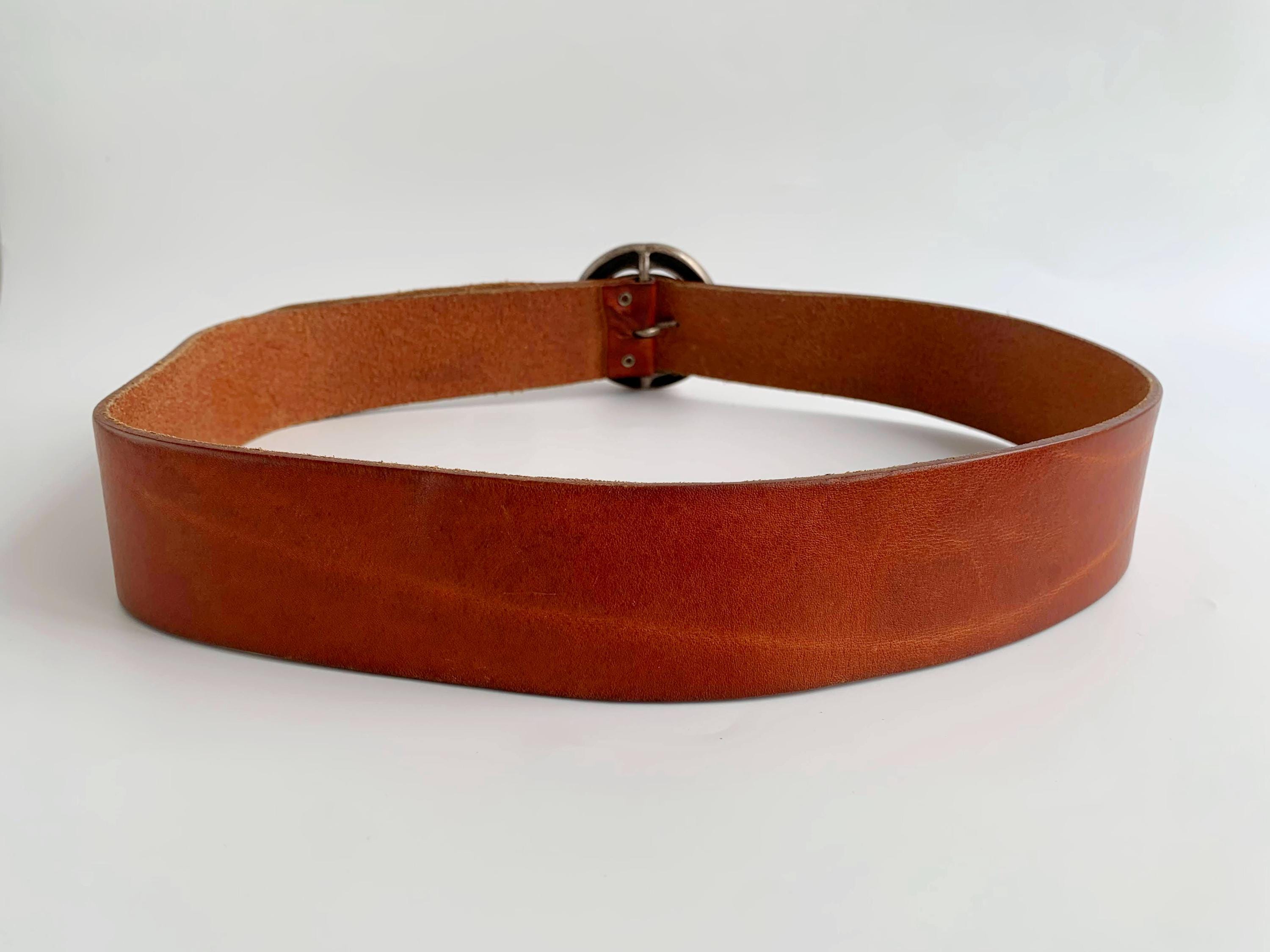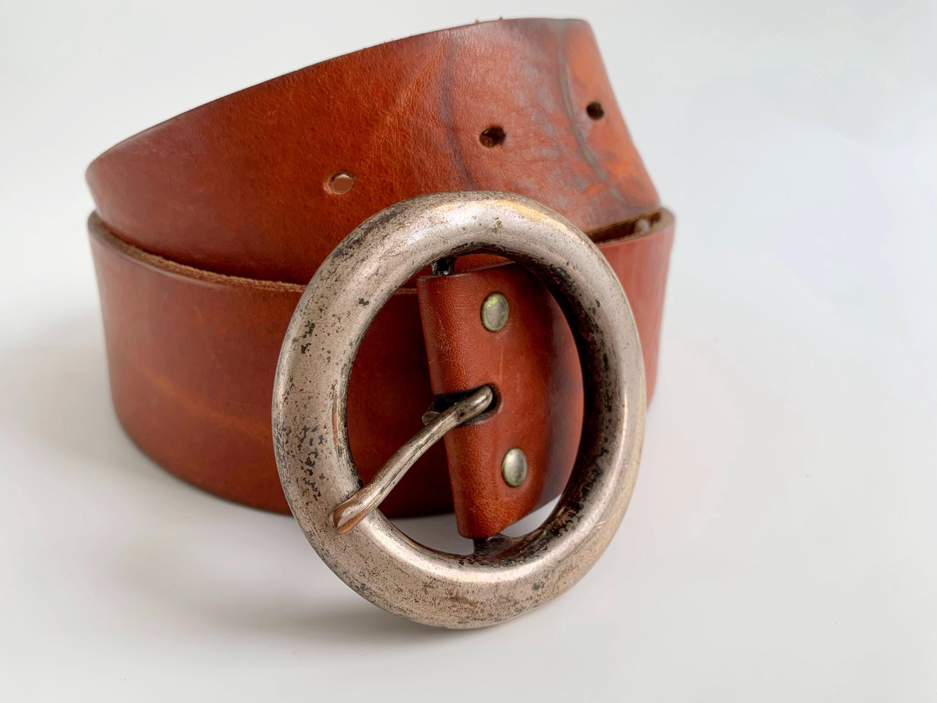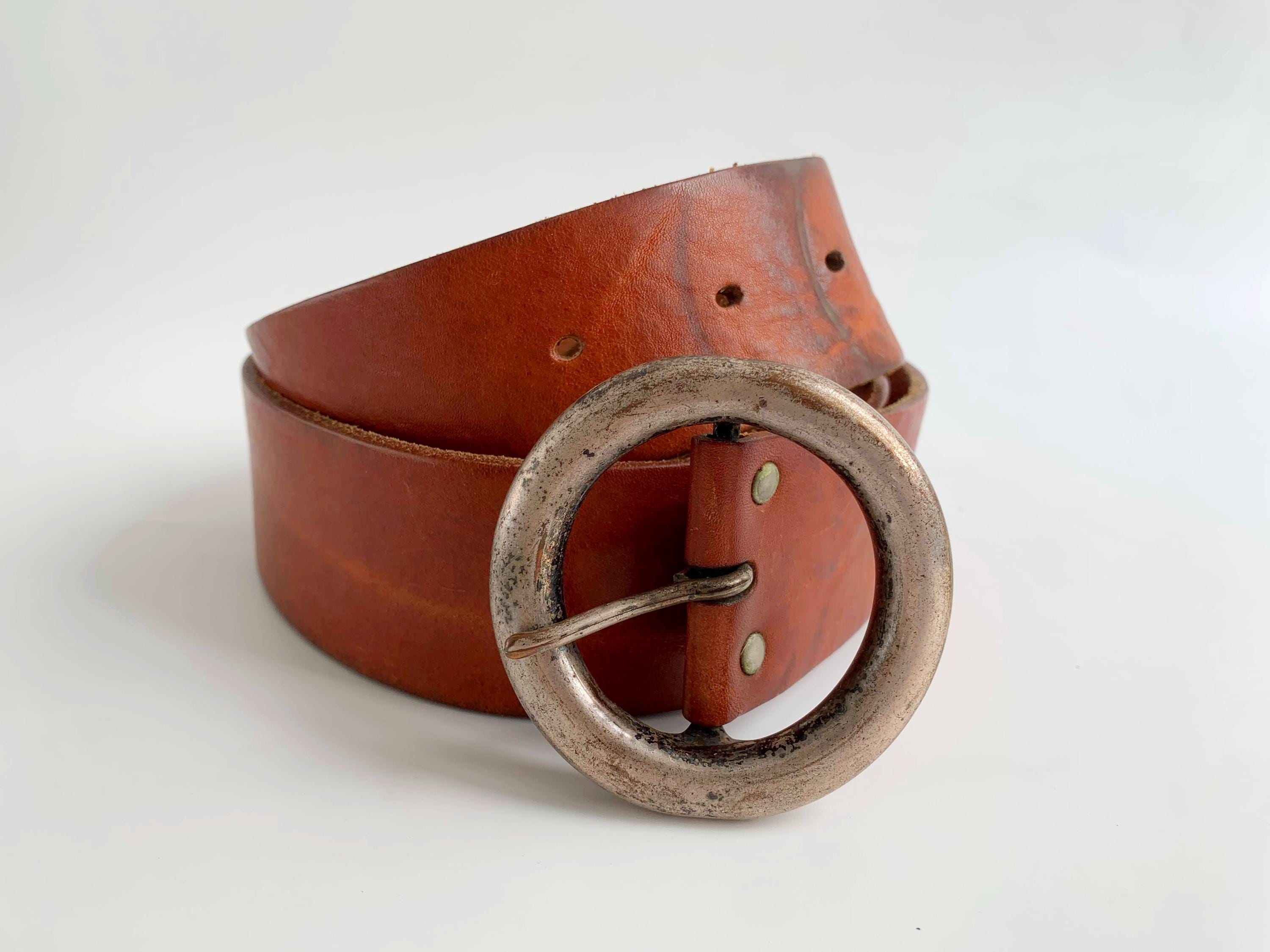 This is a vintage tan brown wide leather belt for women size 95 cm / 37.4". Crafted from thick, genuine tan leather, this real leather accessory features a beautiful natural patina that adds character and a rugged, bohemian charm to any outfit. The standout feature is the oversized, antiqued silver-tone circular buckle, which provides a bold focal point for cinching dresses, oversized blazers, or high-waisted denim.