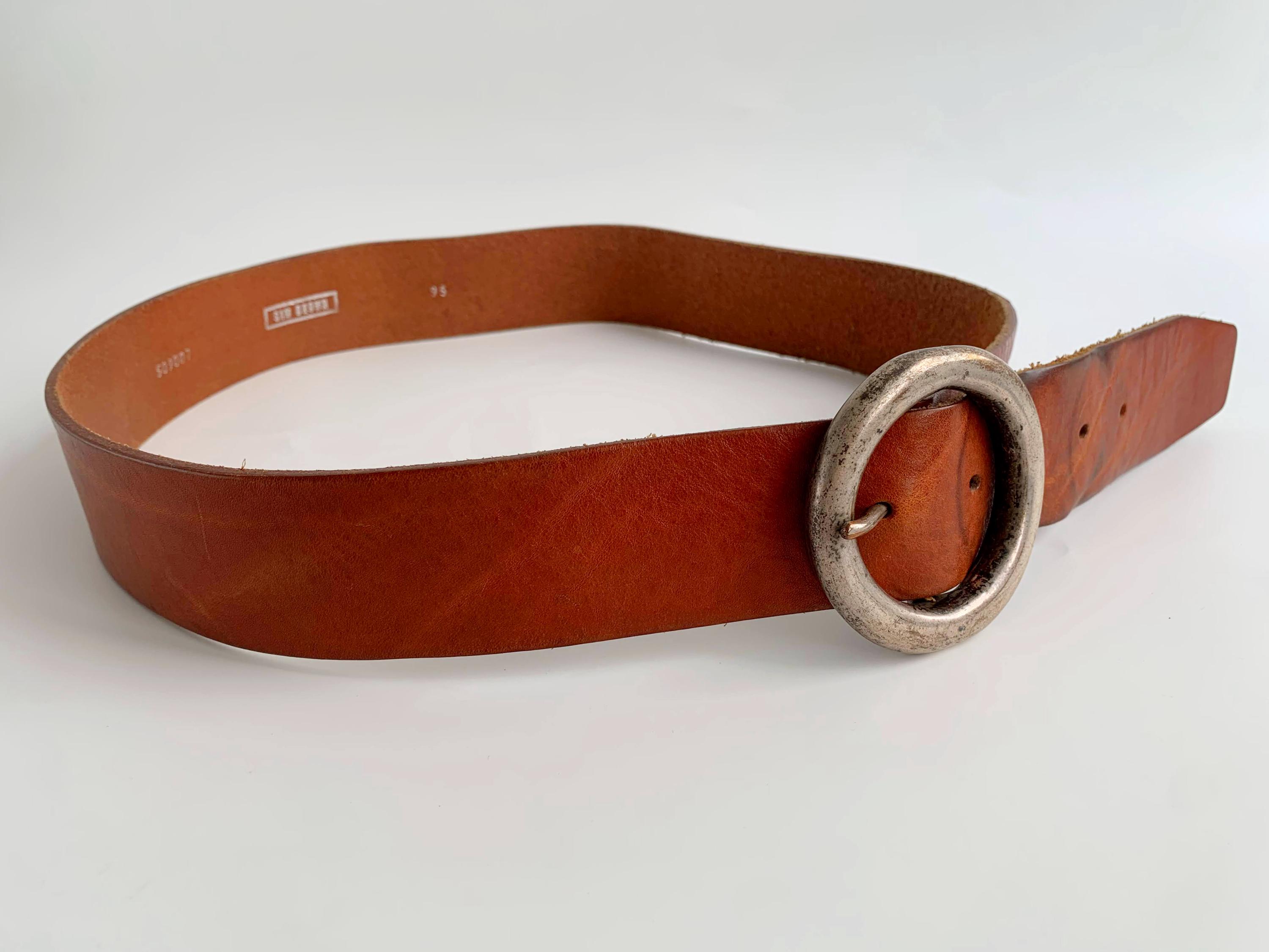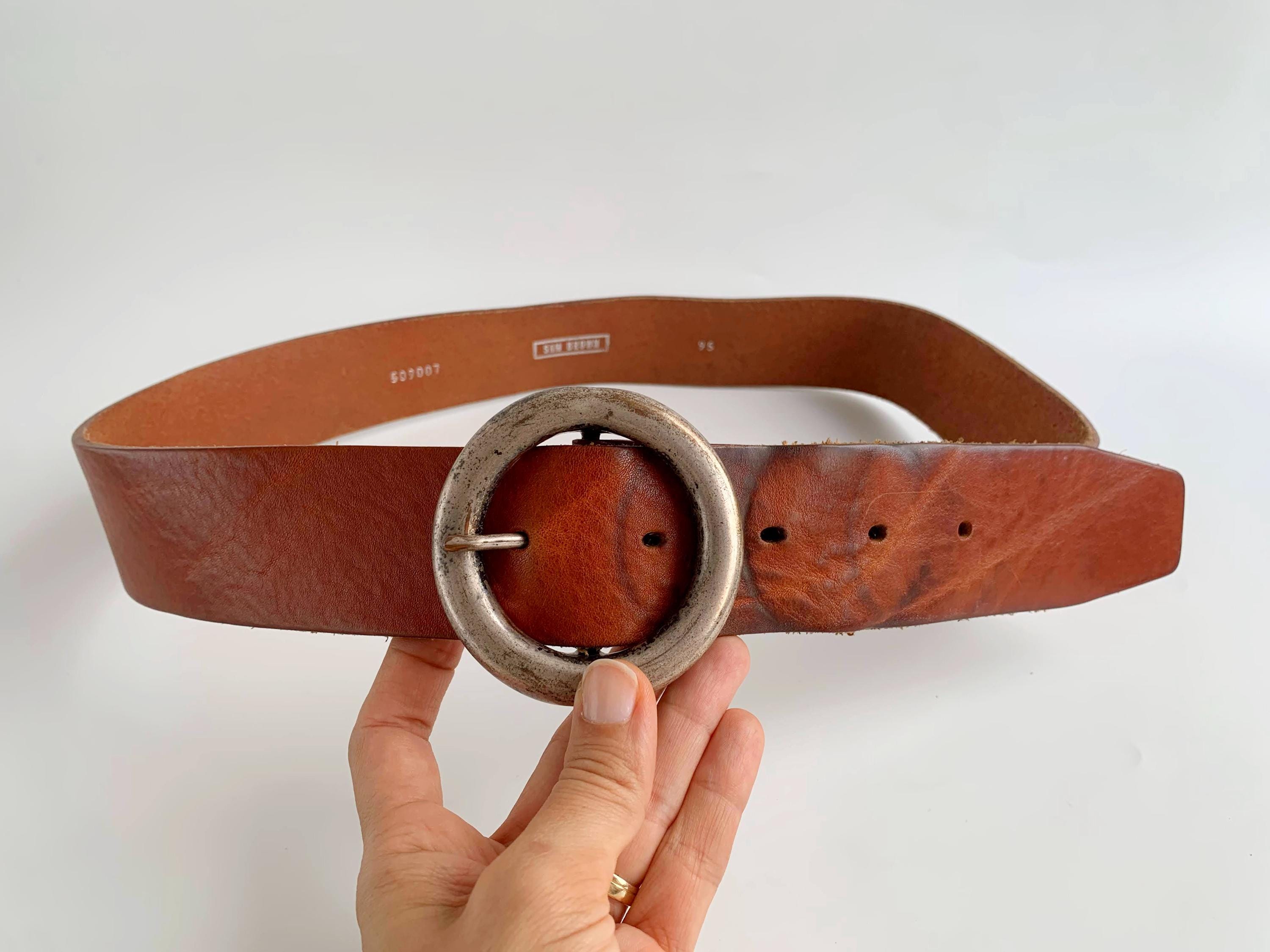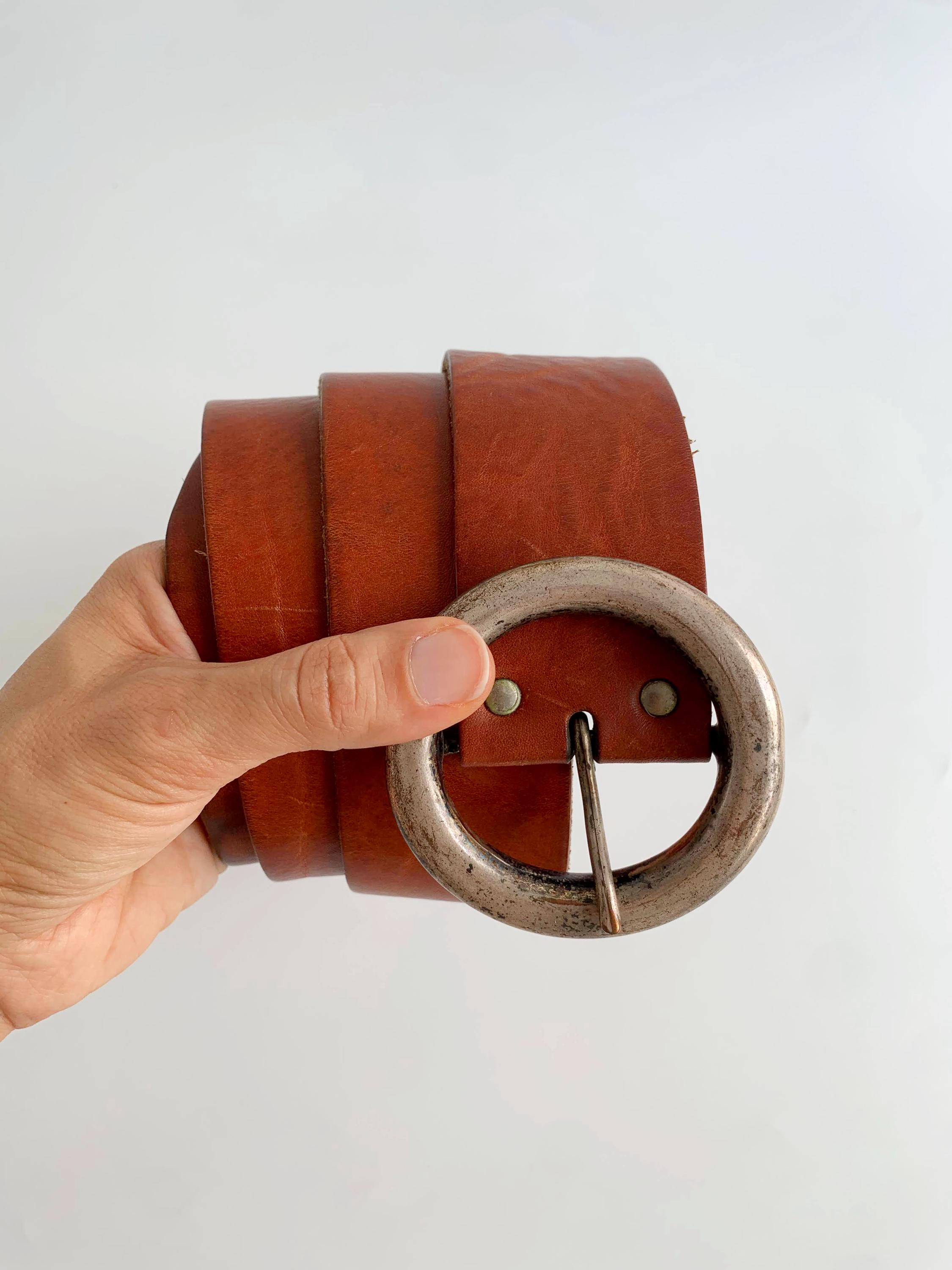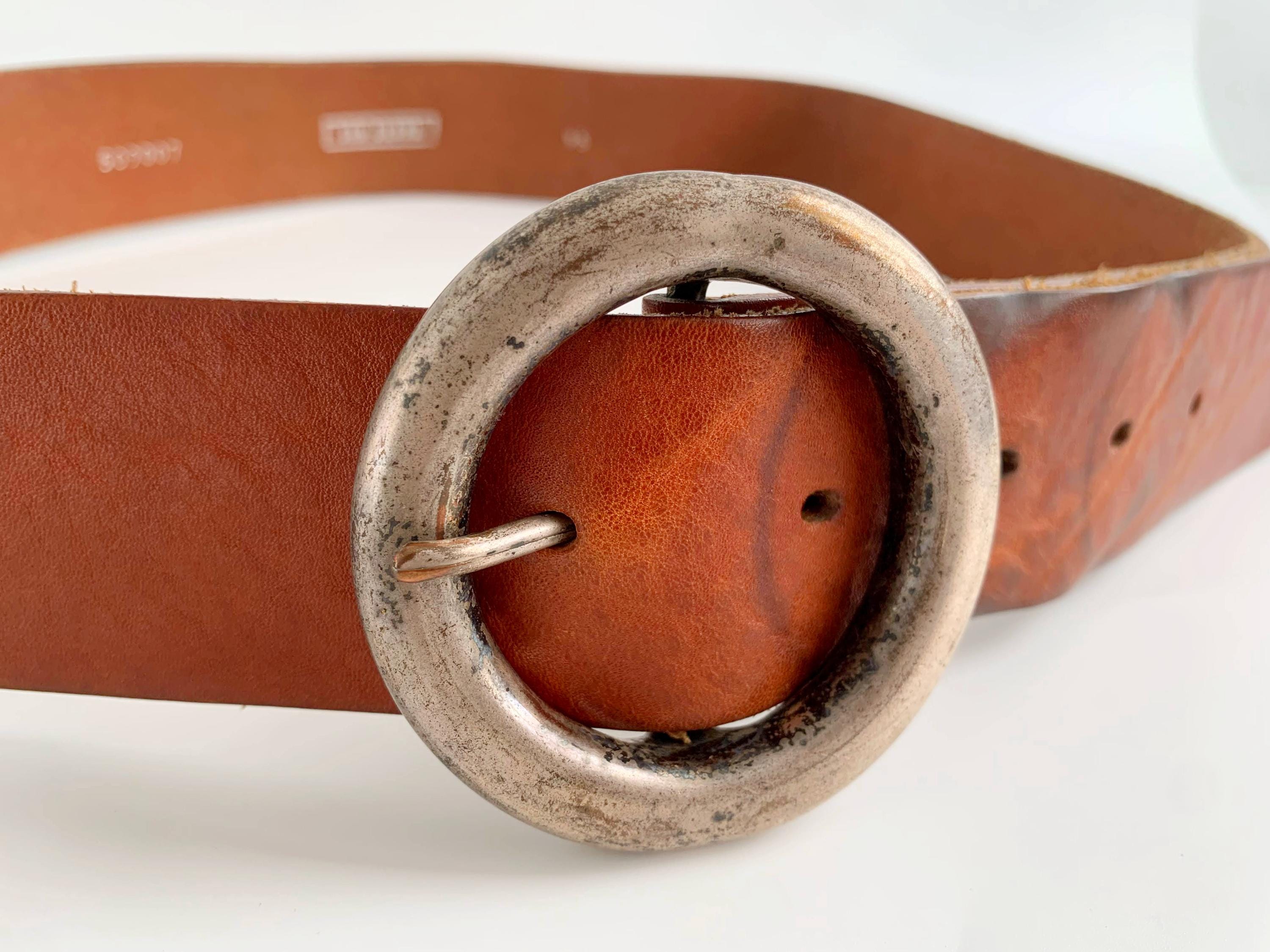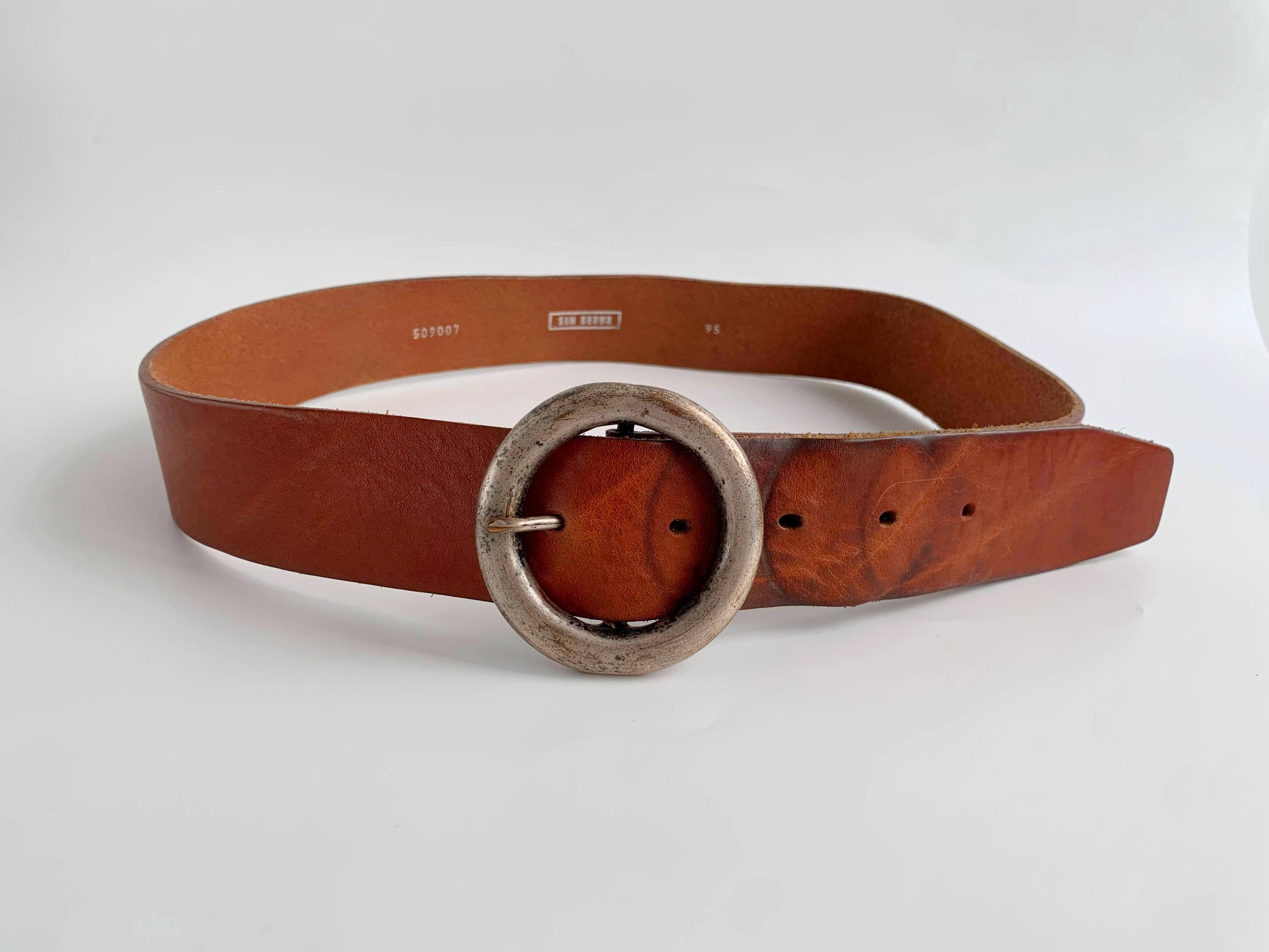 This is a vintage tan brown wide leather belt for women size 95 cm / 37.4". Crafted from thick, genuine tan leather, this real leather accessory features a beautiful natural patina that adds character and a rugged, bohemian charm to any outfit. The standout feature is the oversized, antiqued silver-tone circular buckle, which provides a bold focal point for cinching dresses, oversized blazers, or high-waisted denim.