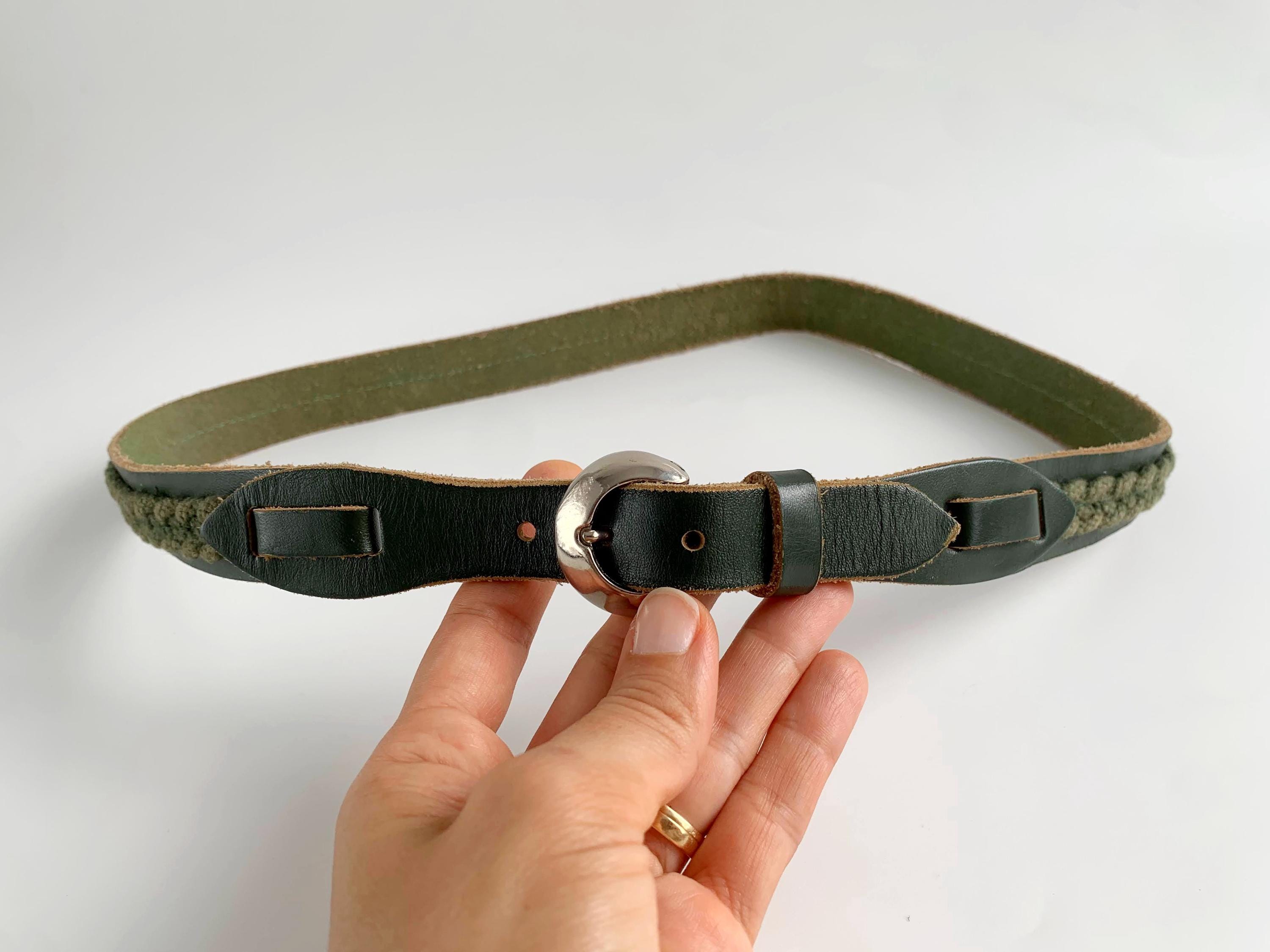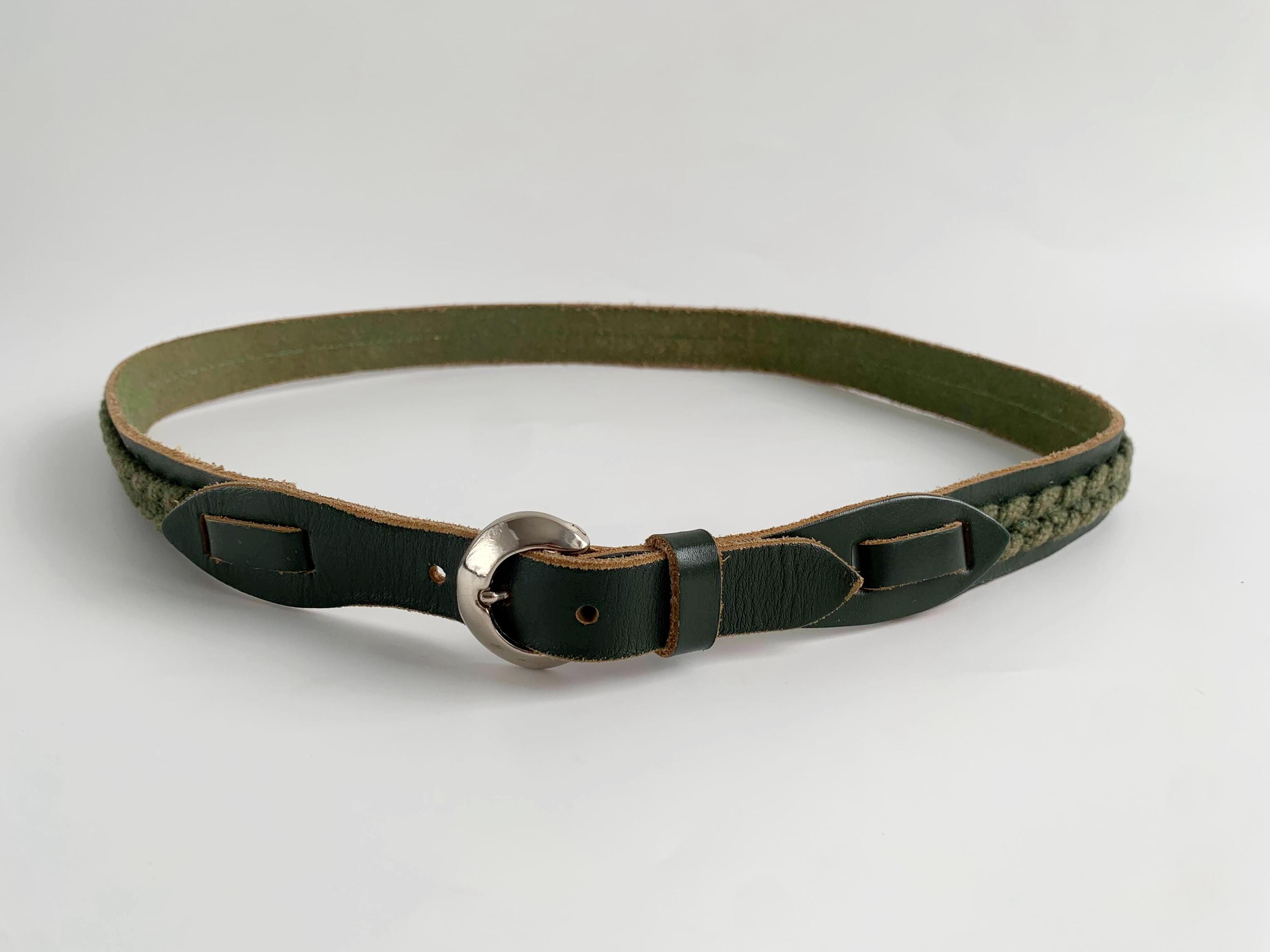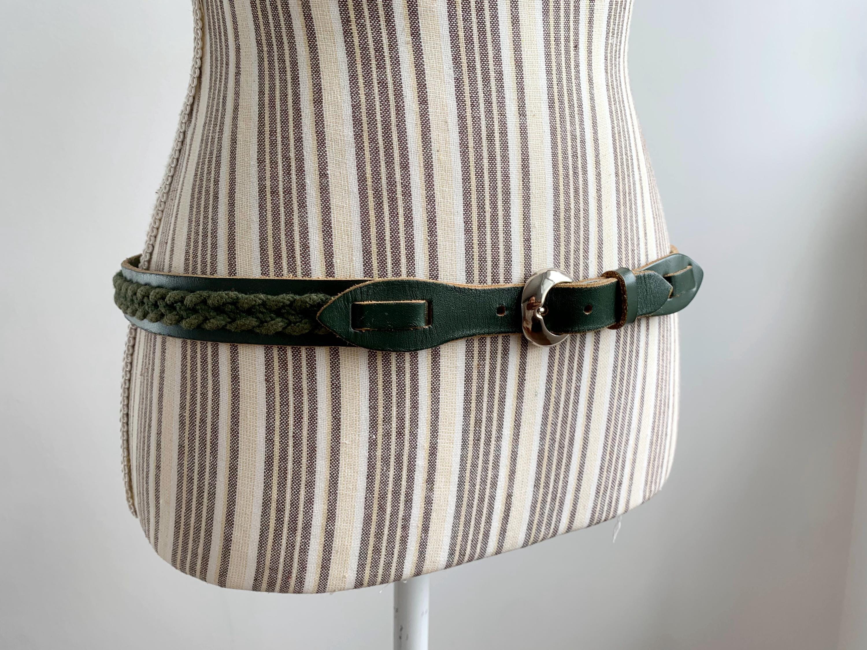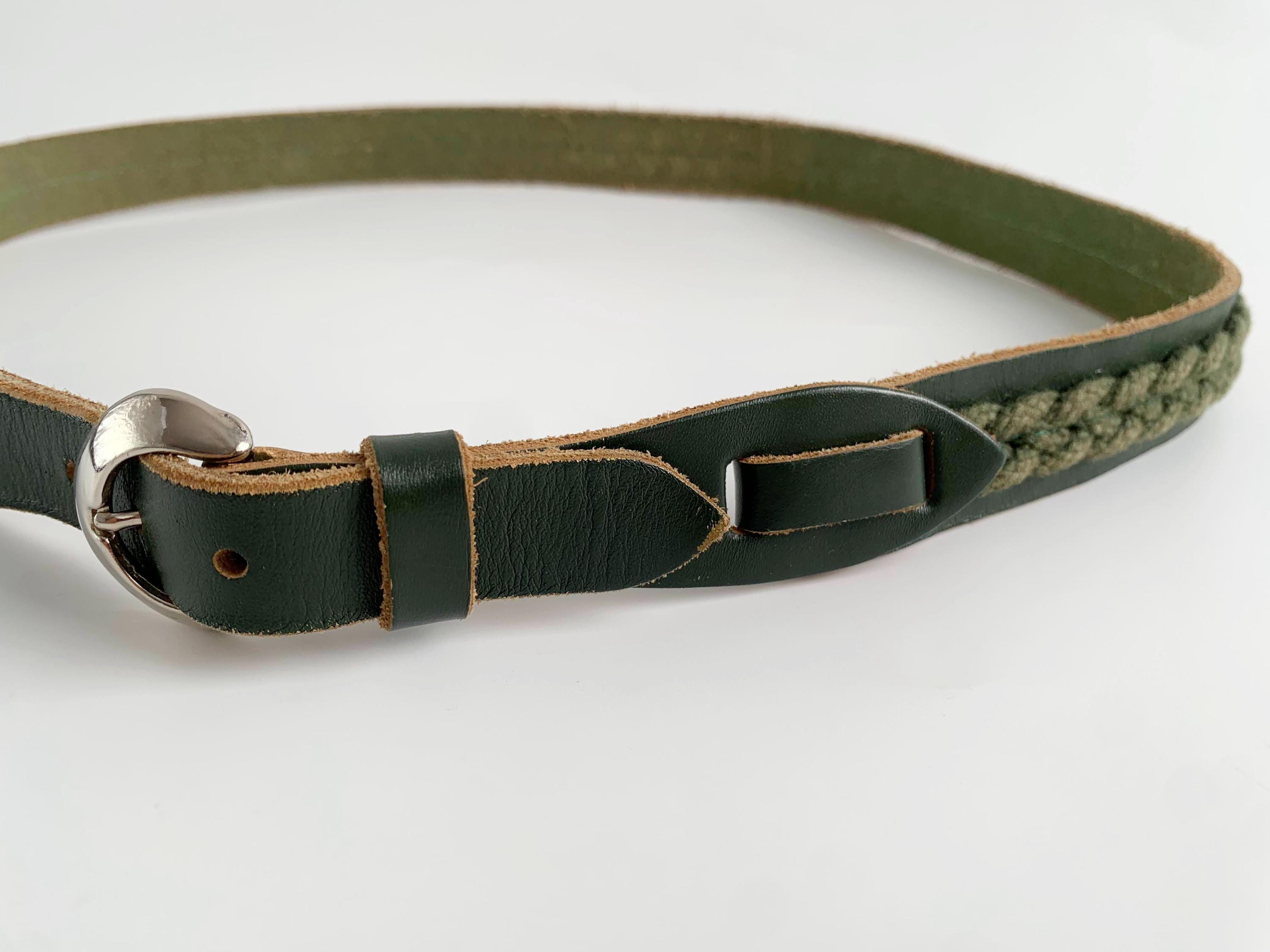 This unique vintage 80s forest green leather belt is the perfect statement leather accessory for those who love earthy tones and artisanal textures. Crafted from high-quality dark forest green leather, this braided belt features a beautiful olive green braided knit inlay that runs along the leather belt strap, creating a rich, multi-dimensional look. This slim waist belt is finished with a polished silver-tone D ring horseshoe shape buckle and decorative leather overlays that add a touch of western-boho charm.