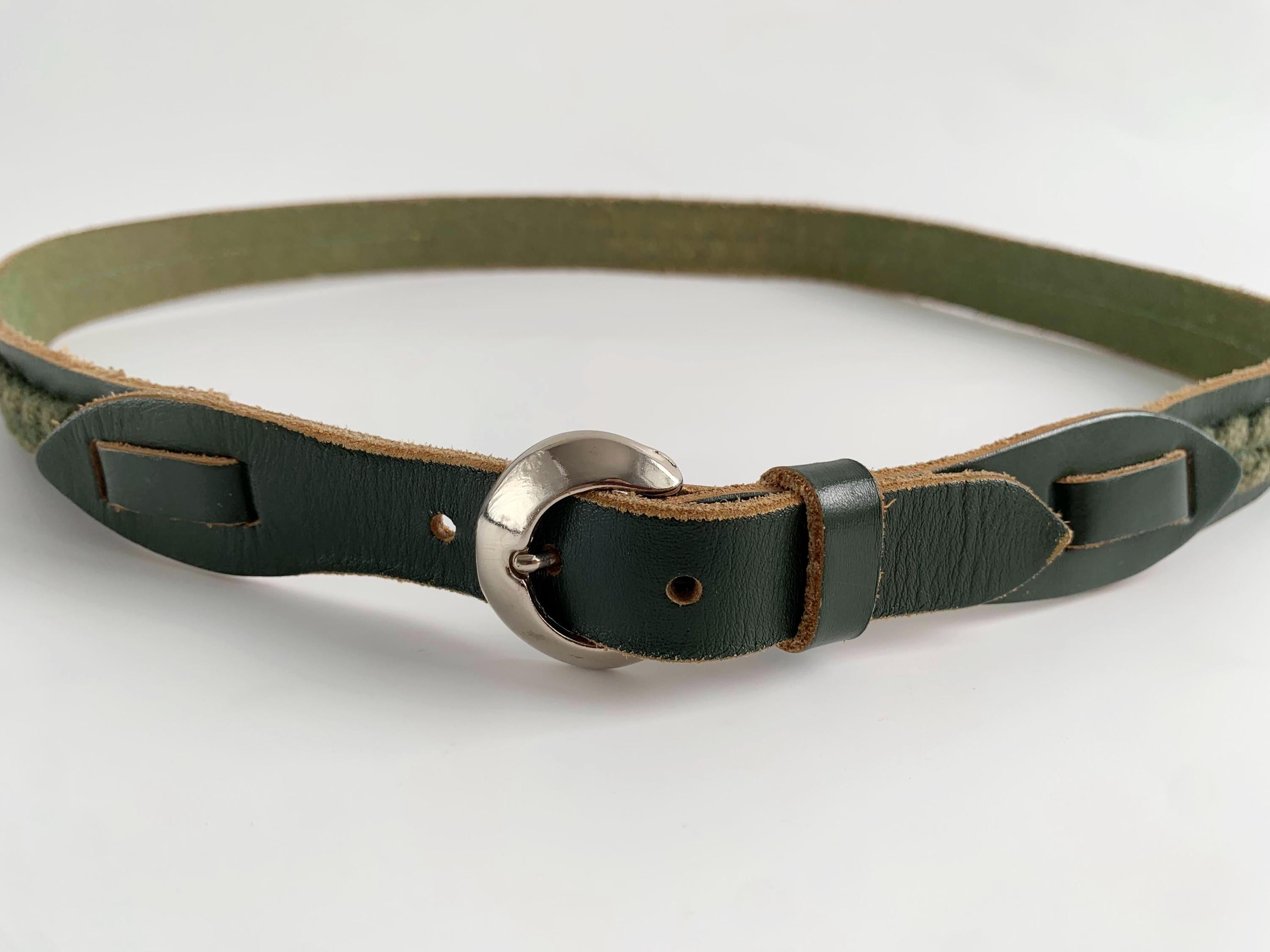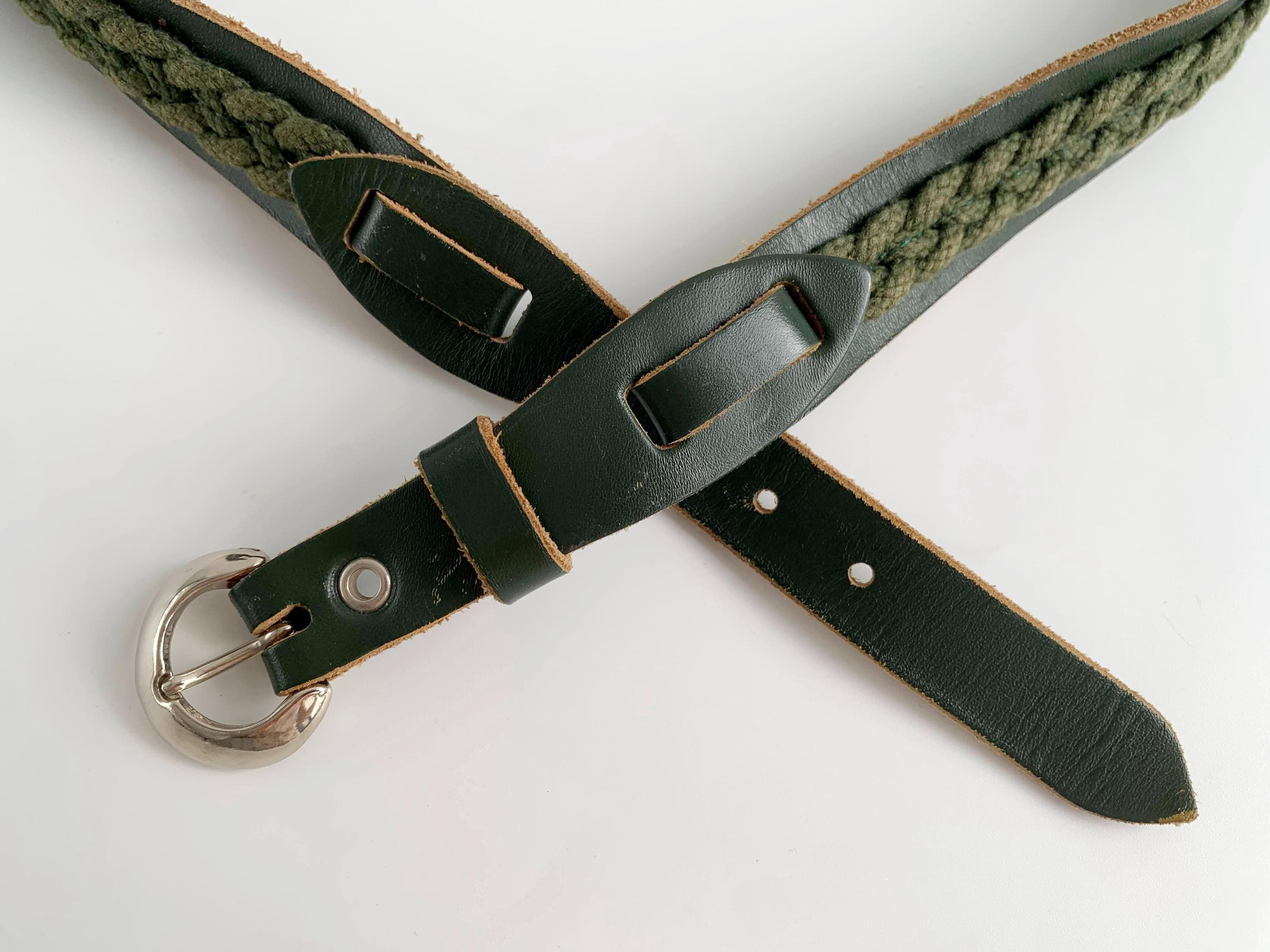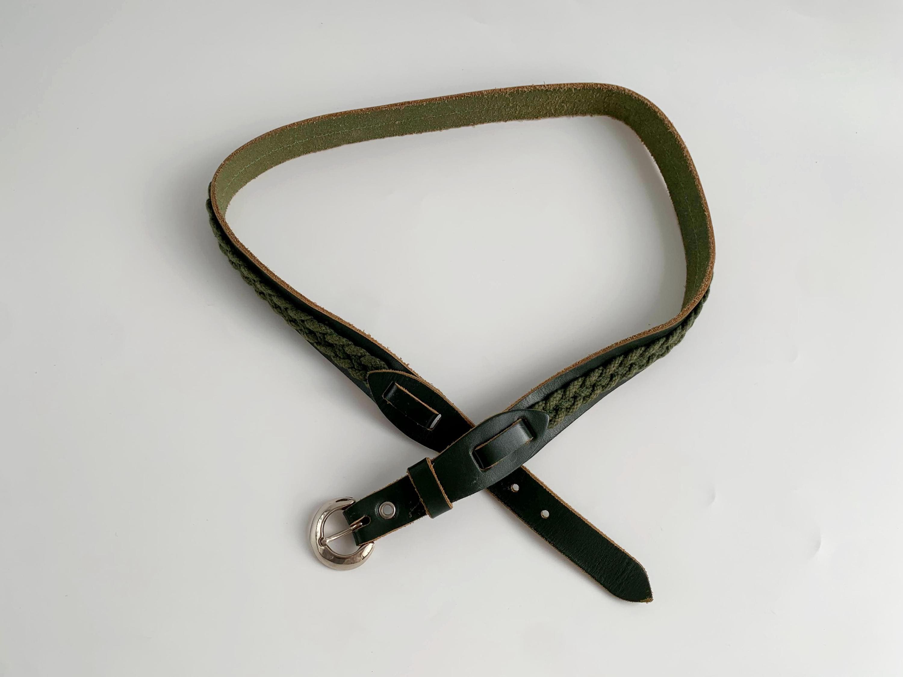 This unique vintage 80s forest green leather belt is the perfect statement leather accessory for those who love earthy tones and artisanal textures. Crafted from high-quality dark forest green leather, this braided belt features a beautiful olive green braided knit inlay that runs along the leather belt strap, creating a rich, multi-dimensional look. This slim waist belt is finished with a polished silver-tone D ring horseshoe shape buckle and decorative leather overlays that add a touch of western-boho charm.
