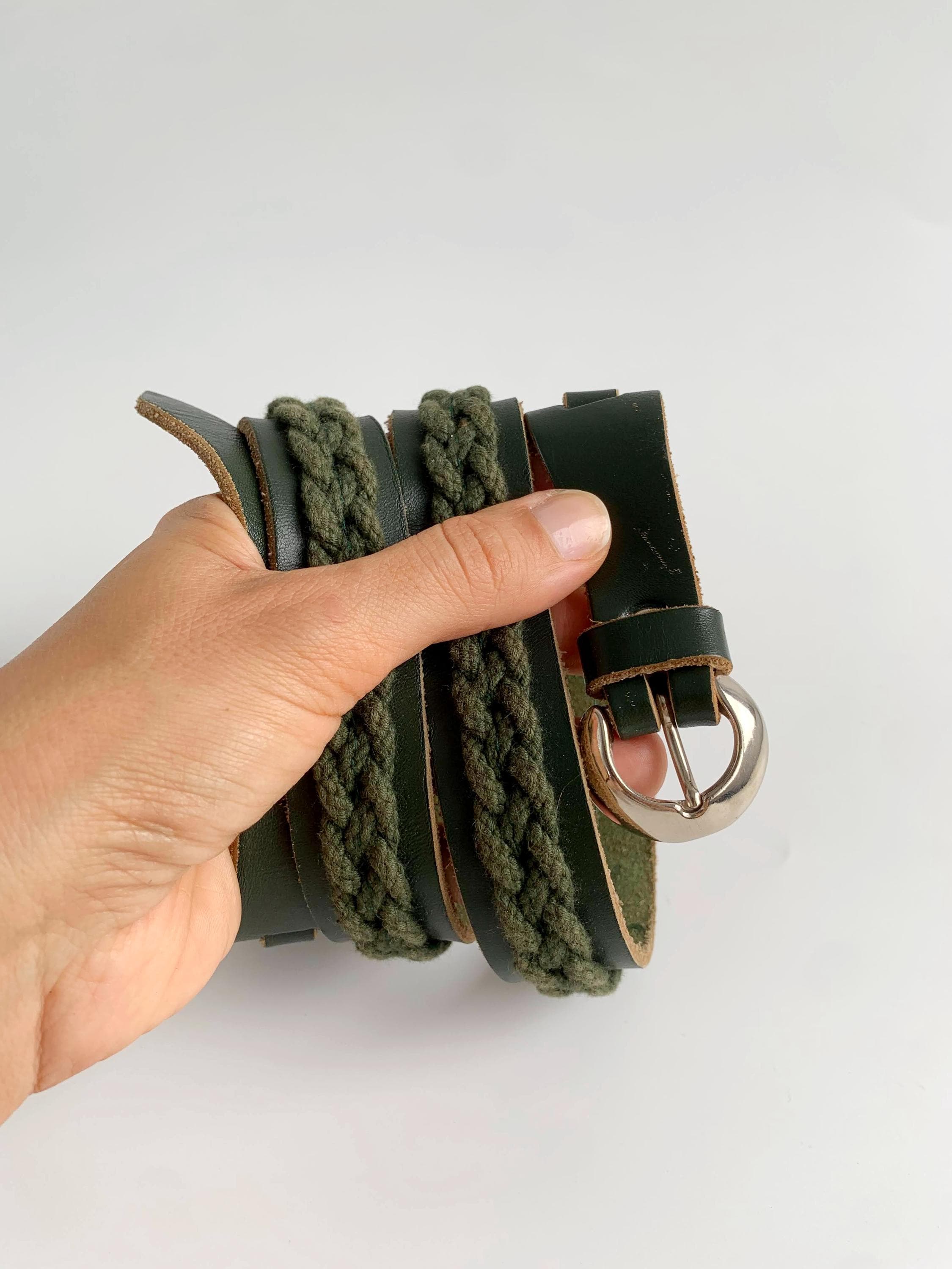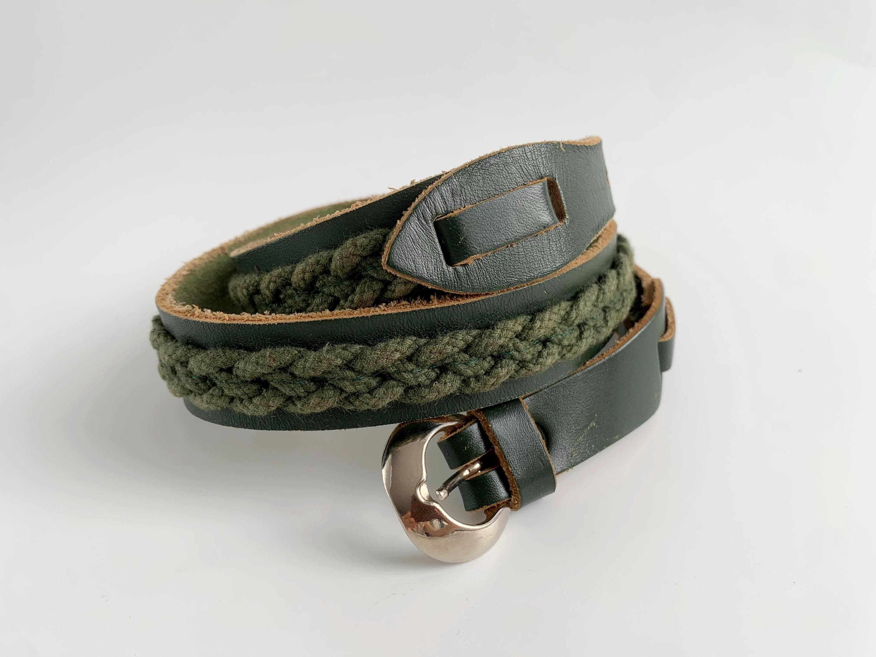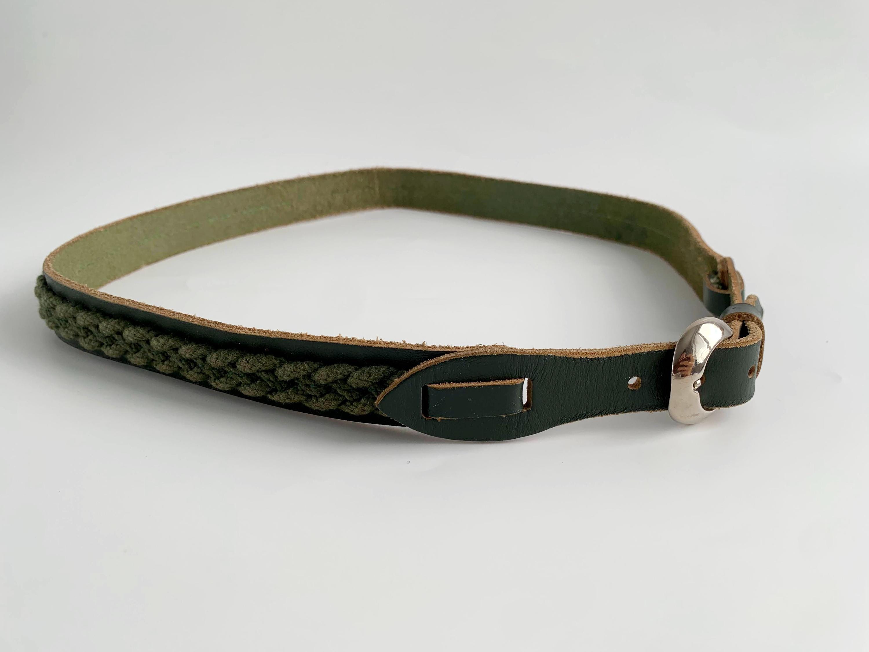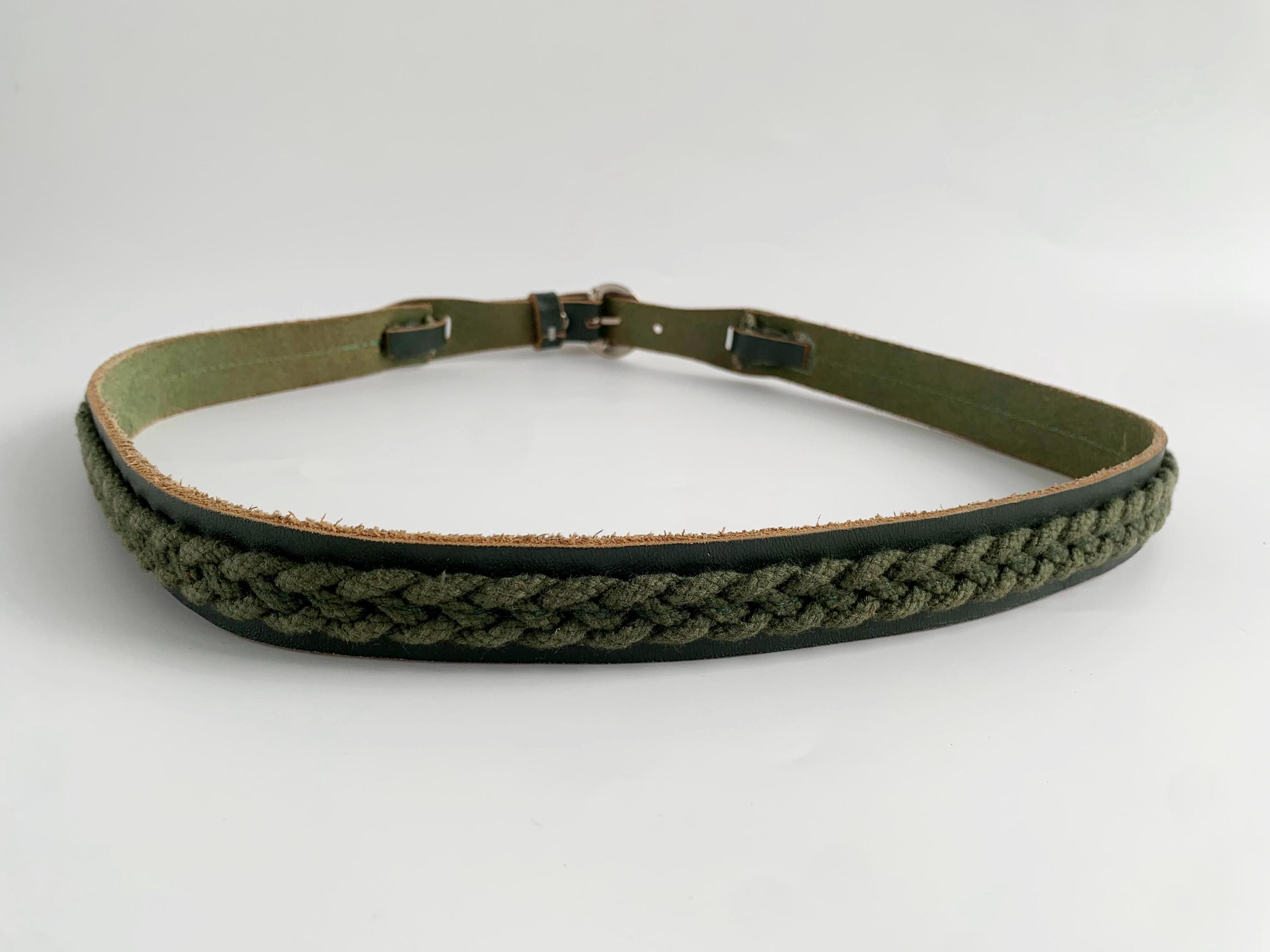 This unique vintage 80s forest green leather belt is the perfect statement leather accessory for those who love earthy tones and artisanal textures. Crafted from high-quality dark forest green leather, this braided belt features a beautiful olive green braided knit inlay that runs along the leather belt strap, creating a rich, multi-dimensional look. This slim waist belt is finished with a polished silver-tone D ring horseshoe shape buckle and decorative leather overlays that add a touch of western-boho charm.