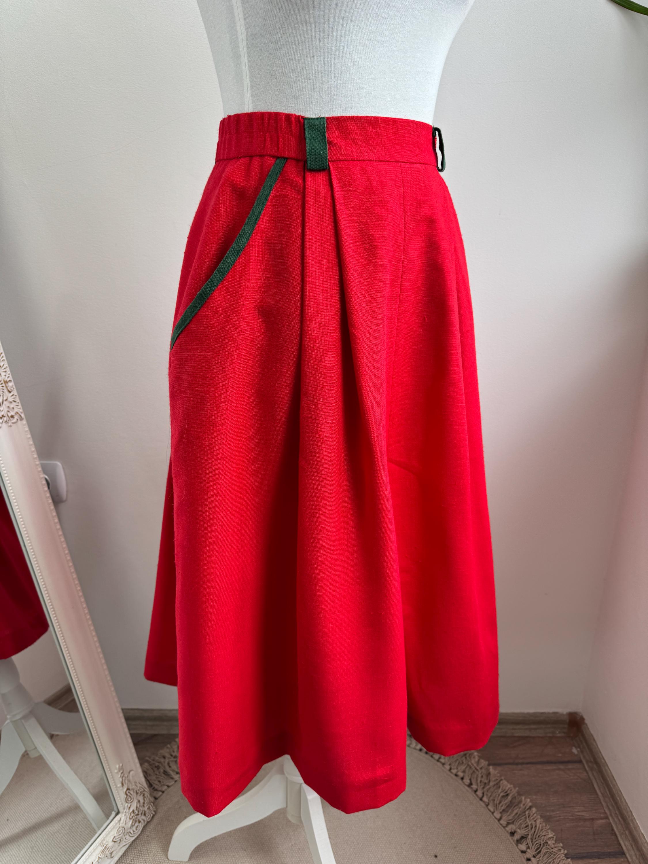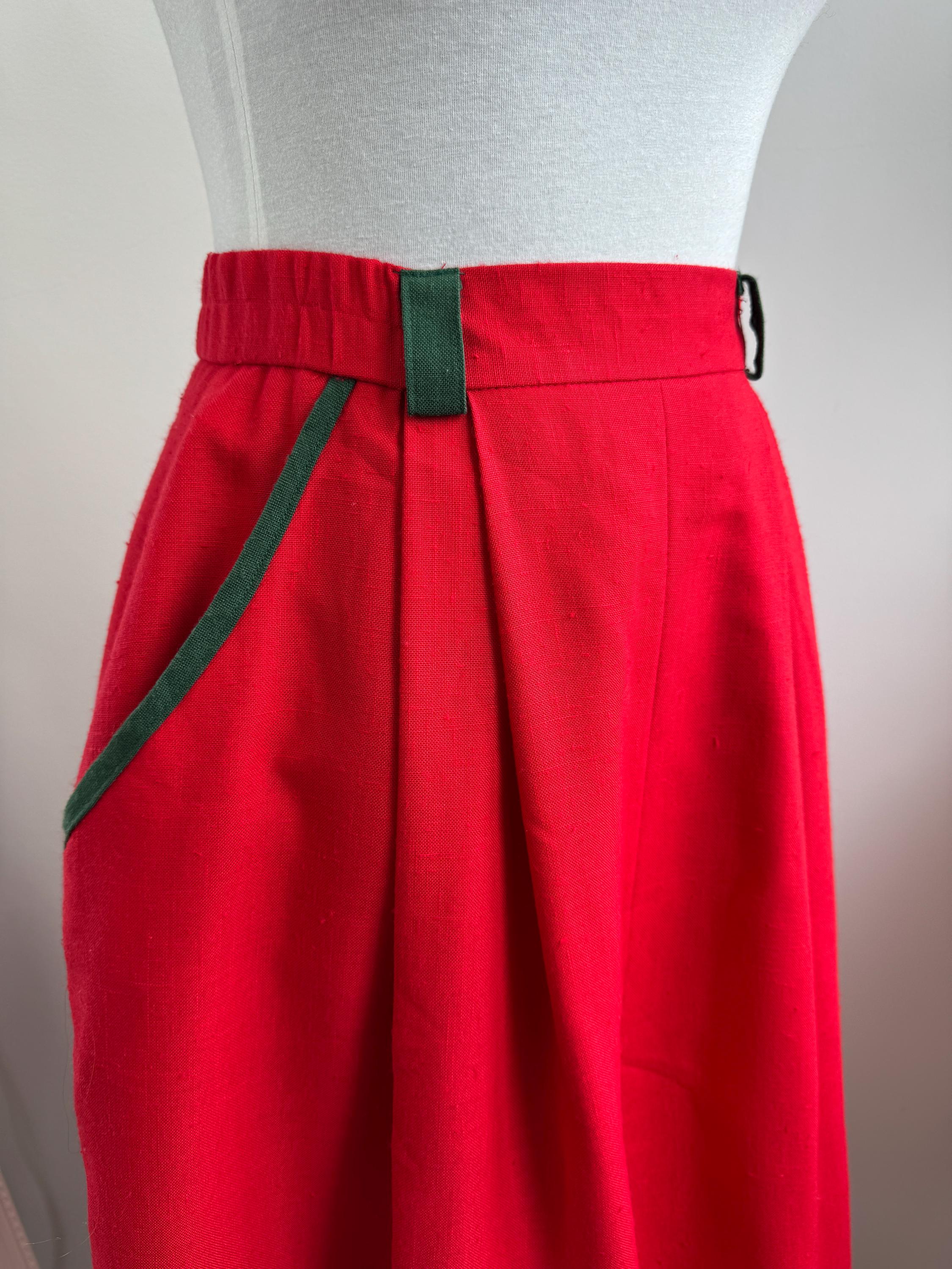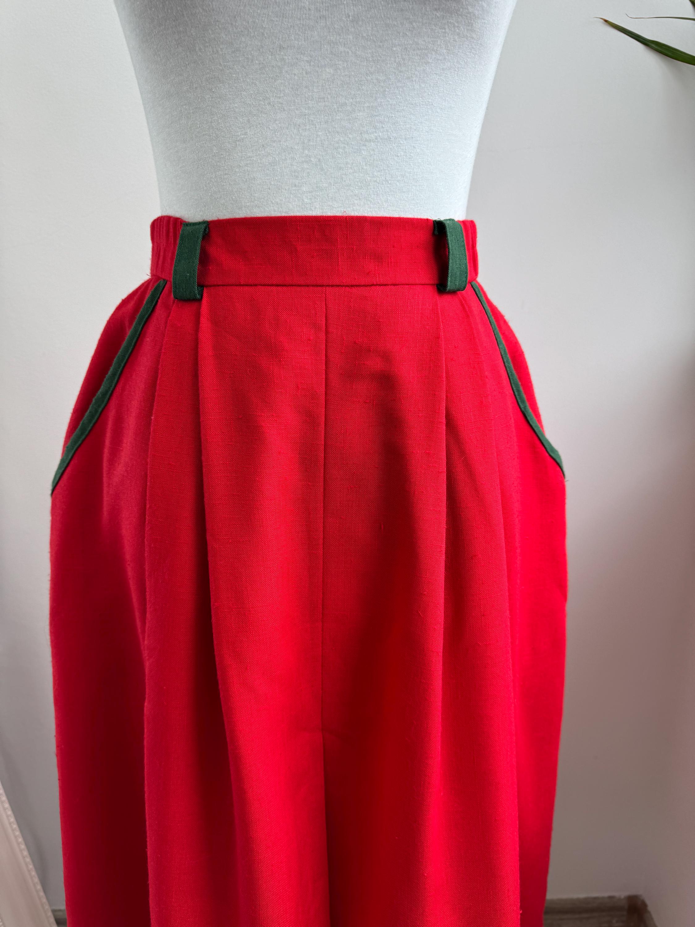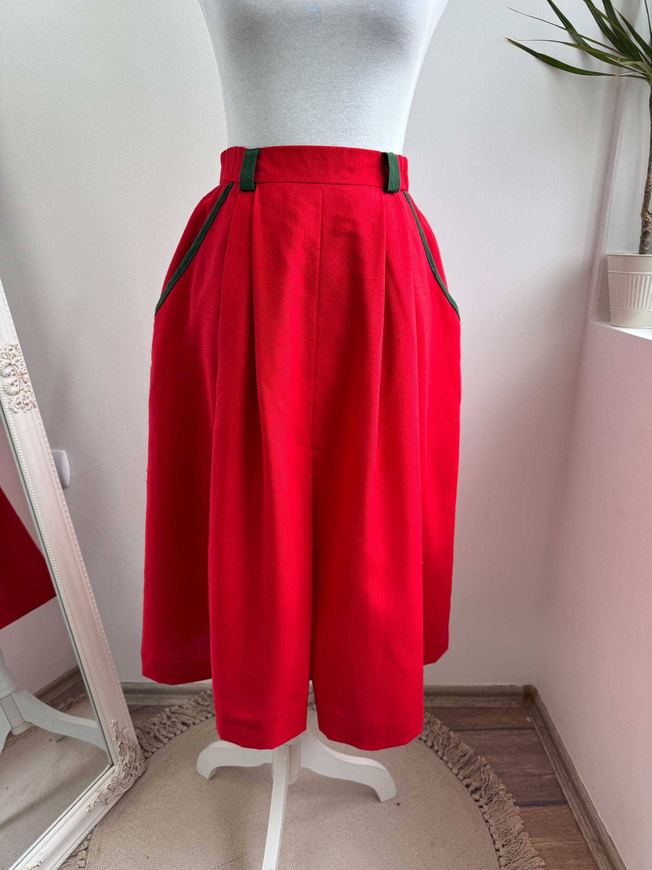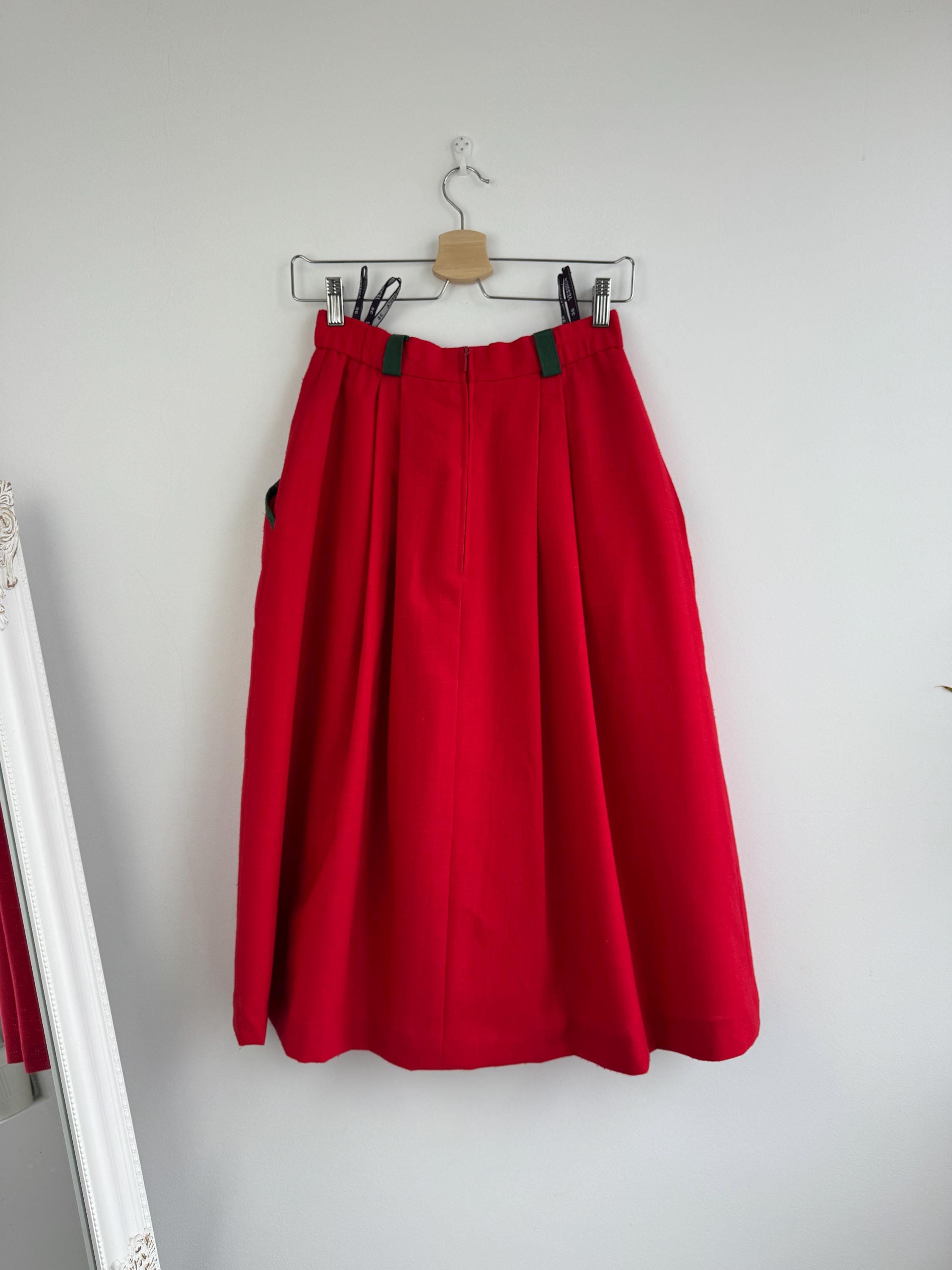 This is a stunning vintage red midi skirt with pockets and olive green accents in size EUR 36 / S. Featuring a bold, vibrant red hue, this dirndl skirt is beautifully accented with contrasting dark green trim on the pockets and belt loops, making it an ideal choice for holiday festivities, Oktoberfest or adding a pop of classic color to your year-round wardrobe.