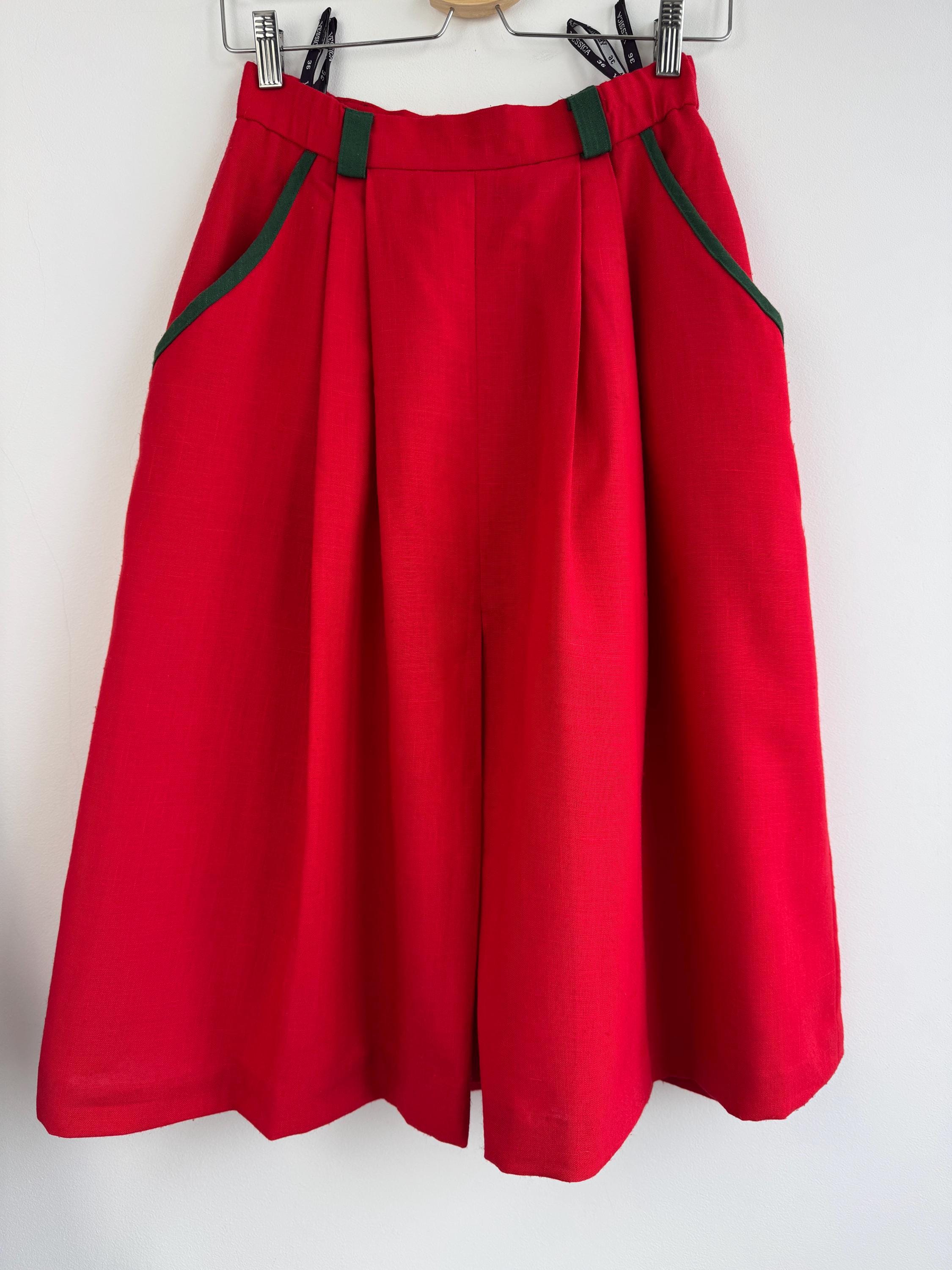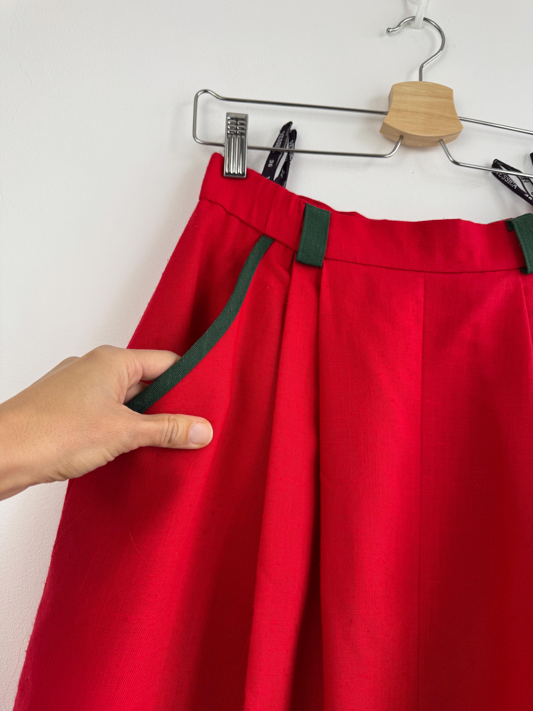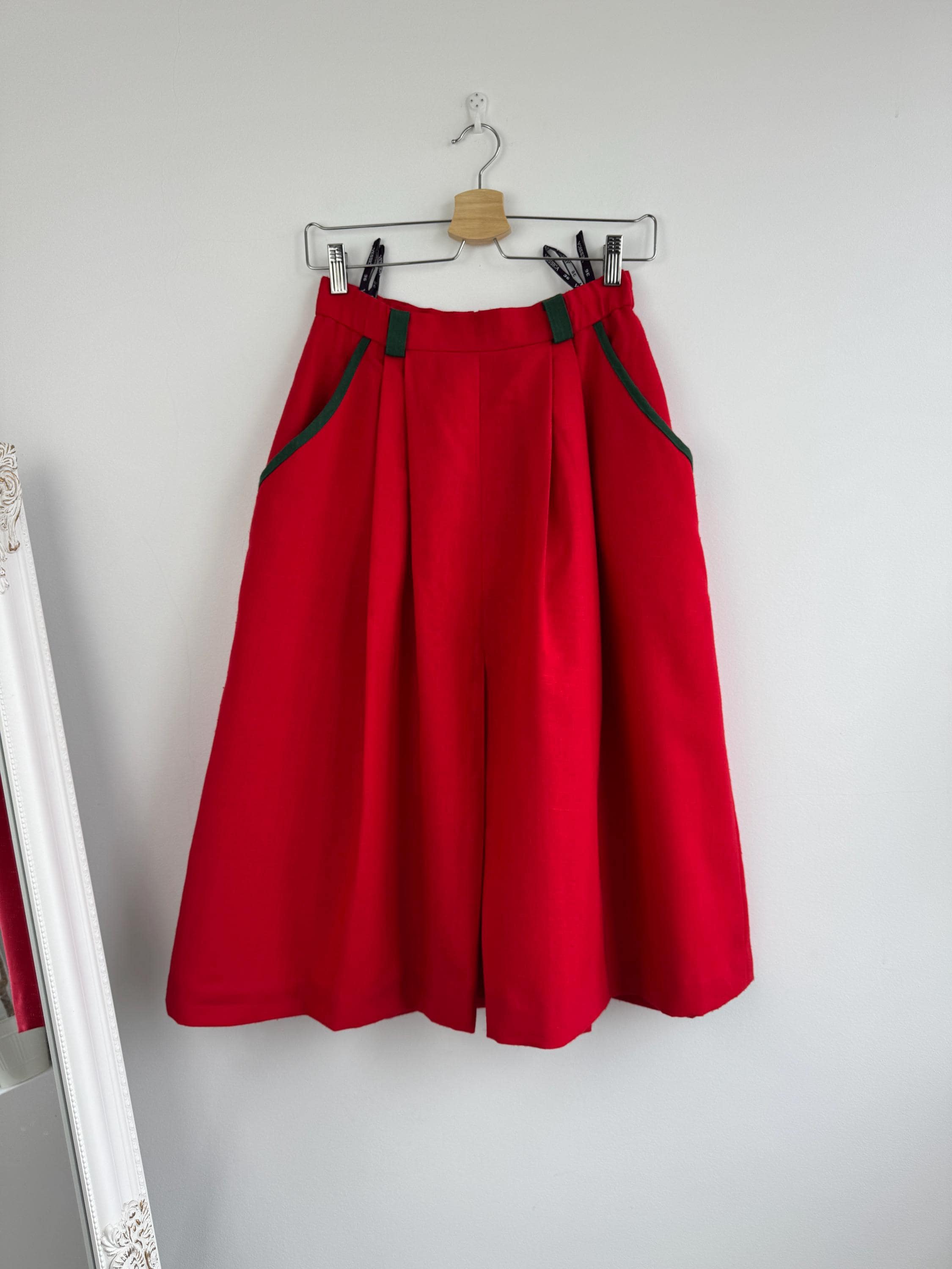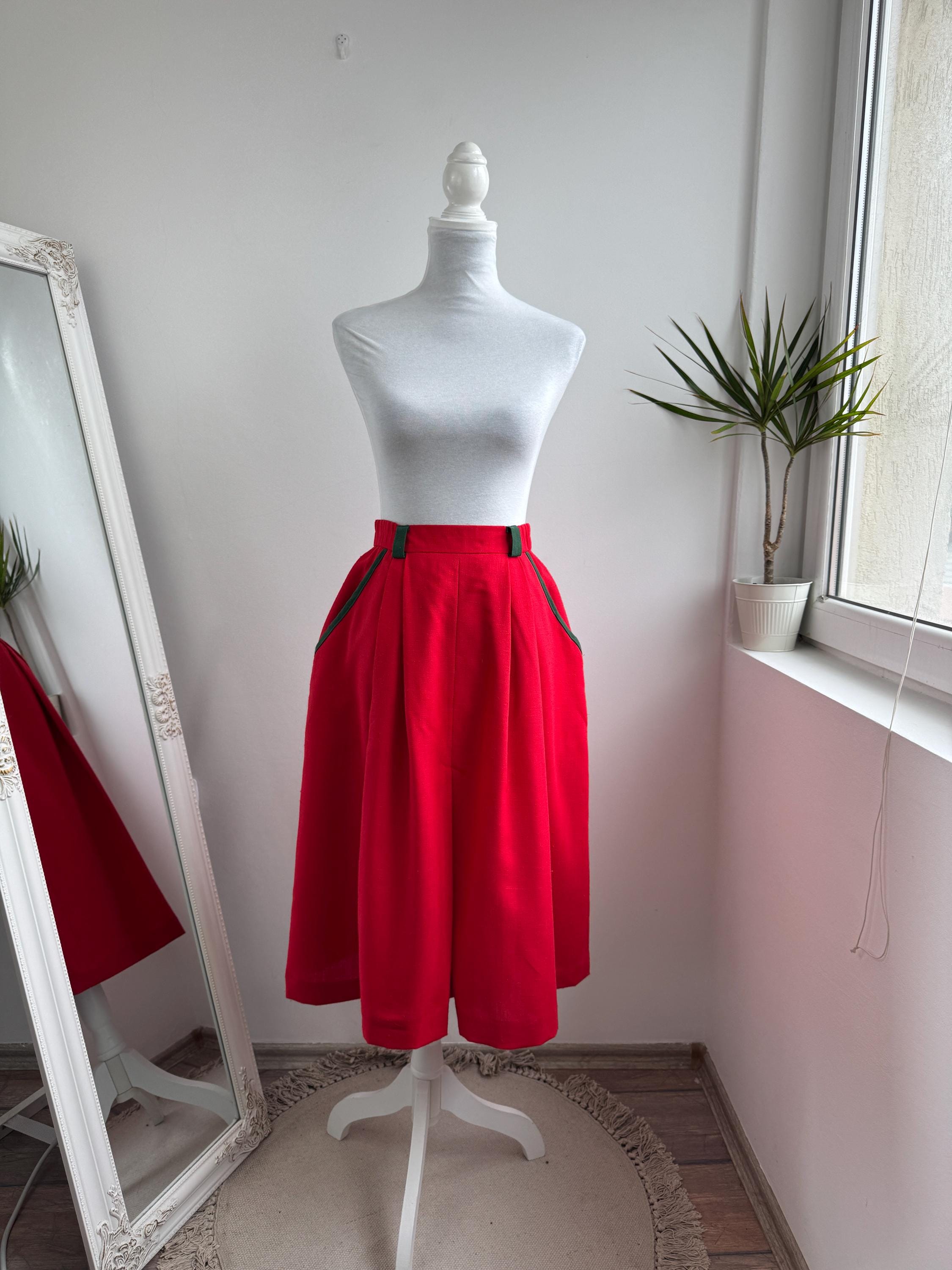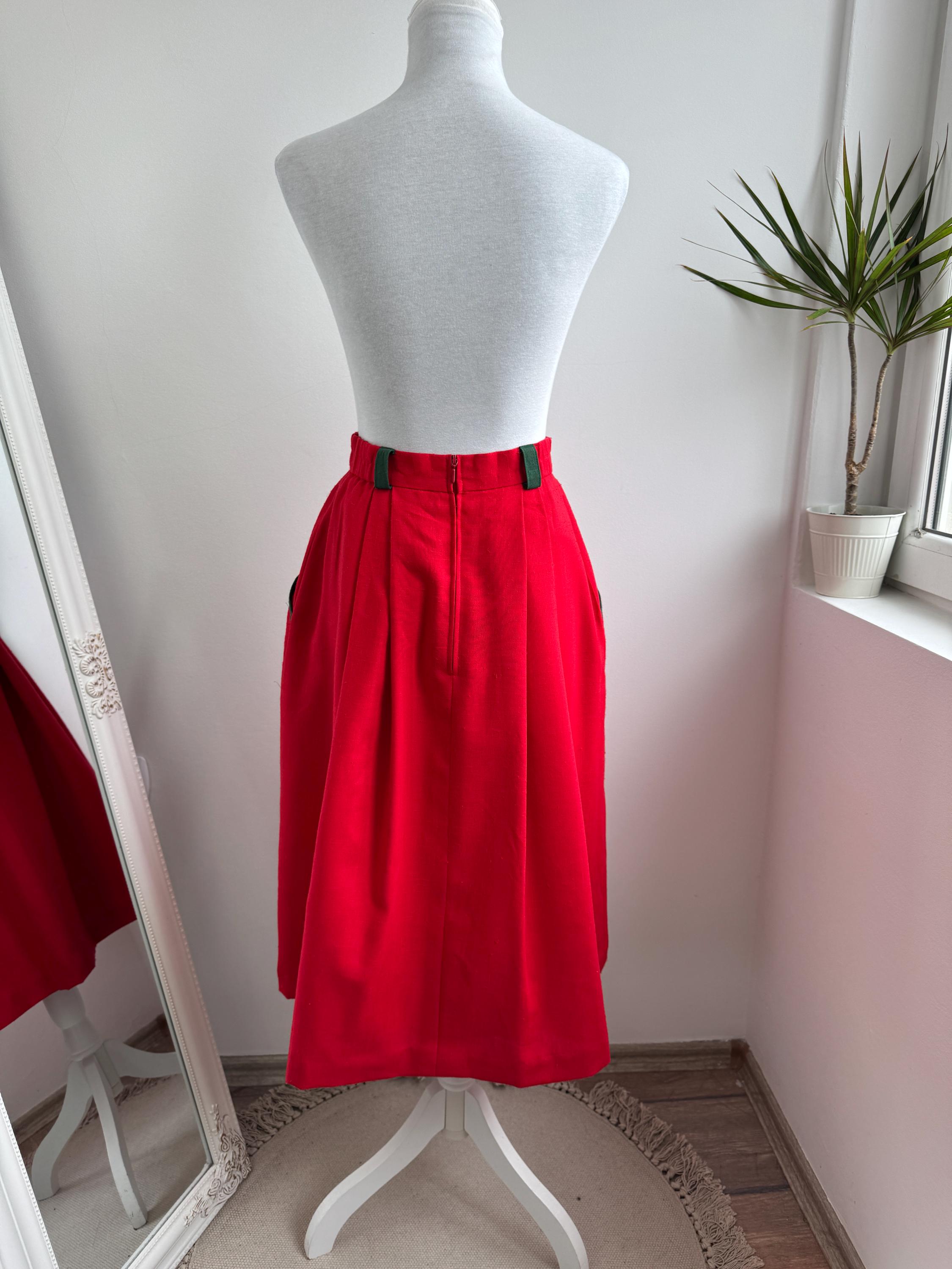 This is a stunning vintage red midi skirt with pockets and olive green accents in size EUR 36 / S. Featuring a bold, vibrant red hue, this dirndl skirt is beautifully accented with contrasting dark green trim on the pockets and belt loops, making it an ideal choice for holiday festivities, Oktoberfest or adding a pop of classic color to your year-round wardrobe.