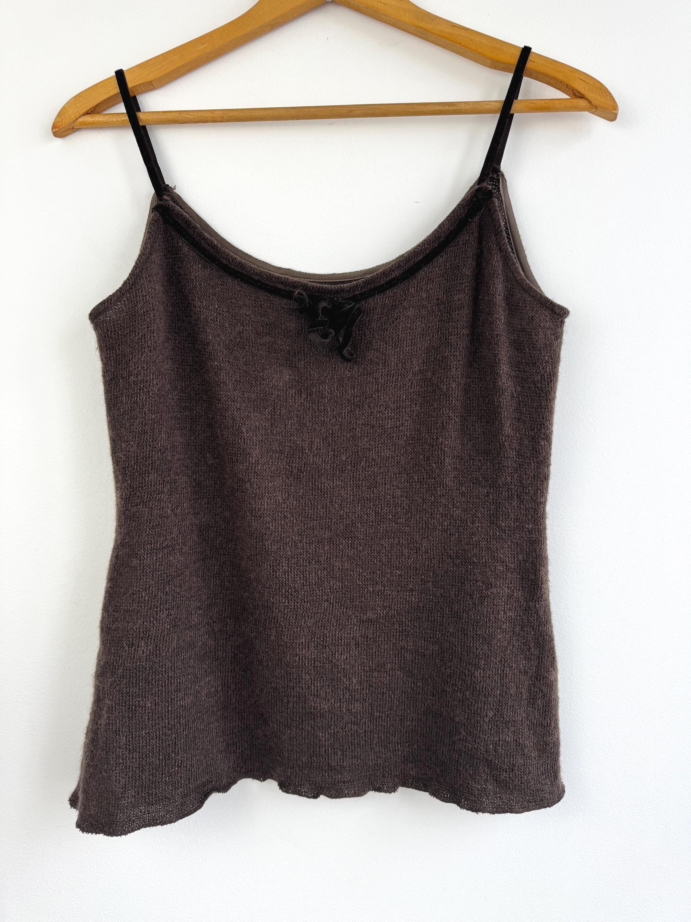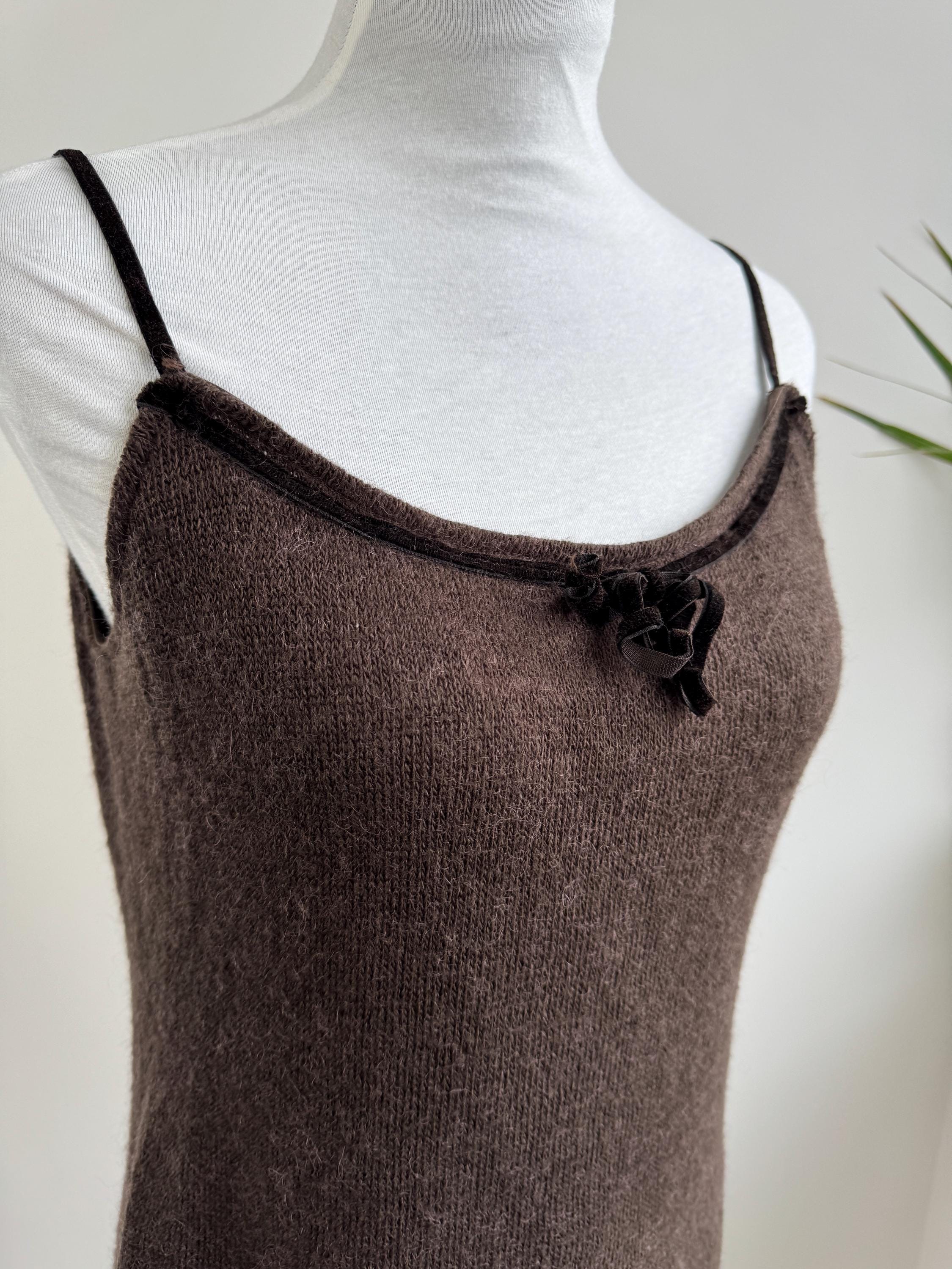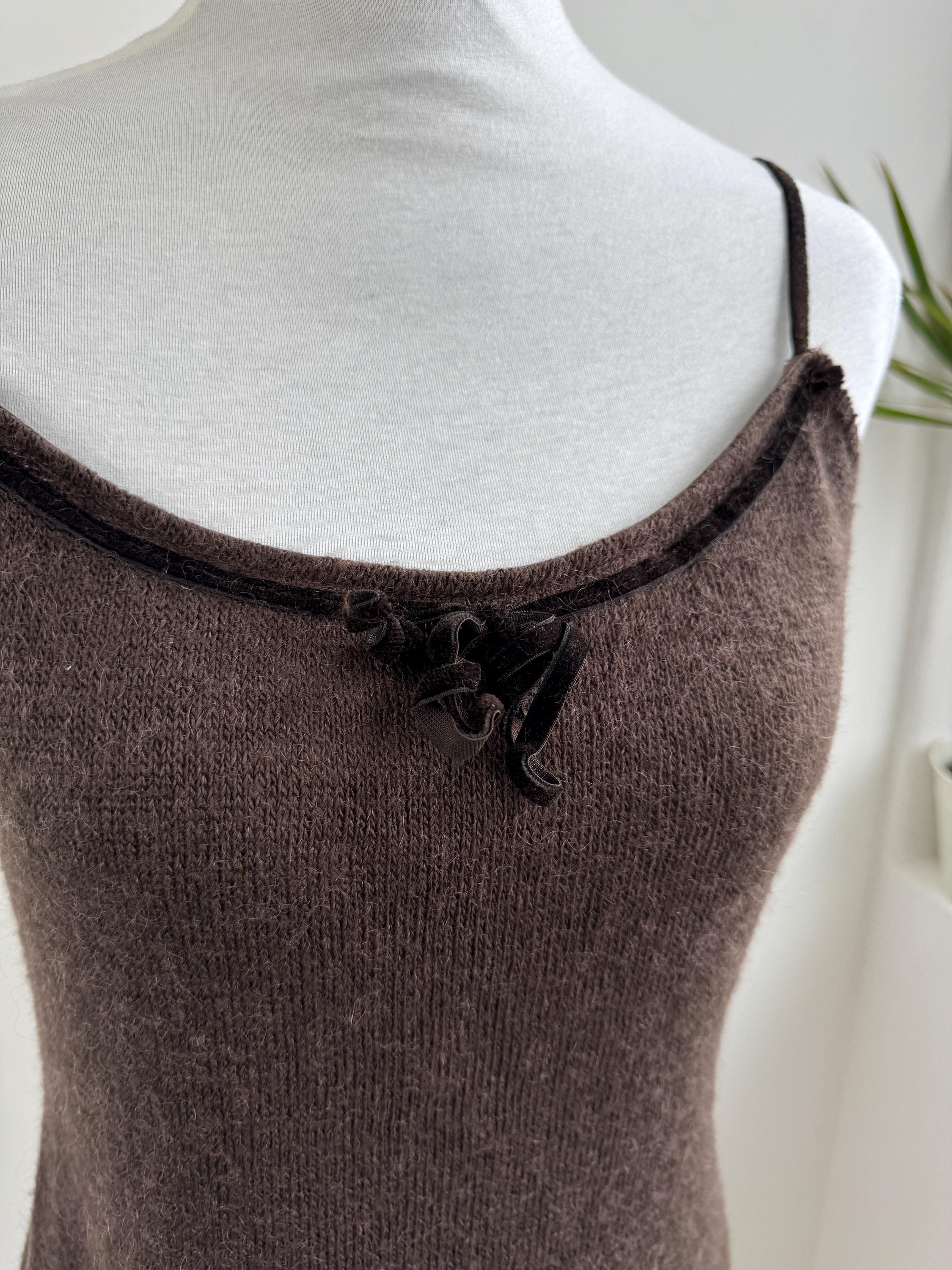 This is a vintage Italian mohair blend knit camisole top in size M. This taupe brown sleeveless top features a delicate mohair-blend yarn that provides a subtle fuzzy halo, perfect for layering or wearing as a standalone tank top. The neckline is elegantly finished with a dark velvet trim and a dainty central bow, adding a romantic, coquette-inspired touch to a classic silhouette.