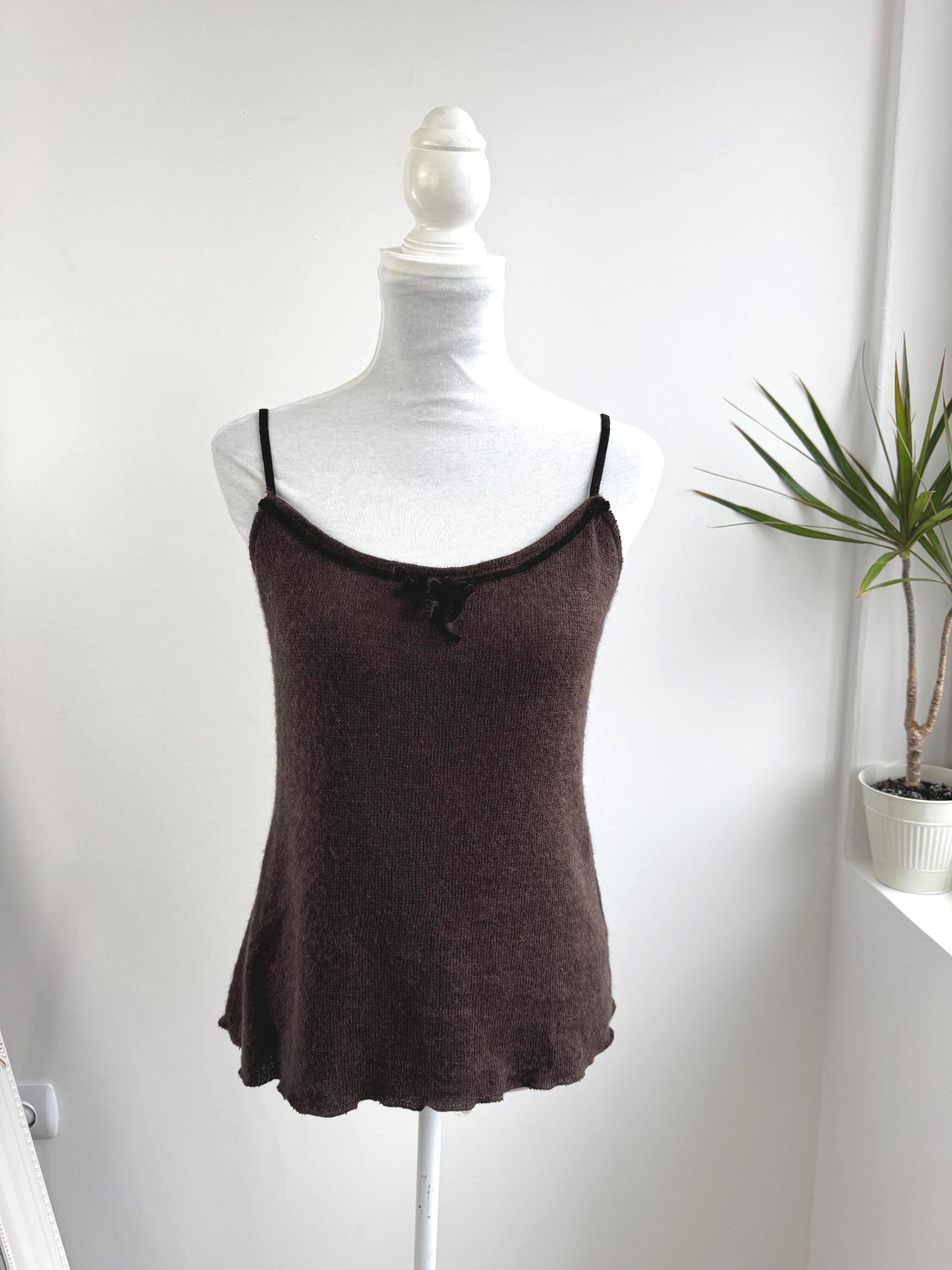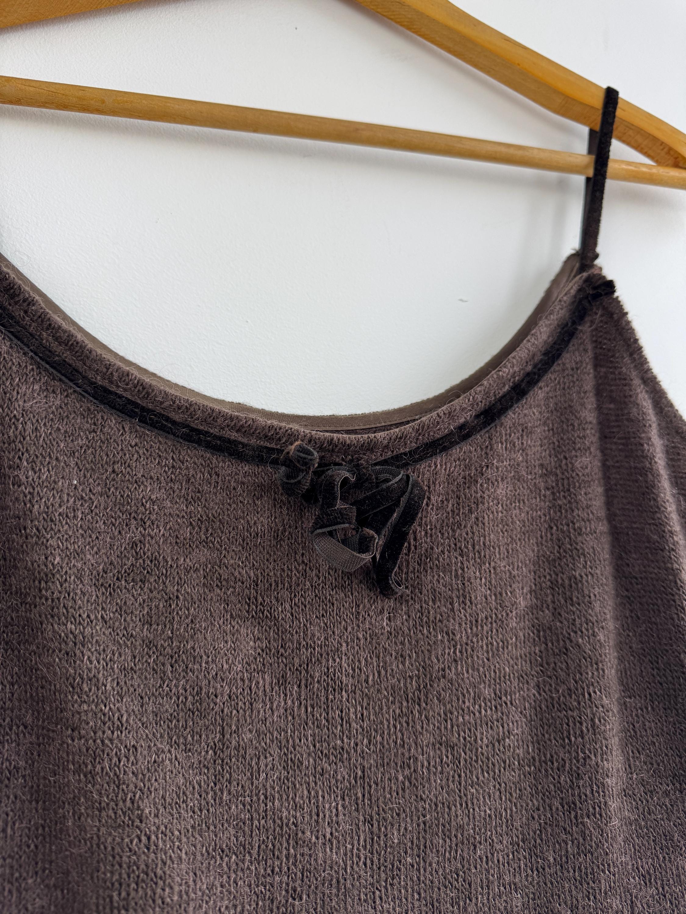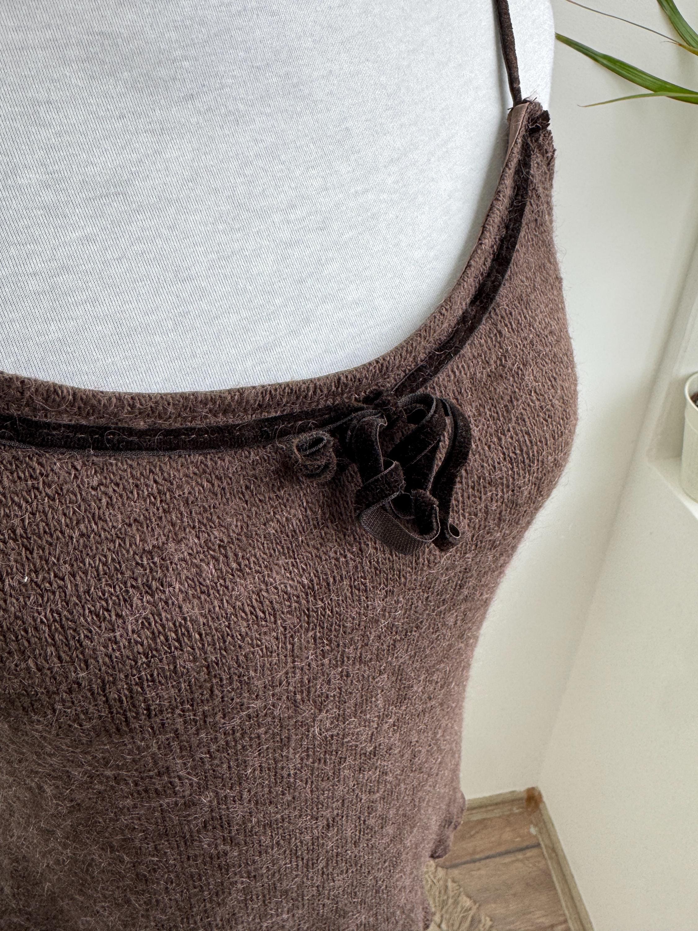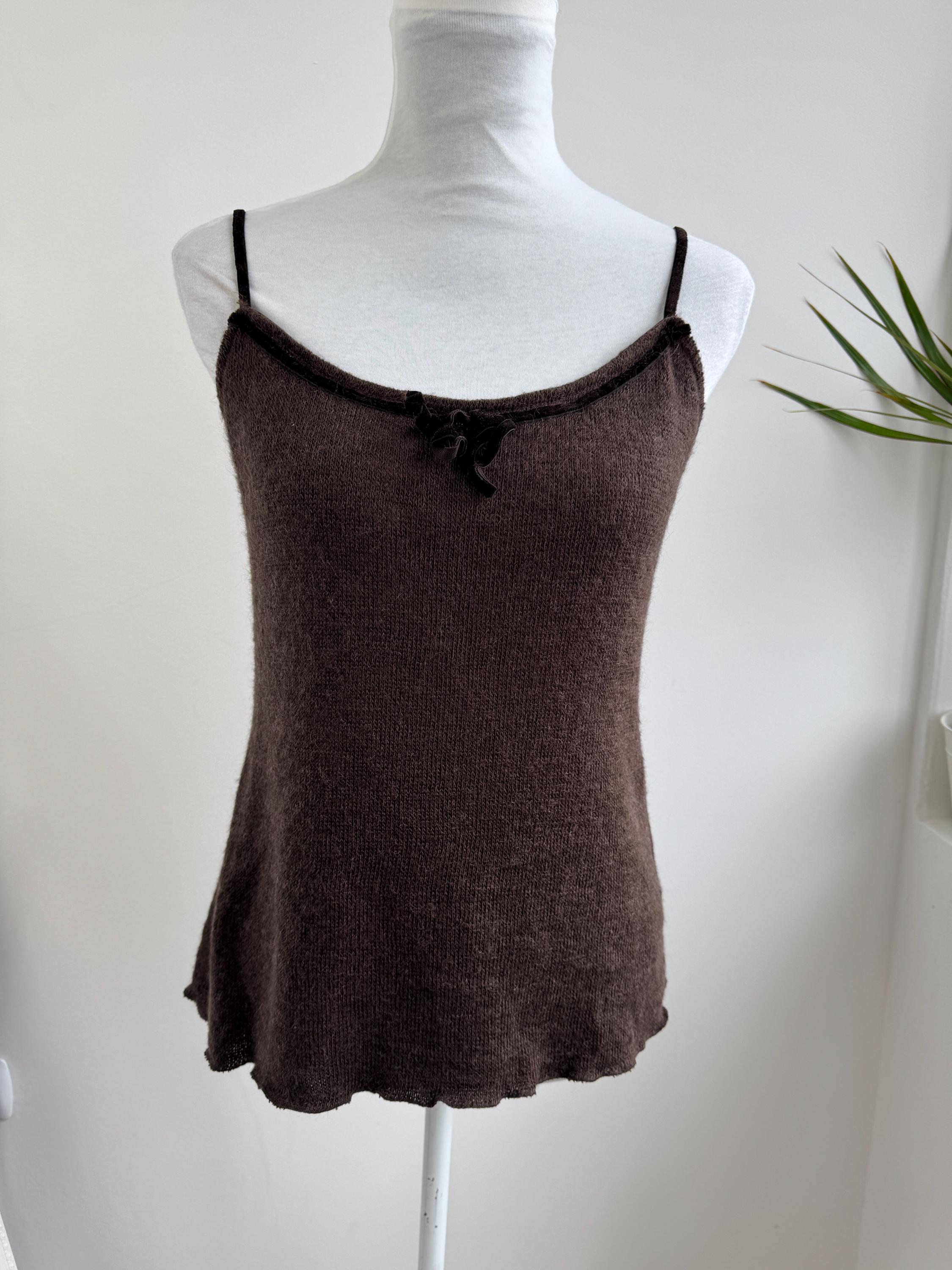 This is a vintage Italian mohair blend knit camisole top in size M. This taupe brown sleeveless top features a delicate mohair-blend yarn that provides a subtle fuzzy halo, perfect for layering or wearing as a standalone tank top. The neckline is elegantly finished with a dark velvet trim and a dainty central bow, adding a romantic, coquette-inspired touch to a classic silhouette.