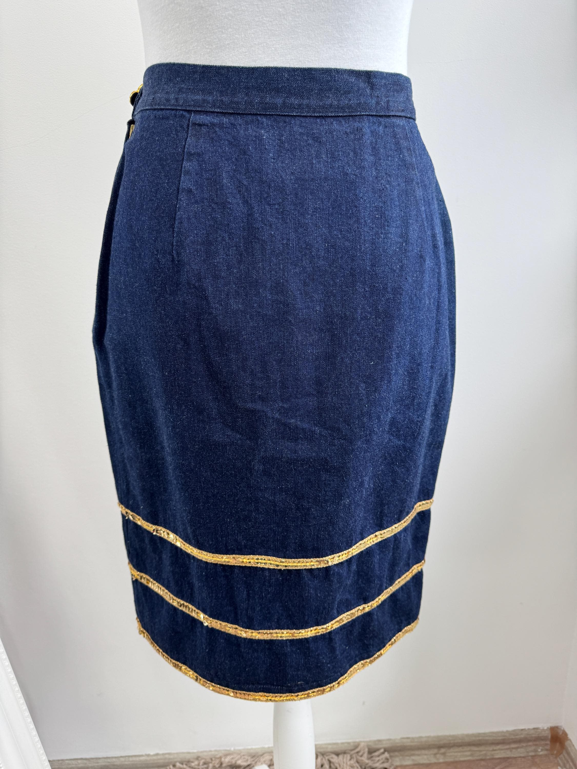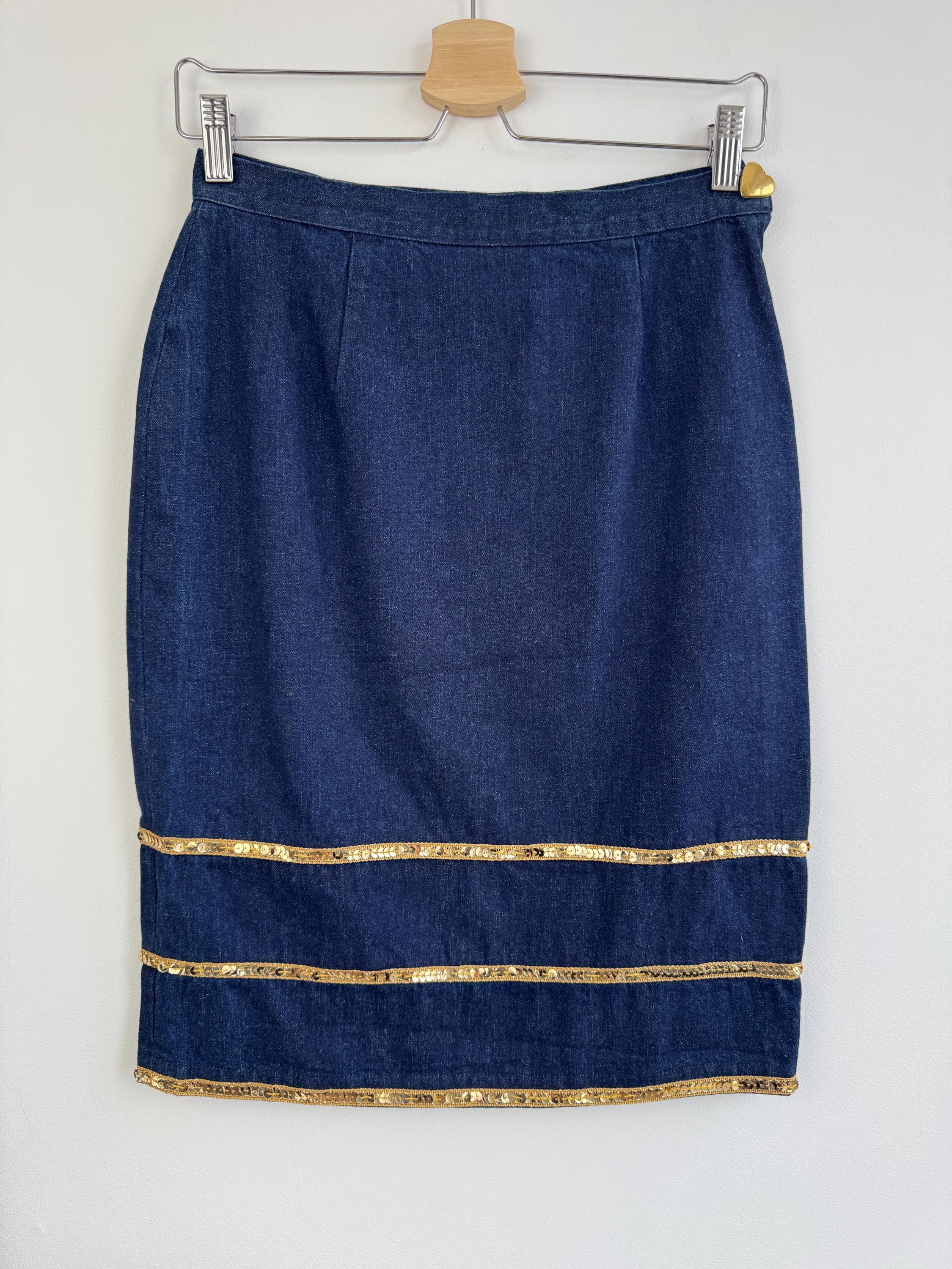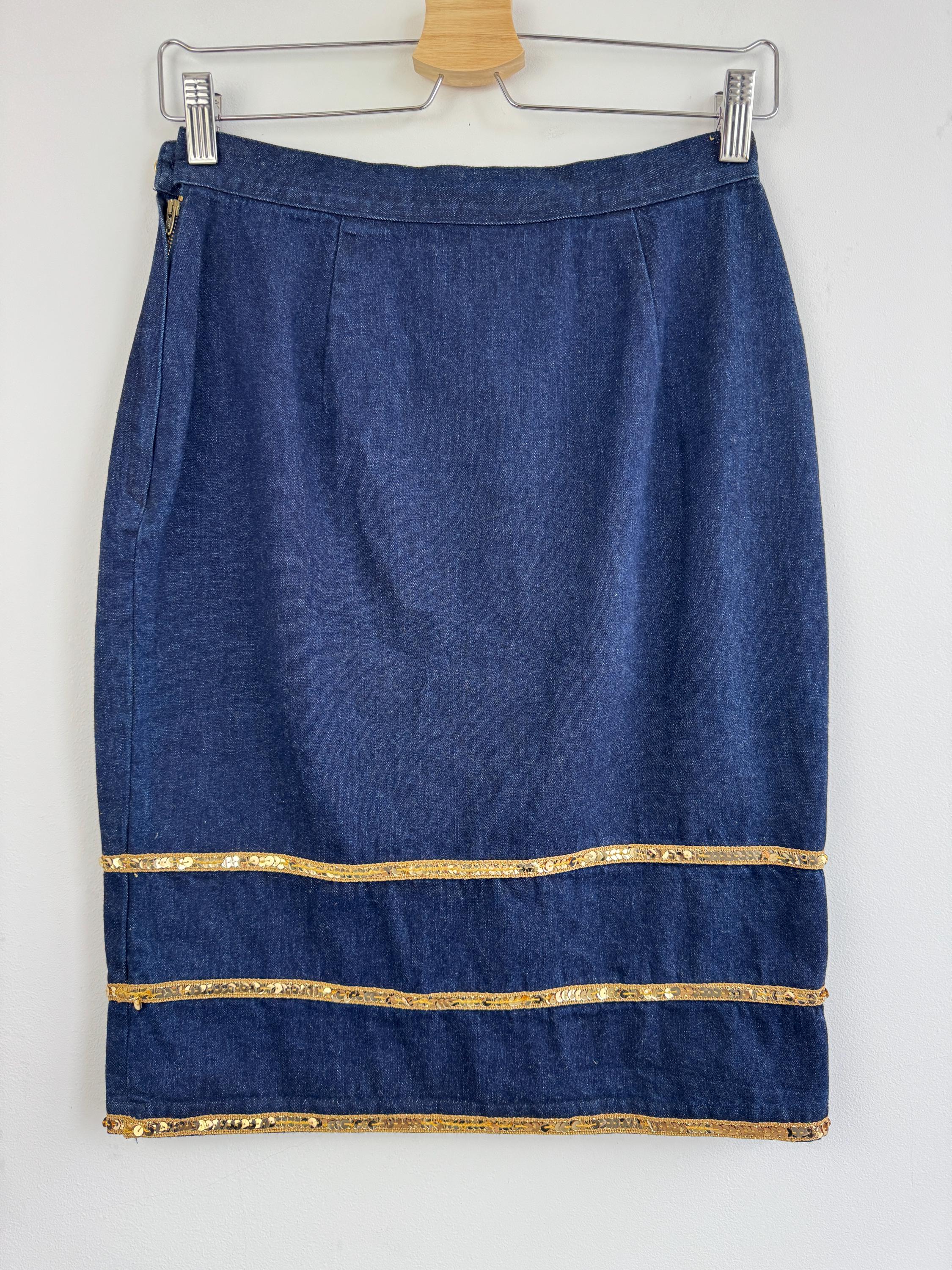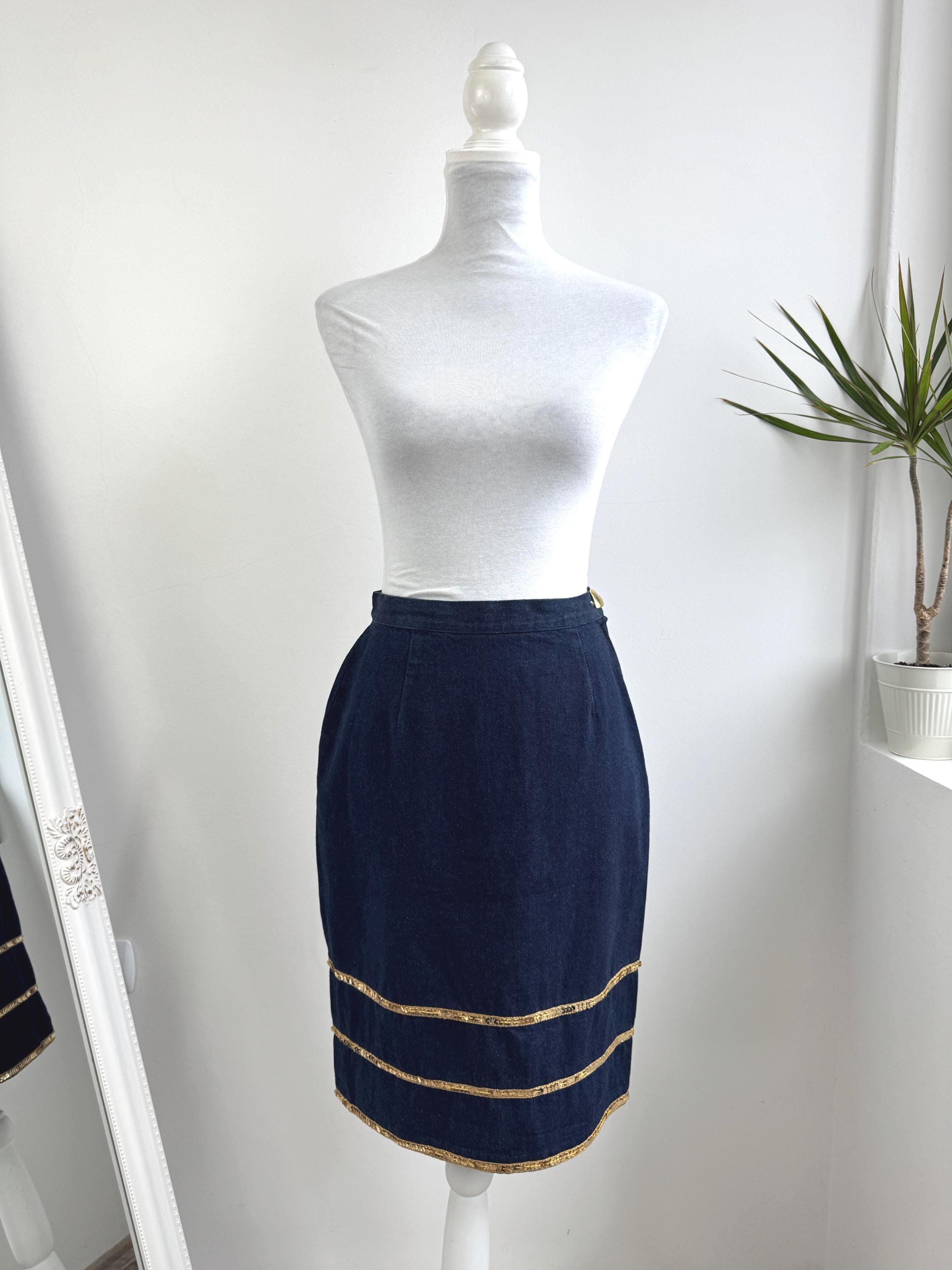 This is a vintage Italian Cristina Santandrea denim pencil skirt in size IT 42, which fits like size S. This dark blue denim skirt perfectly blends rugged dark wash denim with a touch of high-fashion glamour. This Italian designer jean skirt features three parallel bands of shimmering gold sequins near the hem, adding a festive, eye-catching detail that transitions easily from day to night.
