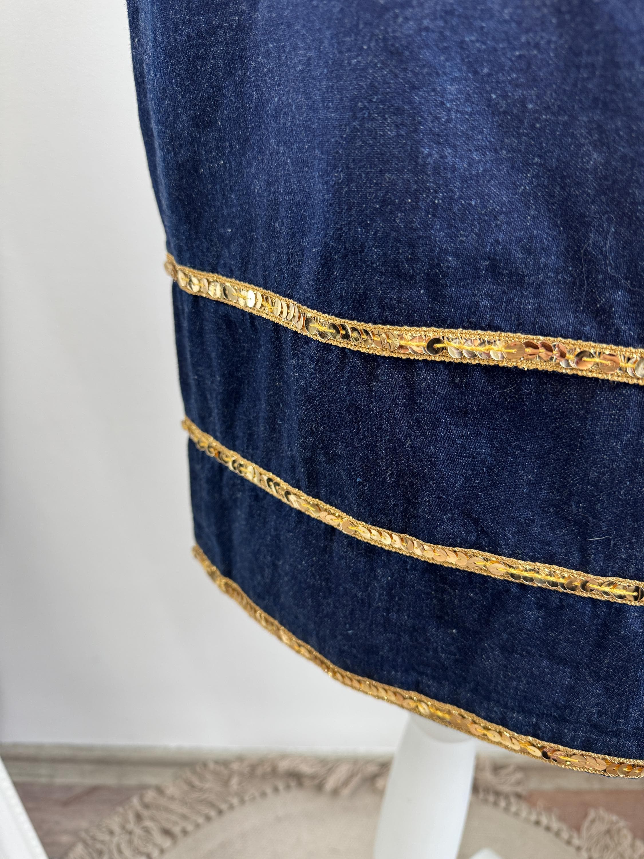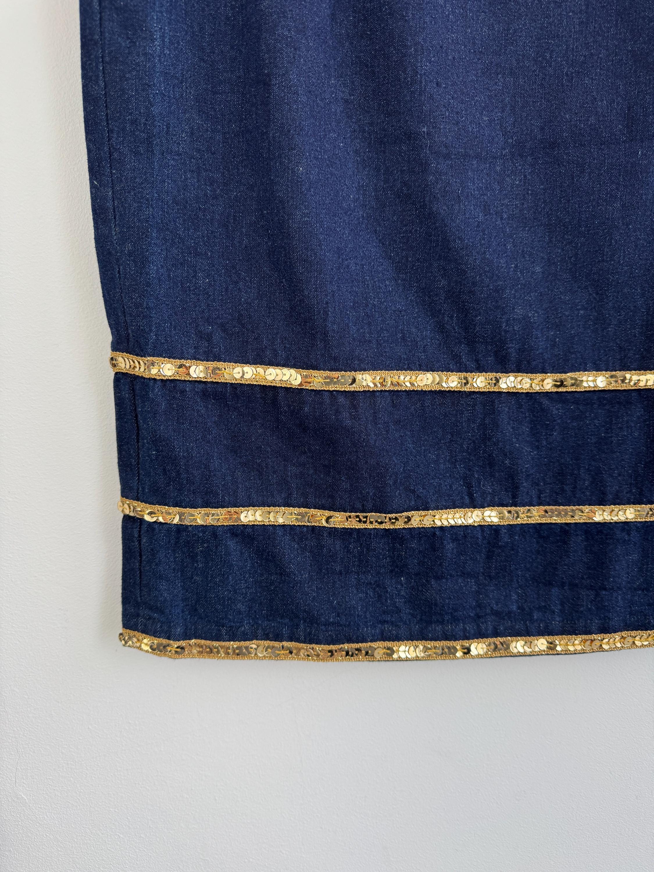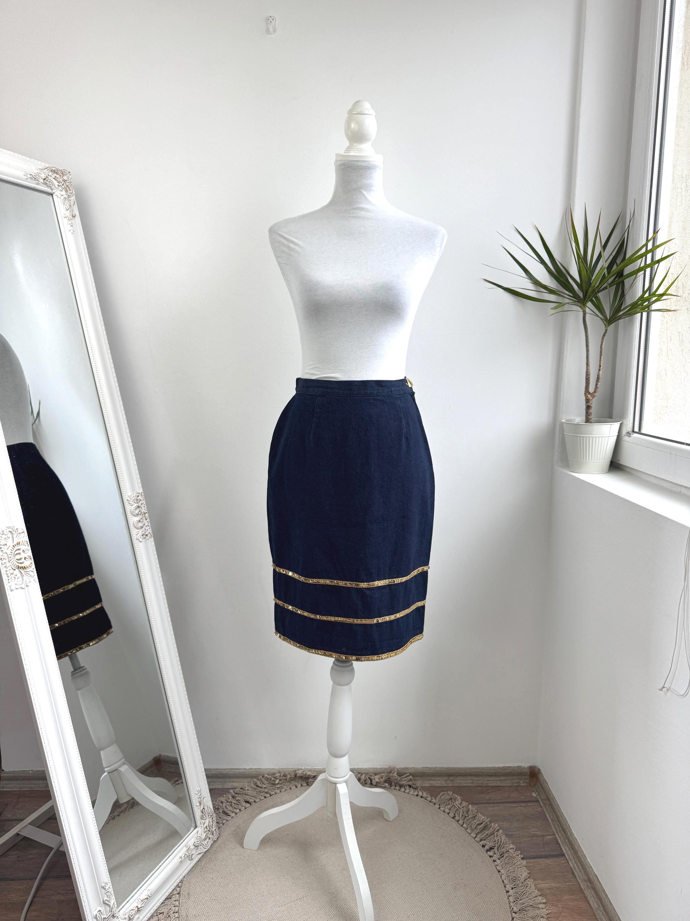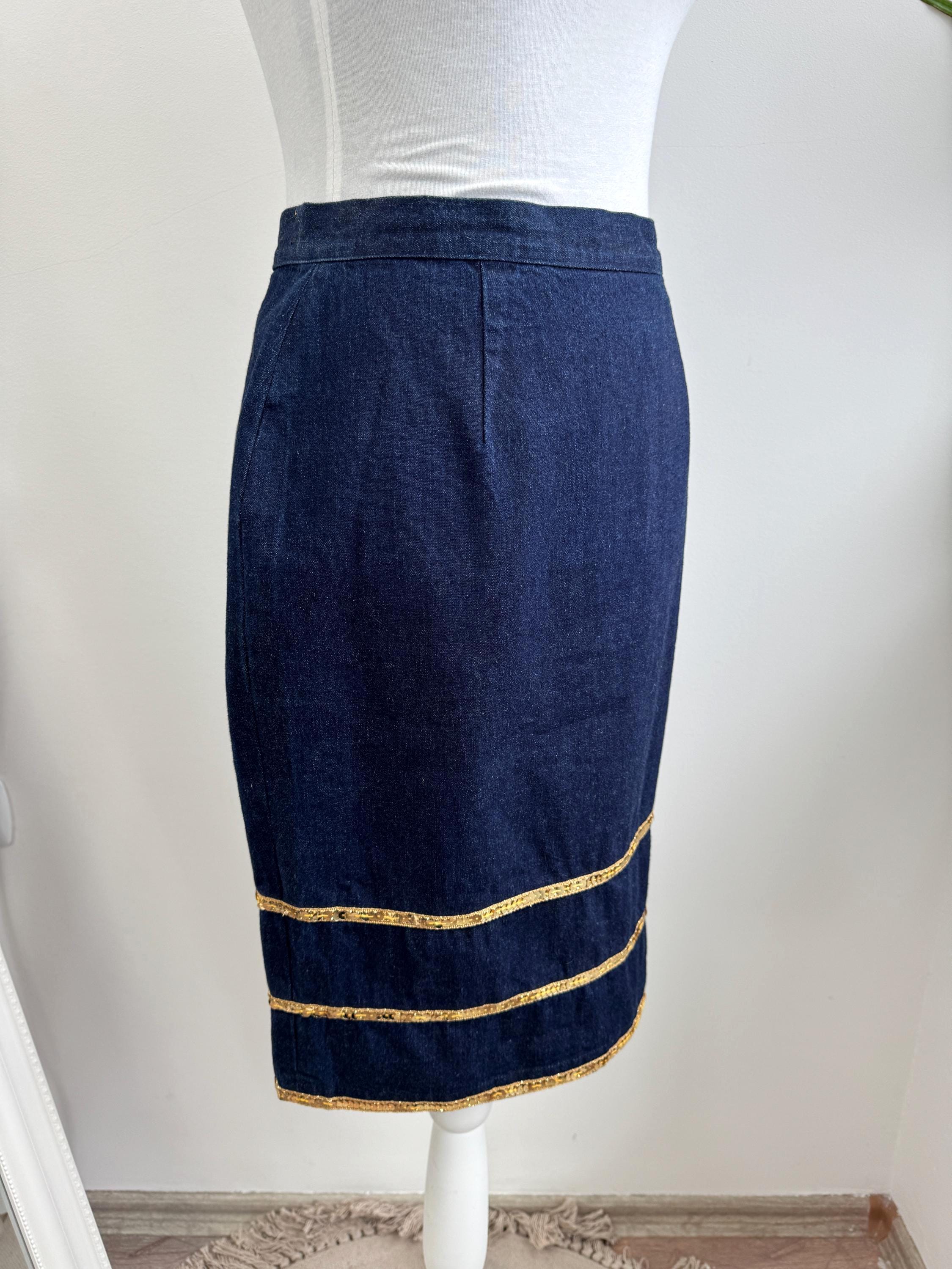 This is a vintage Italian Cristina Santandrea denim pencil skirt in size IT 42, which fits like size S. This dark blue denim skirt perfectly blends rugged dark wash denim with a touch of high-fashion glamour. This Italian designer jean skirt features three parallel bands of shimmering gold sequins near the hem, adding a festive, eye-catching detail that transitions easily from day to night.