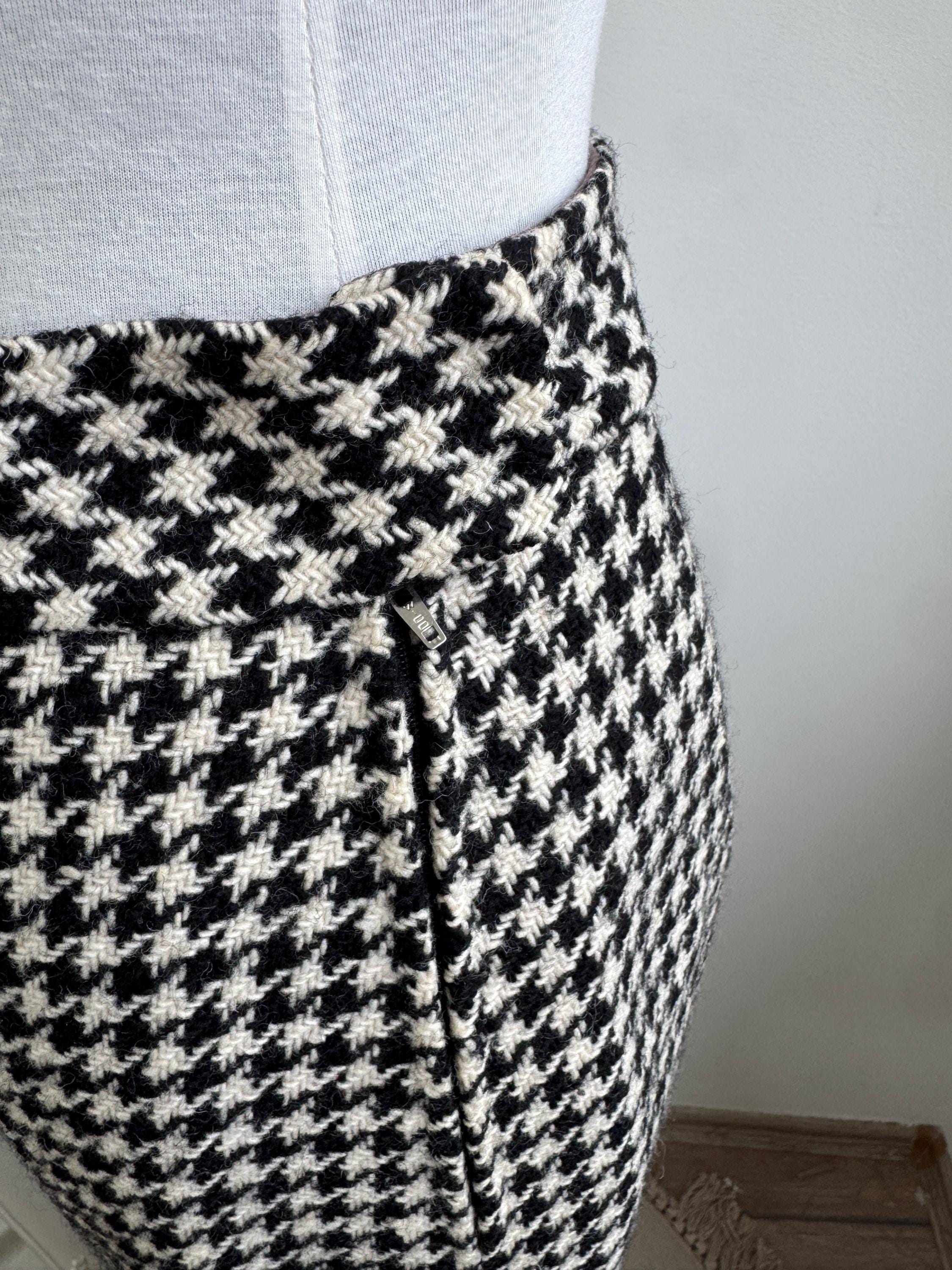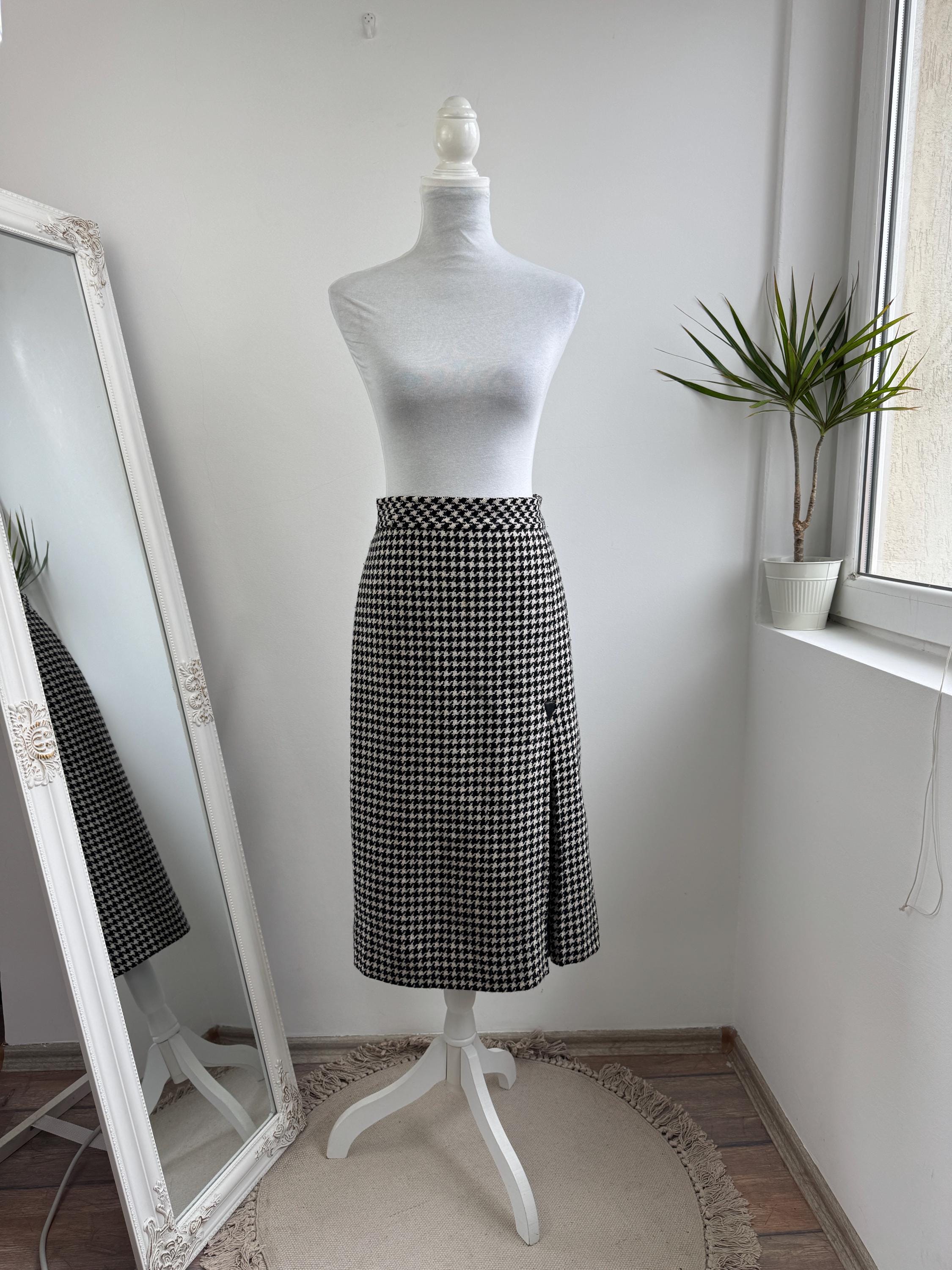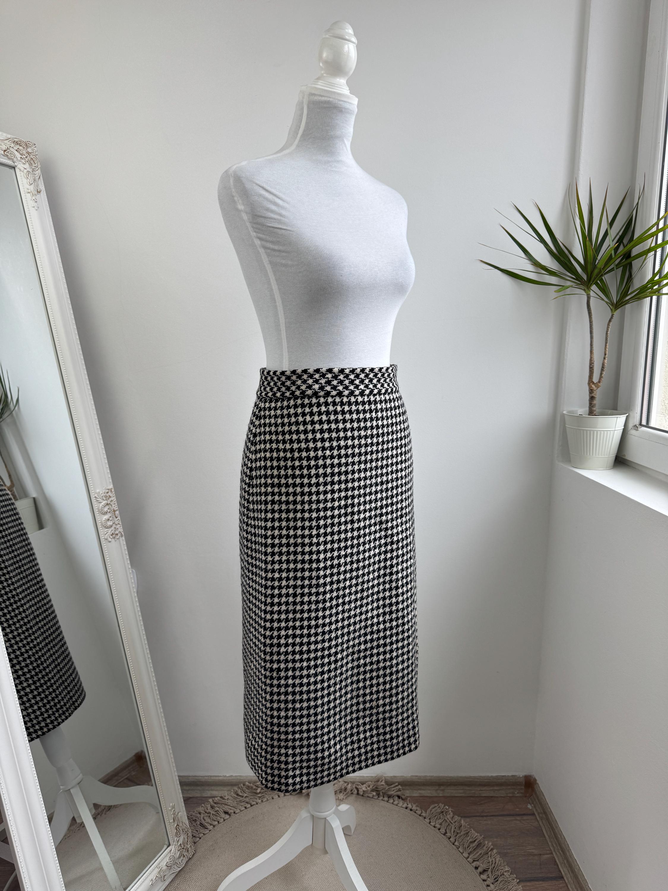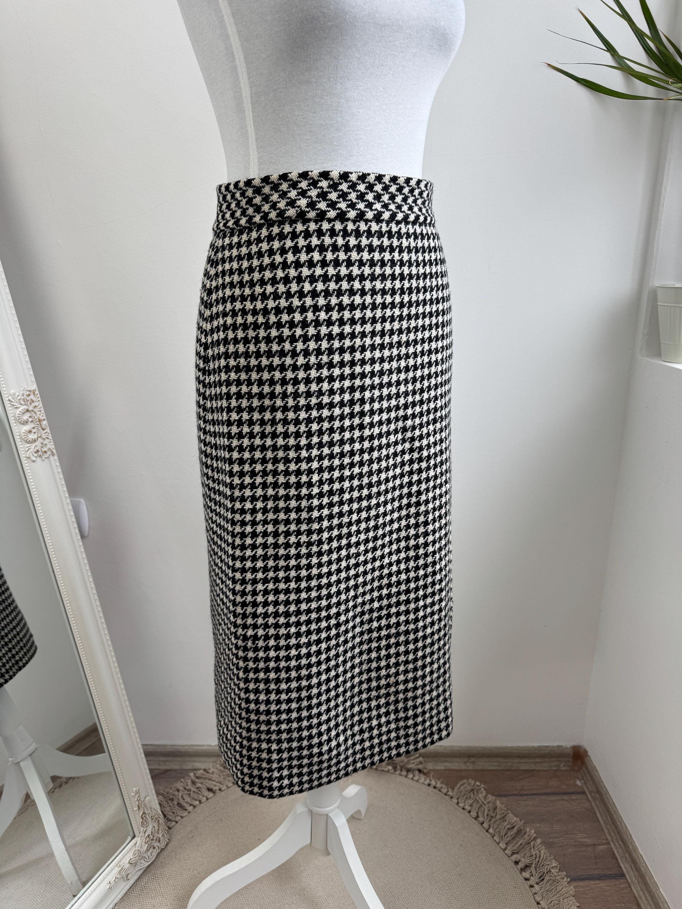 This is a timeless vintage houndstooth midi skirt made of thick wool fabric with lining in size S. Crafted from a substantial wool fabric in a classic black and cream houndstooth weave, this pencil midi skirt offers a sophisticated silhouette that transitions perfectly from the office to a weekend gallery visit.