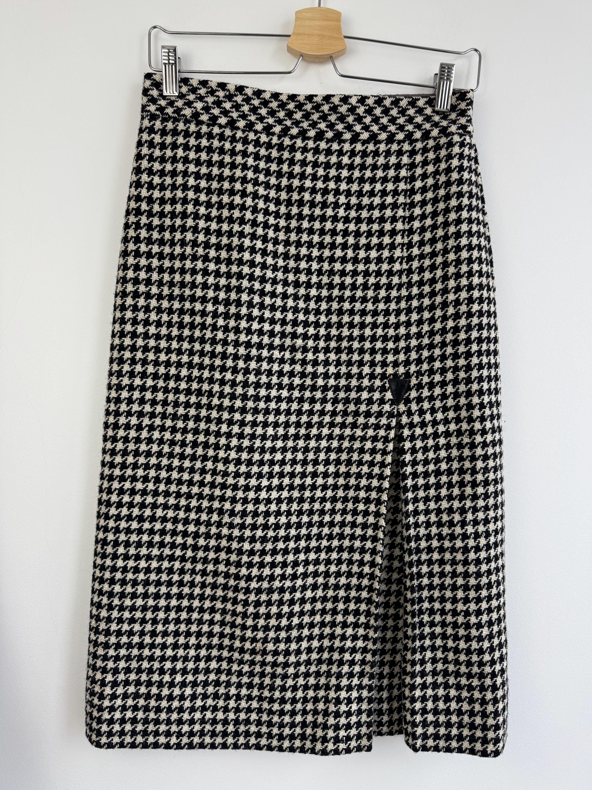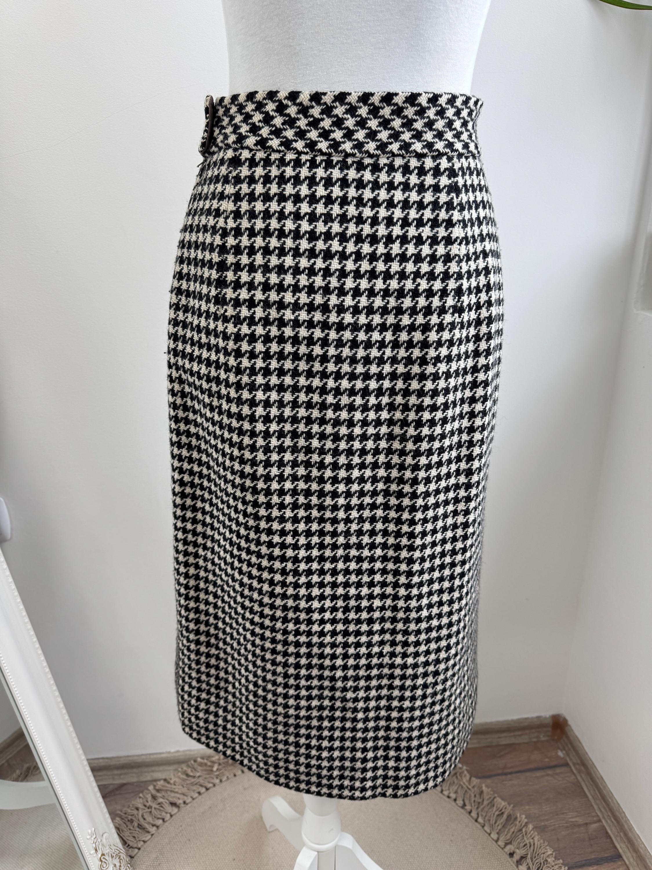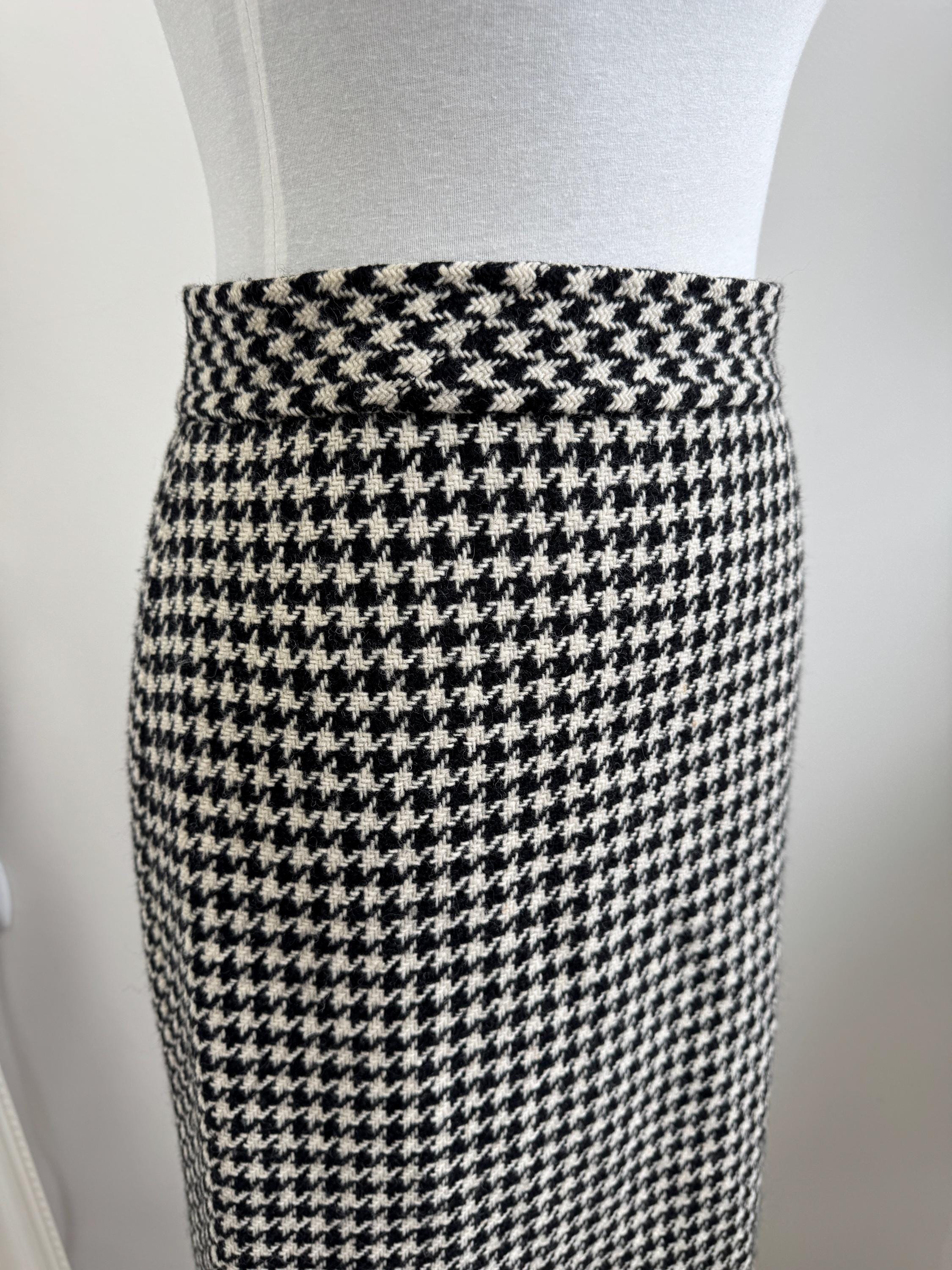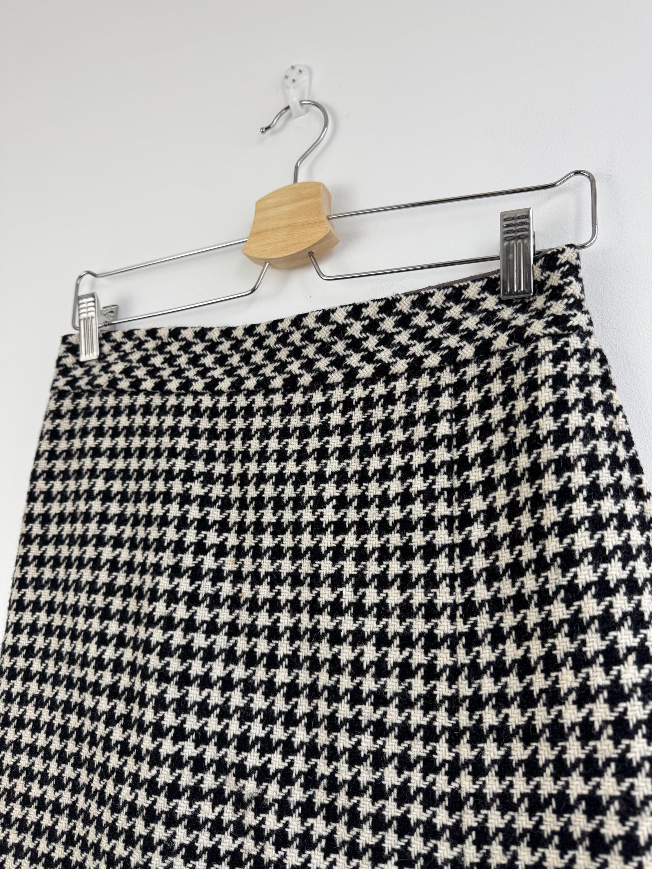 This is a timeless vintage houndstooth midi skirt made of thick wool fabric with lining in size S. Crafted from a substantial wool fabric in a classic black and cream houndstooth weave, this pencil midi skirt offers a sophisticated silhouette that transitions perfectly from the office to a weekend gallery visit.
