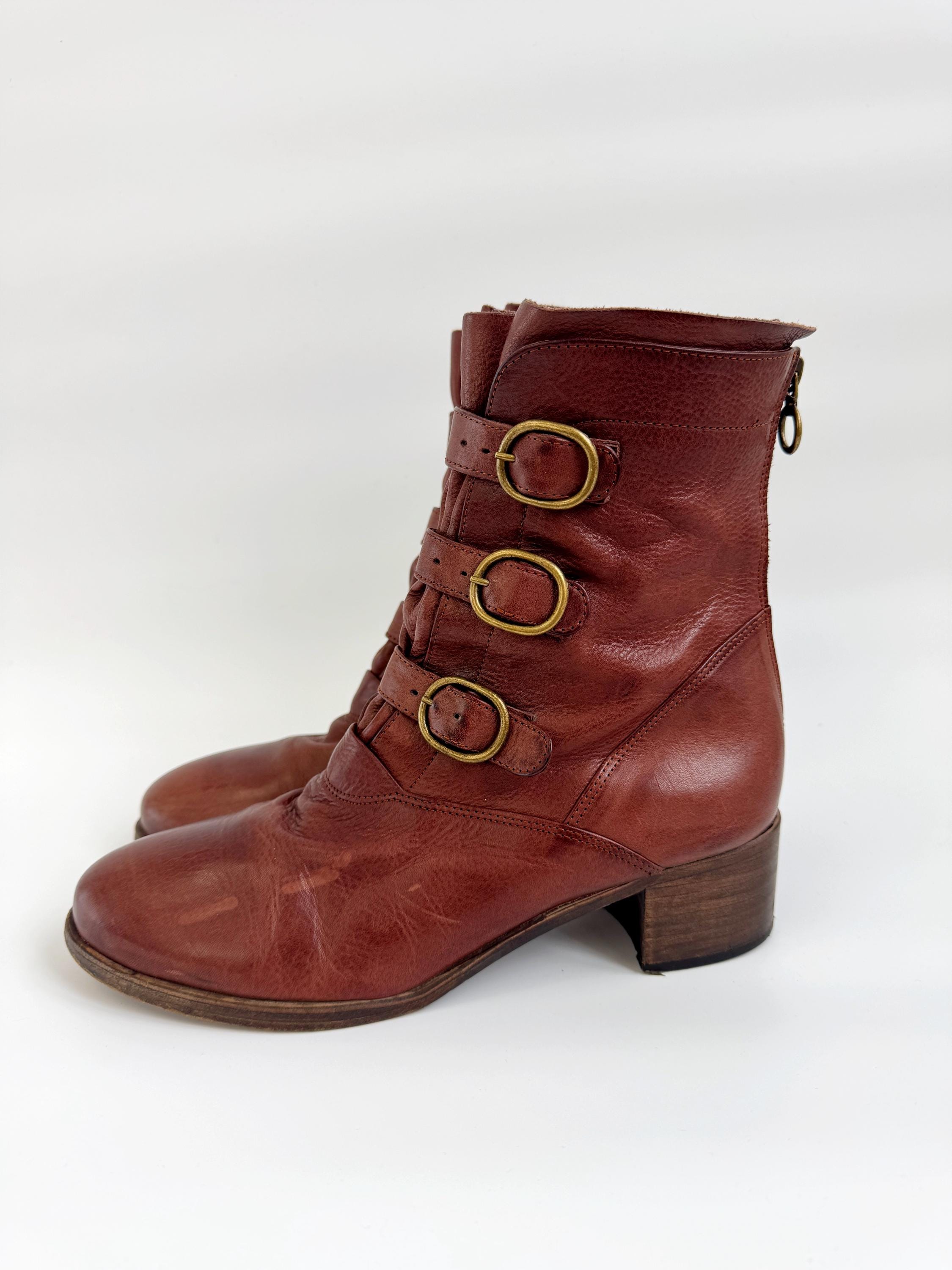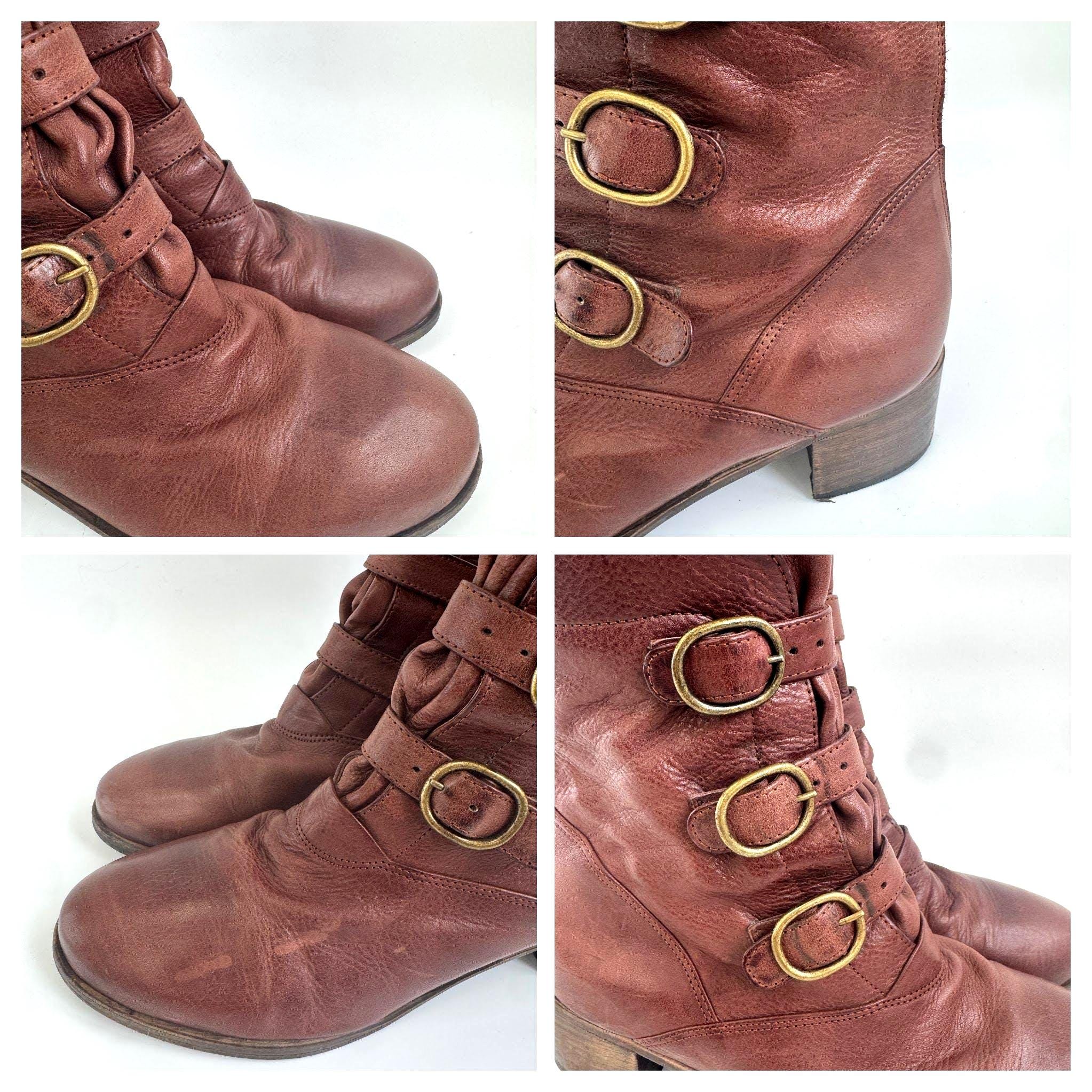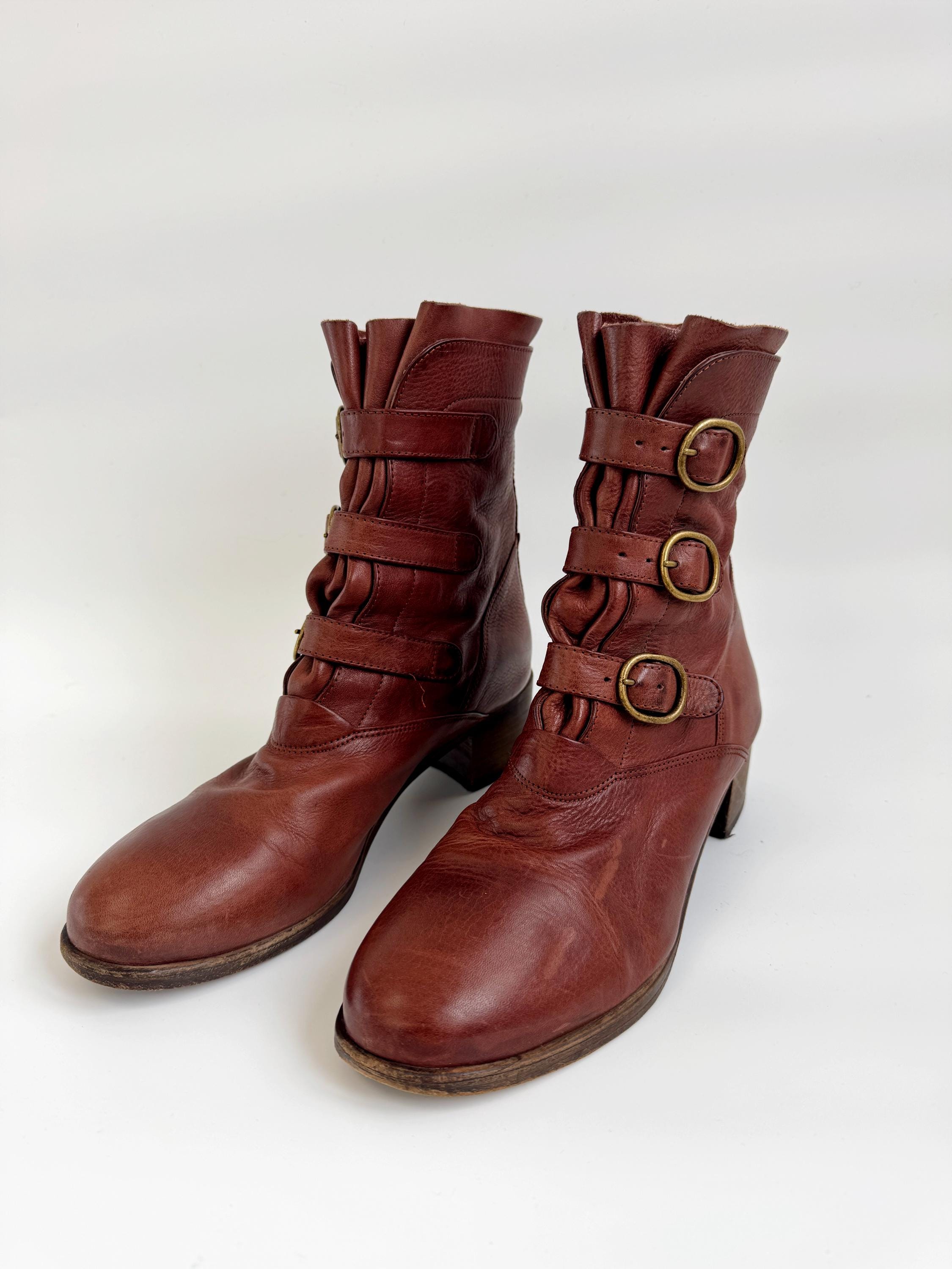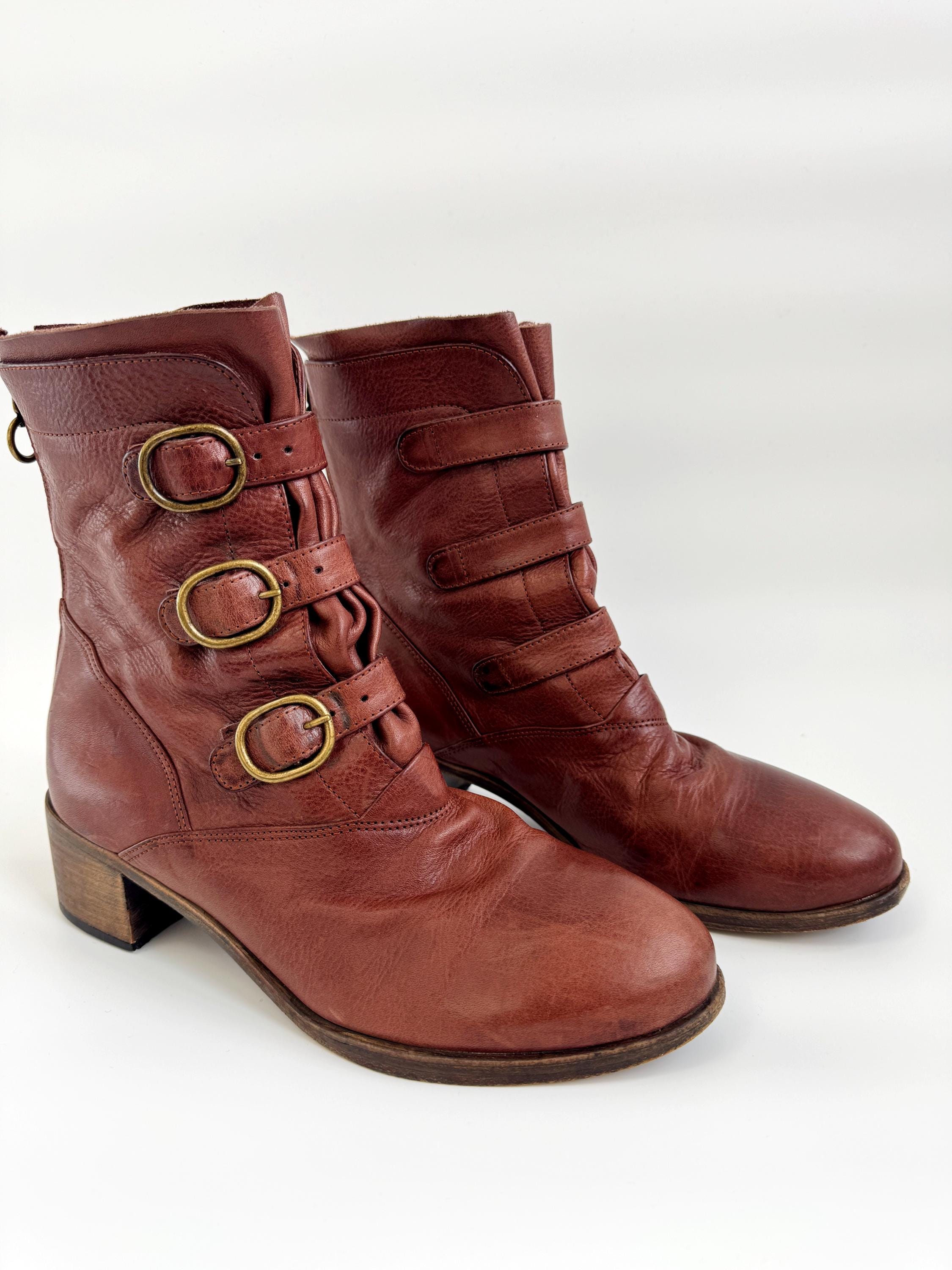 These are gorgeous vintage Y2K Argila Spain brown leather ankle boots for women in size EU 39. Crafted from high-quality, supple distressed cognac brown leather, these leather ankle boots feature a unique triple-buckle design that gives off a sophisticated moto-chic vibe. The rich, earthy brown tone is versatile enough for autumn wardrobes but bold enough to make a statement year-round.