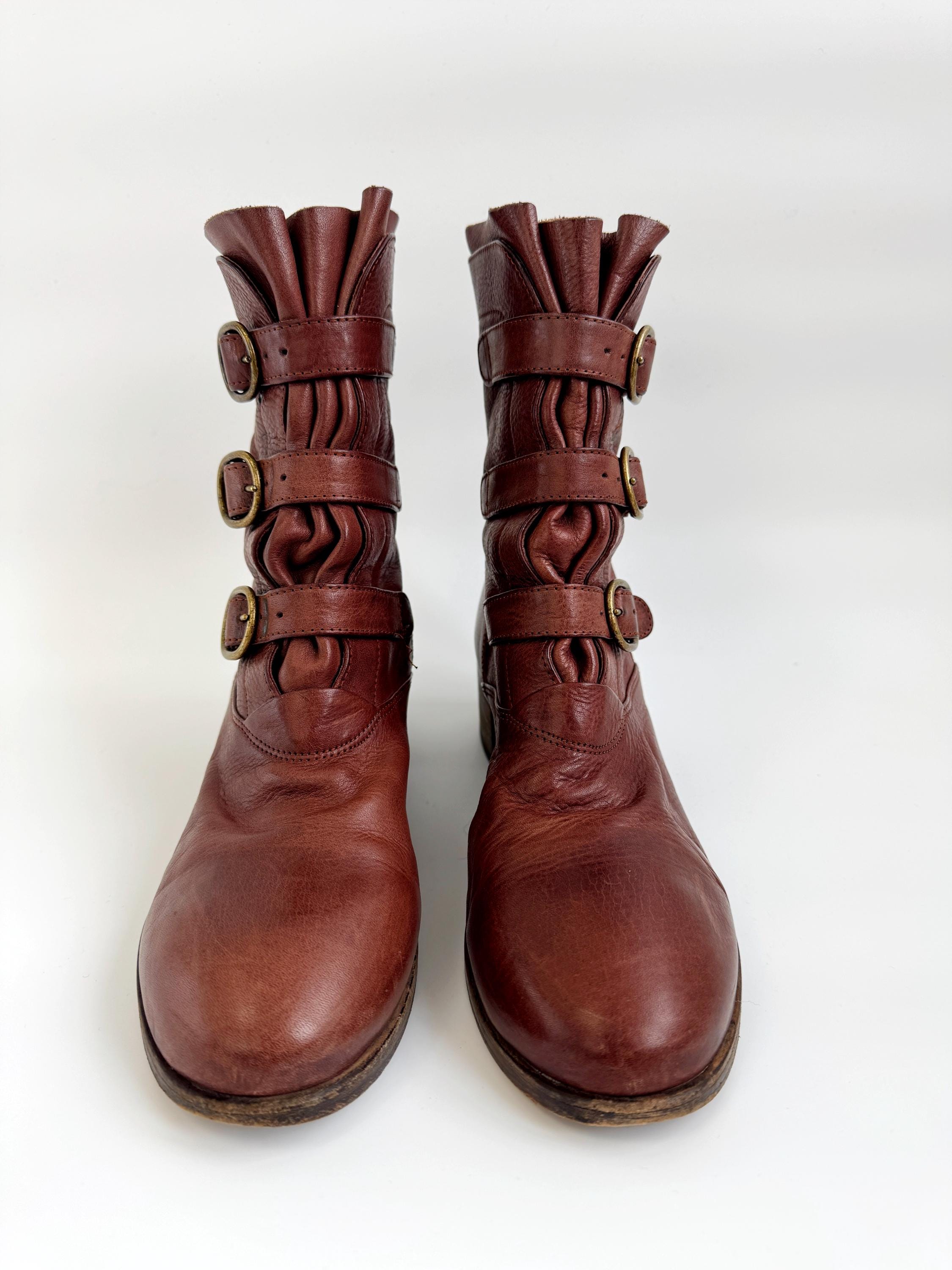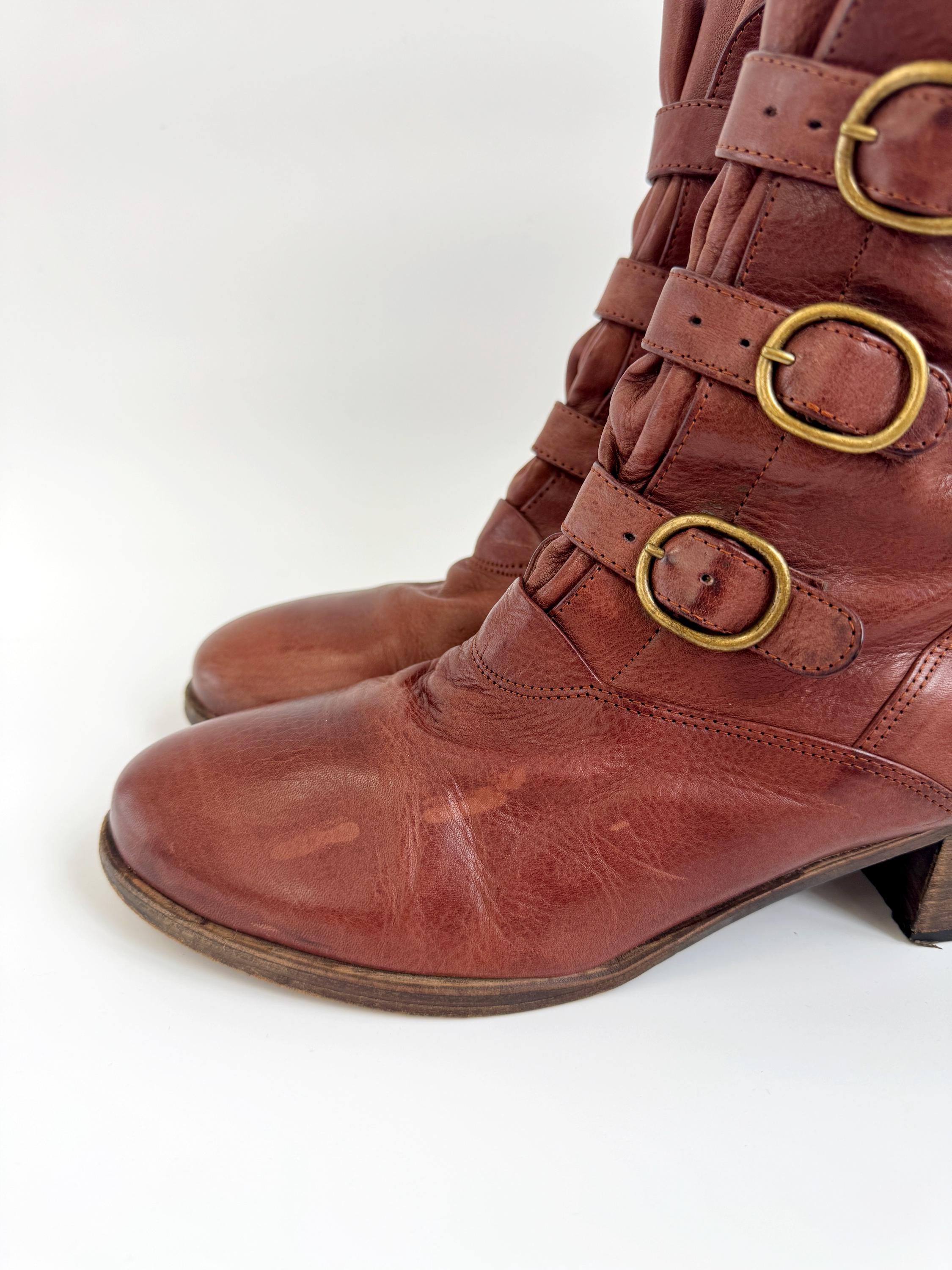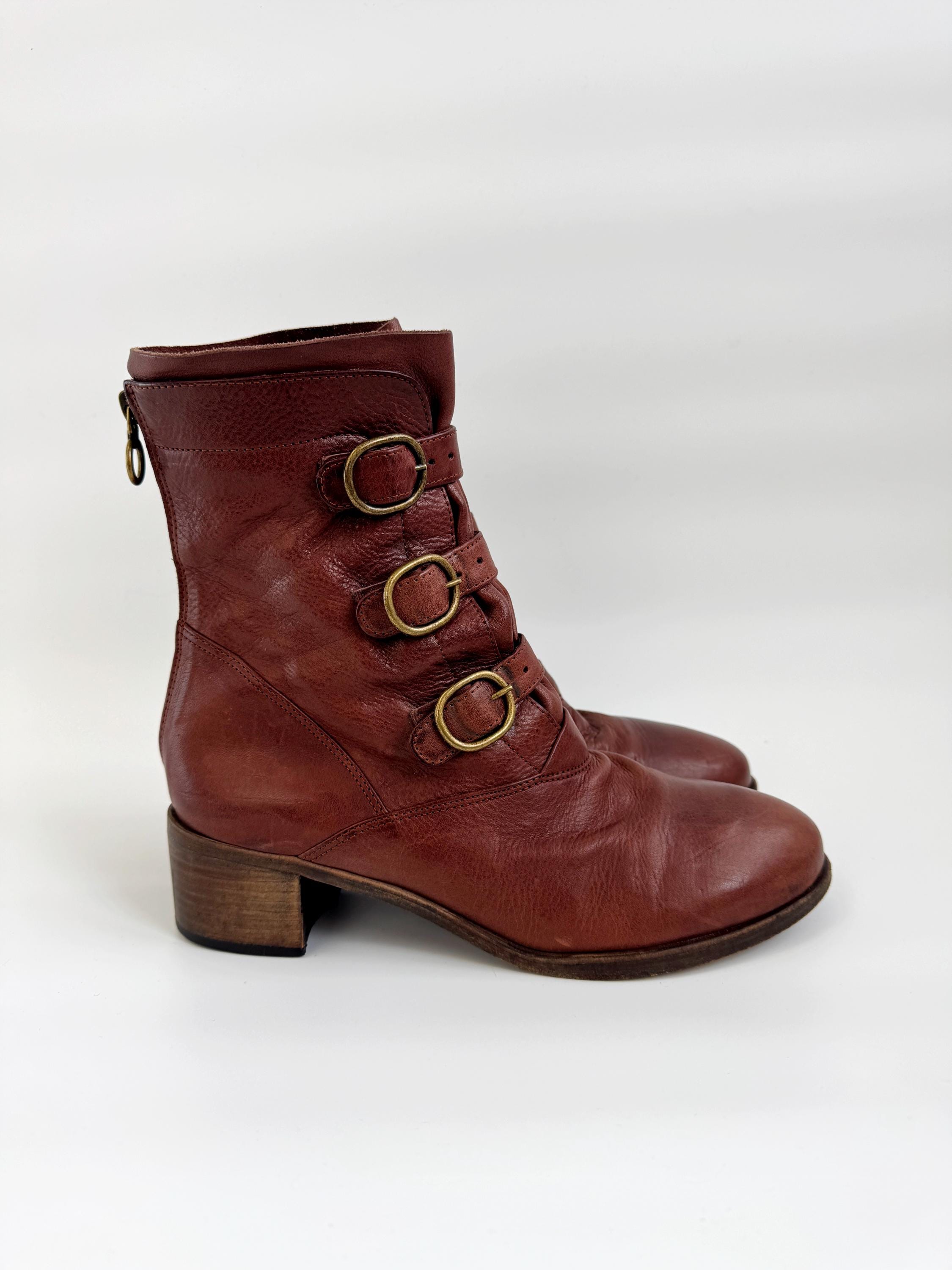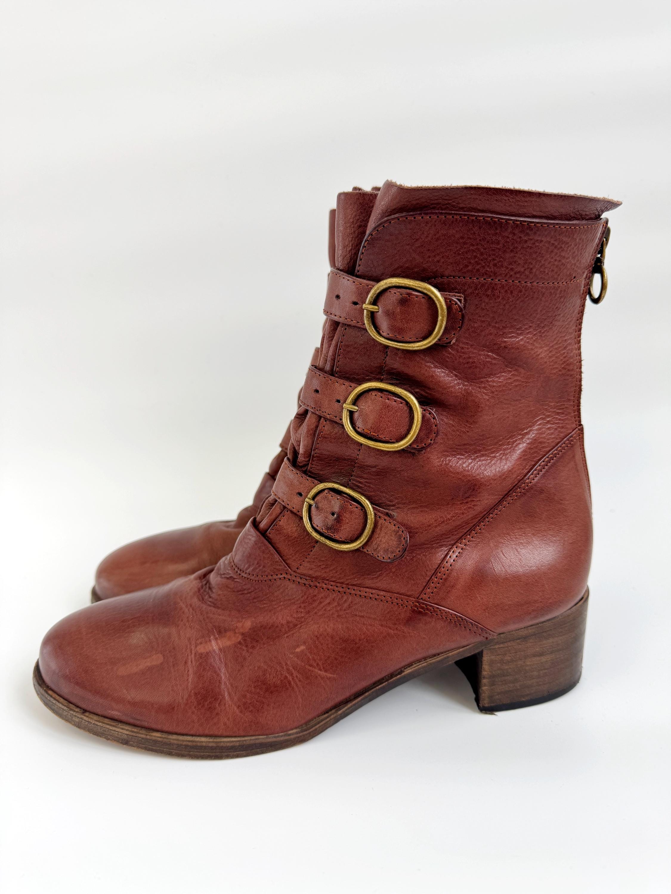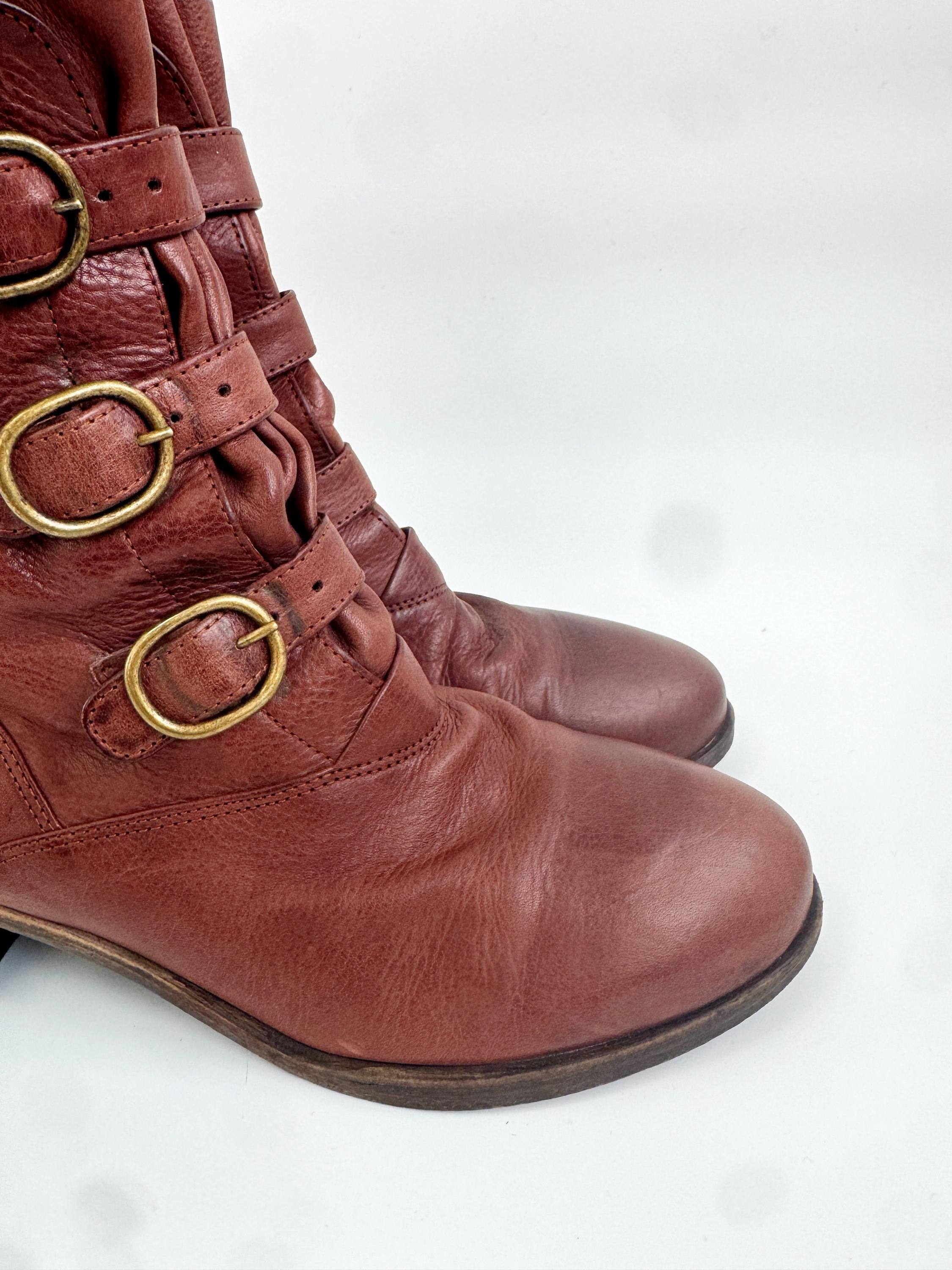 These are gorgeous vintage Y2K Argila Spain brown leather ankle boots for women in size EU 39. Crafted from high-quality, supple distressed cognac brown leather, these leather ankle boots feature a unique triple-buckle design that gives off a sophisticated moto-chic vibe. The rich, earthy brown tone is versatile enough for autumn wardrobes but bold enough to make a statement year-round.