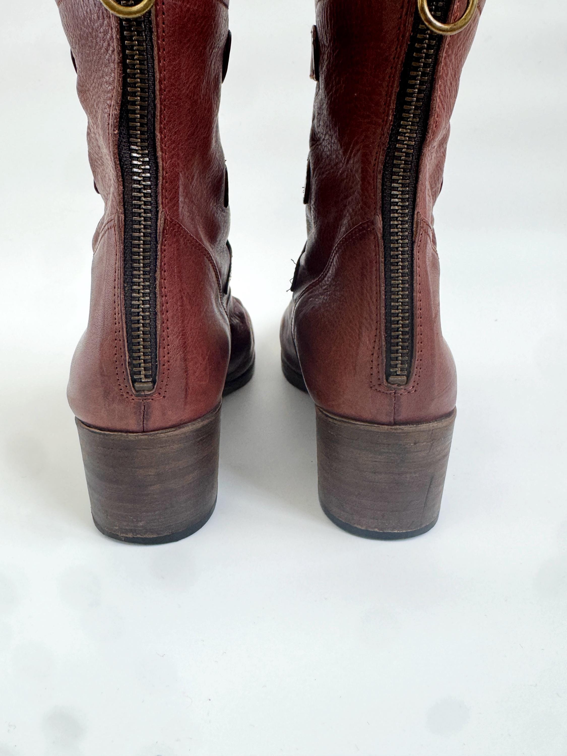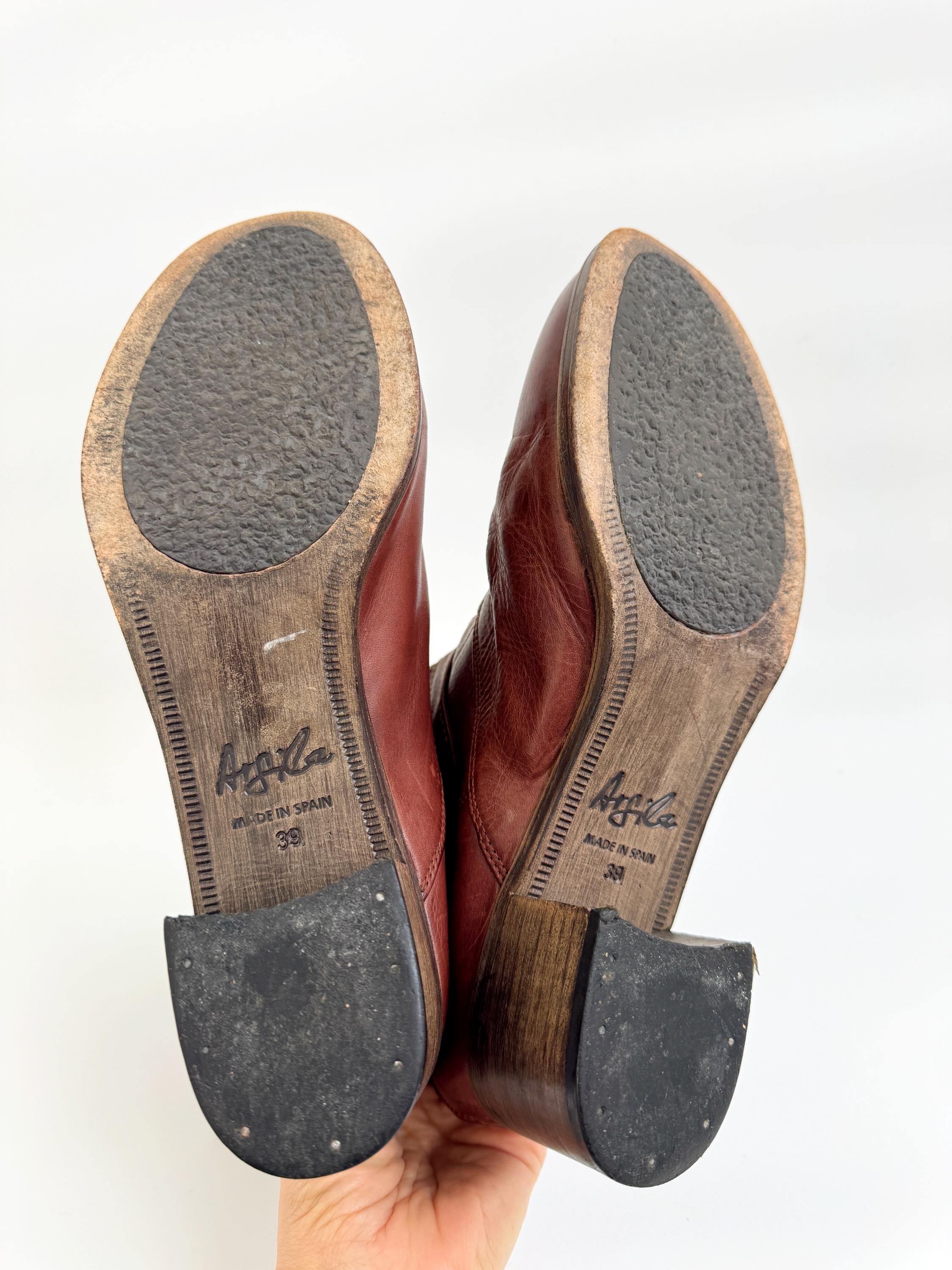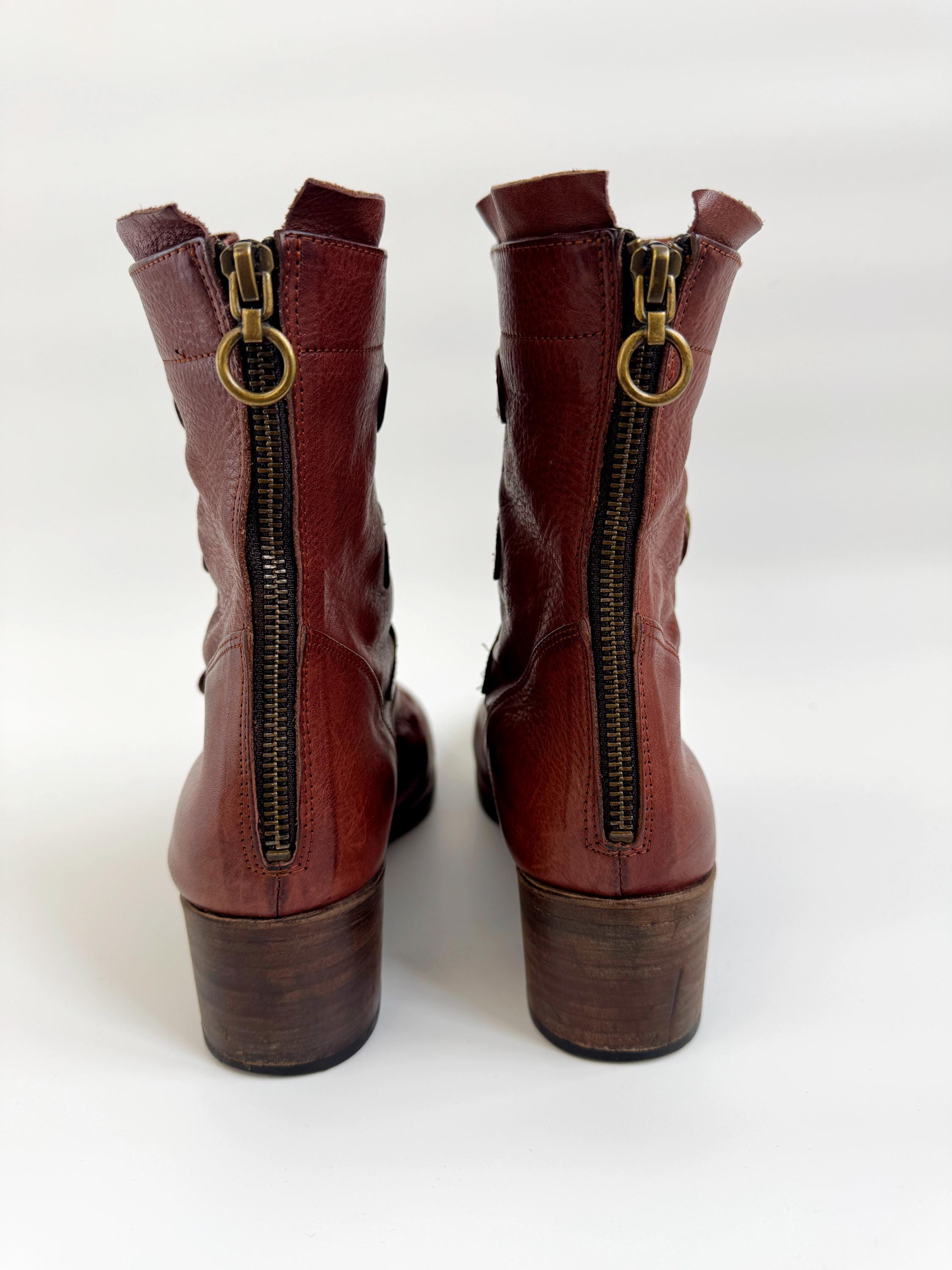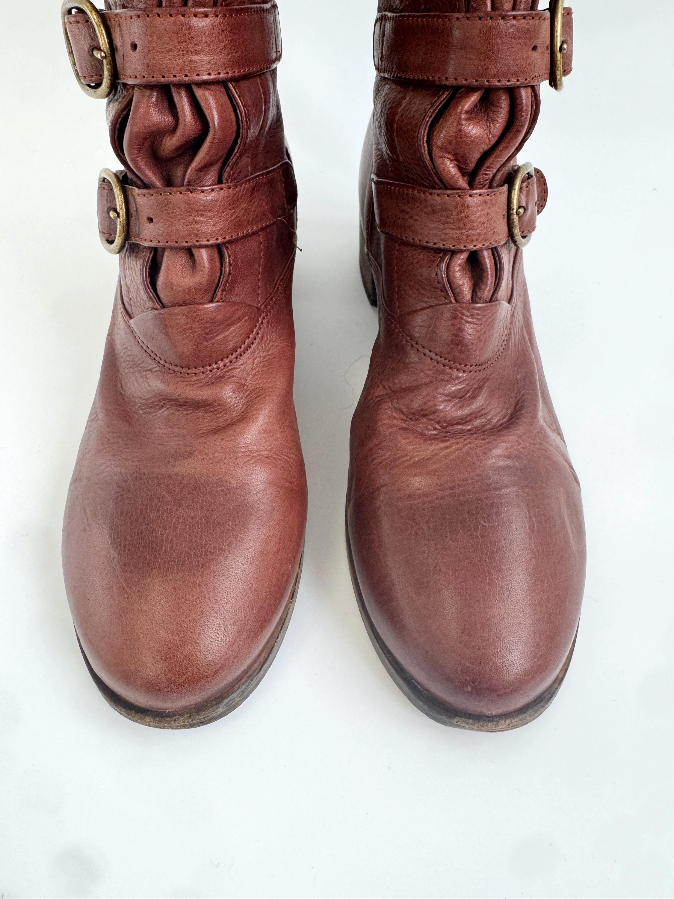 These are gorgeous vintage Y2K Argila Spain brown leather ankle boots for women in size EU 39. Crafted from high-quality, supple distressed cognac brown leather, these leather ankle boots feature a unique triple-buckle design that gives off a sophisticated moto-chic vibe. The rich, earthy brown tone is versatile enough for autumn wardrobes but bold enough to make a statement year-round.