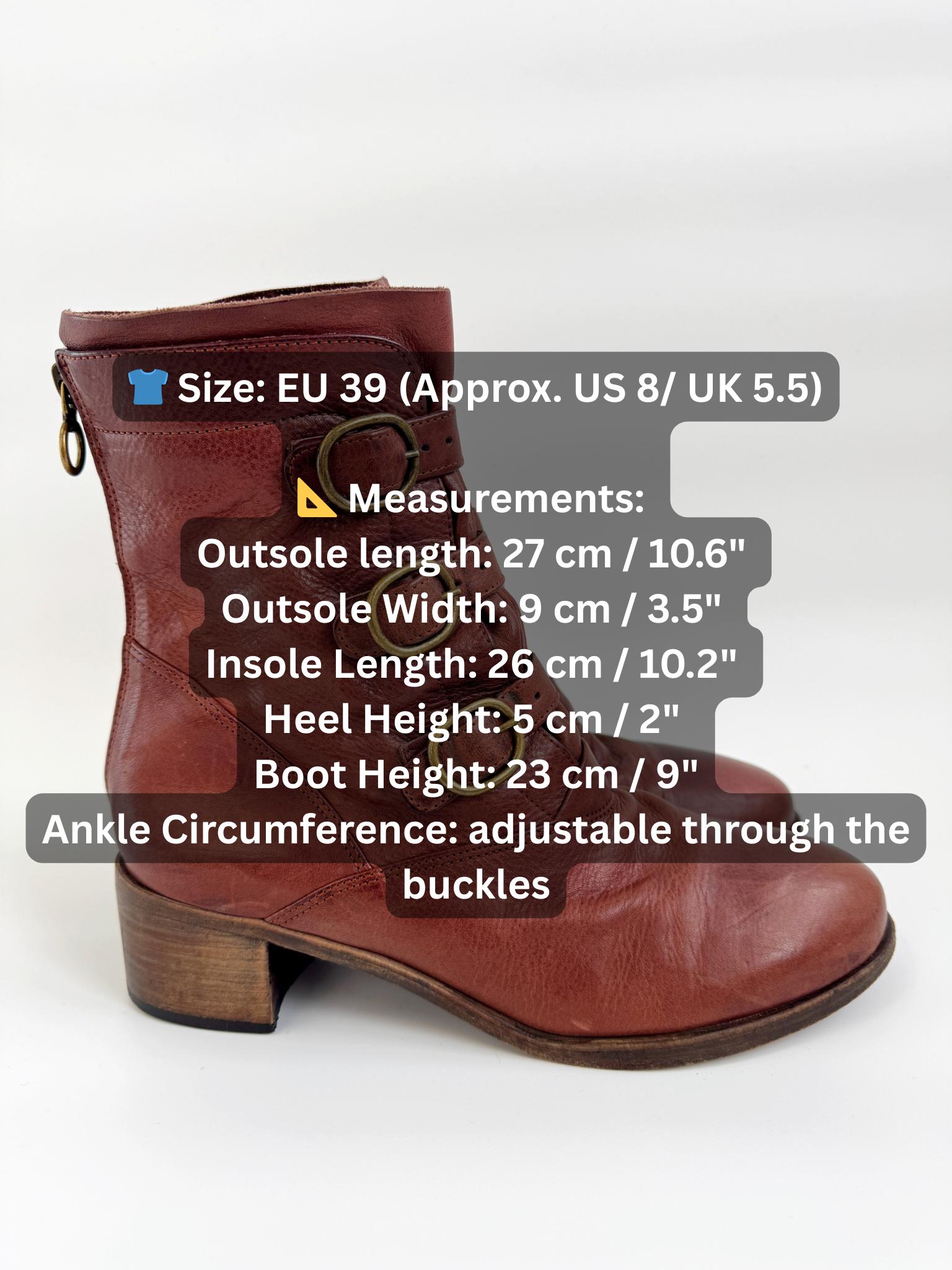 Designed for both style and ease, these brown leather booties come with a back zipper closure, allowing you to keep the buckles perfectly adjusted while slipping them on and off effortlessly. The chunky block heel provides a comfortable lift, making these cognac brown boots ideal for all-day wear. Whether you're pairing them with a flowing vintage dress or your favorite denim, these Spanish-made boots offer that rare blend of rugged durability and European elegance.