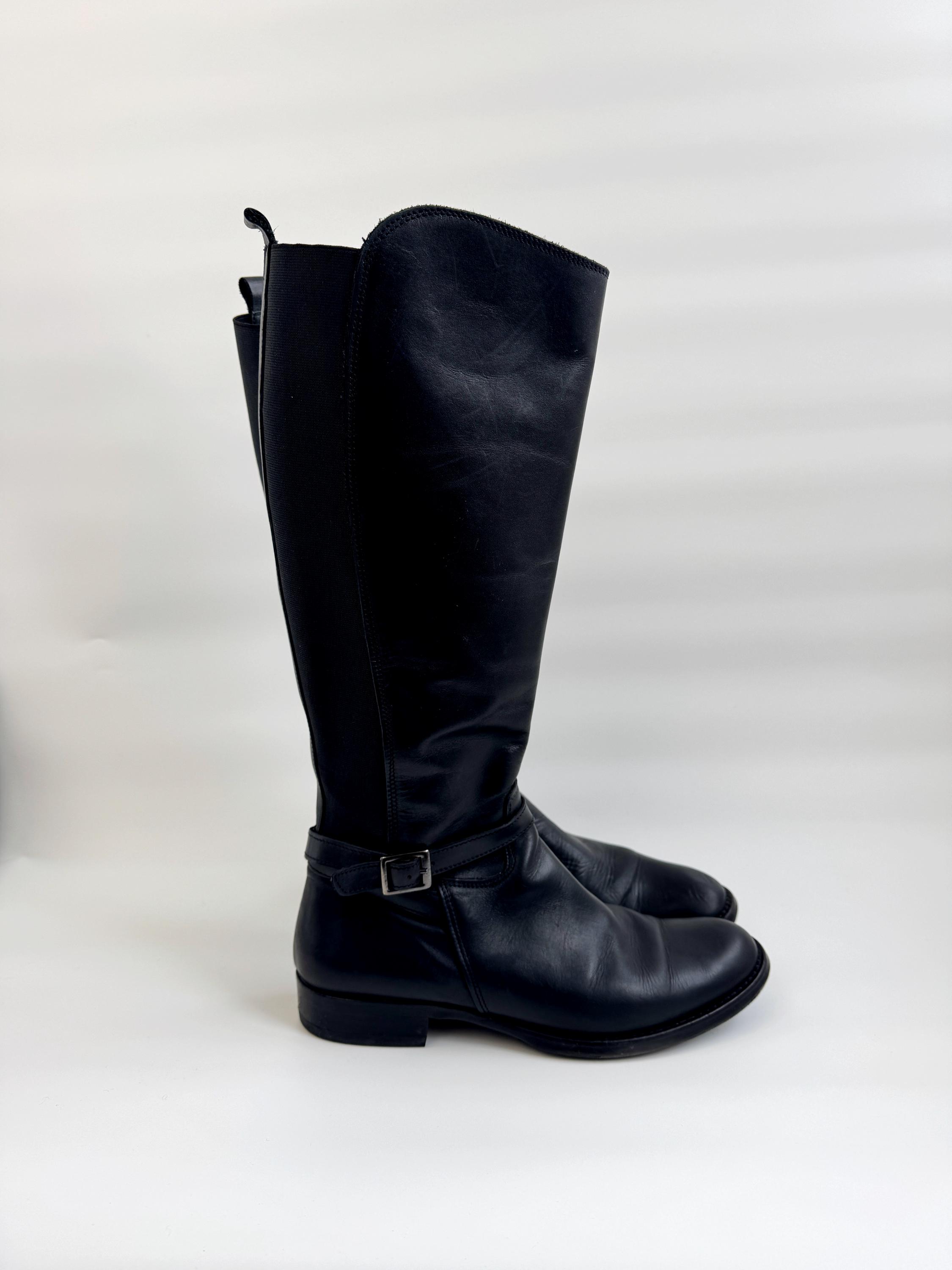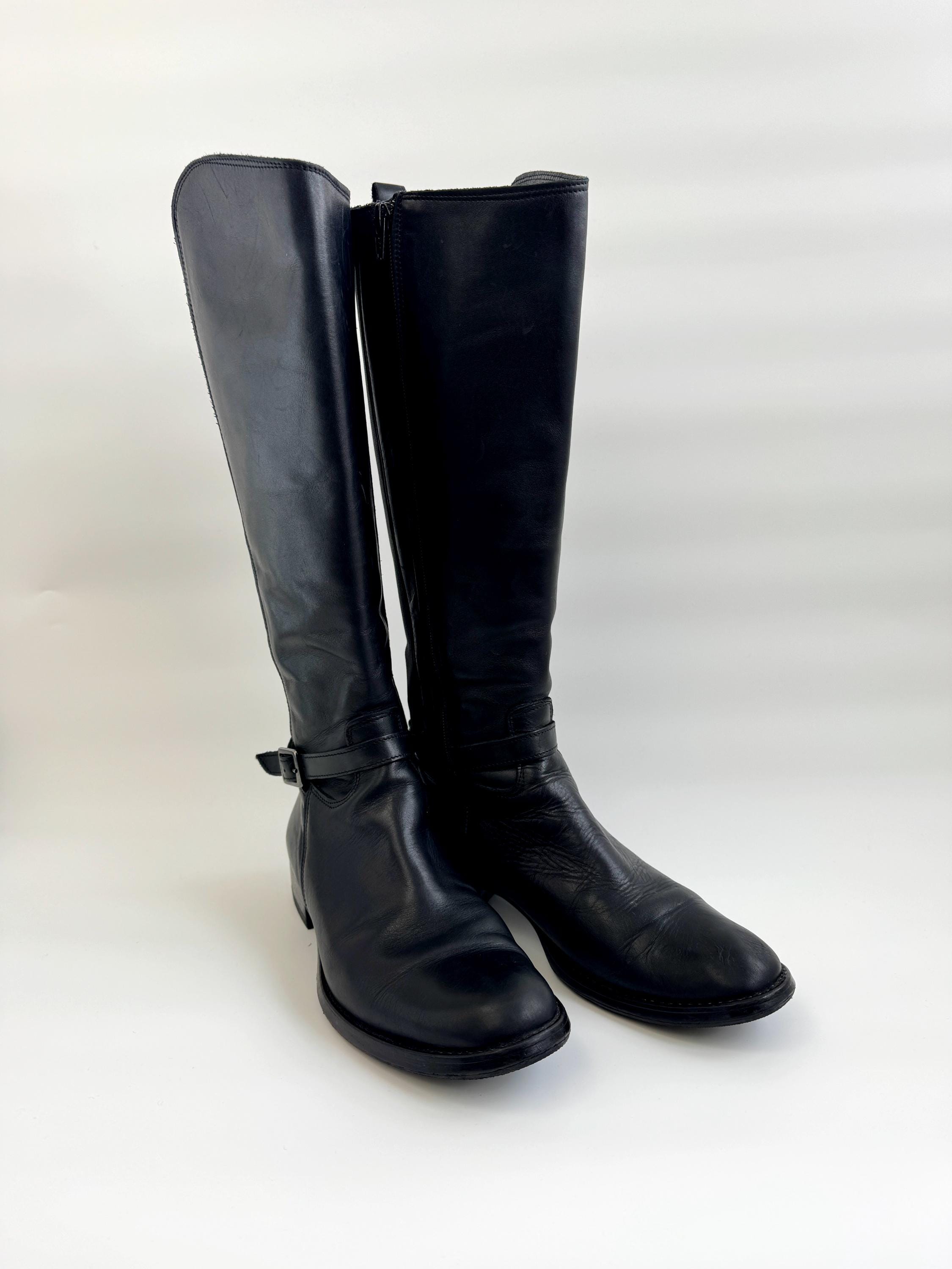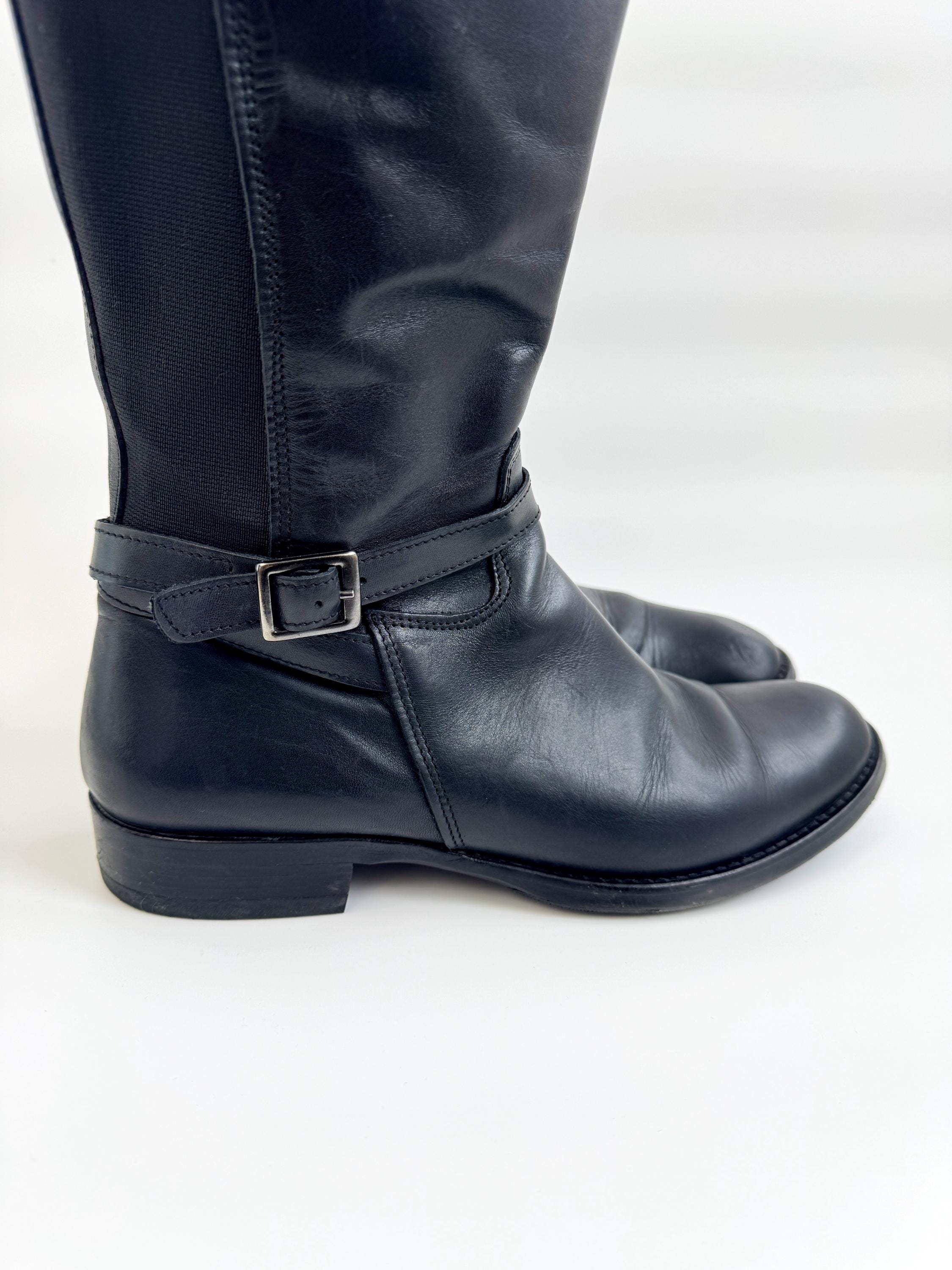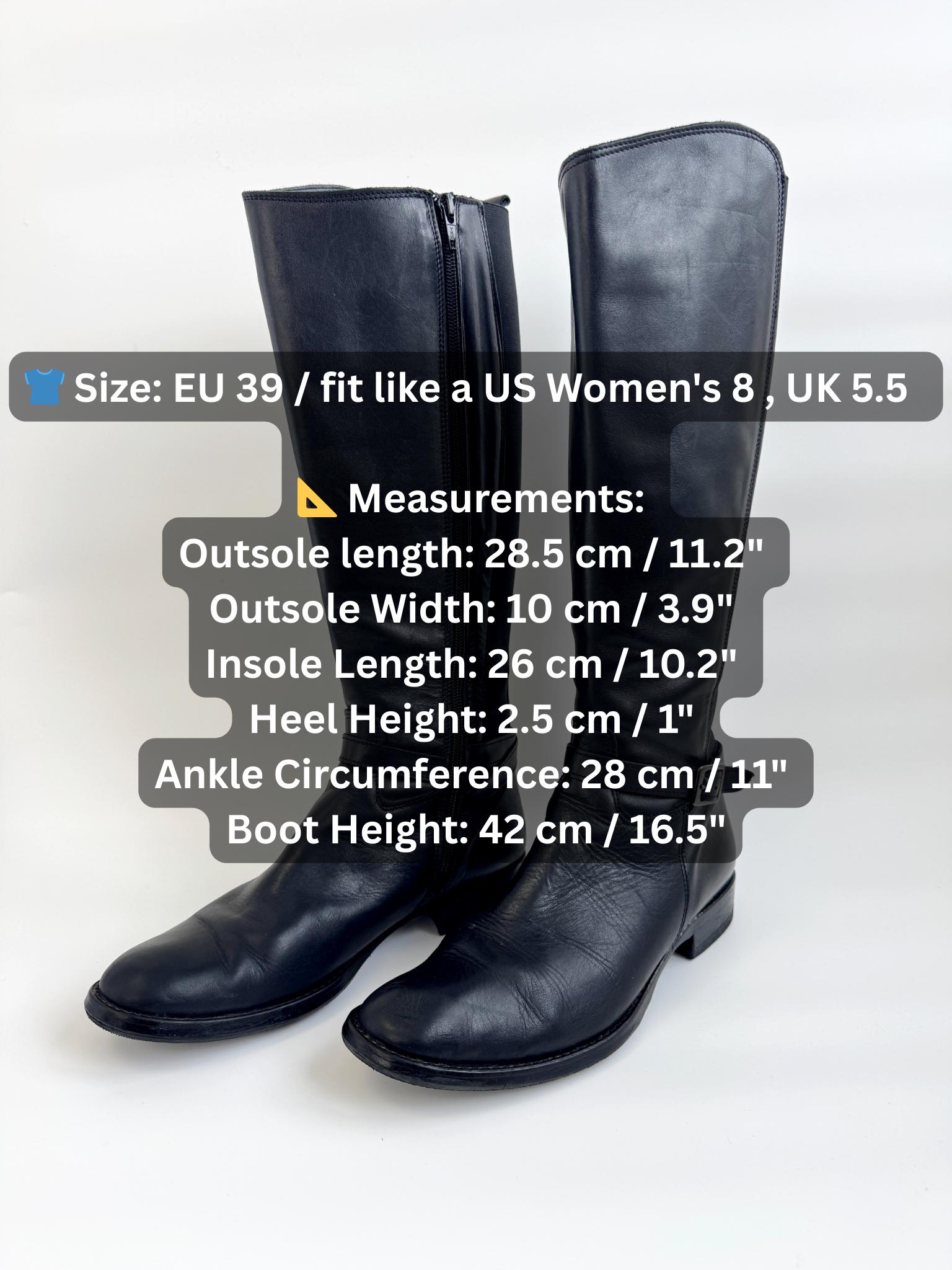 These are Italian-crafted vintage black leather riding boots in size EU 39 (fit approx like US 8, UK 6). Perfectly blending minimalist aesthetics with functional design, these tall black leather boots feature a sophisticated ankle buckle strap and a comfortable low block heel. The back of the shaft is designed with a full-length elasticated gusset, ensuring a flexible, flattering fit for various calf sizes while maintaining a sharp silhouette.