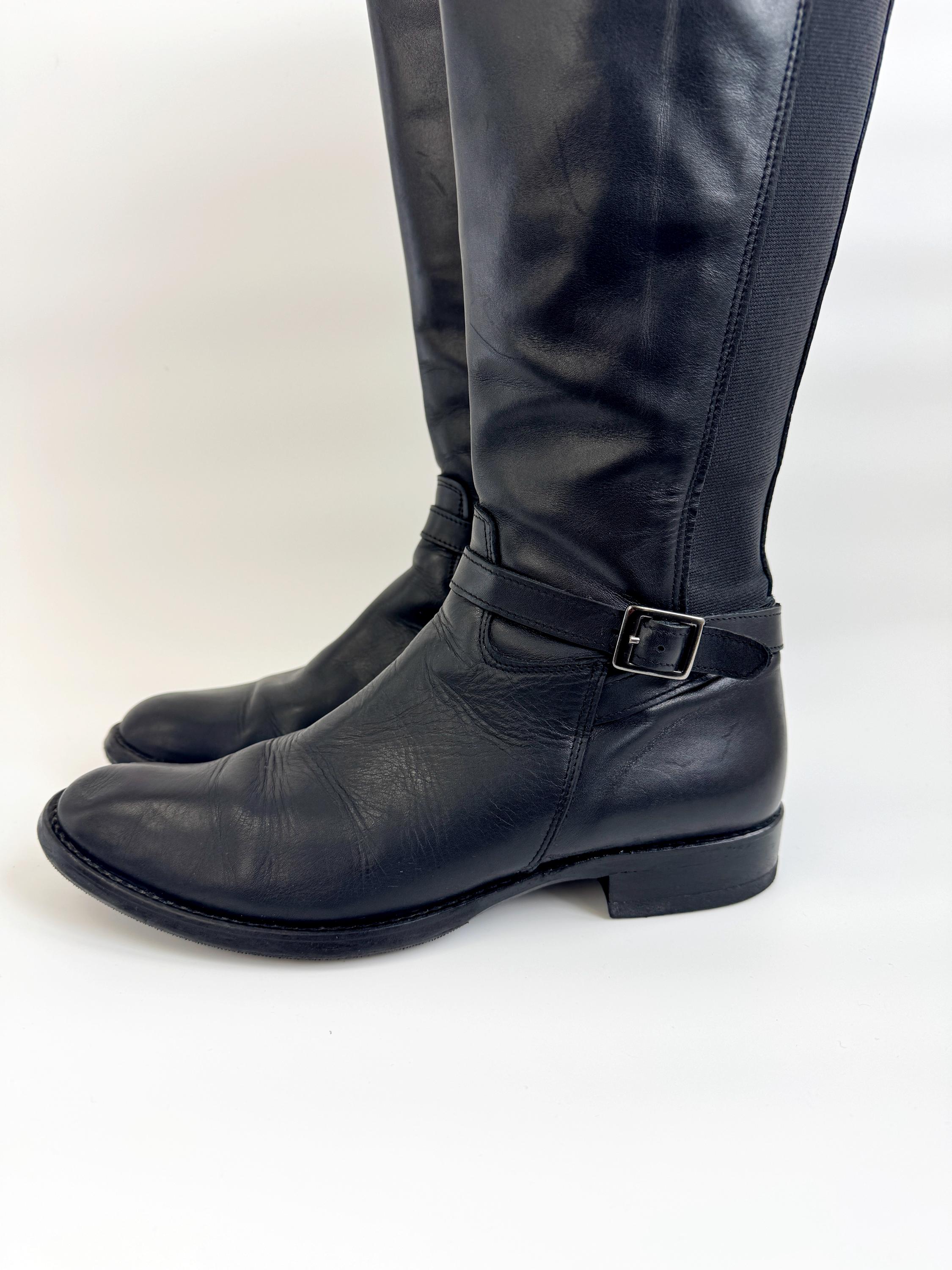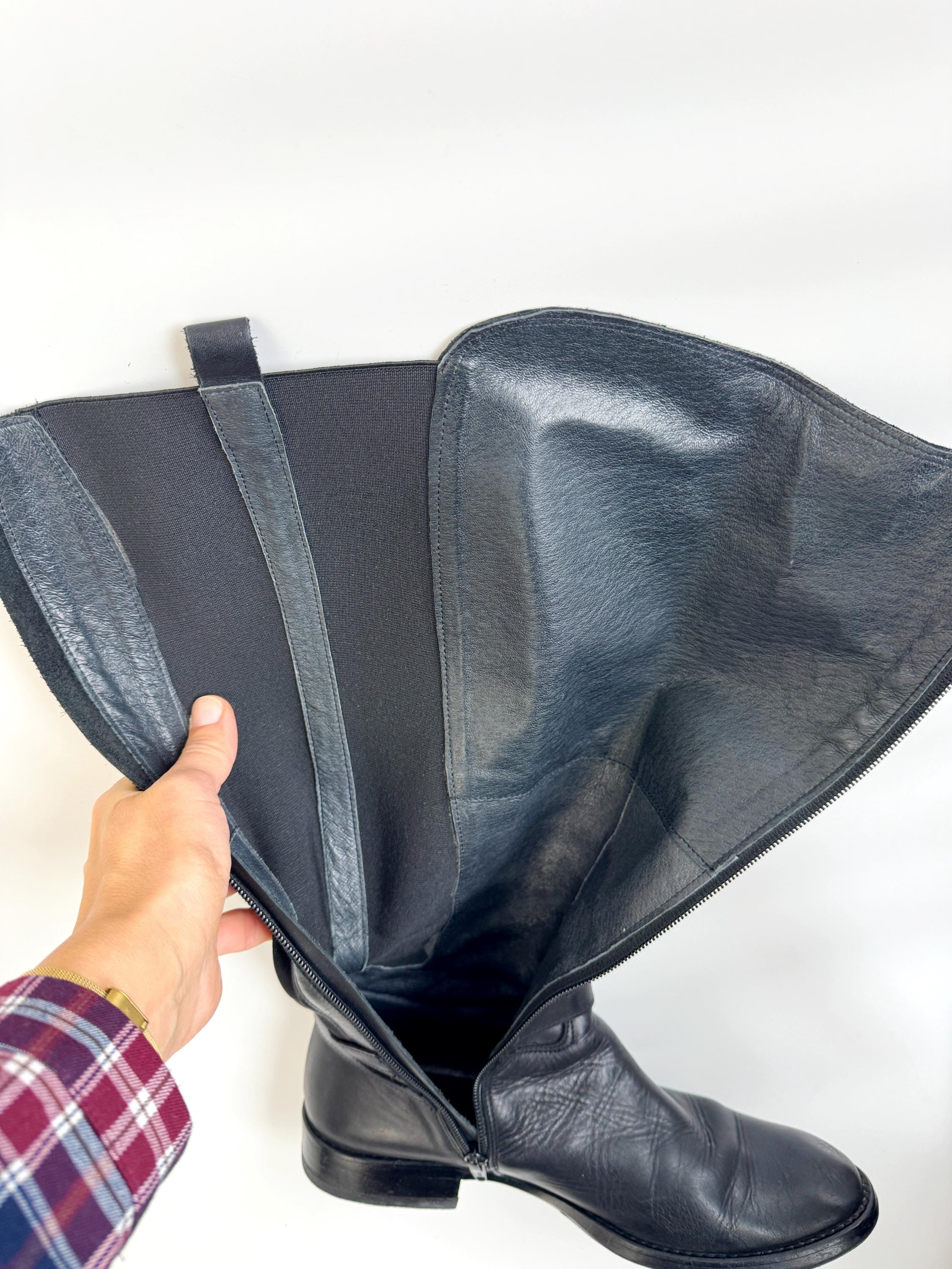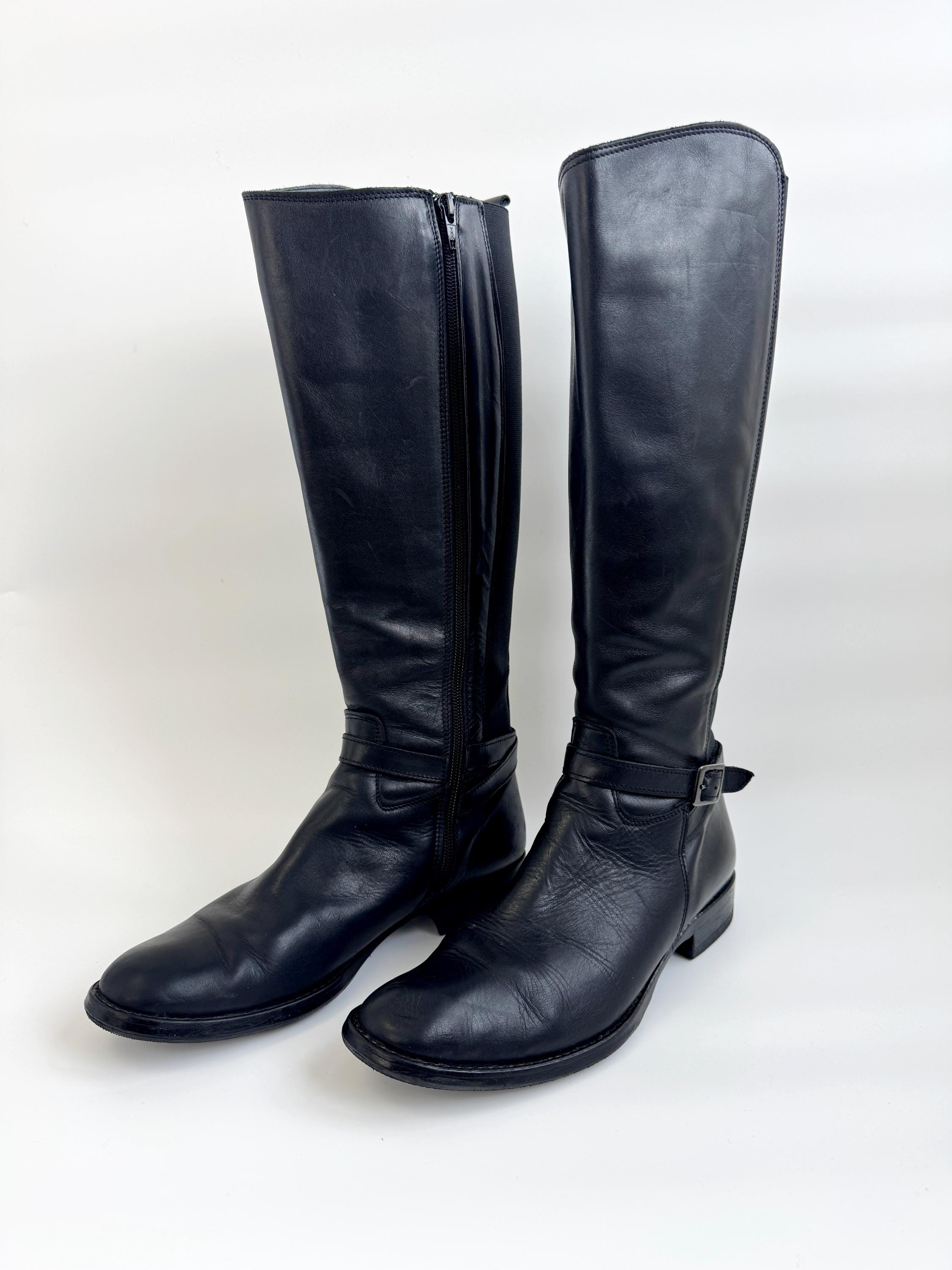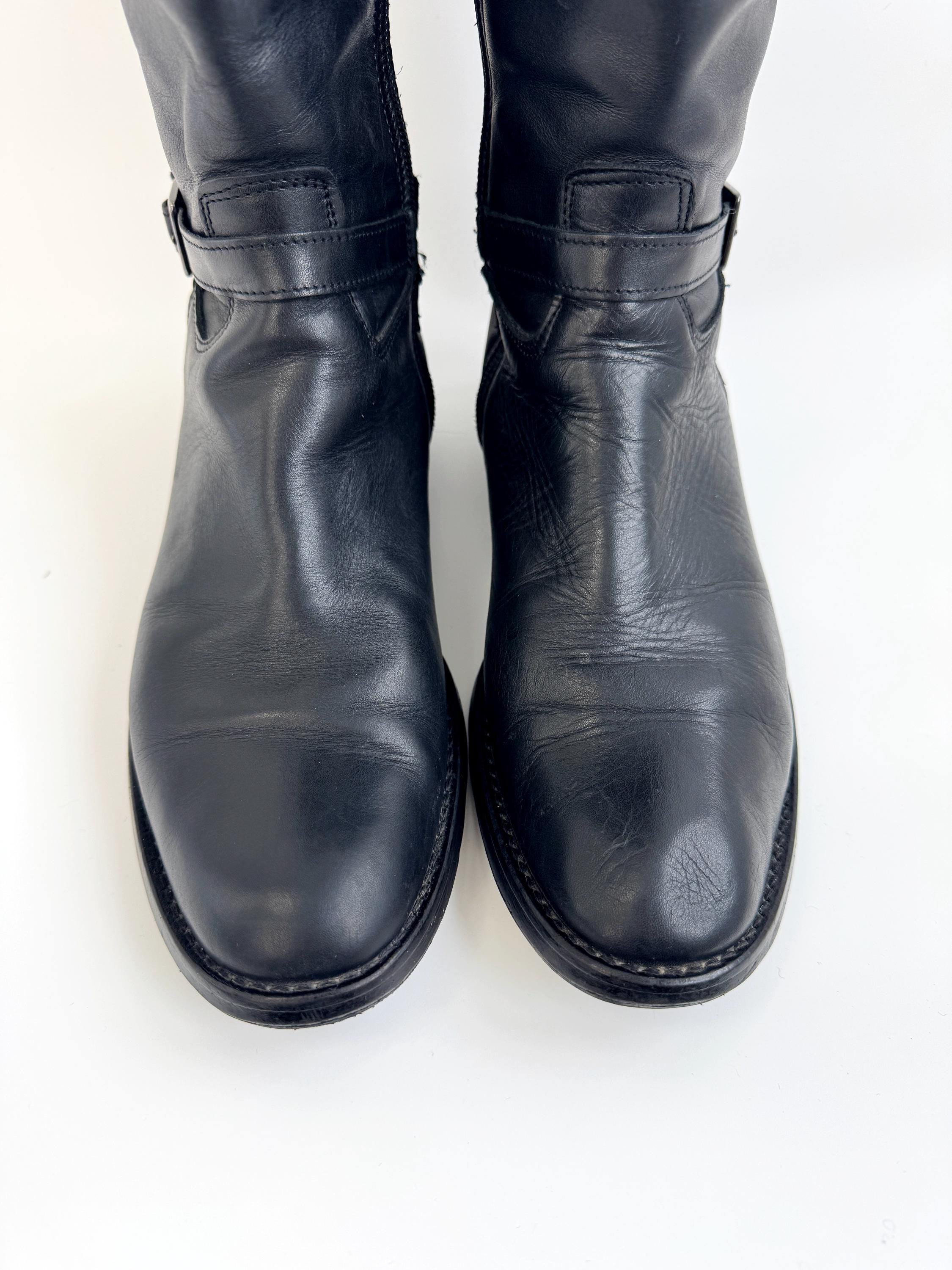 These are Italian-crafted vintage black leather riding boots in size EU 39 (fit approx like US 8, UK 6). Perfectly blending minimalist aesthetics with functional design, these tall black leather boots feature a sophisticated ankle buckle strap and a comfortable low block heel. The back of the shaft is designed with a full-length elasticated gusset, ensuring a flexible, flattering fit for various calf sizes while maintaining a sharp silhouette.