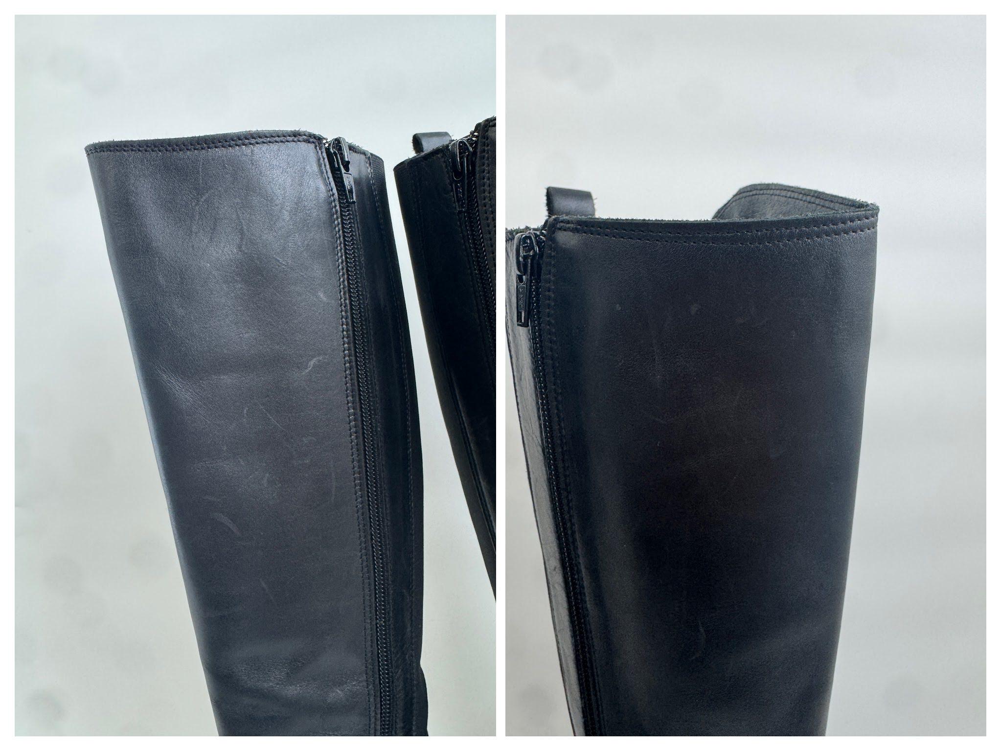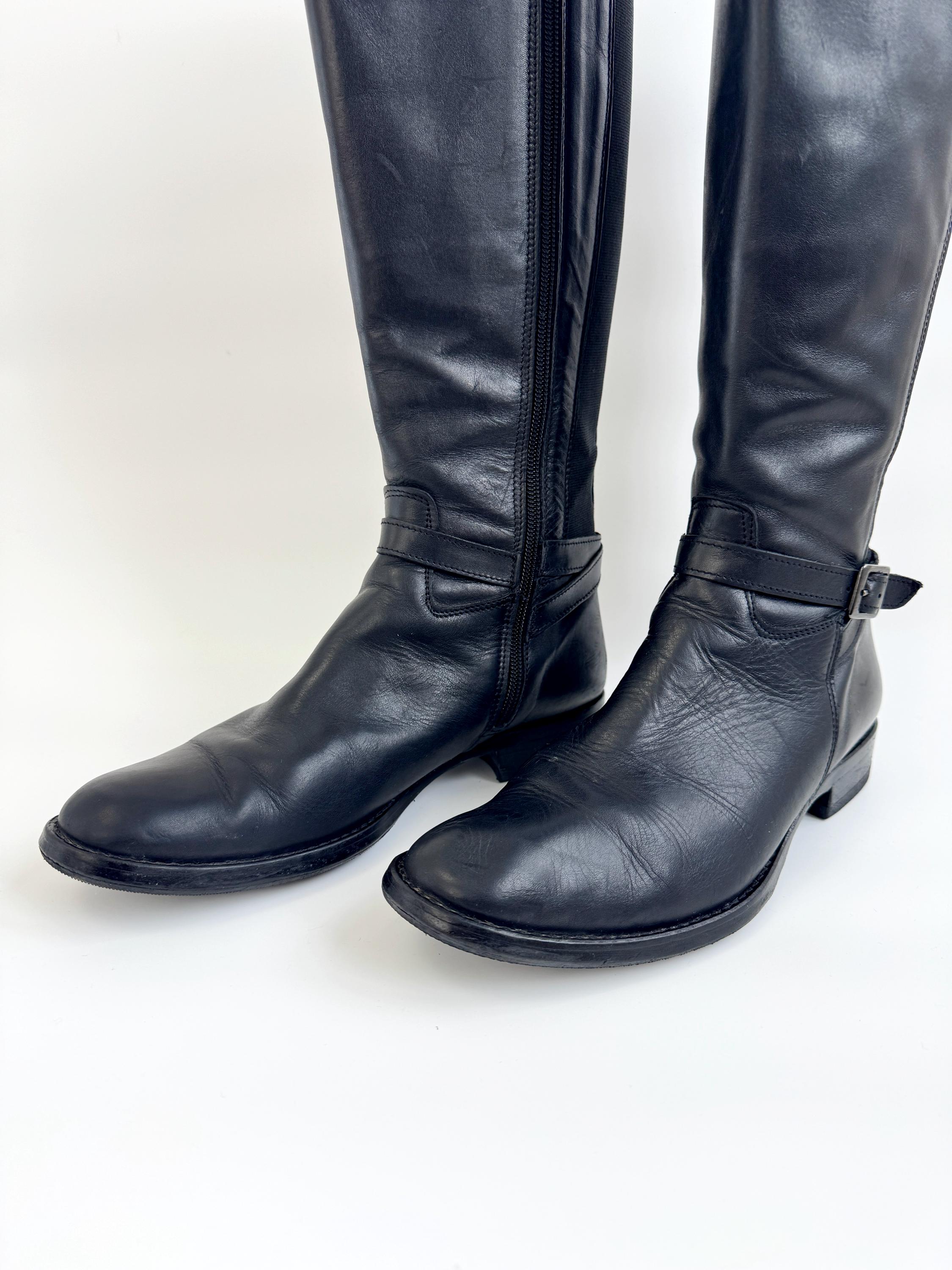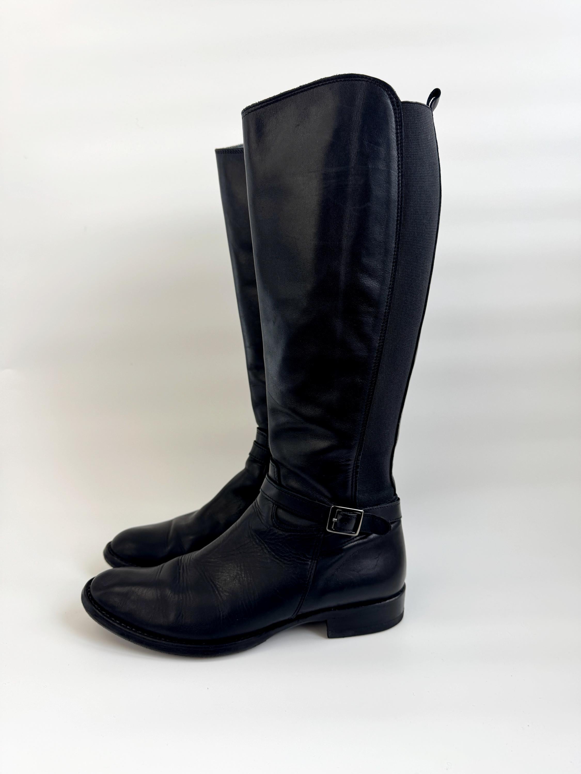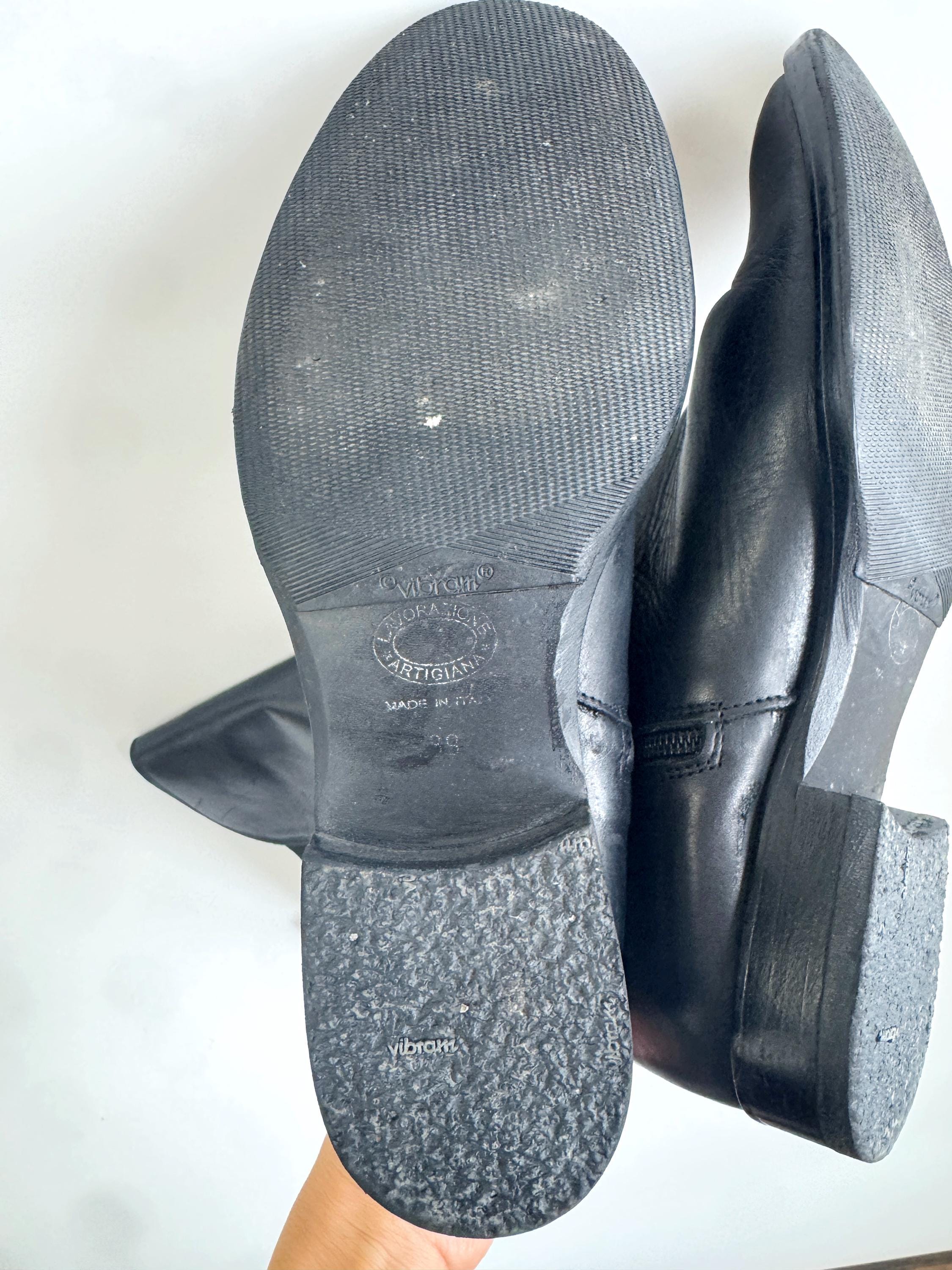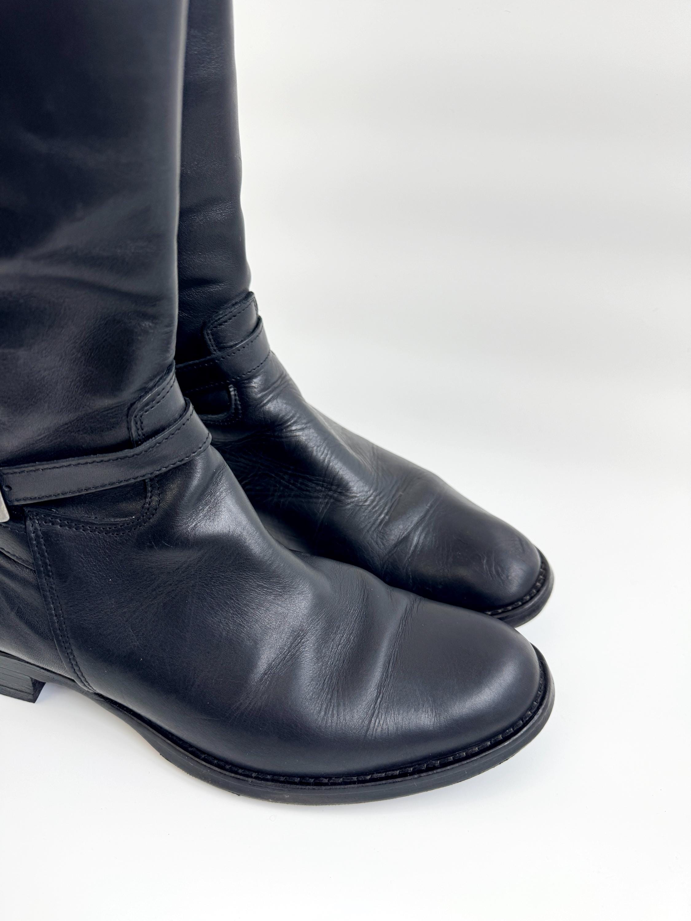 These are Italian-crafted vintage black leather riding boots in size EU 39 (fit approx like US 8, UK 6). Perfectly blending minimalist aesthetics with functional design, these tall black leather boots feature a sophisticated ankle buckle strap and a comfortable low block heel. The back of the shaft is designed with a full-length elasticated gusset, ensuring a flexible, flattering fit for various calf sizes while maintaining a sharp silhouette.