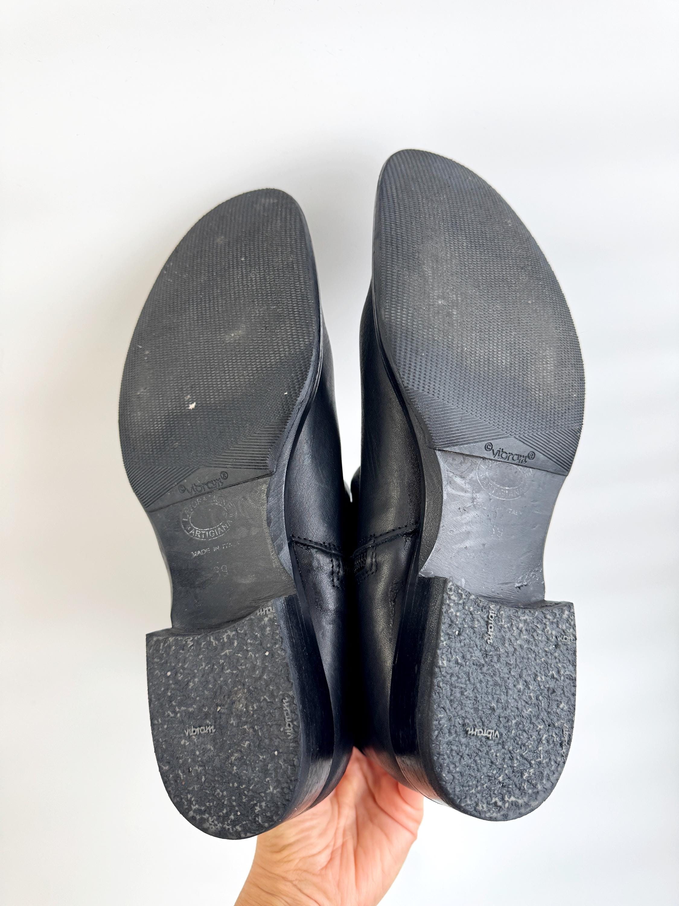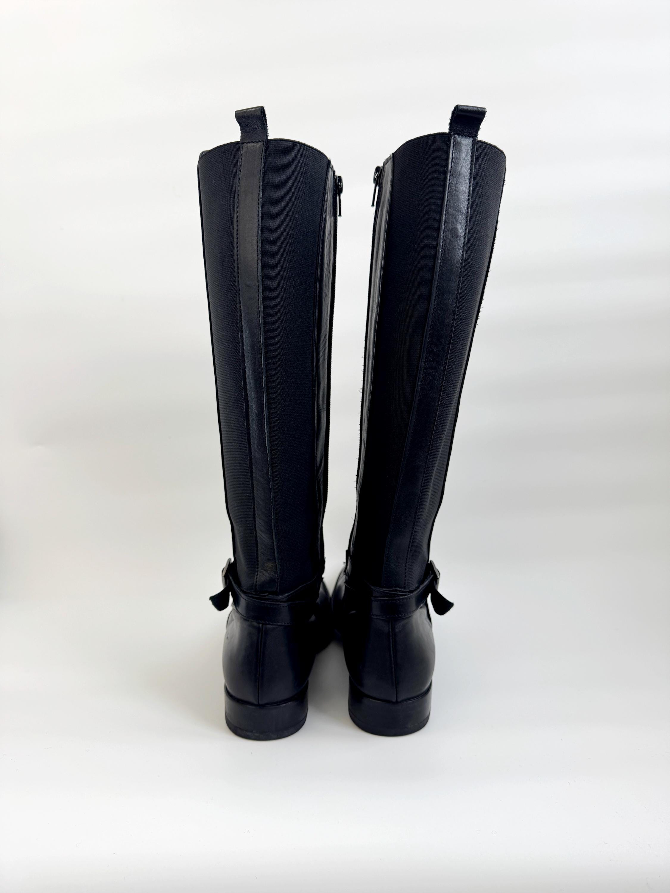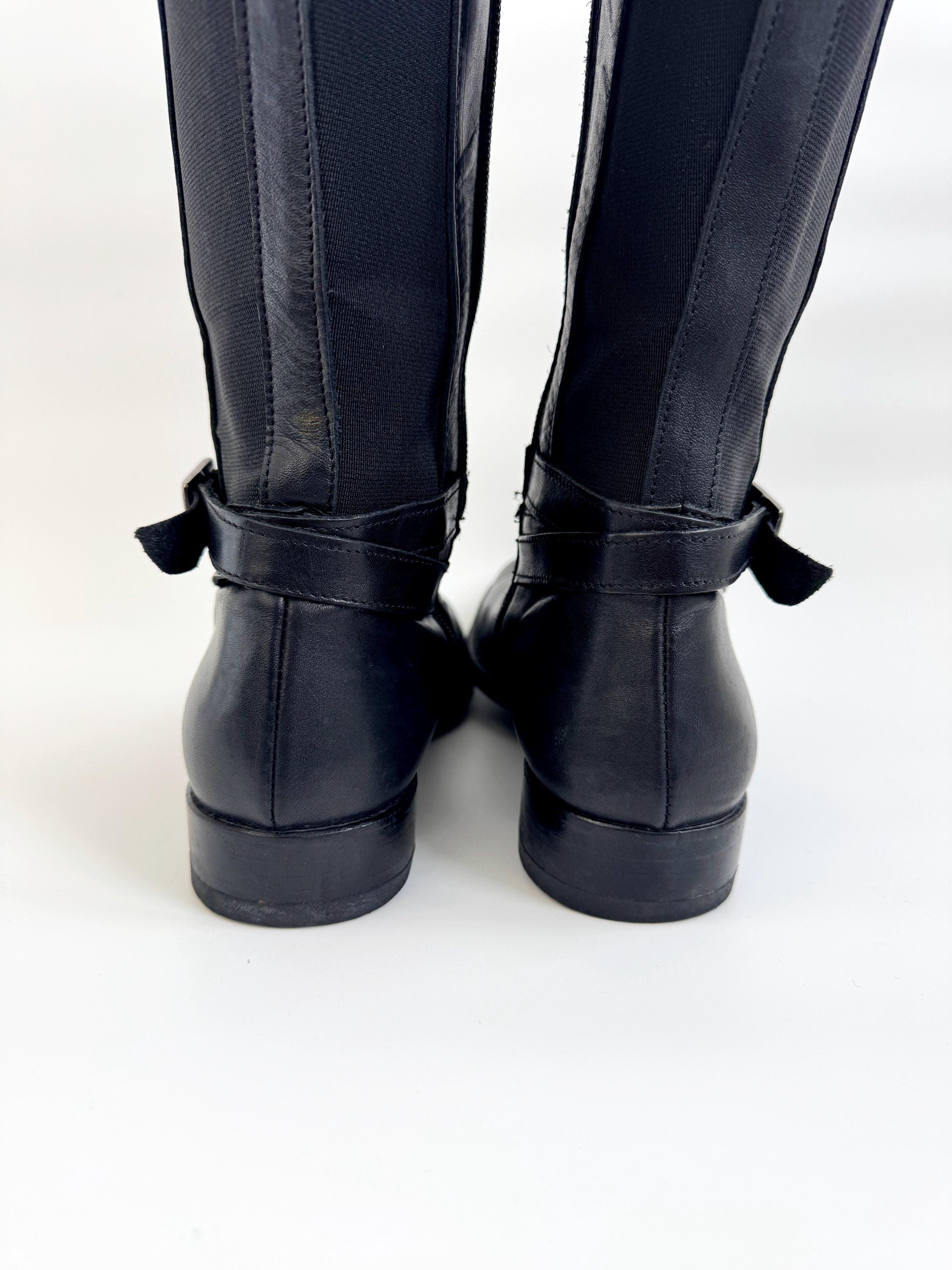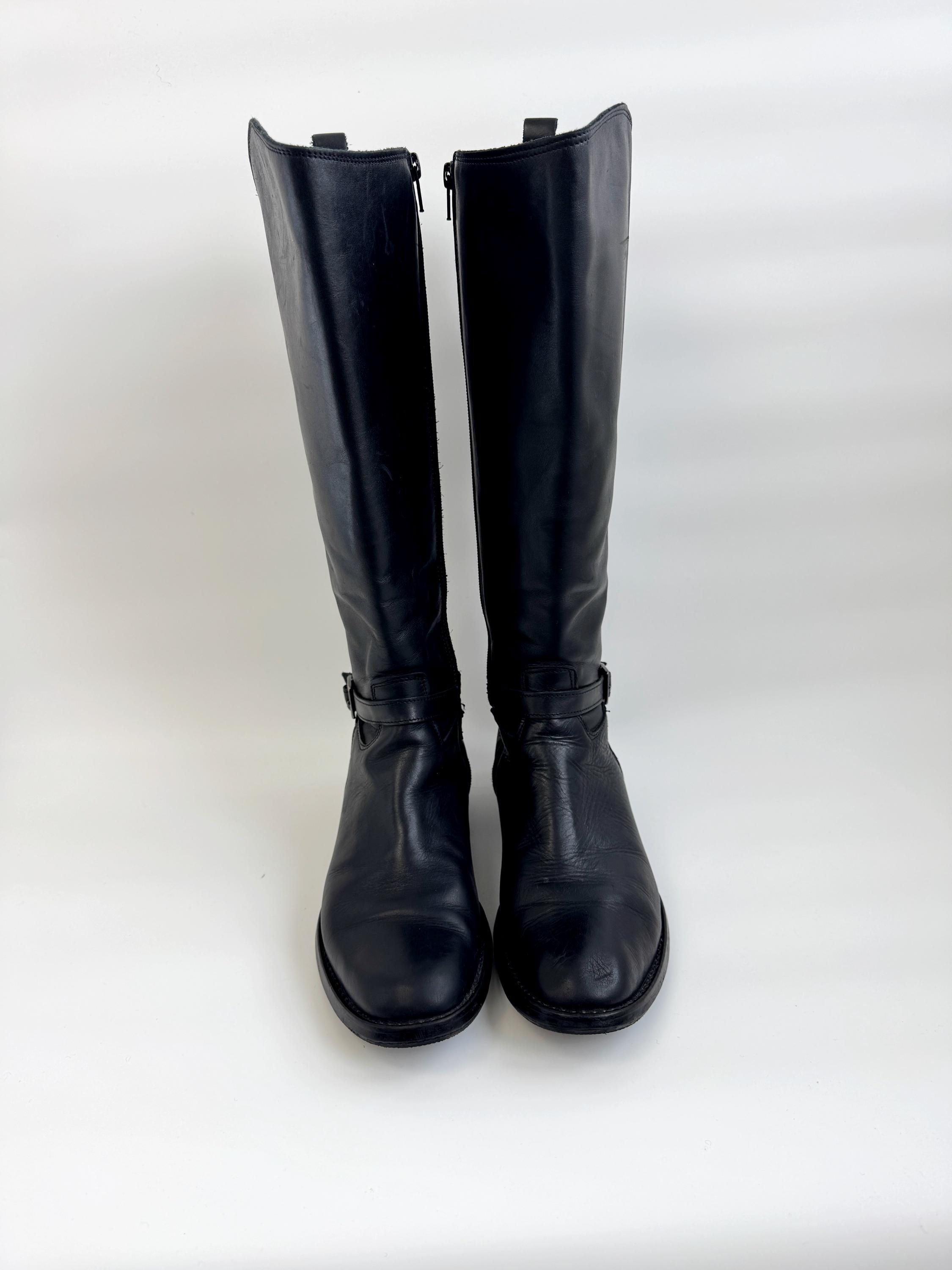 These are Italian-crafted vintage black leather riding boots in size EU 39 (fit approx like US 8, UK 6). Perfectly blending minimalist aesthetics with functional design, these tall black leather boots feature a sophisticated ankle buckle strap and a comfortable low block heel. The back of the shaft is designed with a full-length elasticated gusset, ensuring a flexible, flattering fit for various calf sizes while maintaining a sharp silhouette.