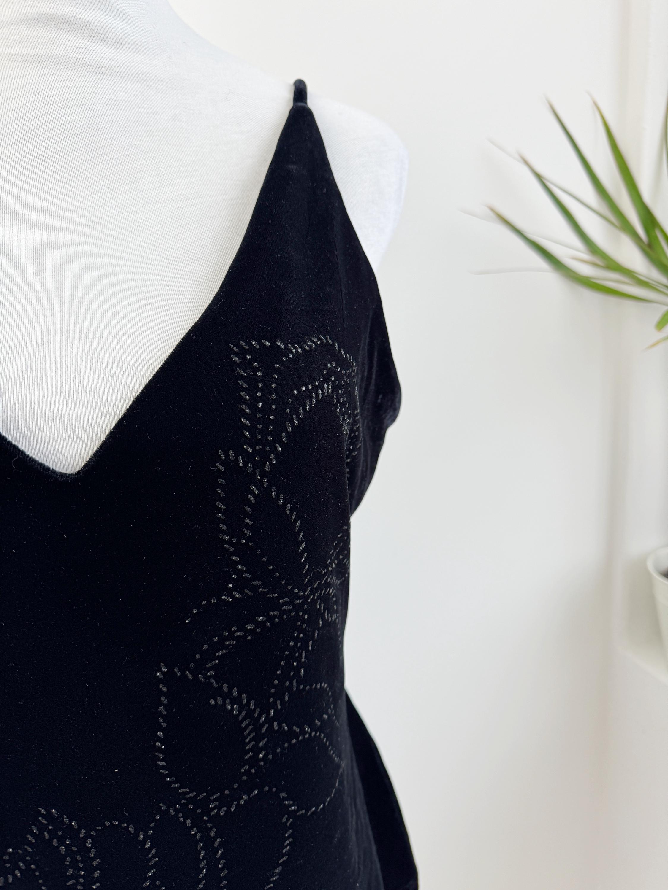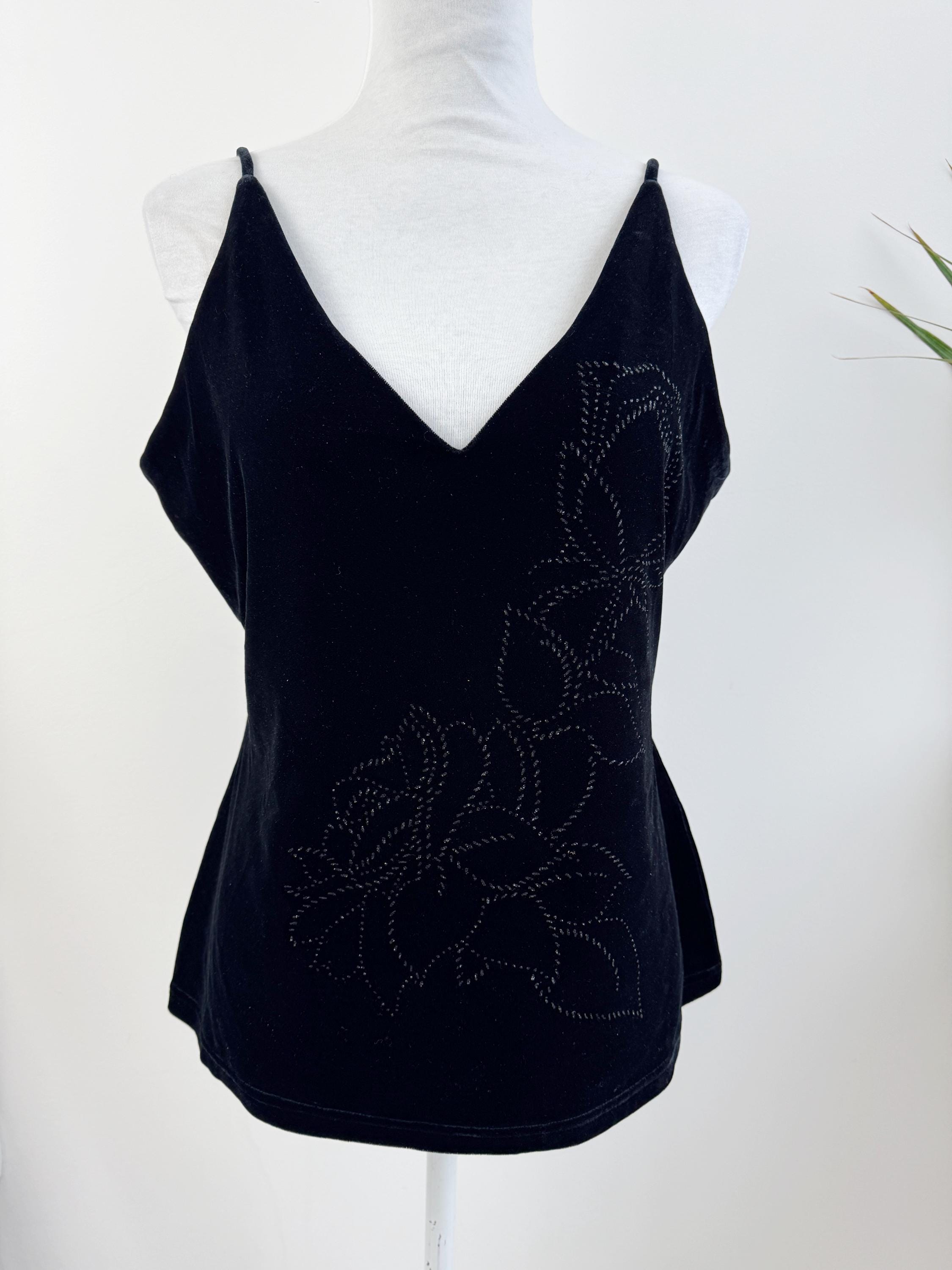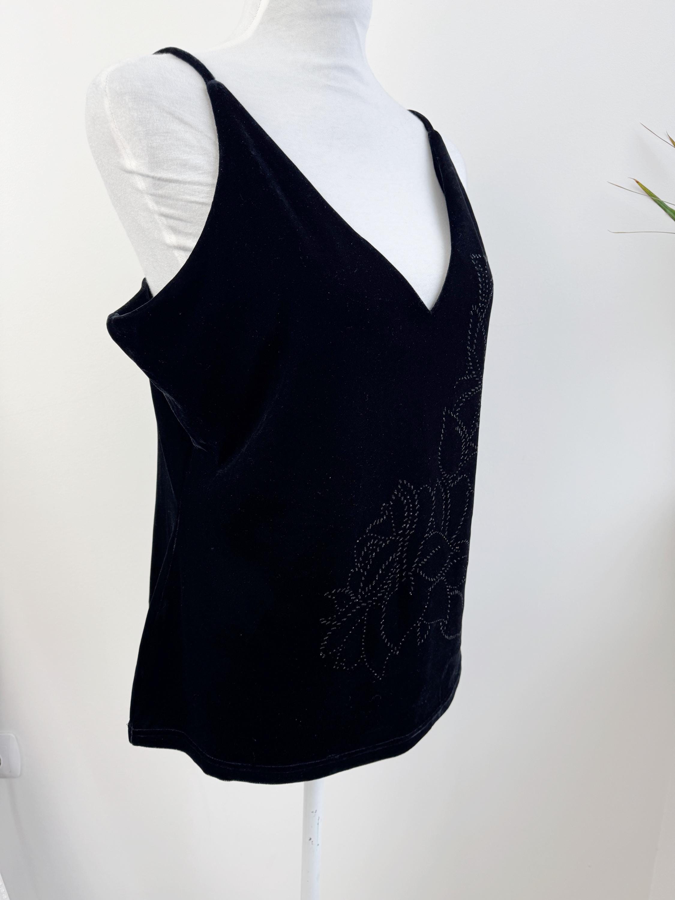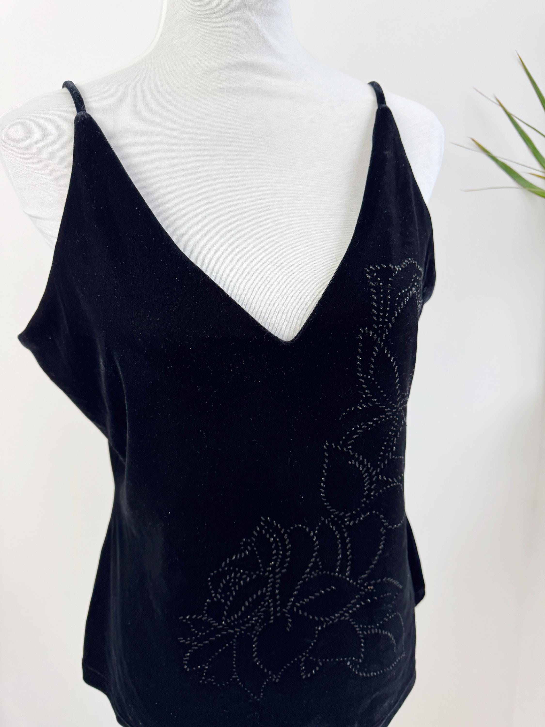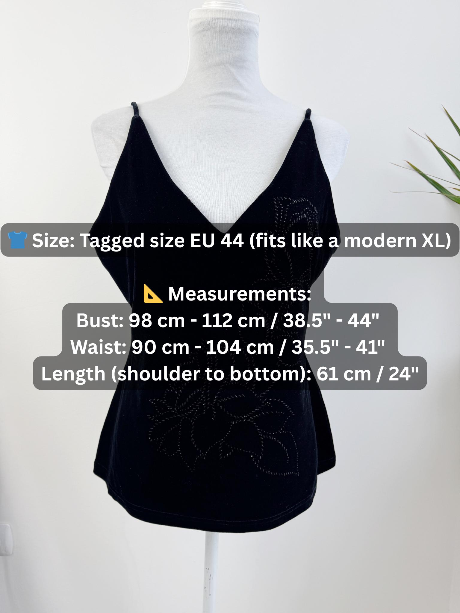 This is an exquisite vintage 90s black velvet camisole in size XL. This velvet sleeveless top features a deep V-neckline and a beautiful floral design cascading down the side, adding a touch of dark romanticism to this velvet cami top.