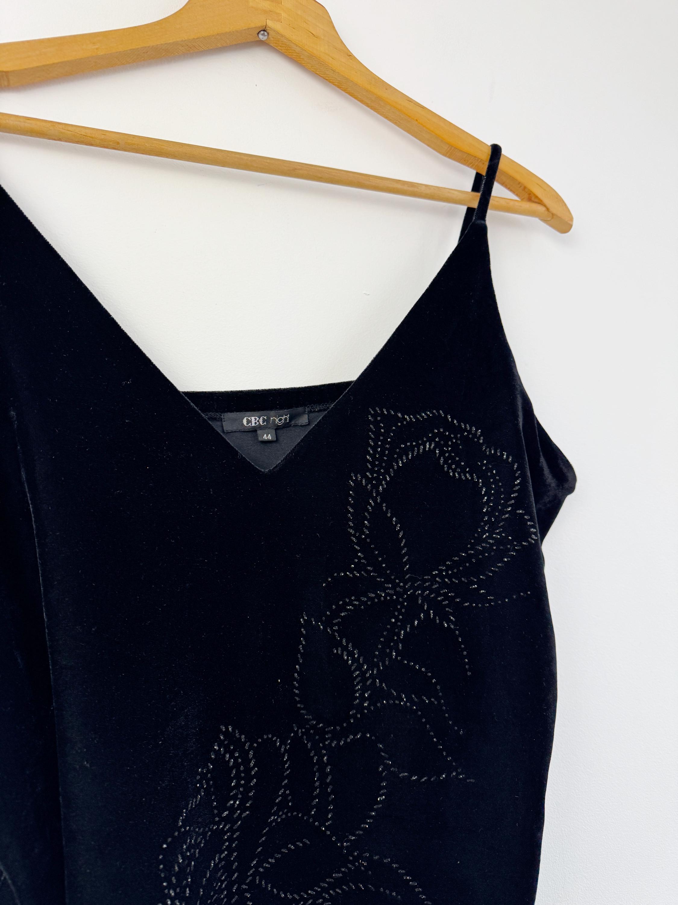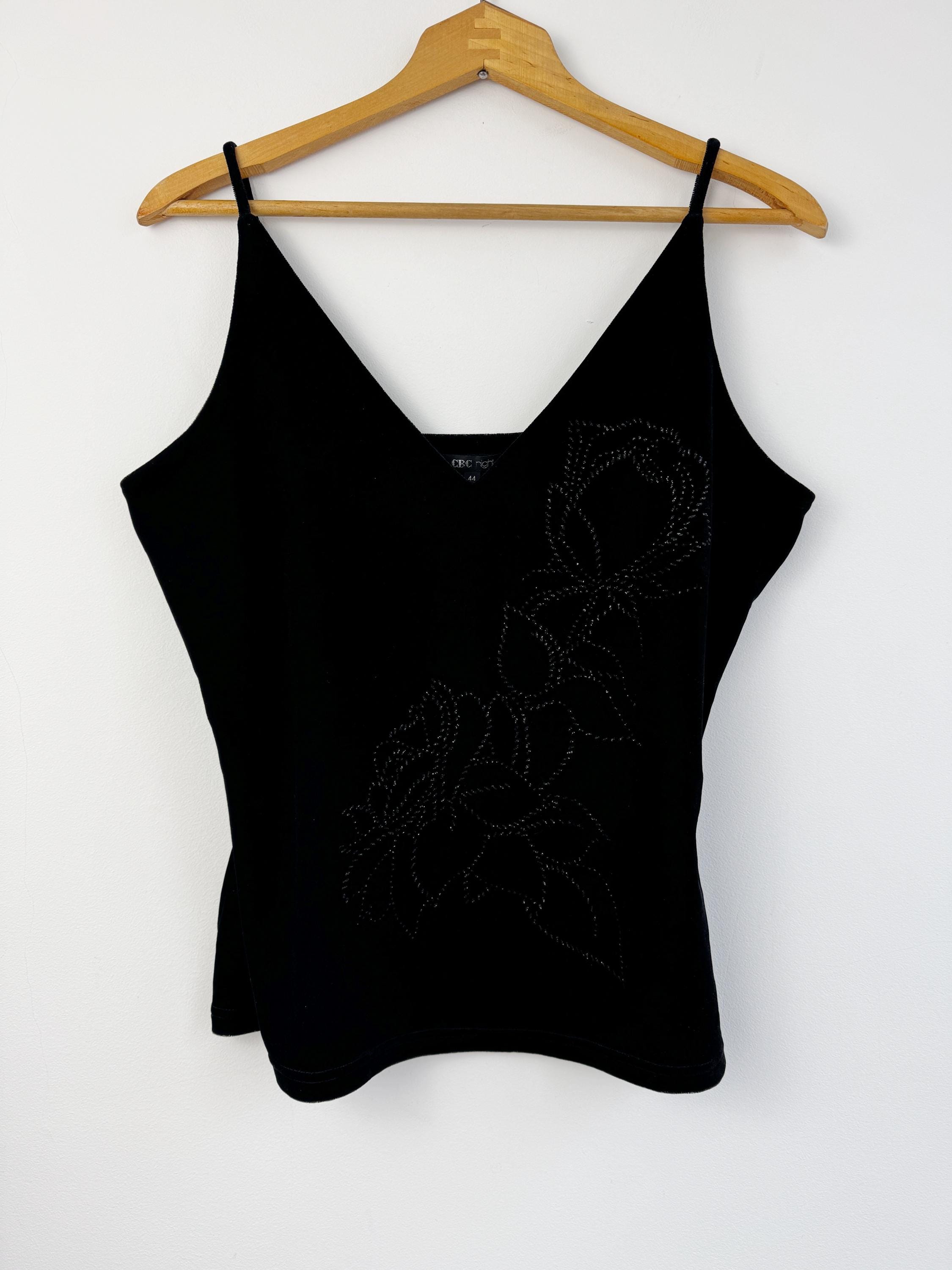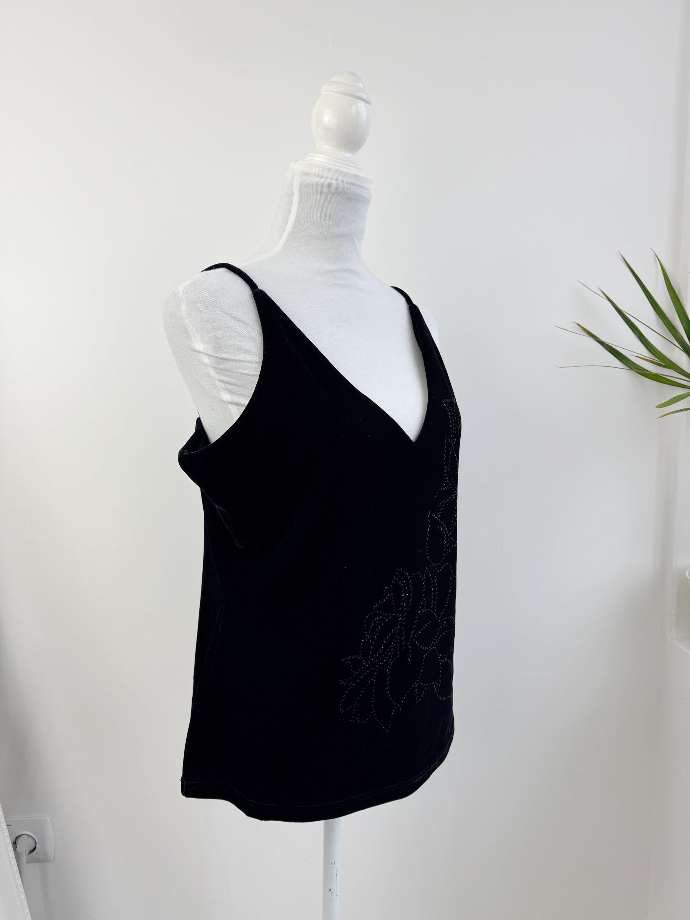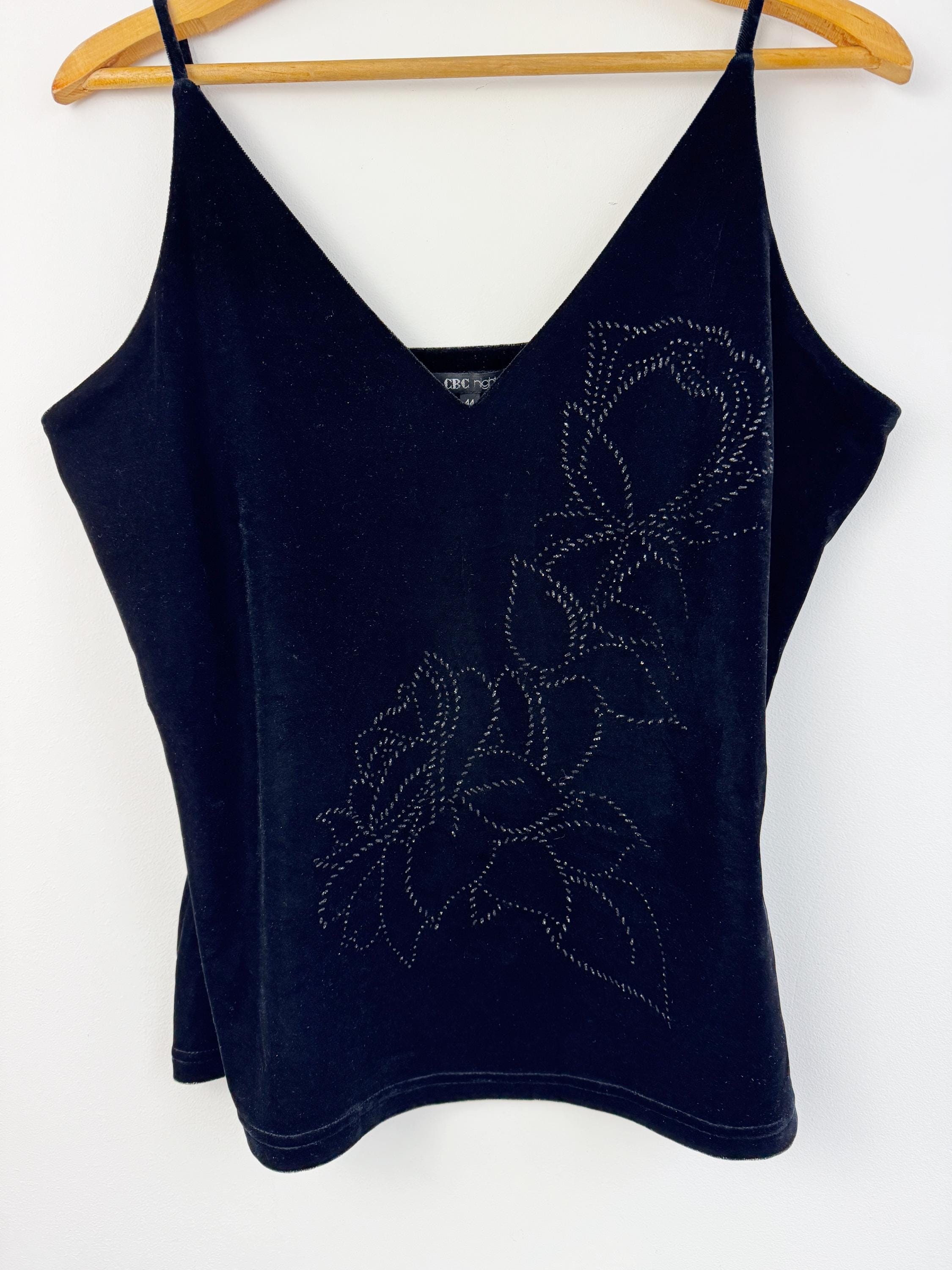 This is an exquisite vintage 90s black velvet camisole in size XL. This velvet sleeveless top features a deep V-neckline and a beautiful floral design cascading down the side, adding a touch of dark romanticism to this velvet cami top.