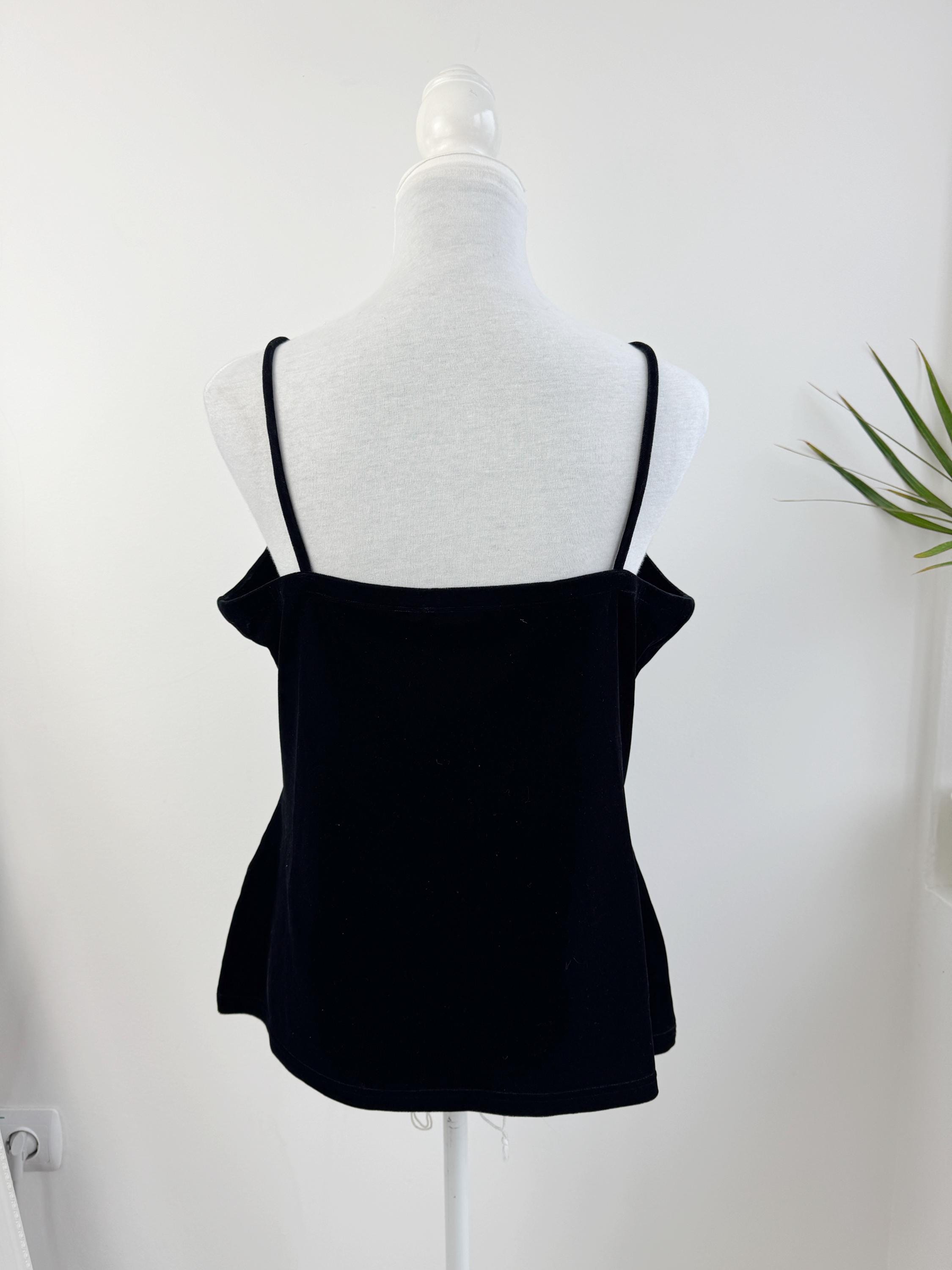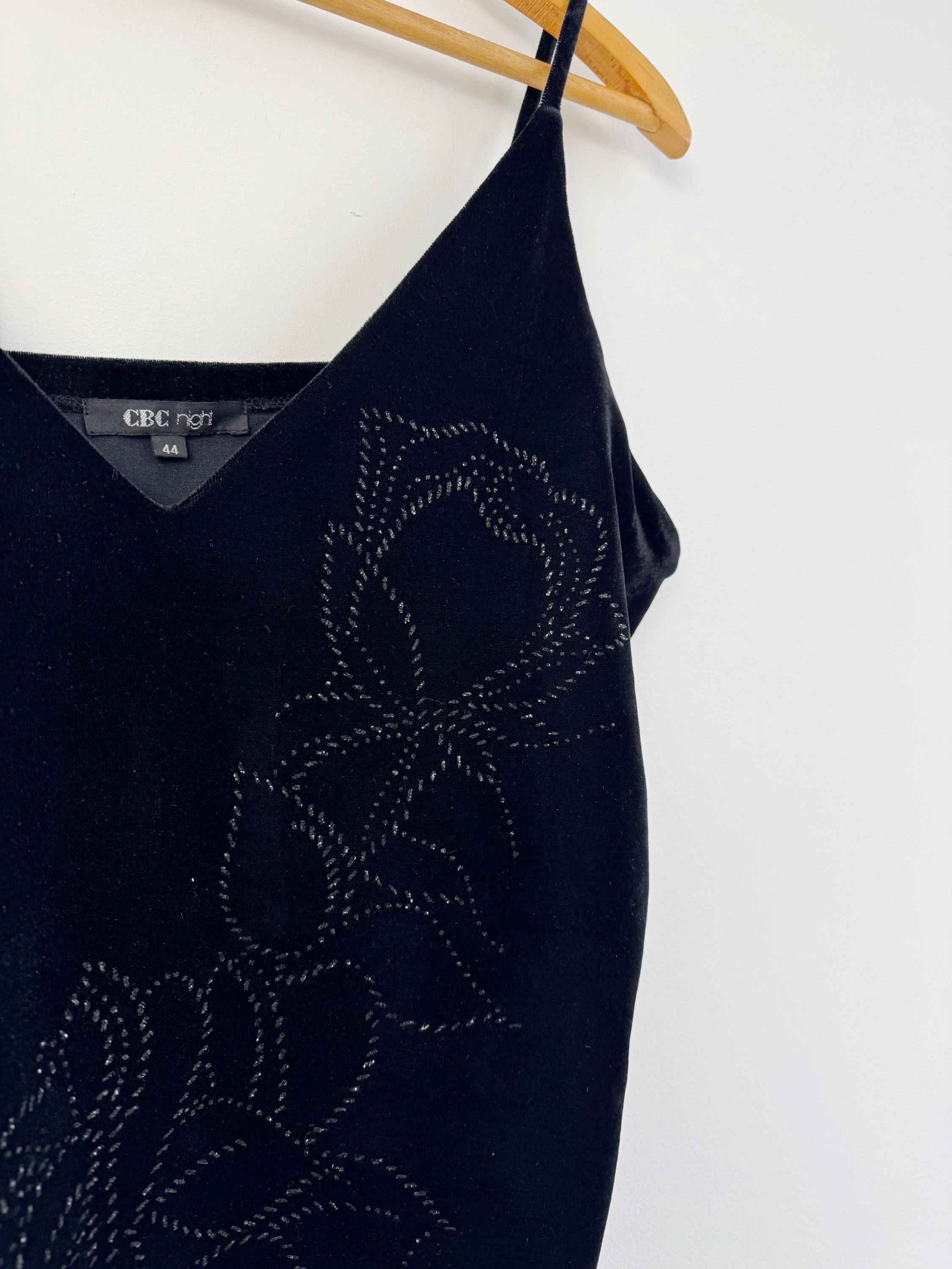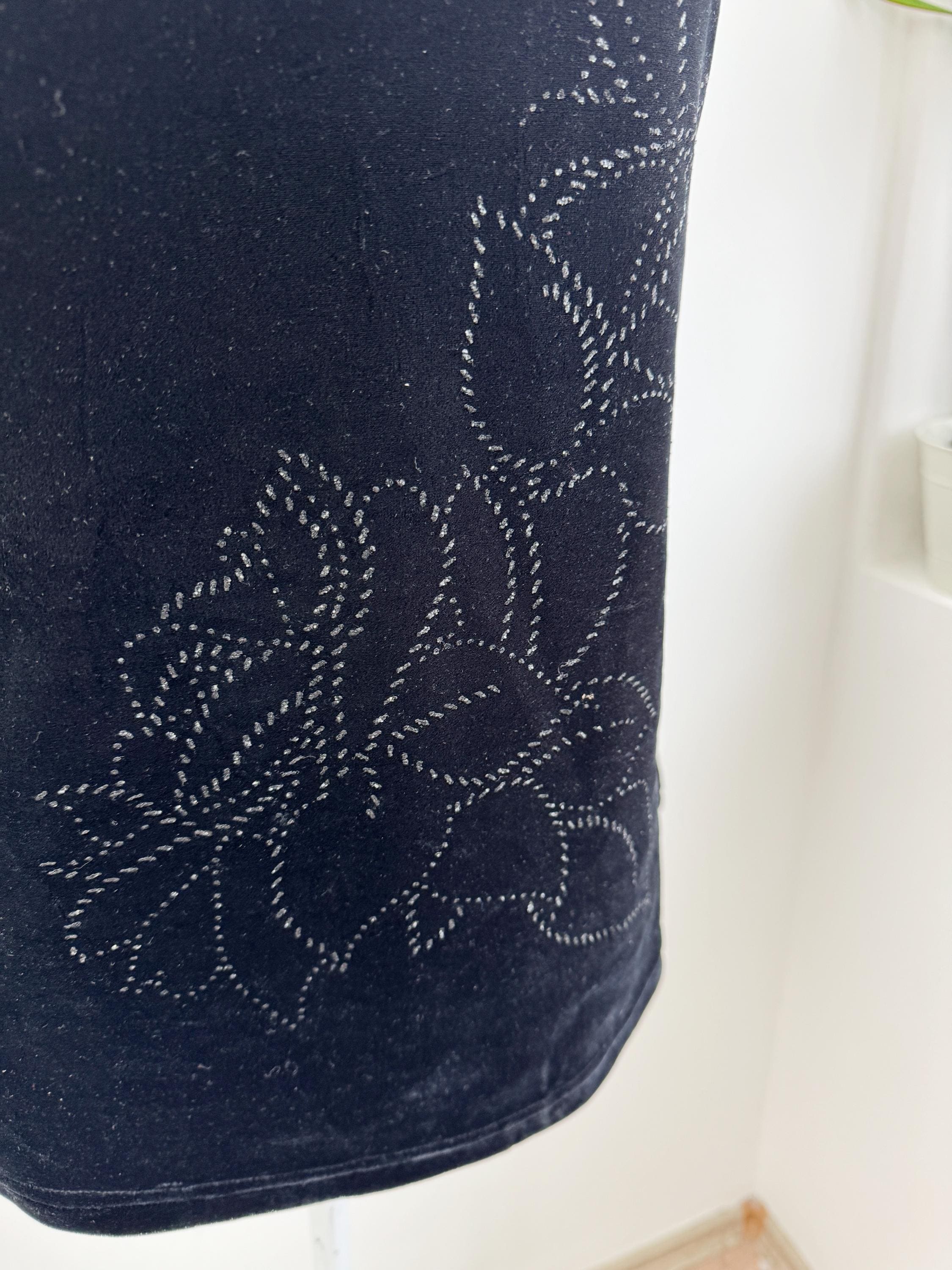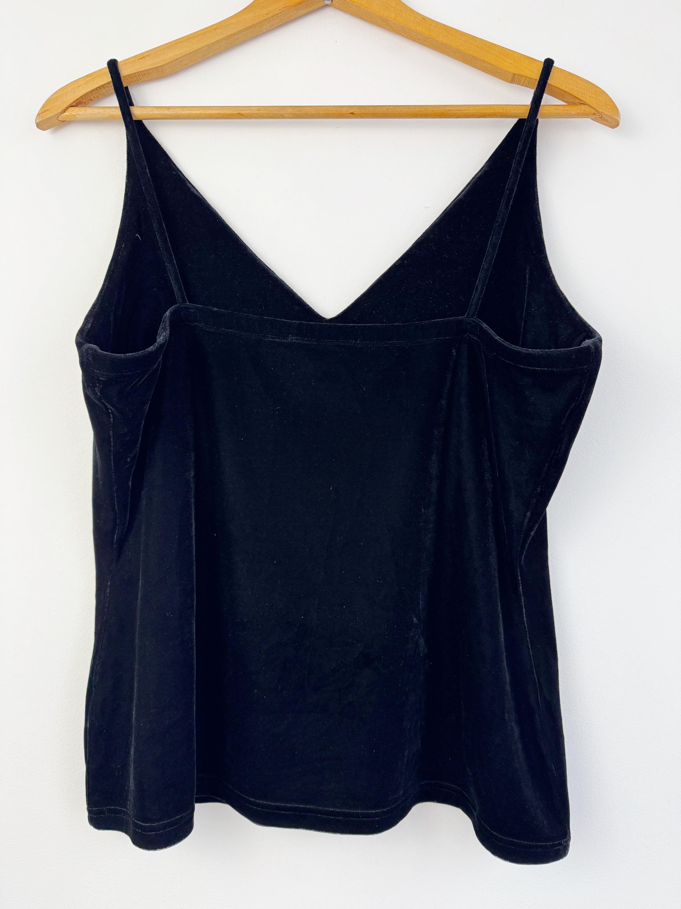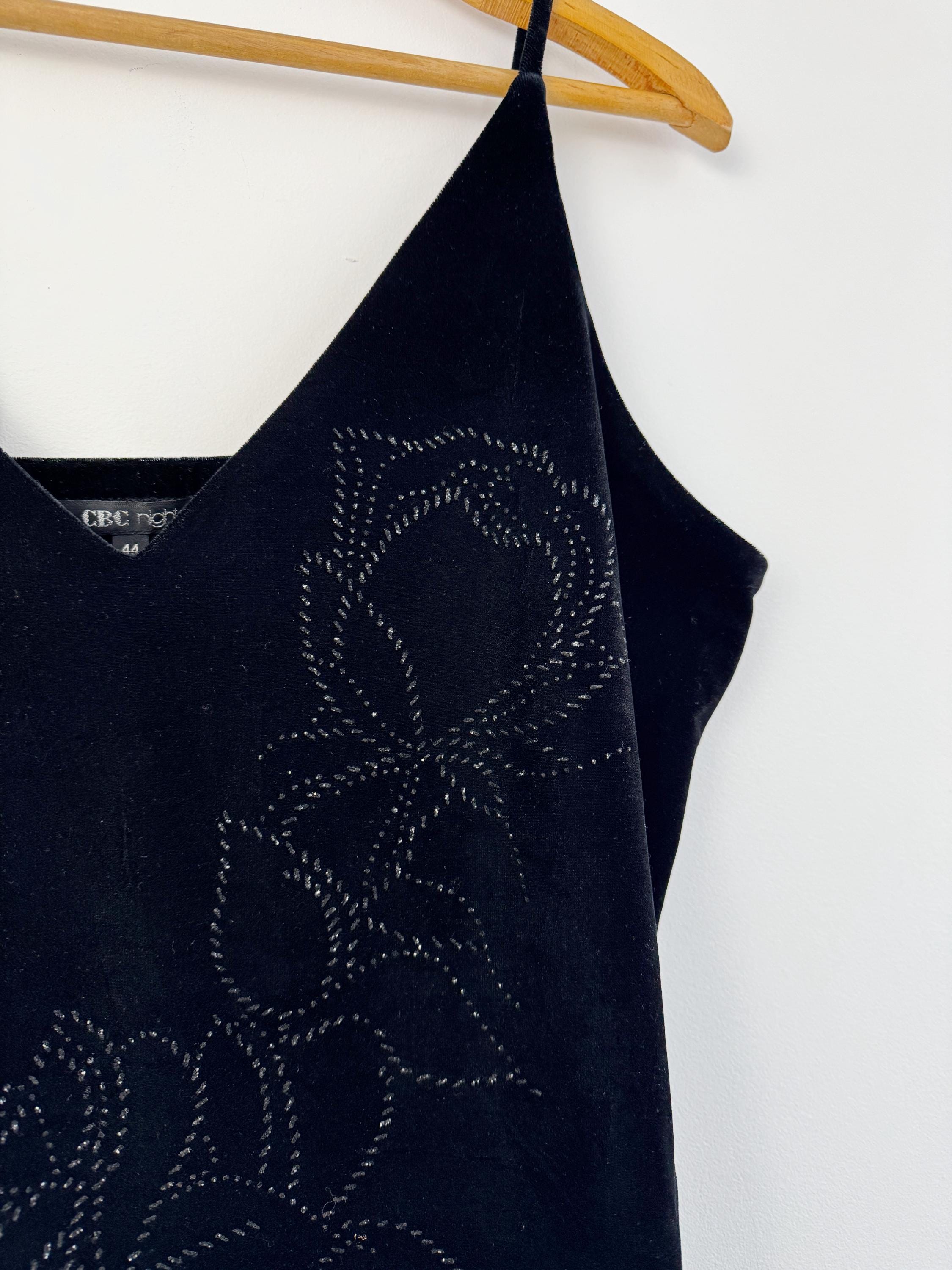This is an exquisite vintage 90s black velvet camisole in size XL. This velvet sleeveless top features a deep V-neckline and a beautiful floral design cascading down the side, adding a touch of dark romanticism to this velvet cami top.