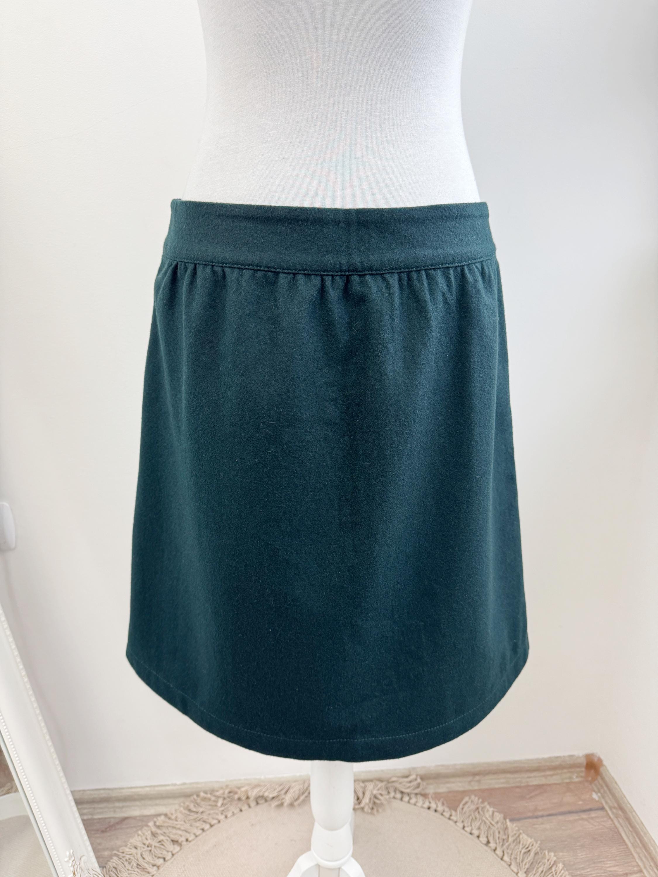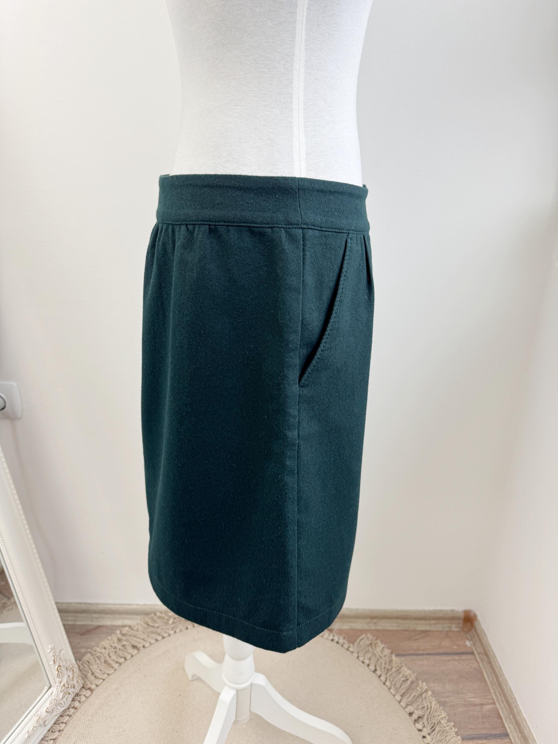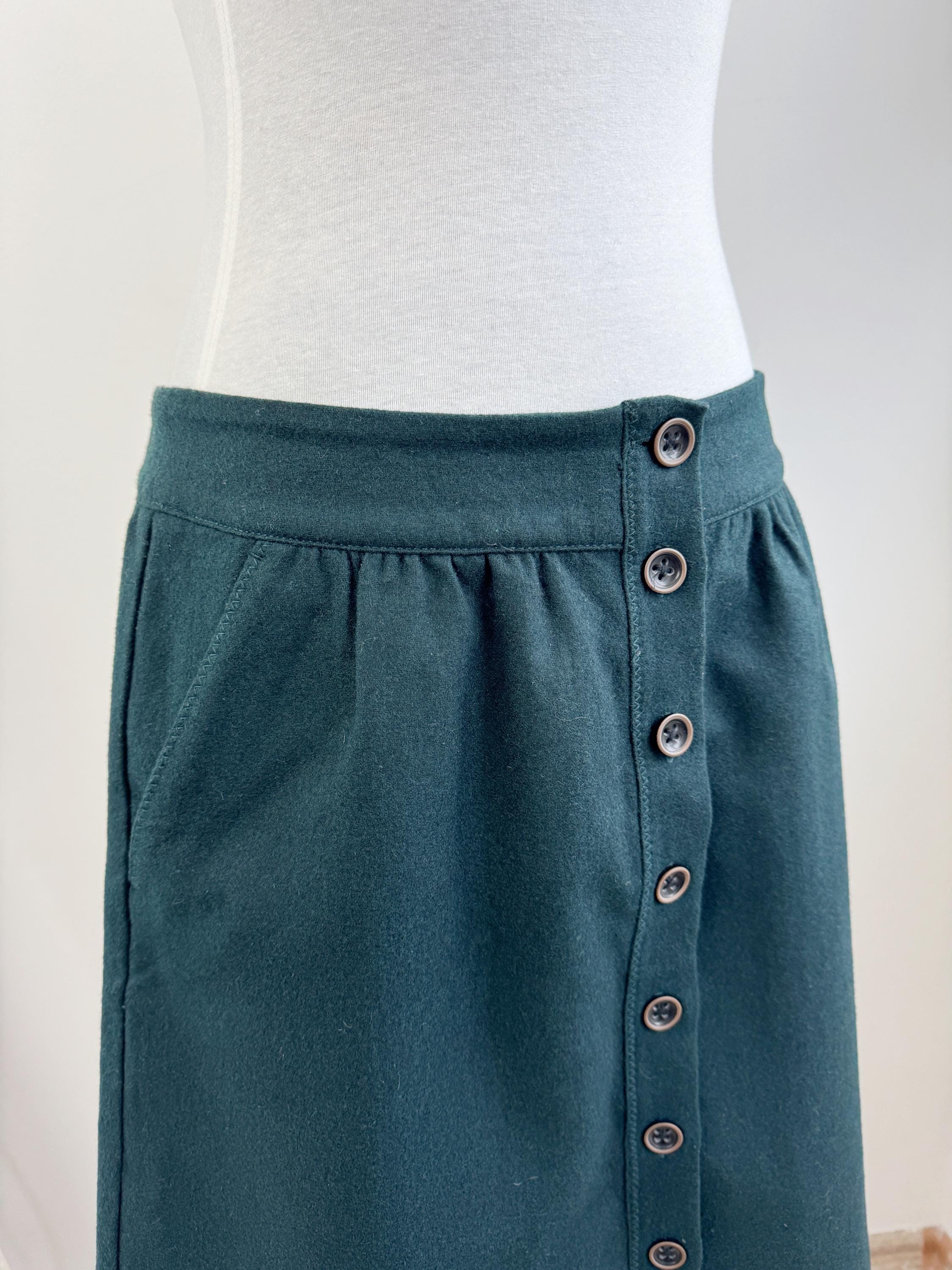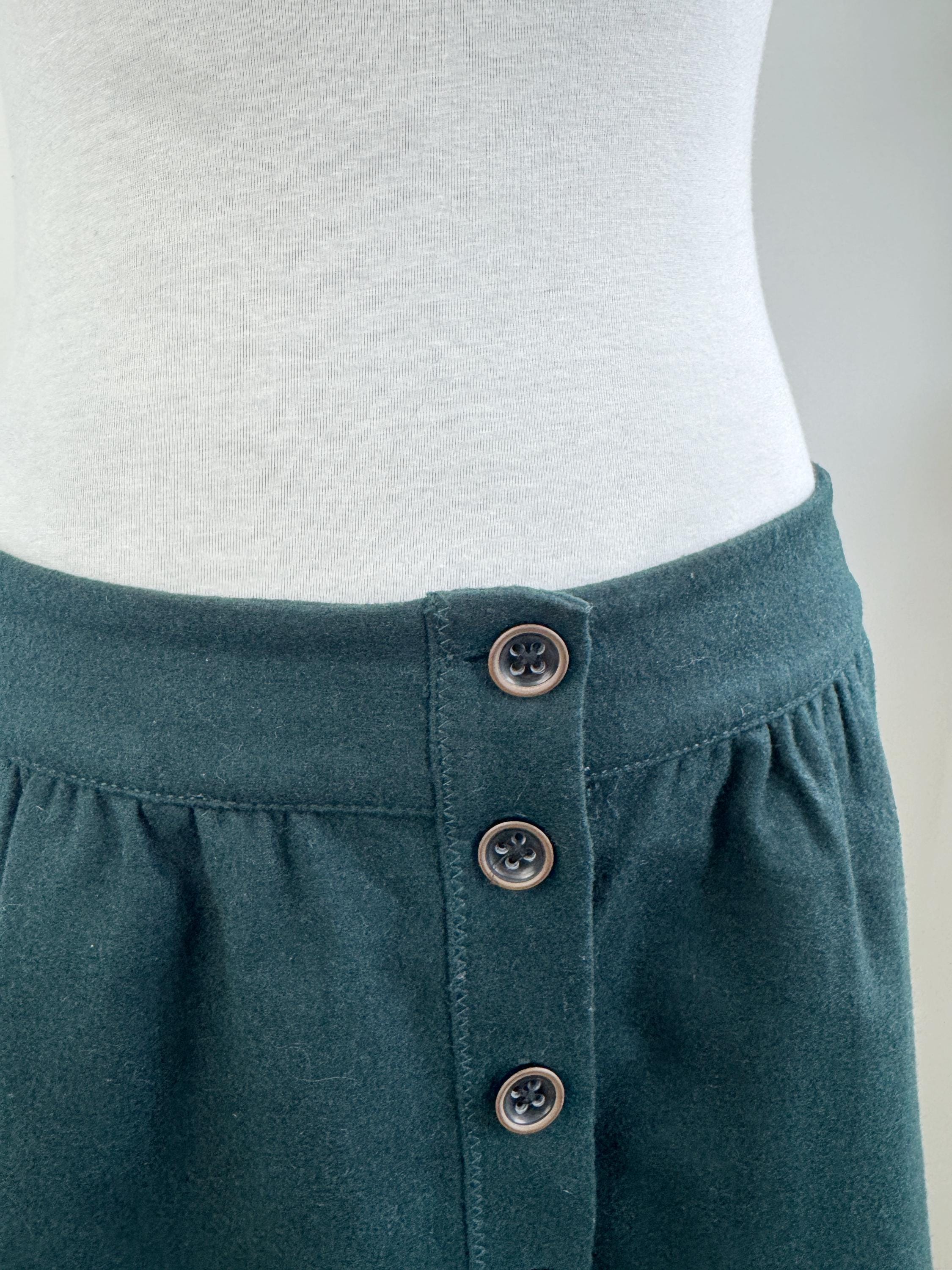 This vintage petrol green wool blend Esprit skirt is a timeless addition to any conscious wardrobe, blending classic retro aesthetics with practical modern details. Crafted from a high-quality wool blend in a deep forest green, this wool mini skirt features a flattering A-line silhouette and a full button-down front that adds a touch of 70s-inspired charm. The subtle gathering at the waistband creates a gentle drape, while the functional side pockets make it as convenient as it is stylish. Perfect for layering with tights and boots during the colder months, this versatile piece transitions effortlessly from a professional office look to a cozy weekend outfit.