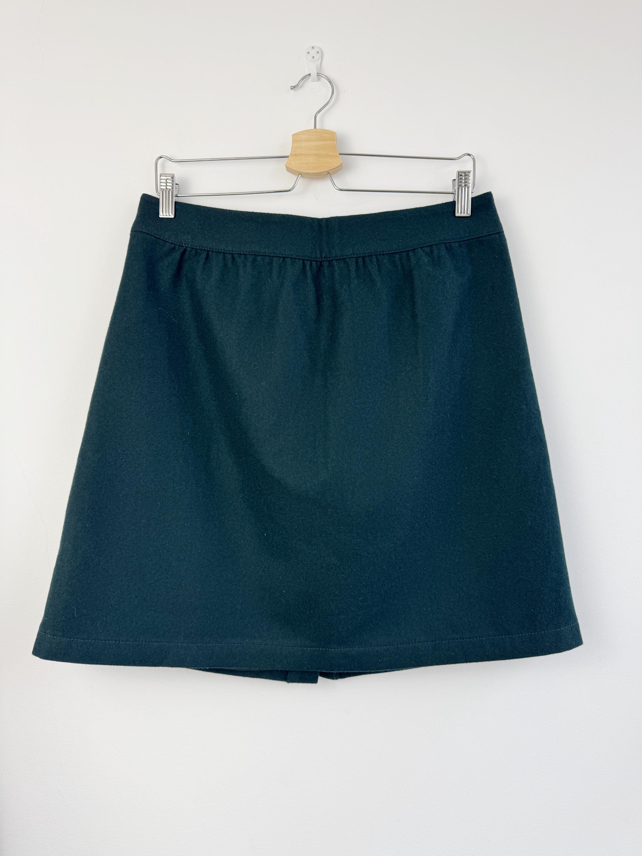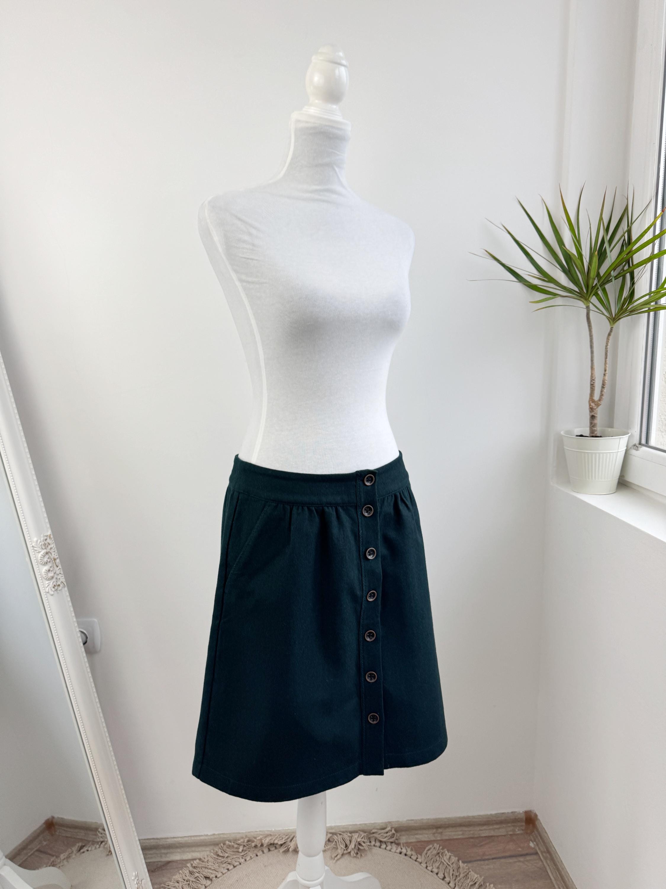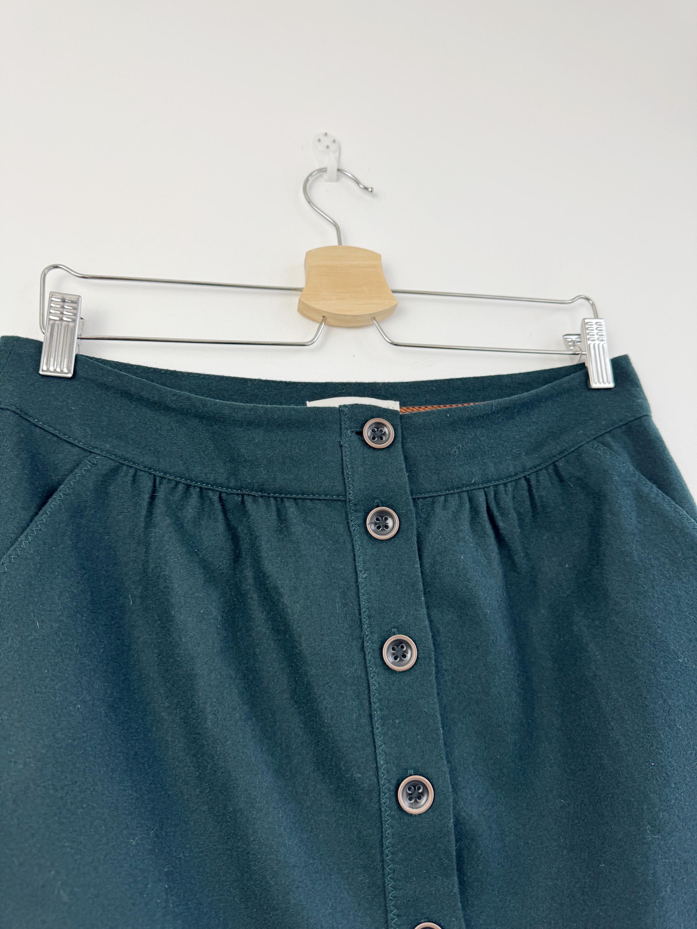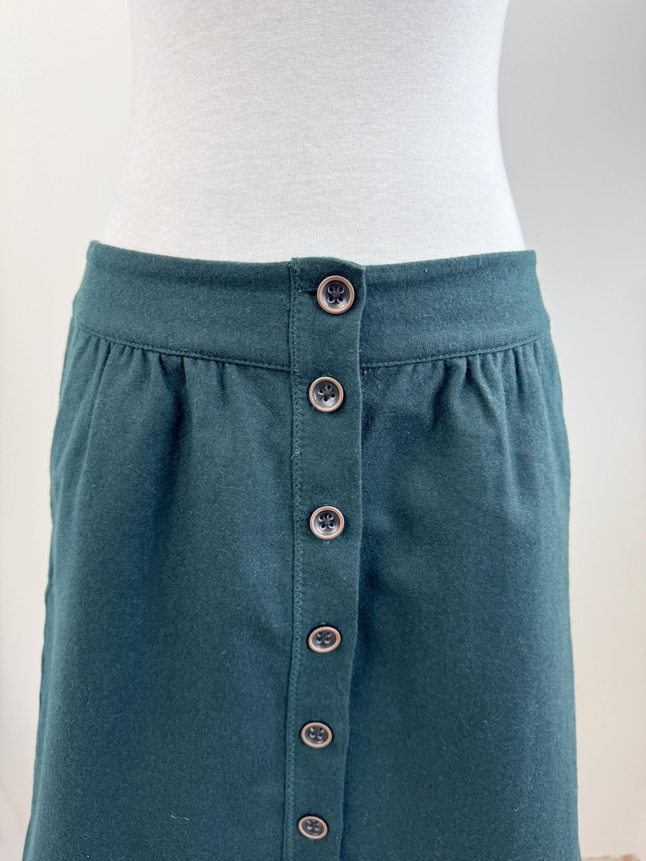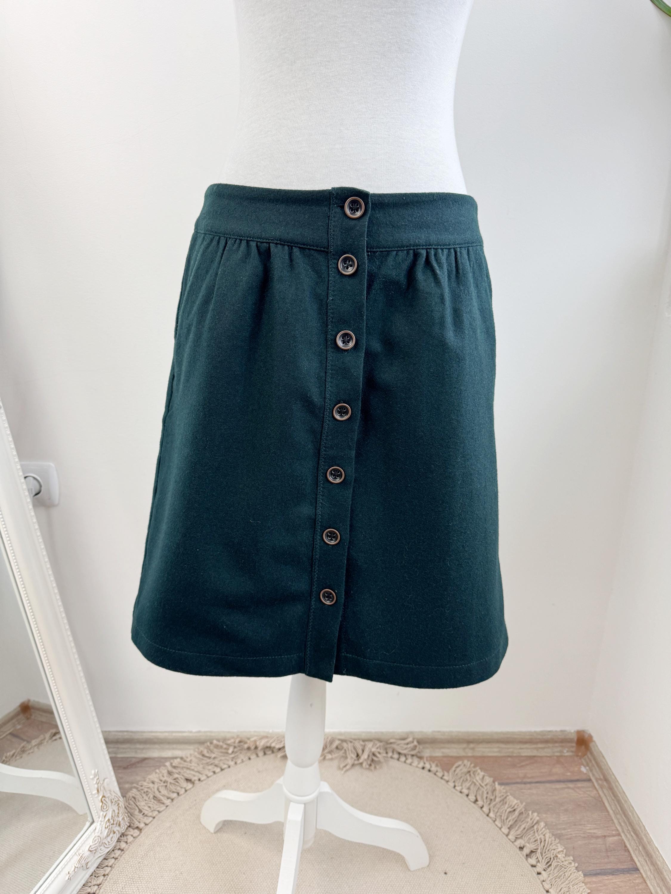 This vintage petrol green wool blend Esprit skirt is a timeless addition to any conscious wardrobe, blending classic retro aesthetics with practical modern details. Crafted from a high-quality wool blend in a deep forest green, this wool mini skirt features a flattering A-line silhouette and a full button-down front that adds a touch of 70s-inspired charm. The subtle gathering at the waistband creates a gentle drape, while the functional side pockets make it as convenient as it is stylish. Perfect for layering with tights and boots during the colder months, this versatile piece transitions effortlessly from a professional office look to a cozy weekend outfit.