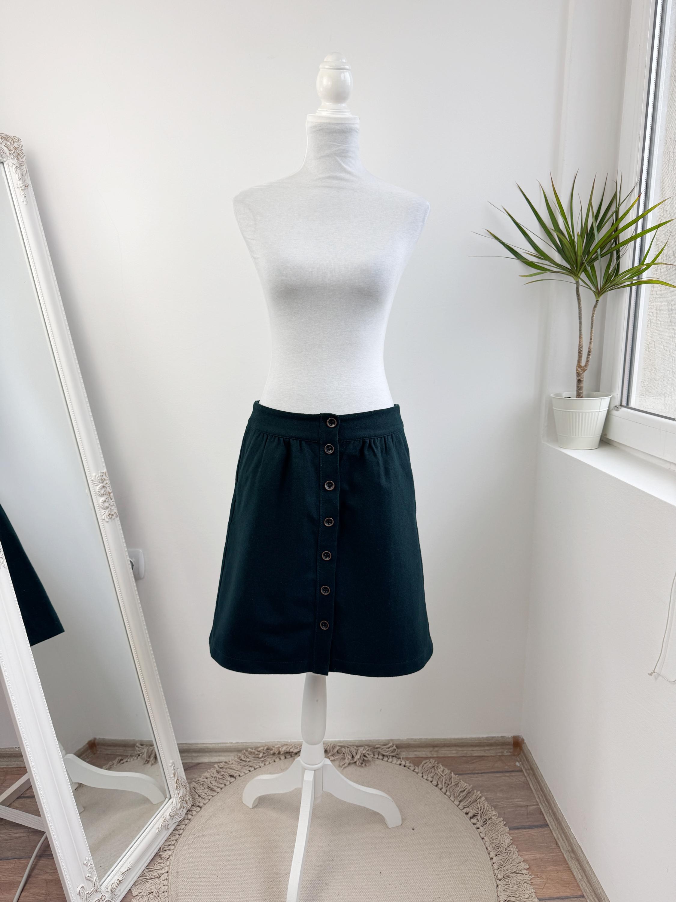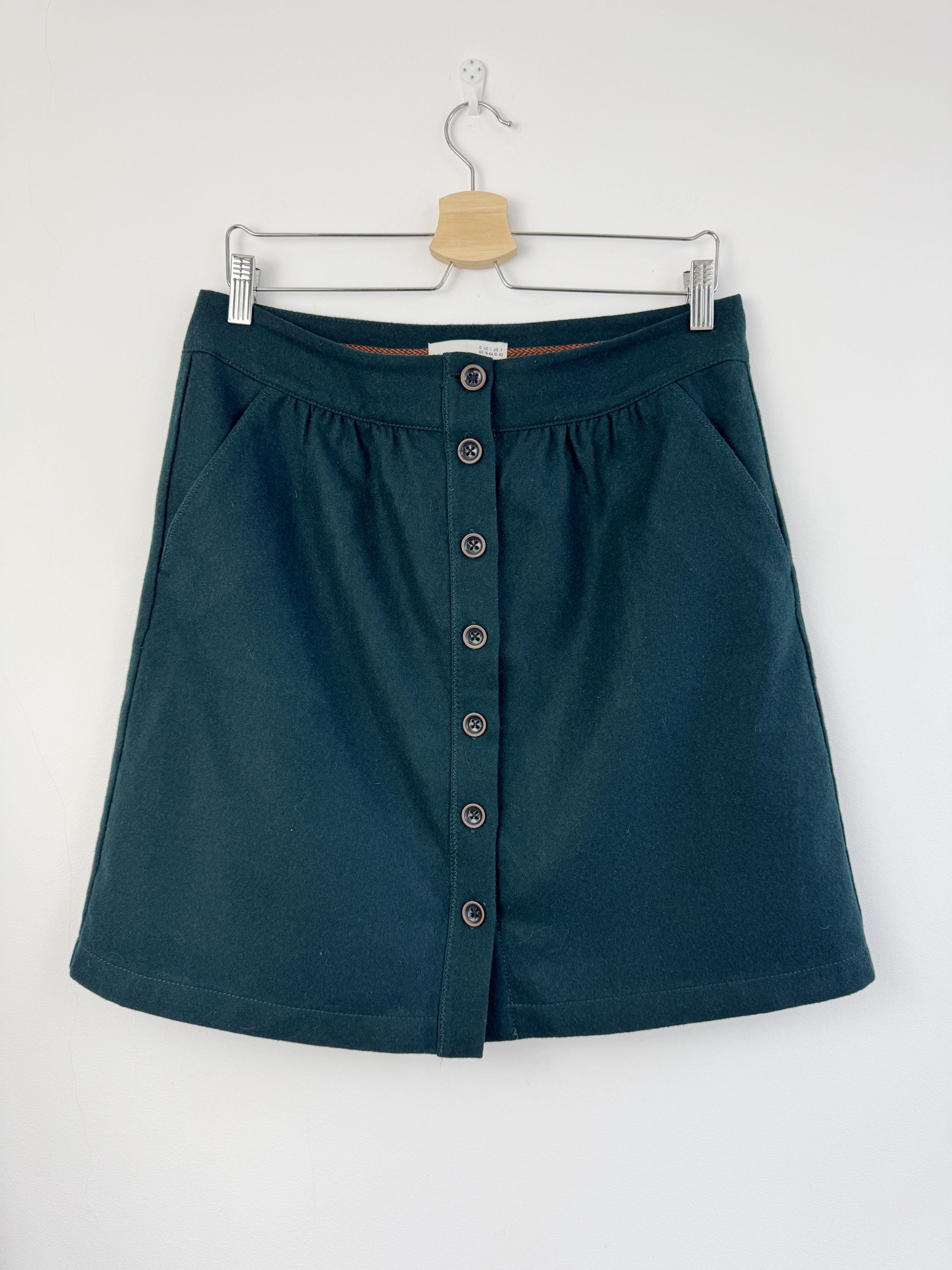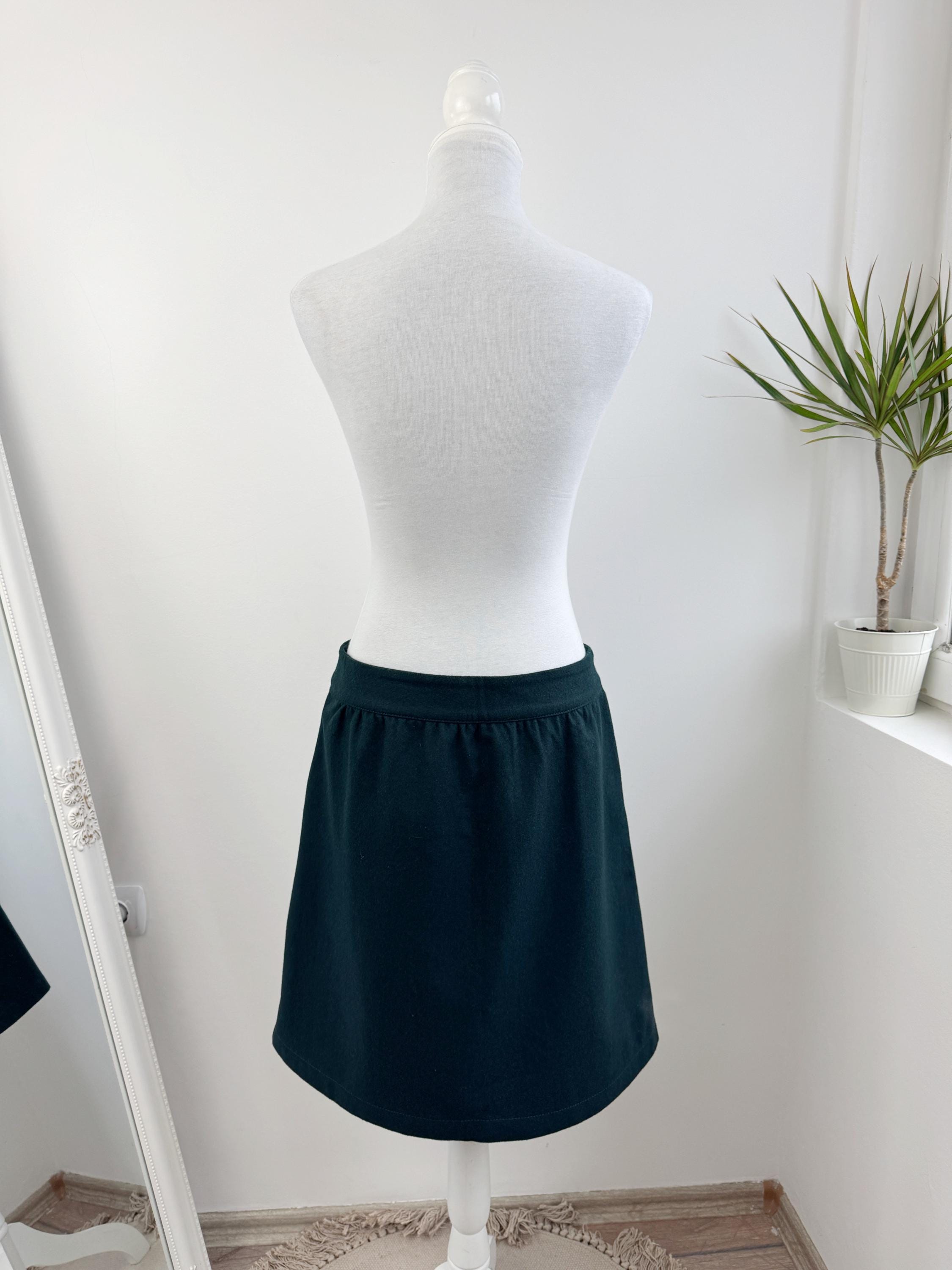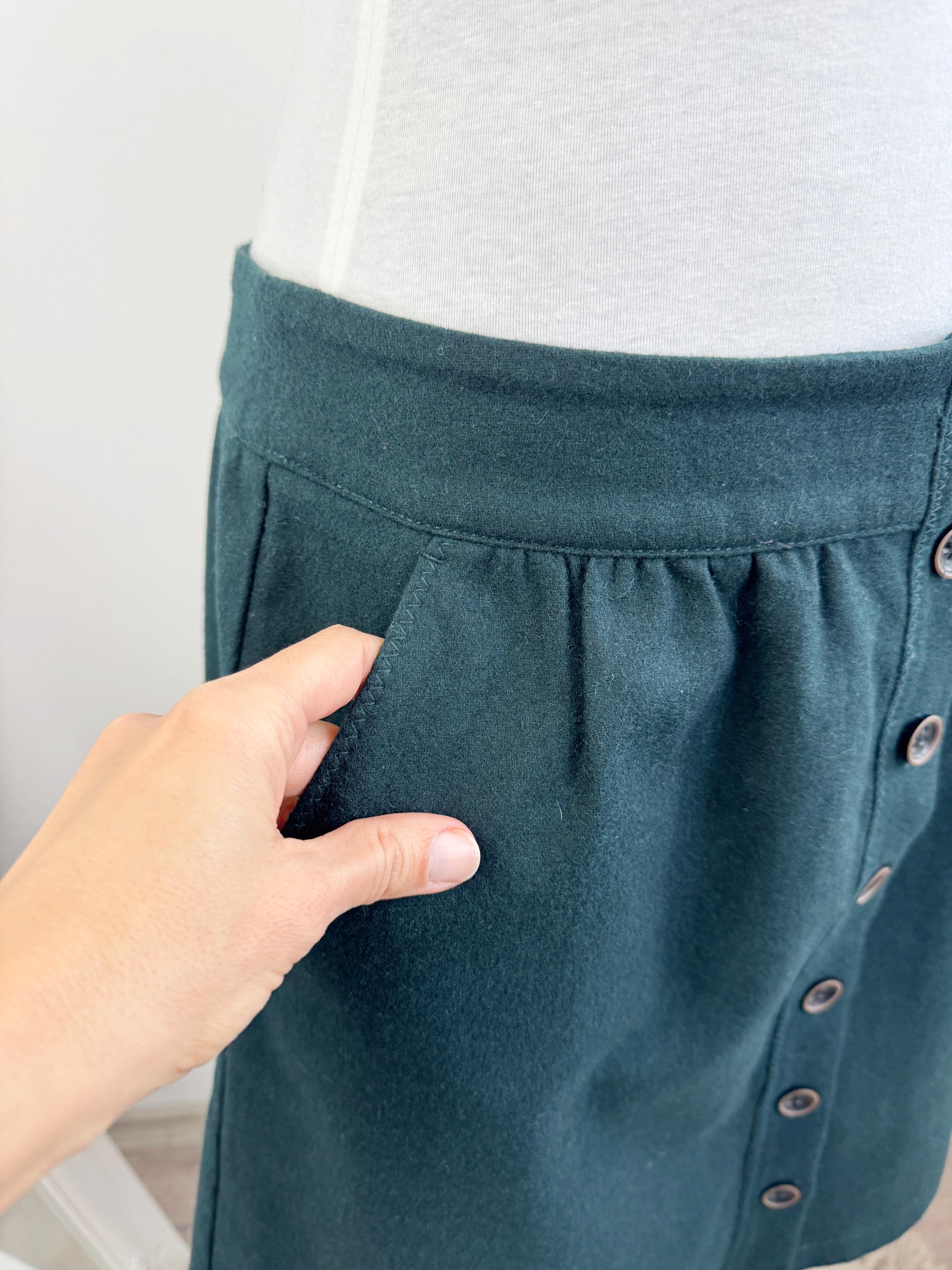 This vintage petrol green wool blend Esprit skirt is a timeless addition to any conscious wardrobe, blending classic retro aesthetics with practical modern details. Crafted from a high-quality wool blend in a deep forest green, this wool mini skirt features a flattering A-line silhouette and a full button-down front that adds a touch of 70s-inspired charm. The subtle gathering at the waistband creates a gentle drape, while the functional side pockets make it as convenient as it is stylish. Perfect for layering with tights and boots during the colder months, this versatile piece transitions effortlessly from a professional office look to a cozy weekend outfit.