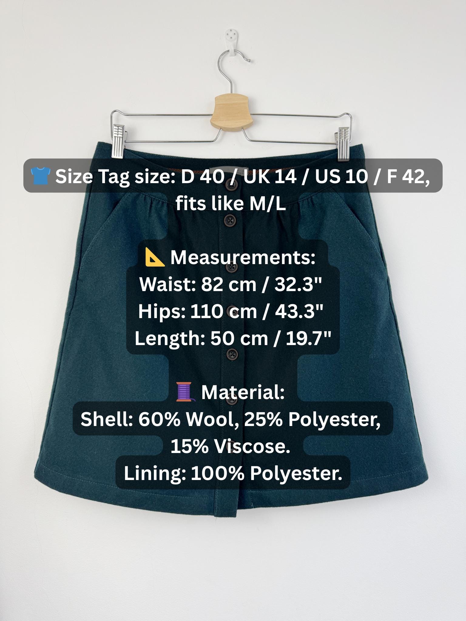 🧵 Material Shell: 60% Wool, 25% Polyester, 15% Viscose. Lining: 100% Polyester.